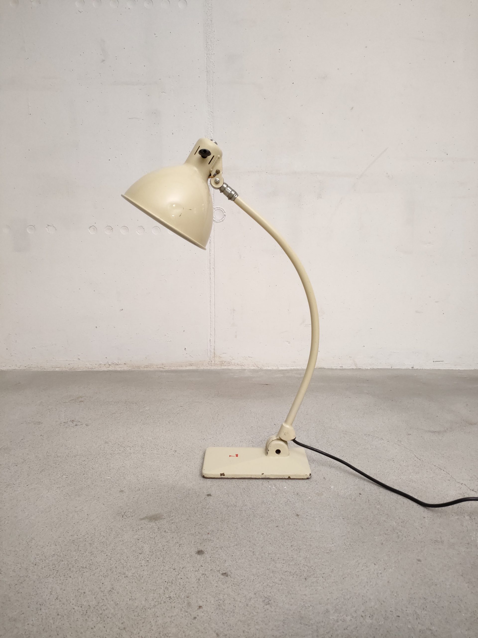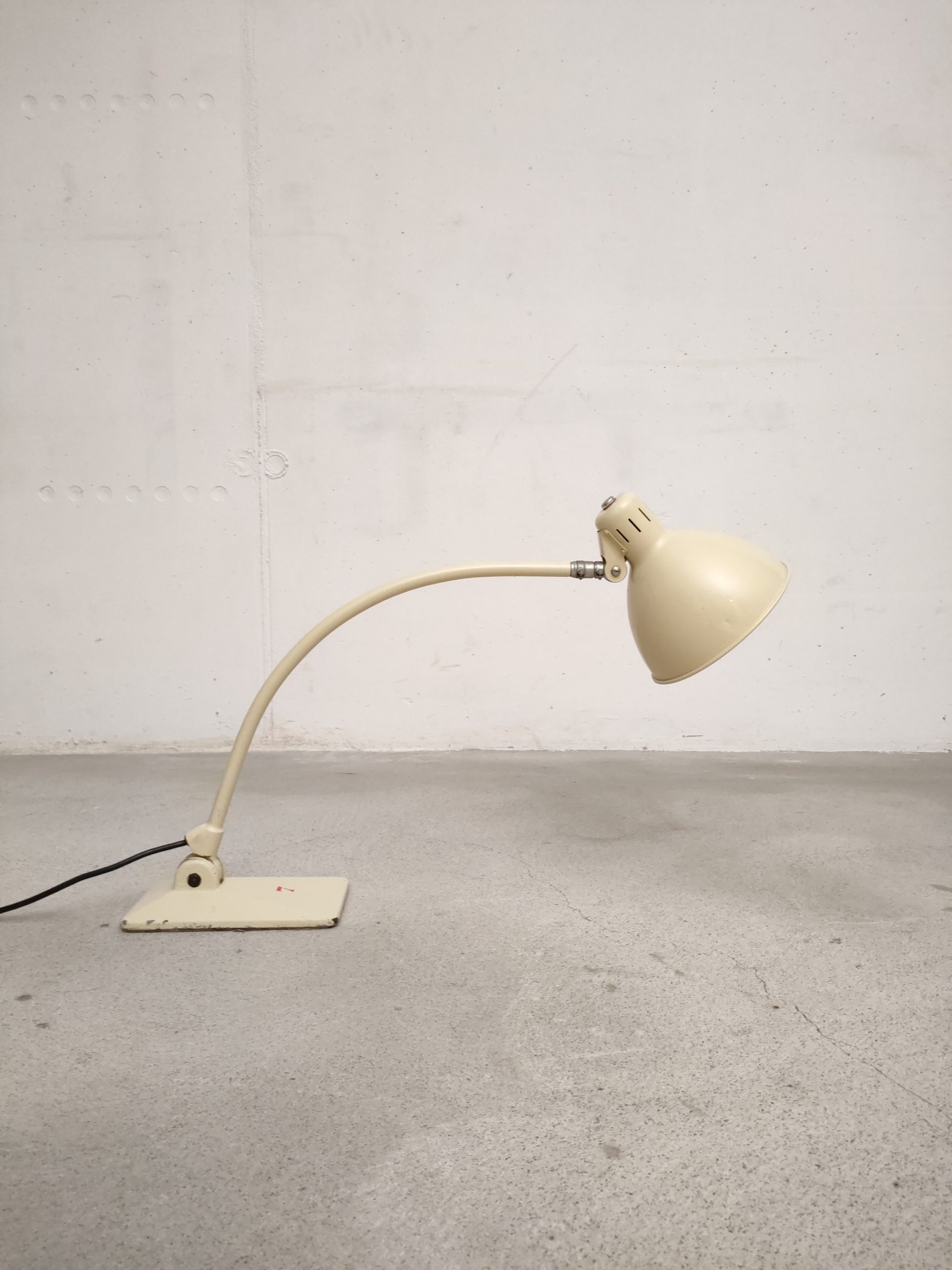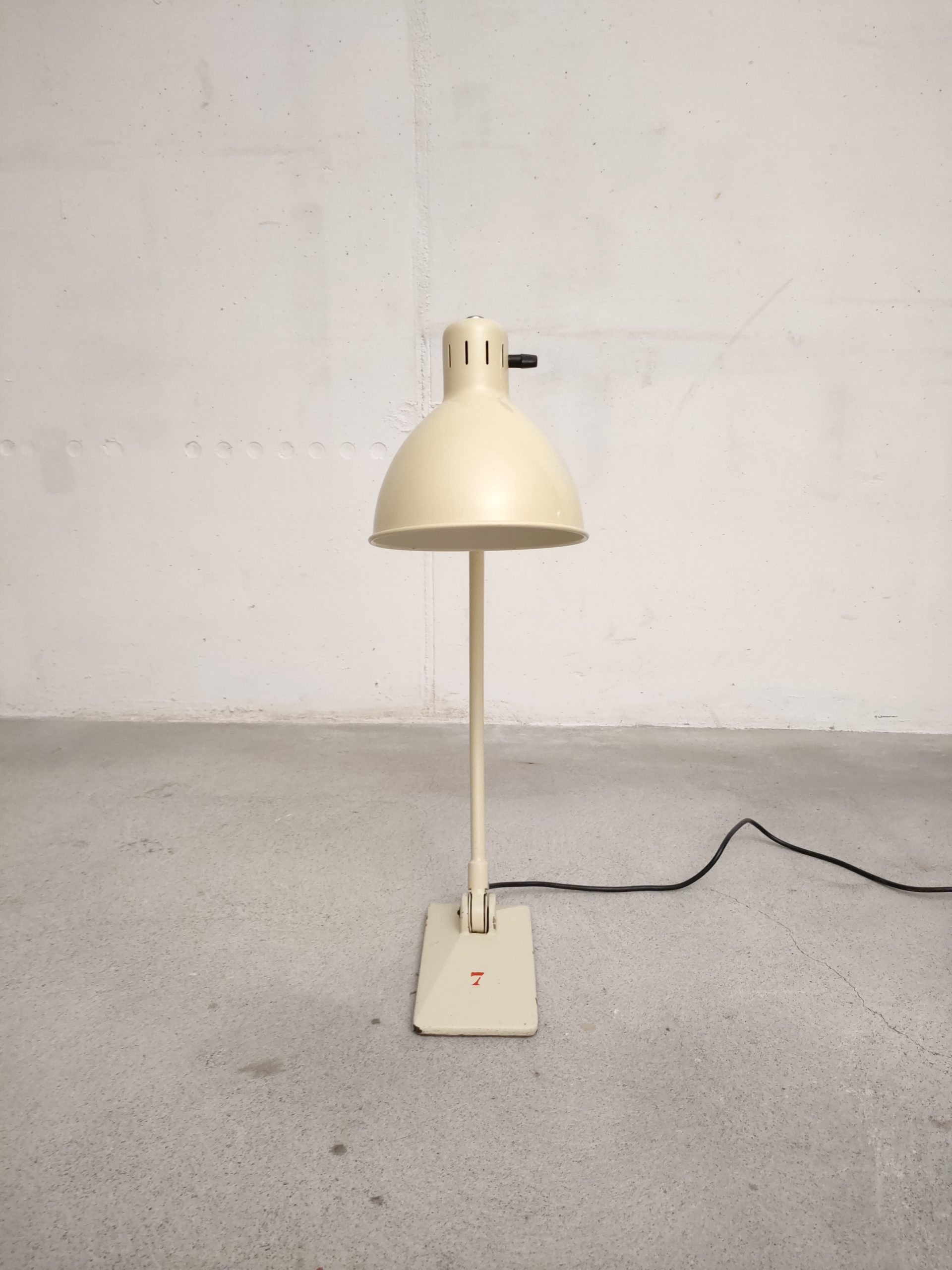Produit venduLampe de table vintage industrielle en métal et socle en fonte. L’abat-jour peut être orienté dans toutes les directions et le bras peut aussi être orienté en avant et an arrière. L’interrupteur est positionnée sur l’abat-jour. Quelques traces d’usure mais parfaitement fonctionnelle.