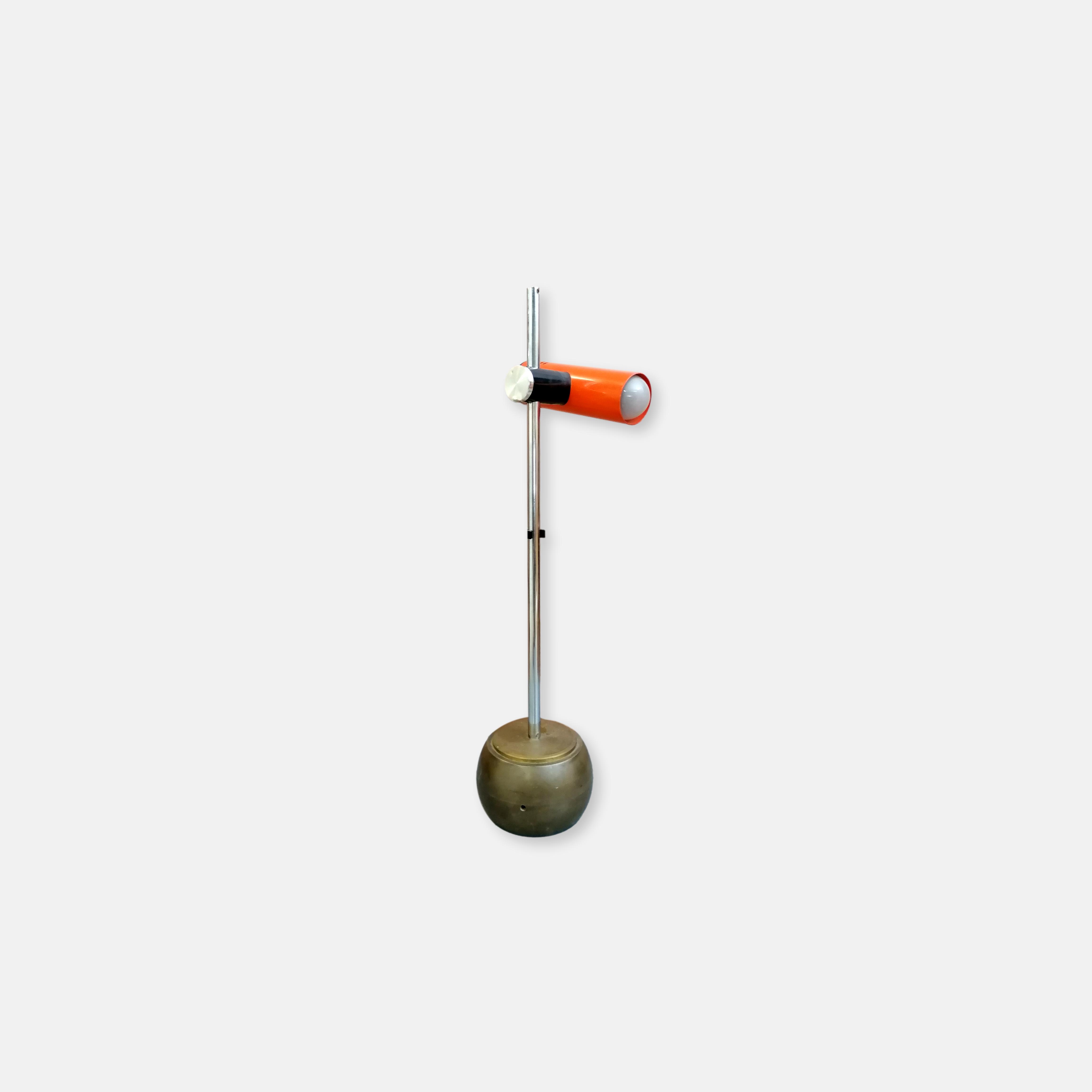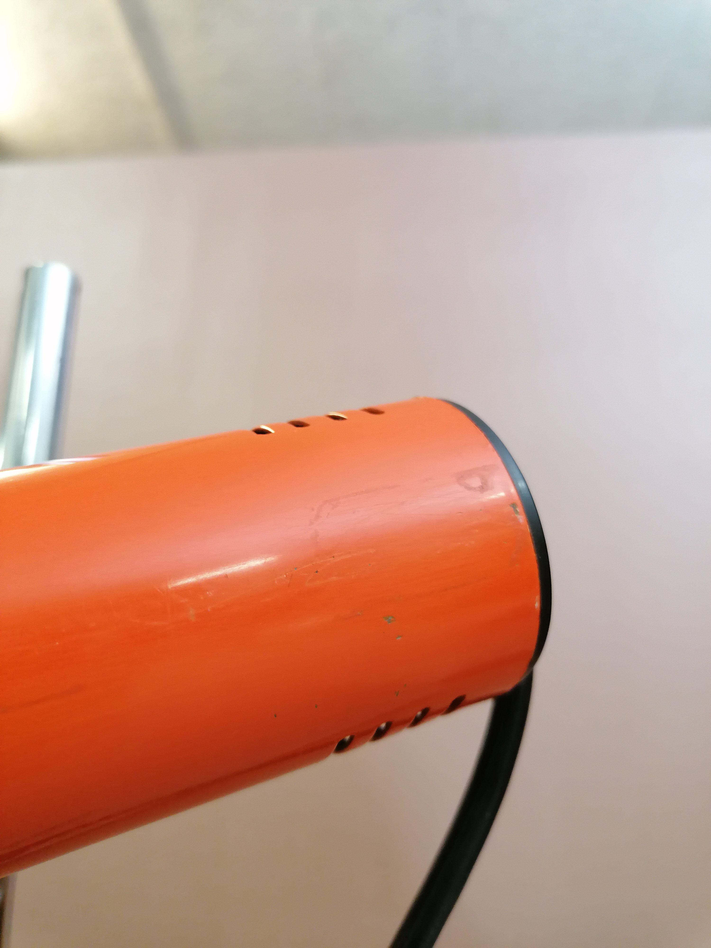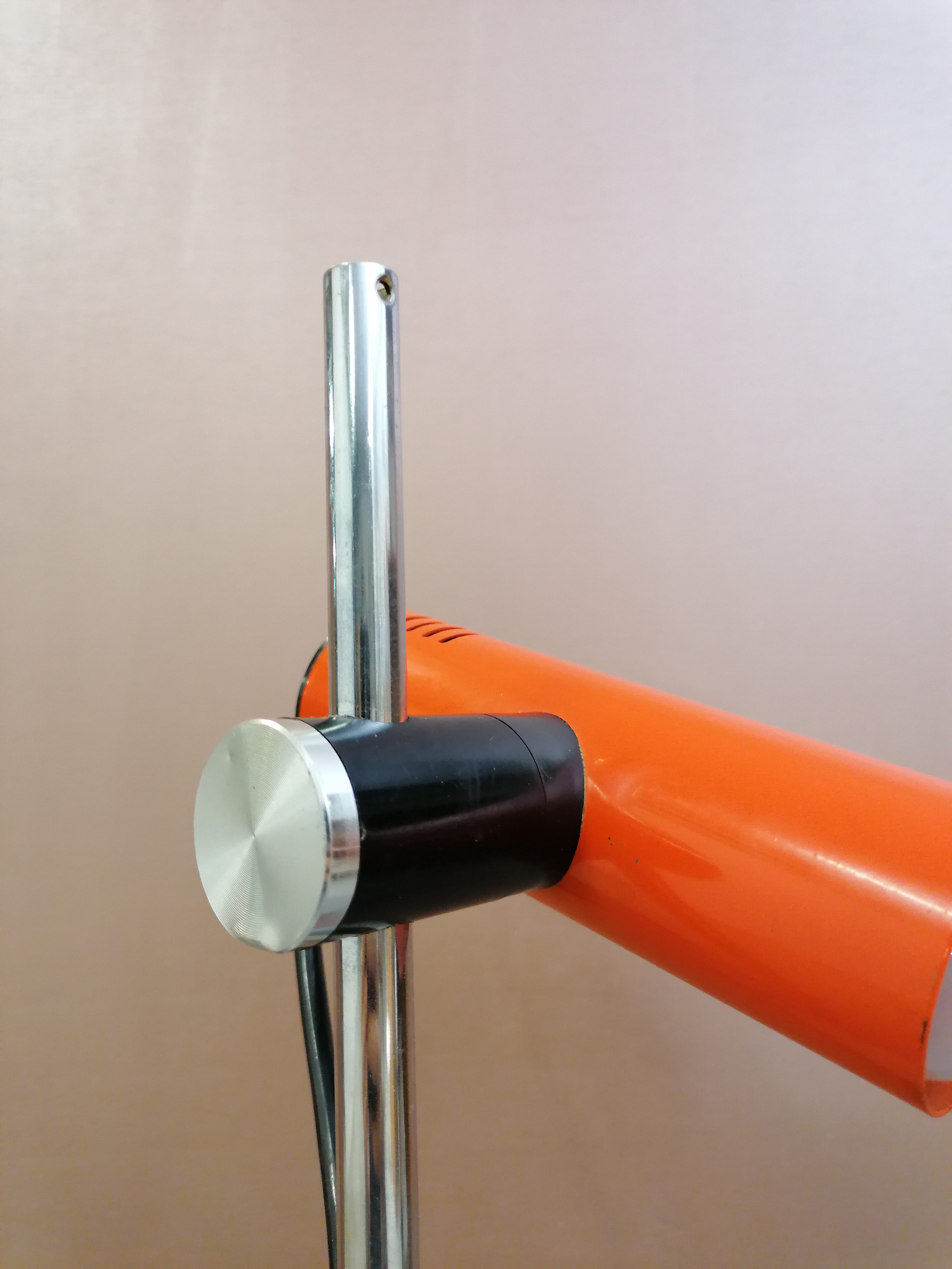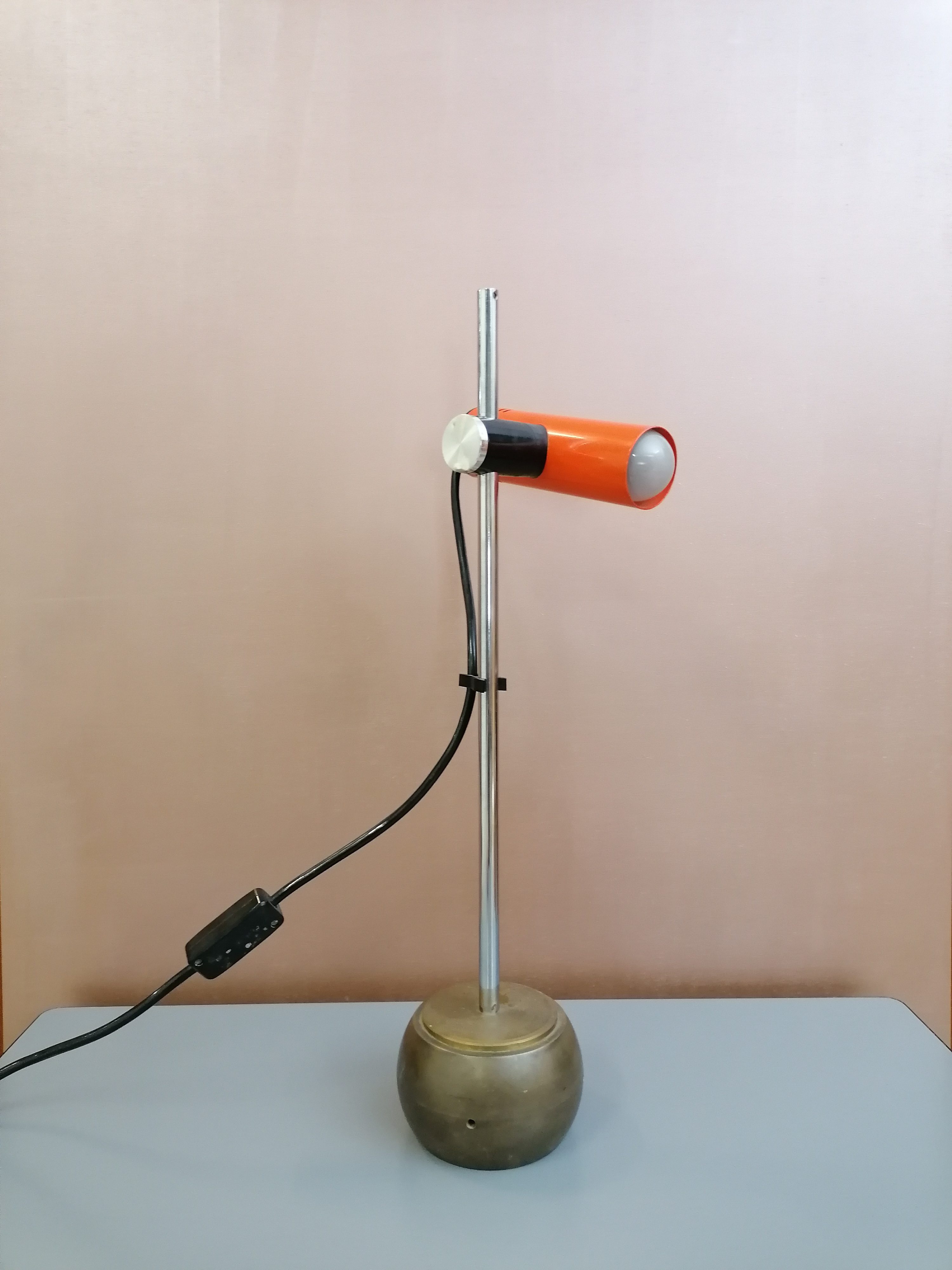 Produit venduLampe de table vintage avec socle en métal, tige en métal chromé et abat-jour orange. Interrupteur sur le fil. L’abat-jour peut être orienté dans toute les direction et est aussi réglable en hauteur. Quelques traces sur l’abat-jour (voir photos).