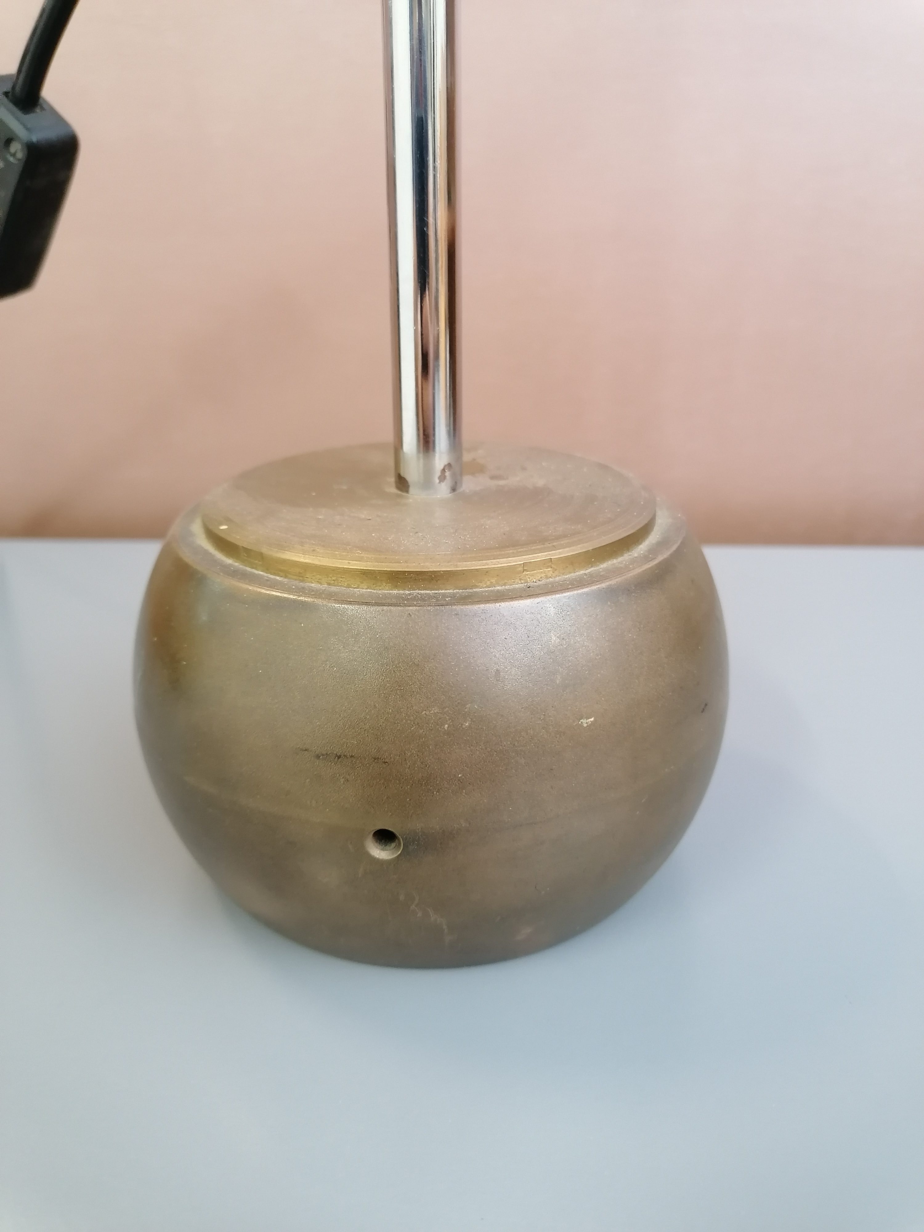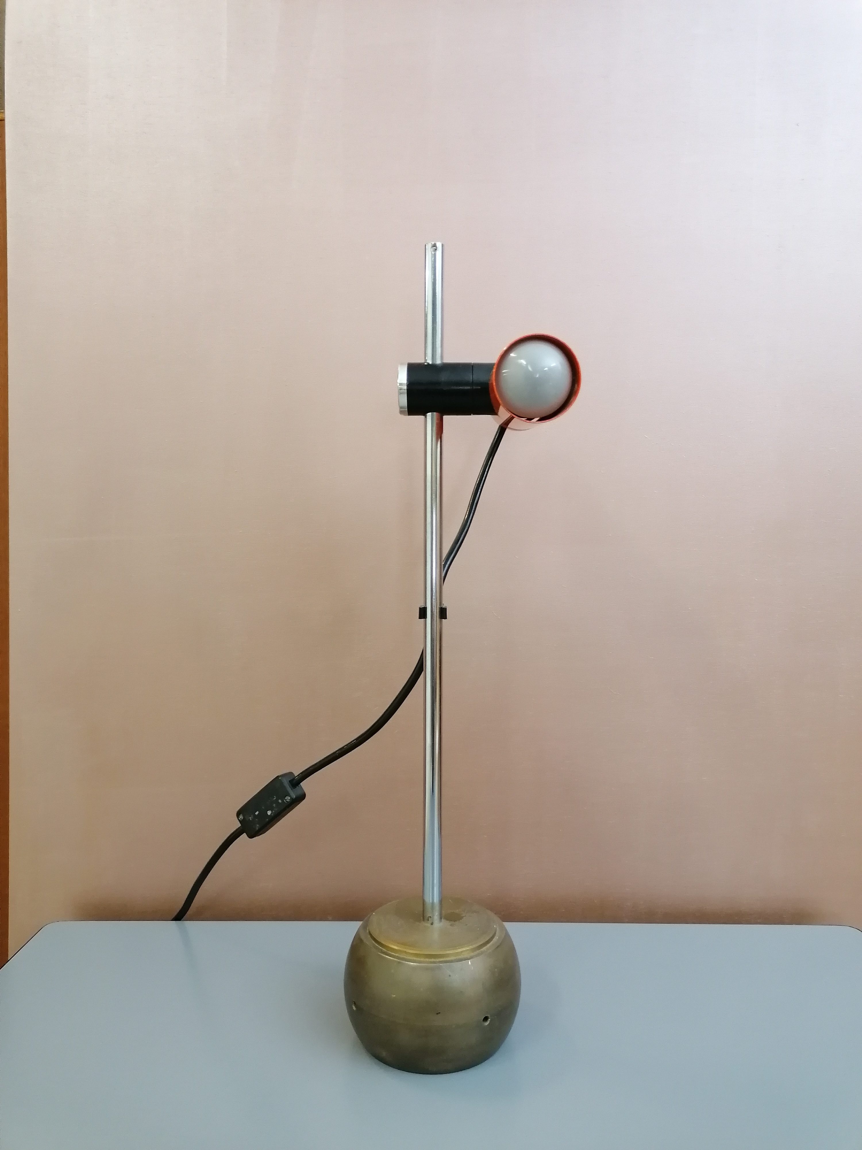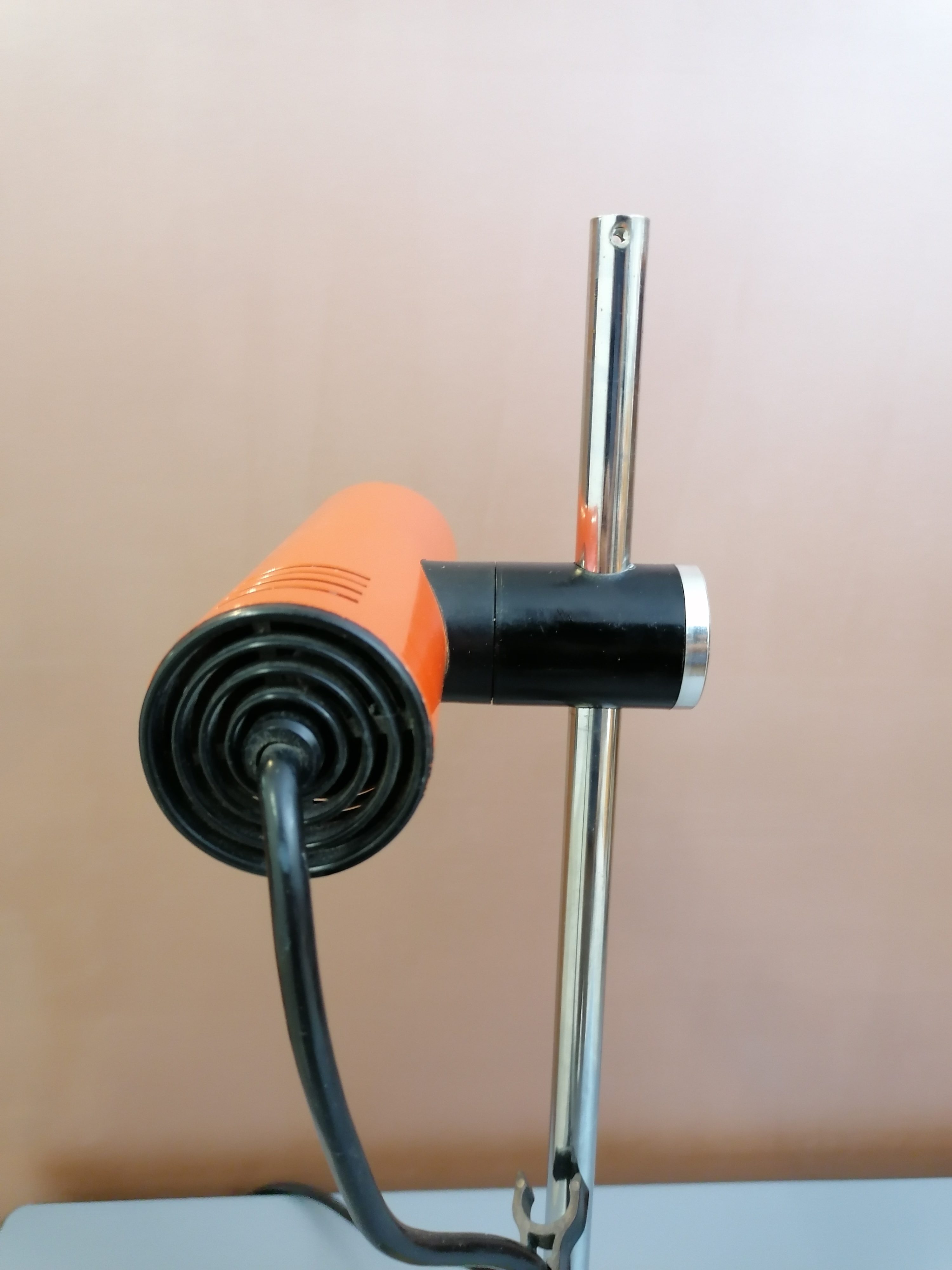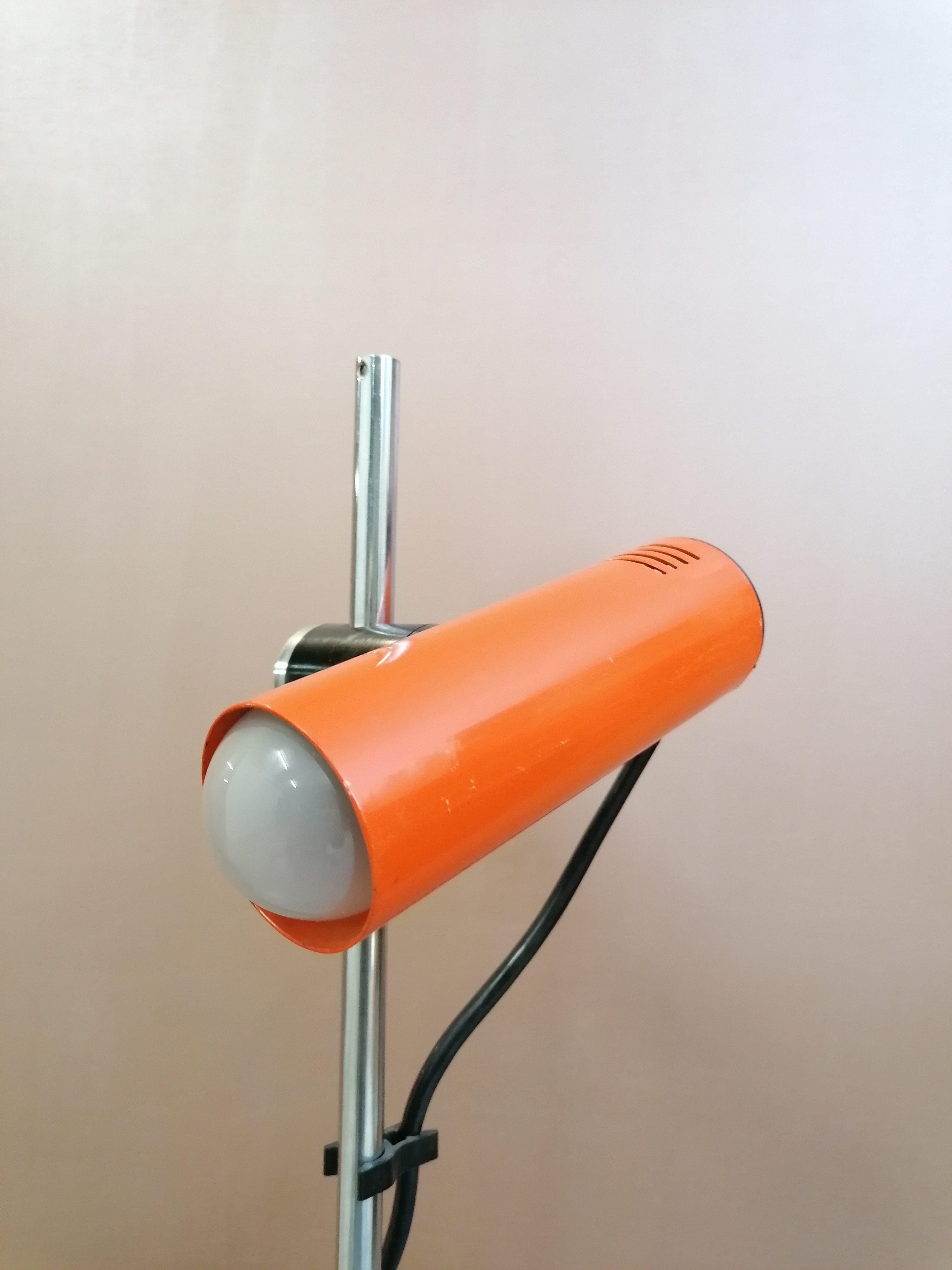 Produit venduLampe de table vintage avec socle en métal, tige en métal chromé et abat-jour orange. Interrupteur sur le fil. L’abat-jour peut être orienté dans toute les direction et est aussi réglable en hauteur. Quelques traces sur l’abat-jour (voir photos).