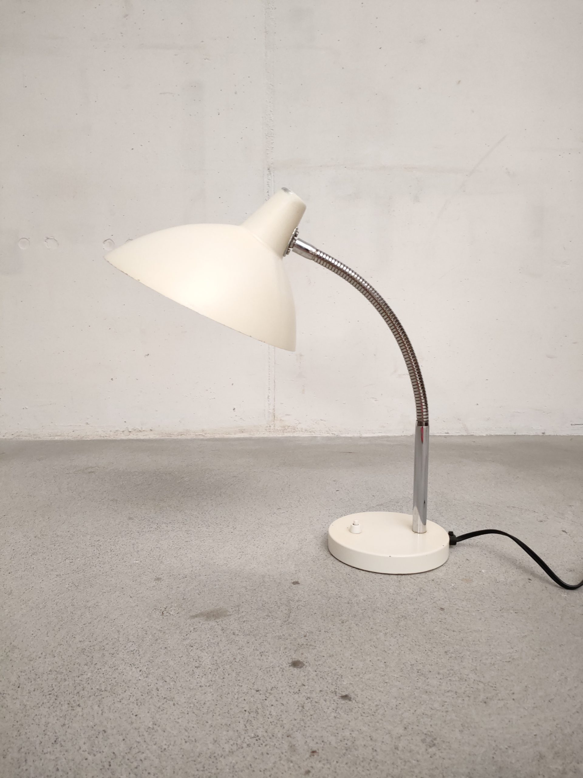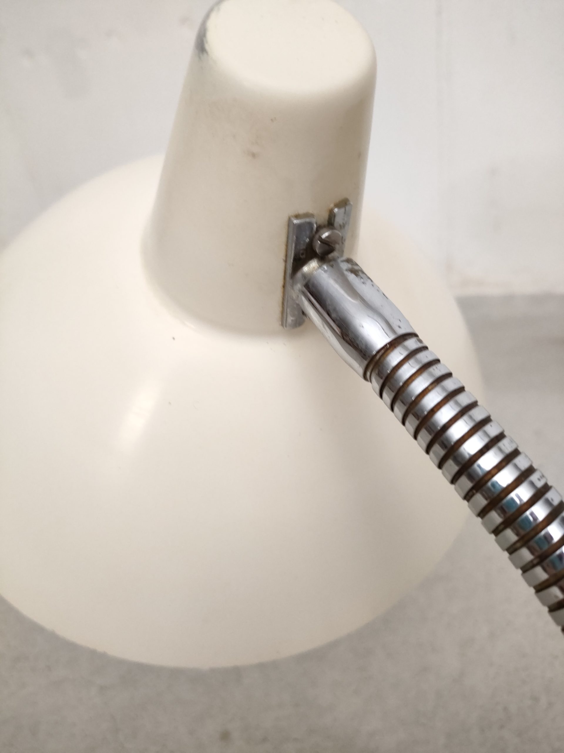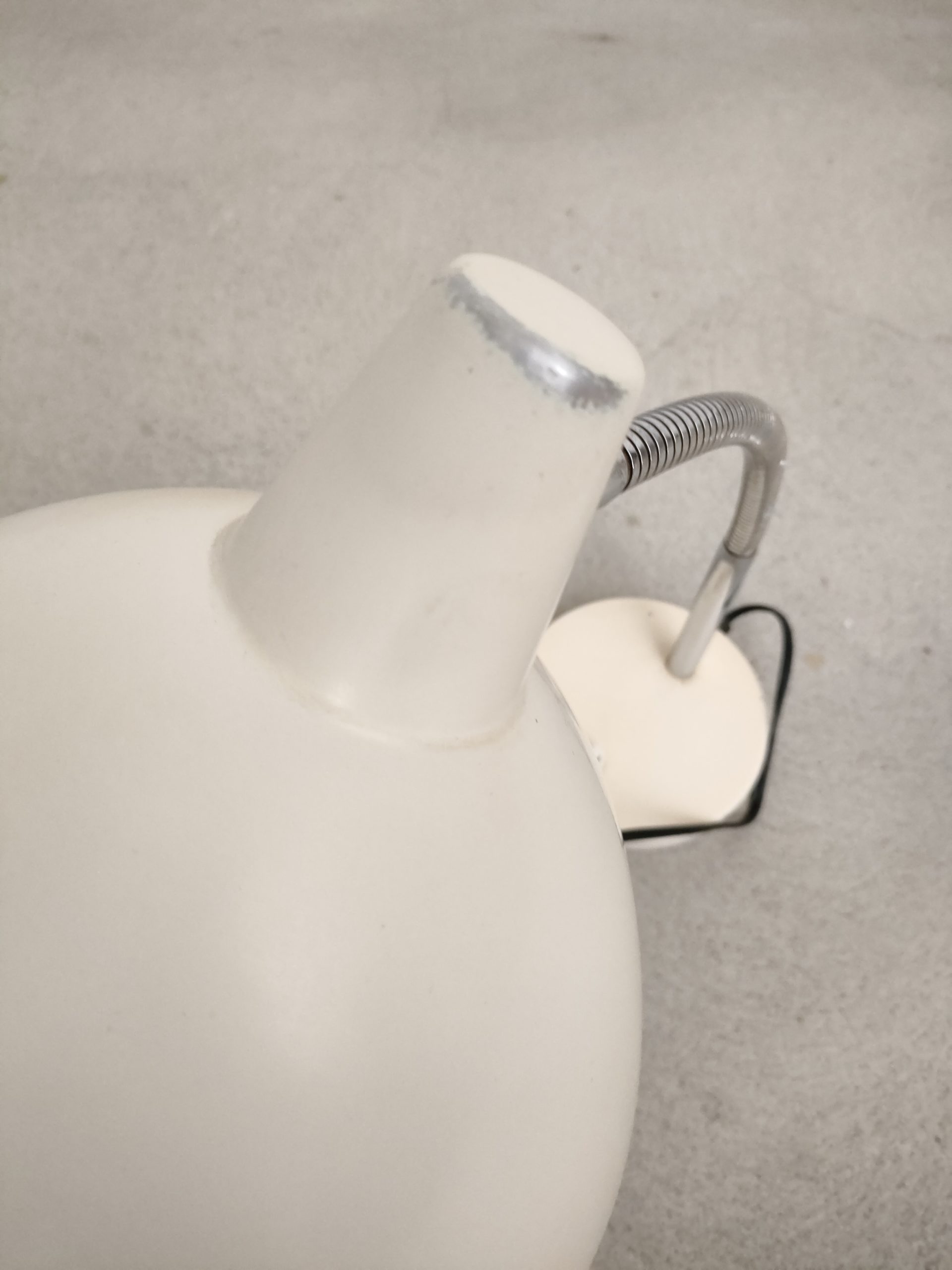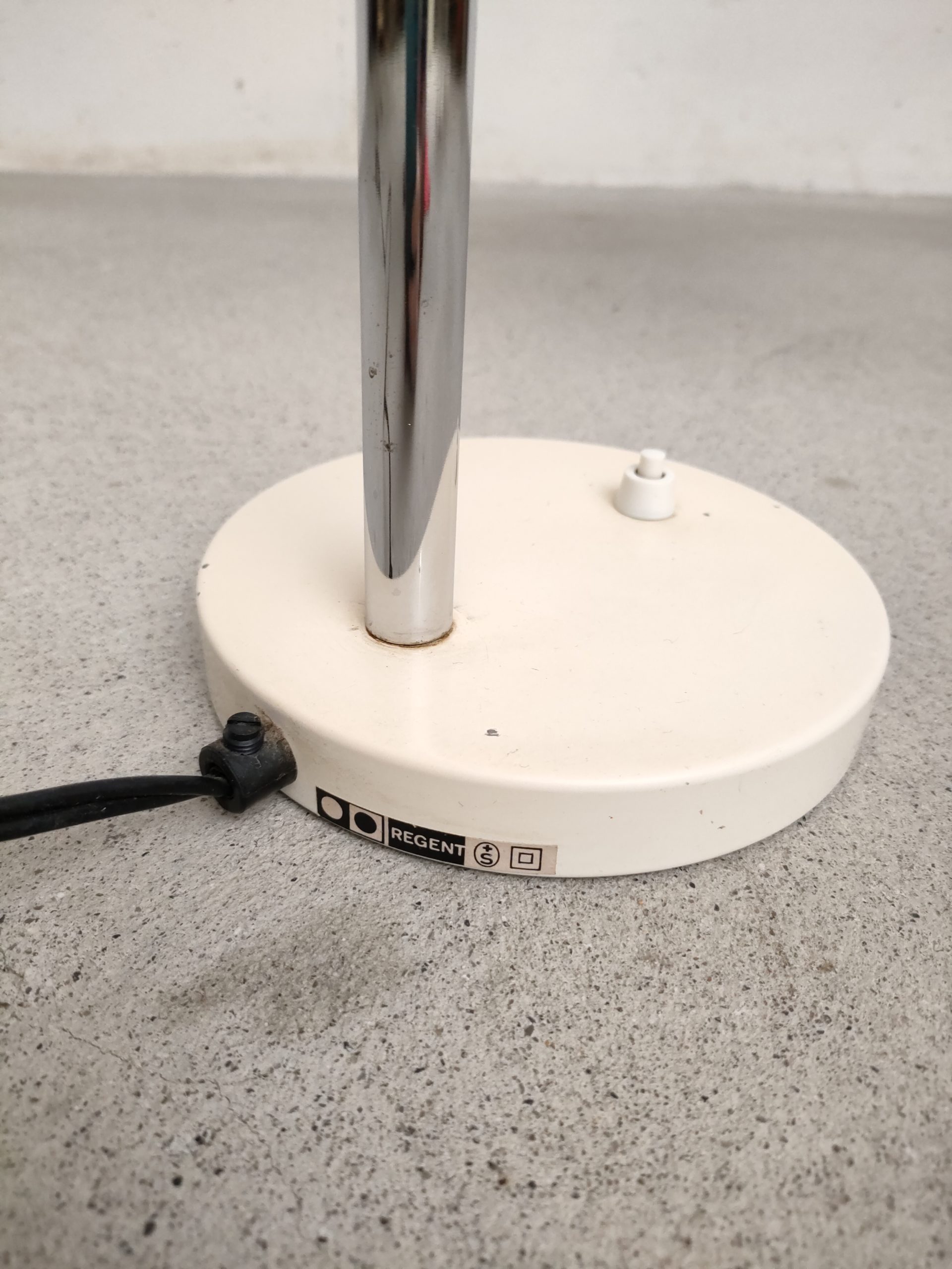 Produit venduLampe de table Regent avec socle et abat-jour en métal blanc et tige en flexible en bon état. Des légères traces d’usure sont présentes (voir photos). La lampe fonctionne avec des ampoules standard.
