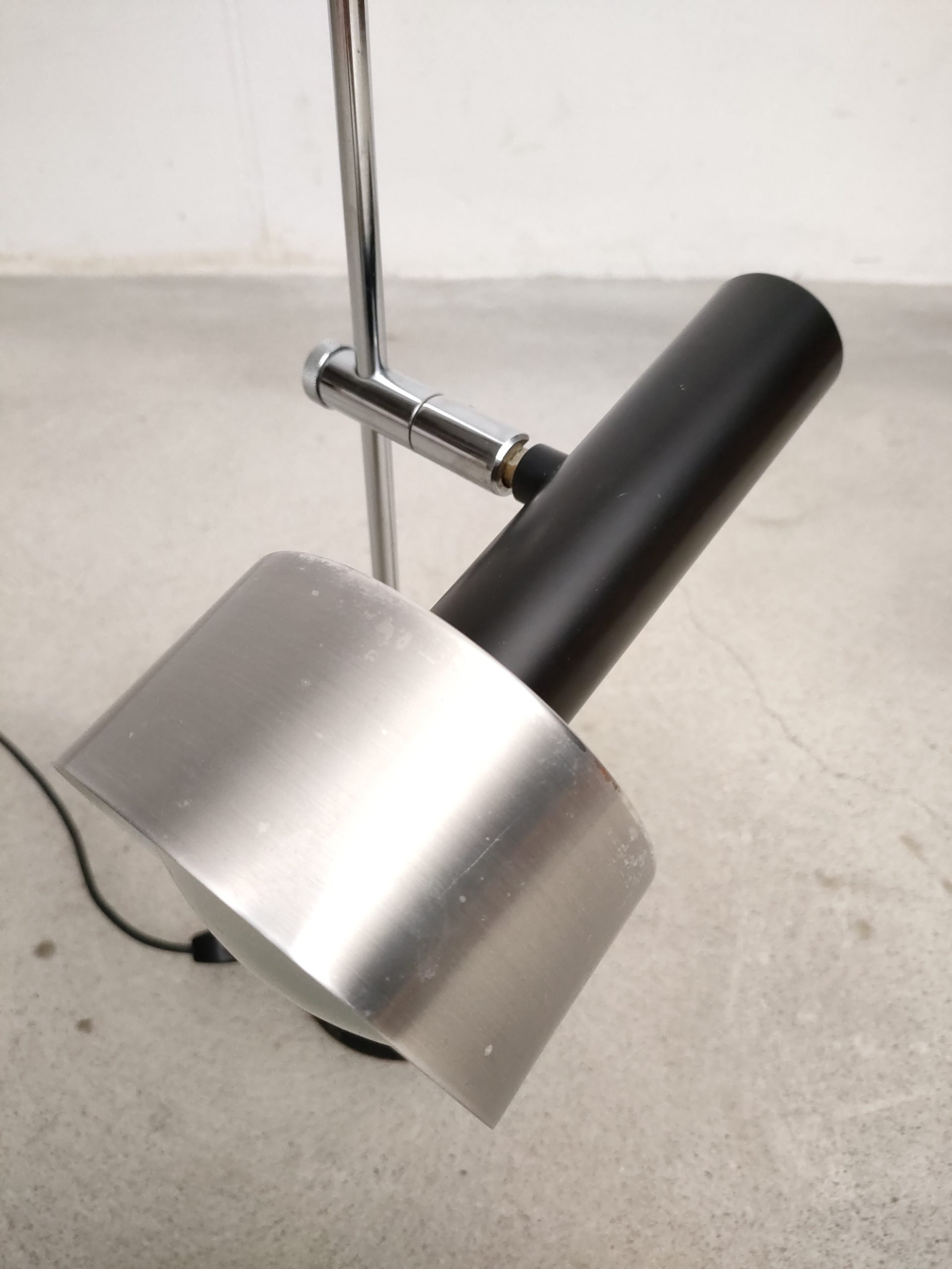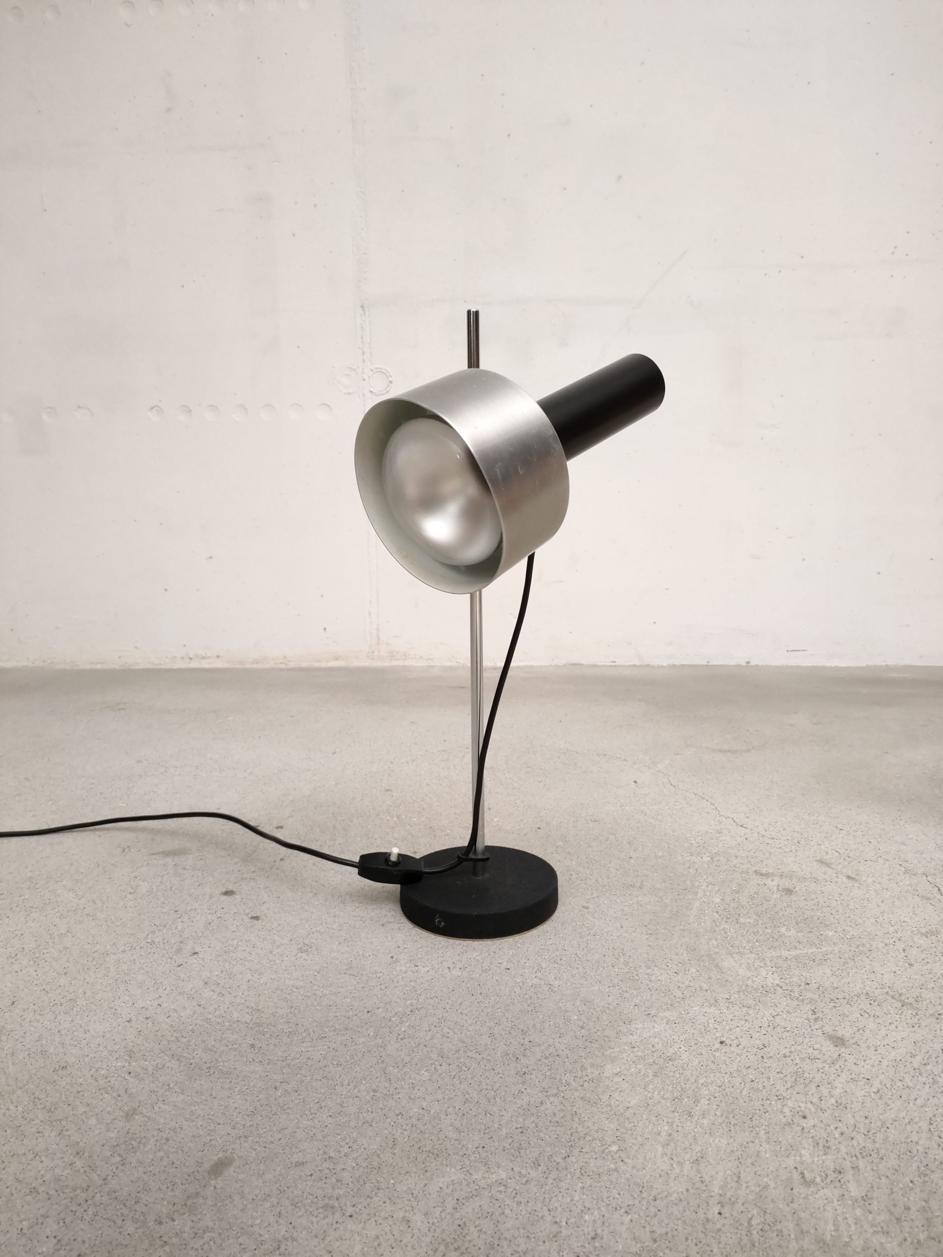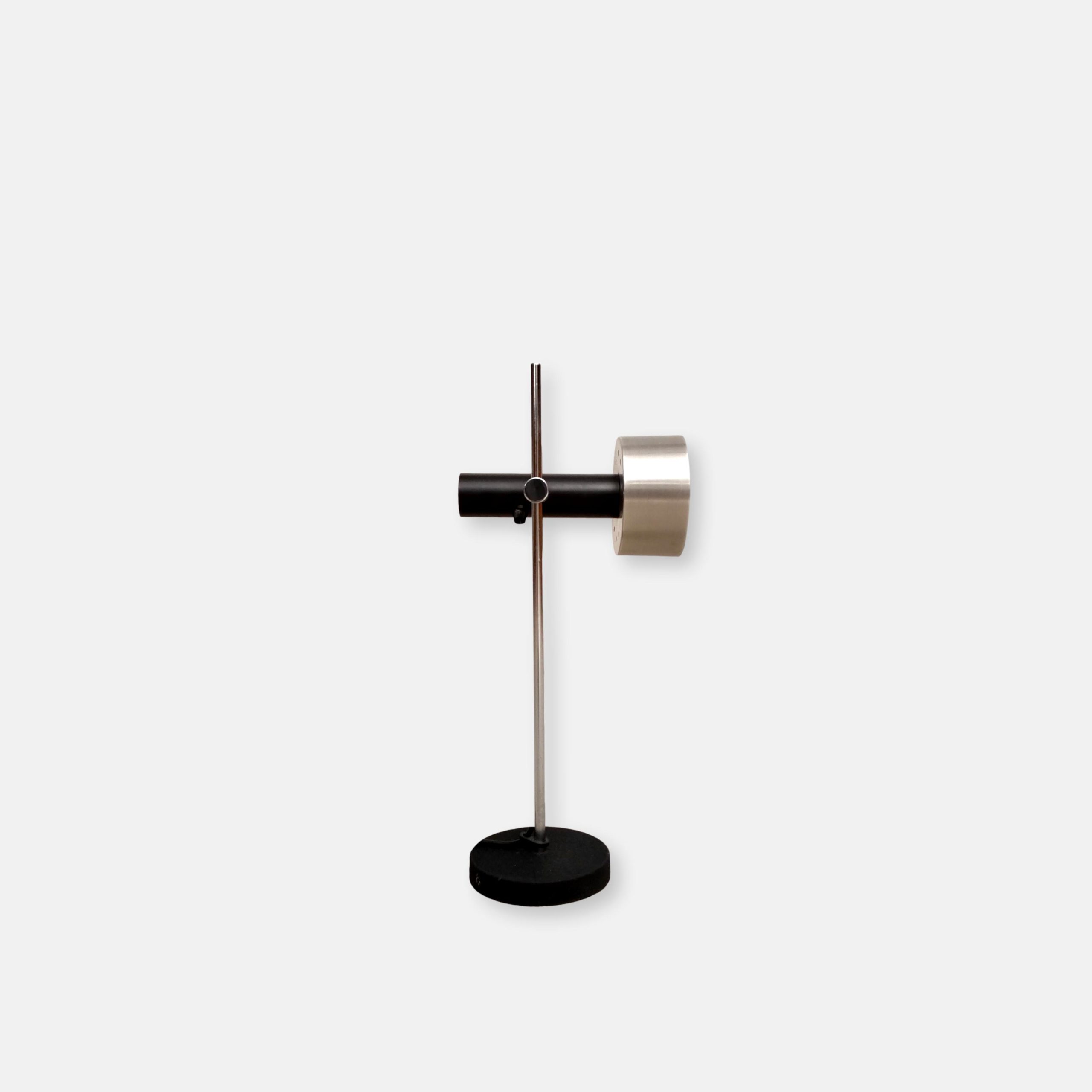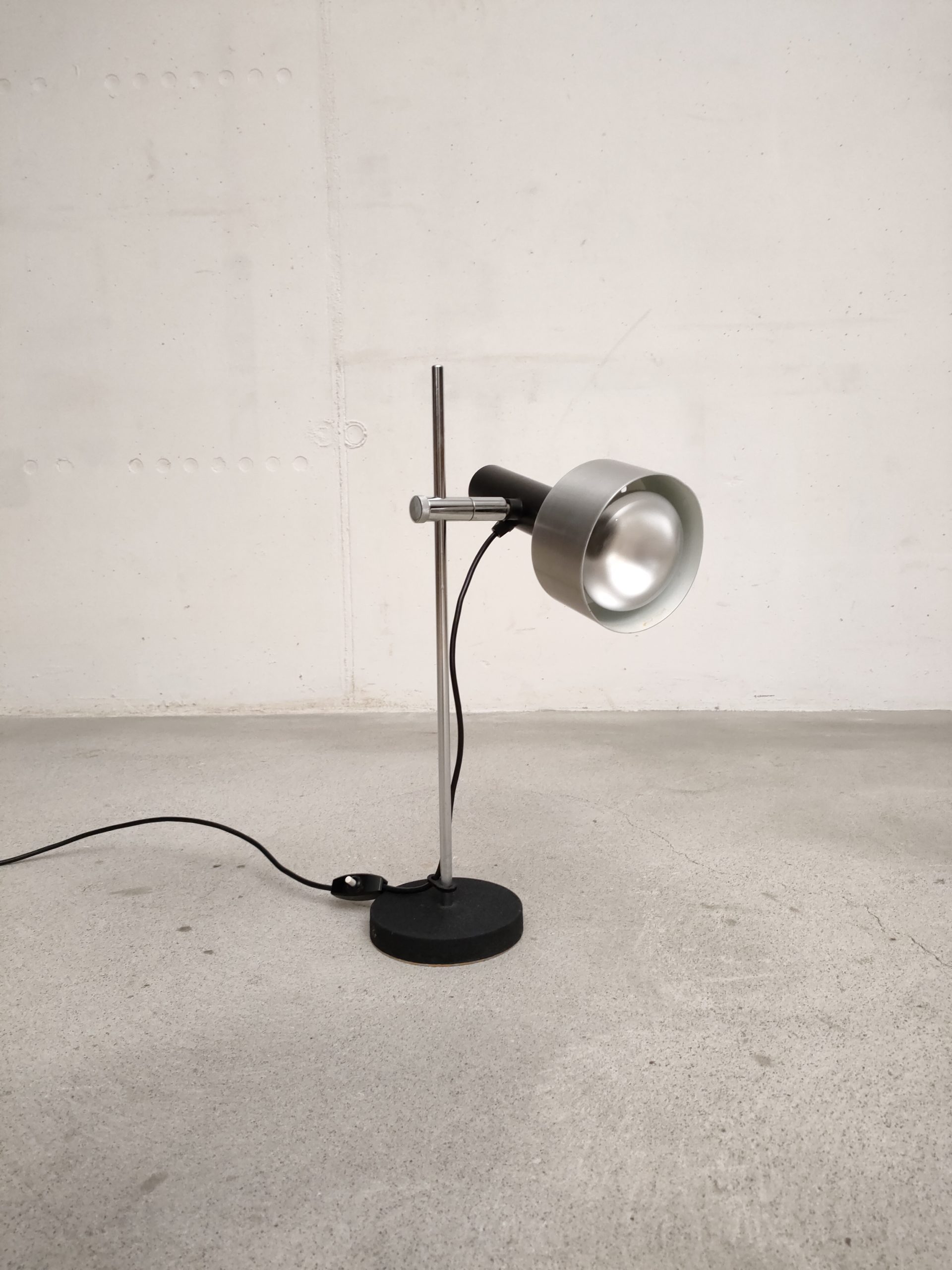 Produit venduLampe de table vintage avec socle en fonte, tige en métal chromé et spot en métal noir et métal argenté. Le spot peut être orienté dans toutes les directions et la hauteur est aussi réglable. Quelques légères traces d’usure. Elle fonctionne parfaitement.