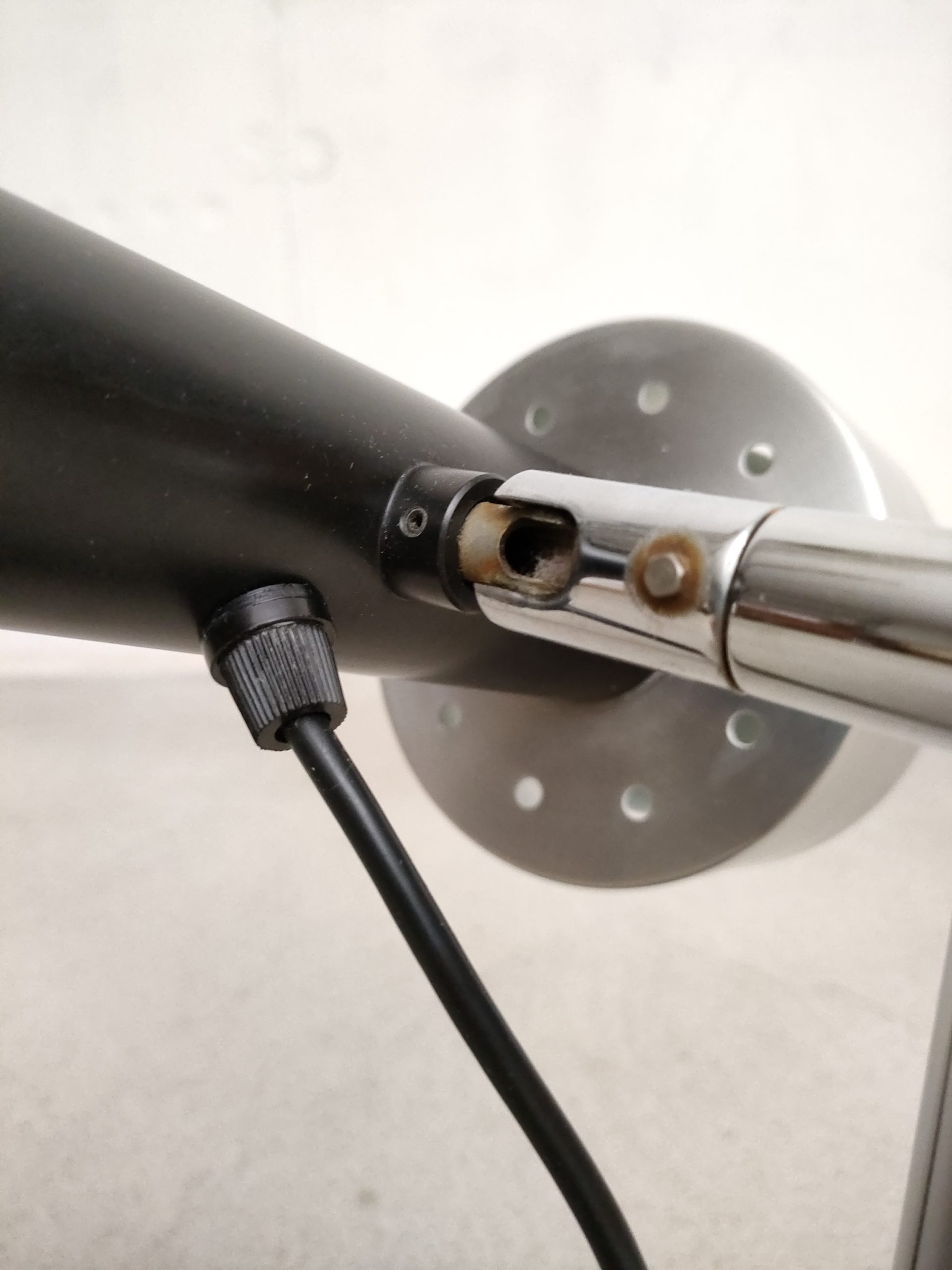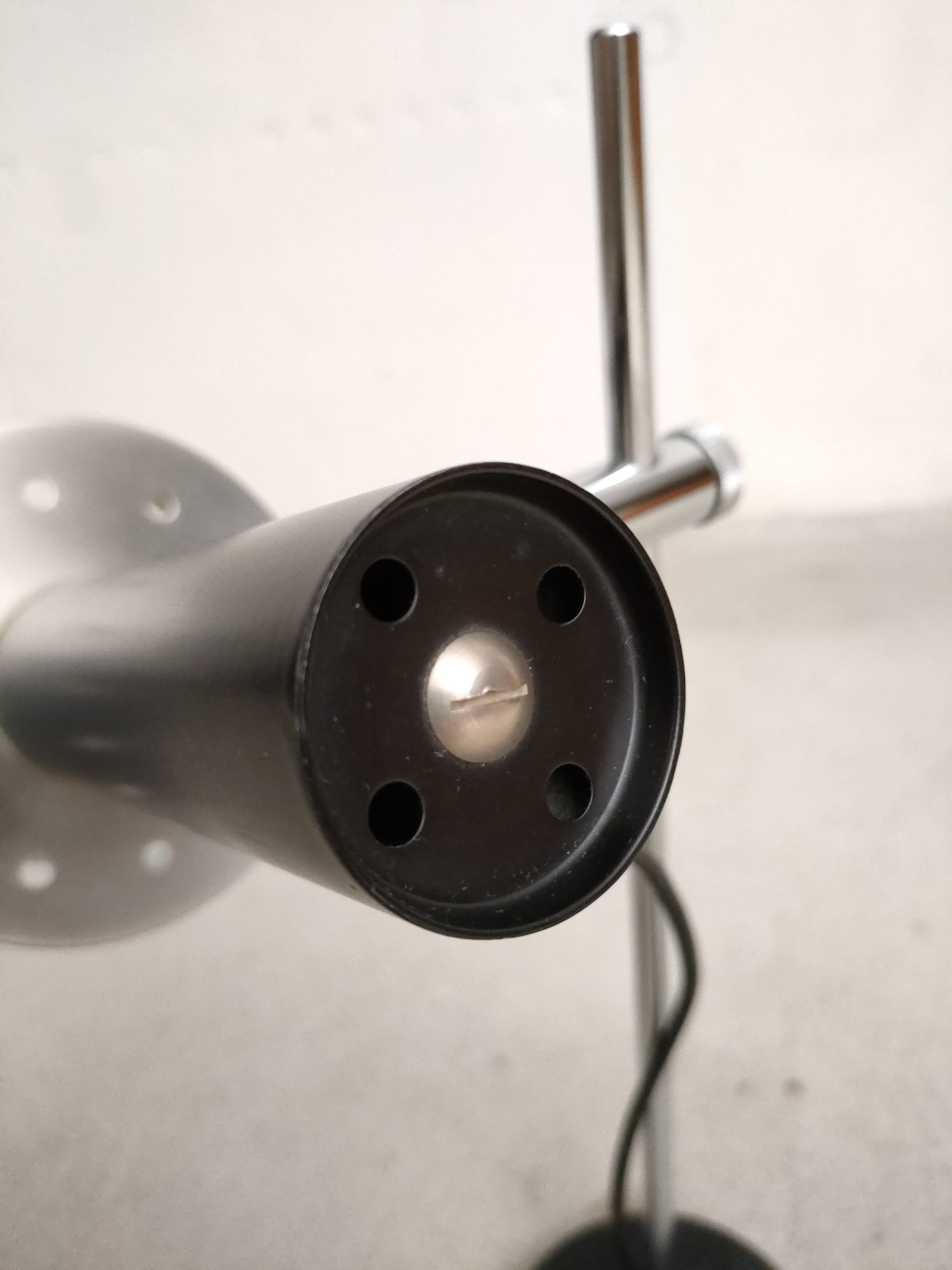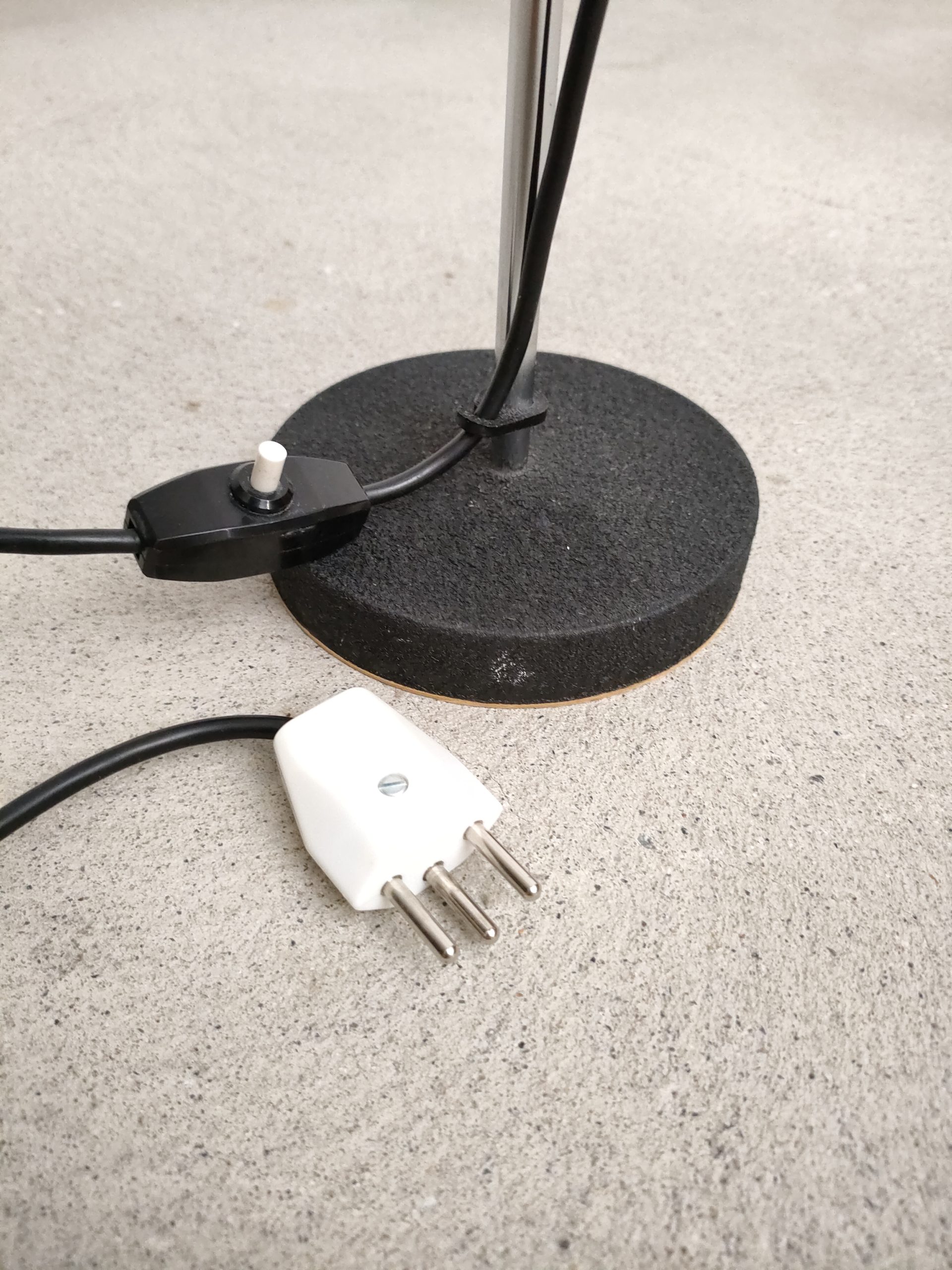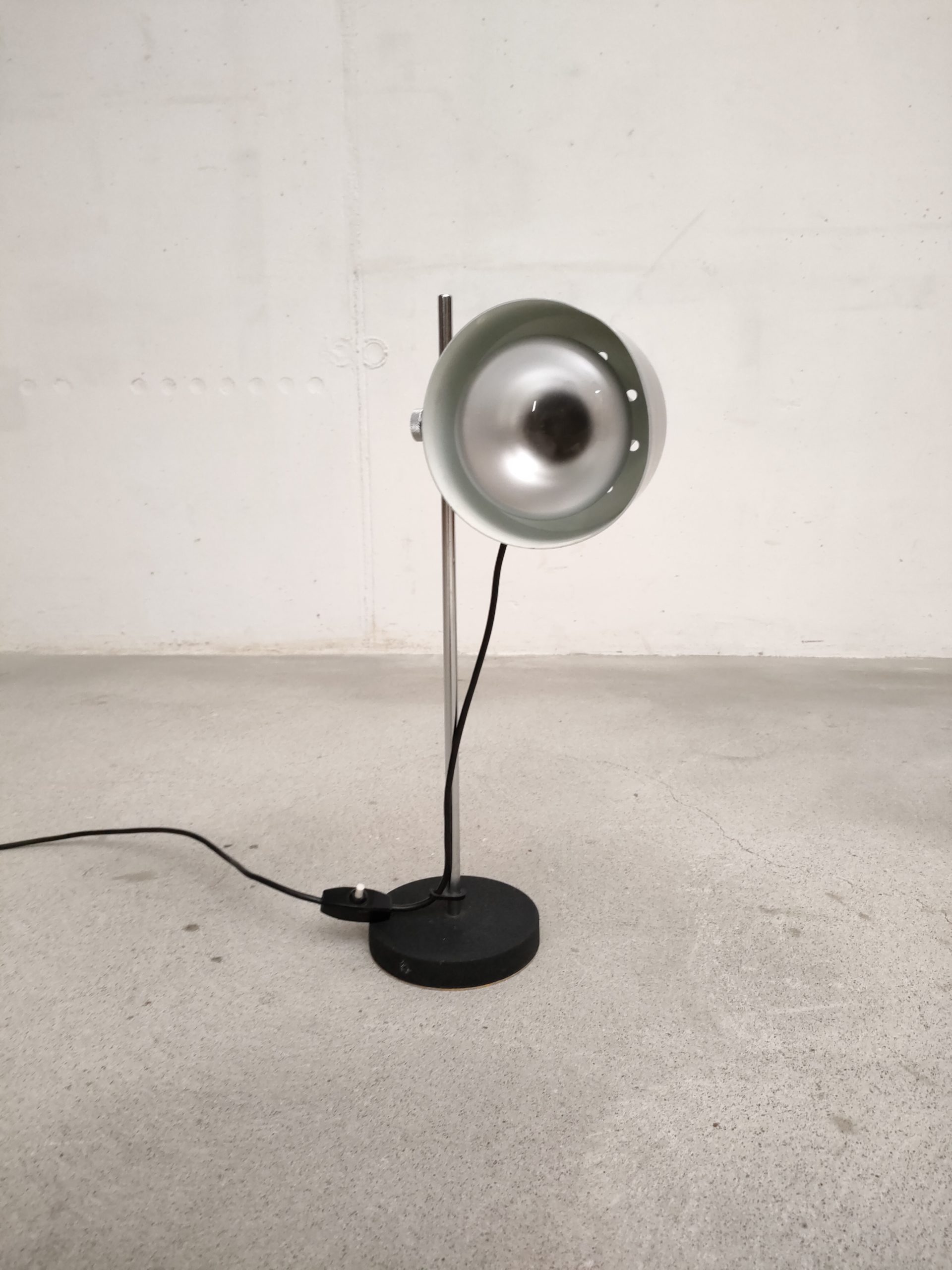 Produit venduLampe de table vintage avec socle en fonte, tige en métal chromé et spot en métal noir et métal argenté. Le spot peut être orienté dans toutes les directions et la hauteur est aussi réglable. Quelques légères traces d’usure. Elle fonctionne parfaitement.