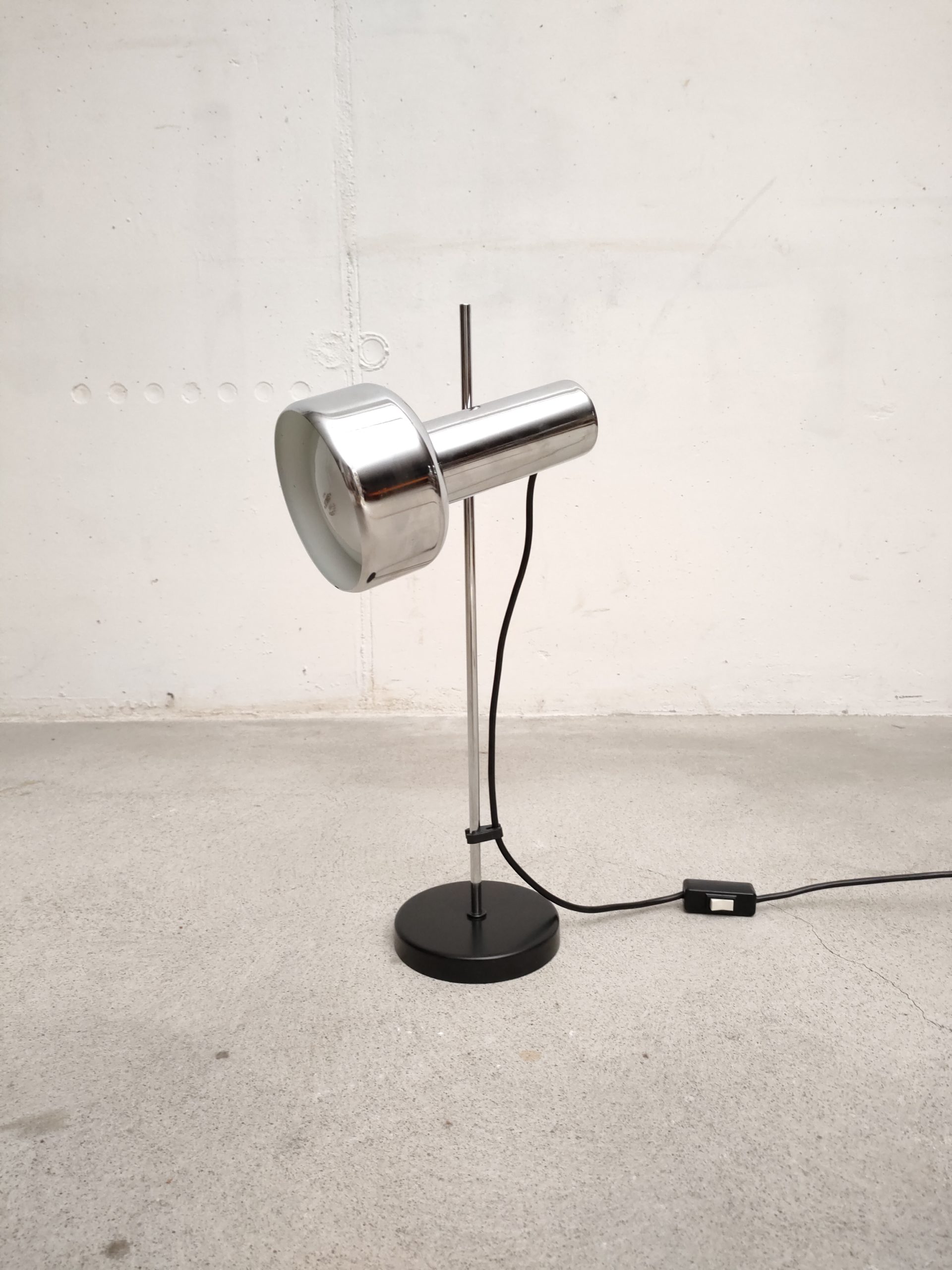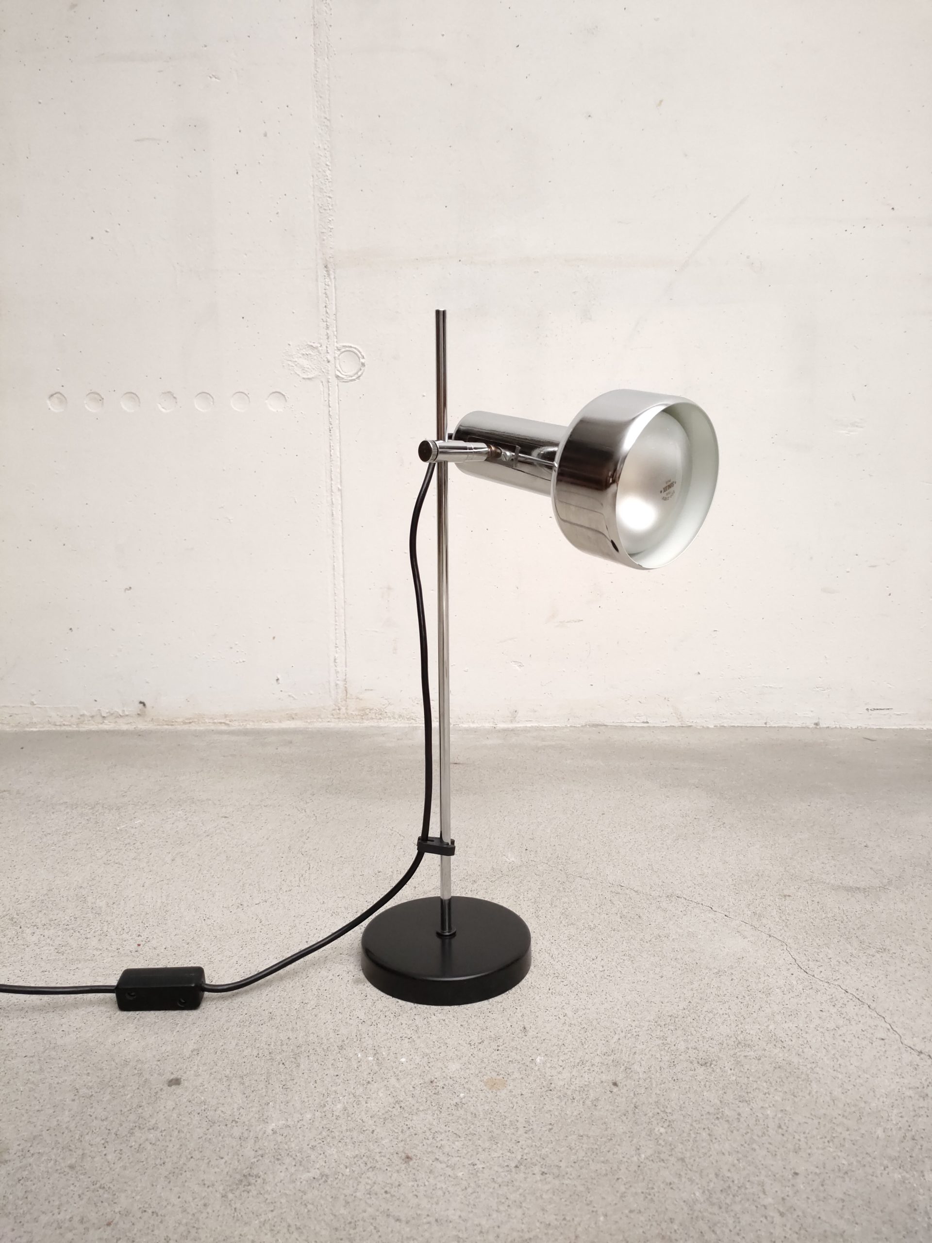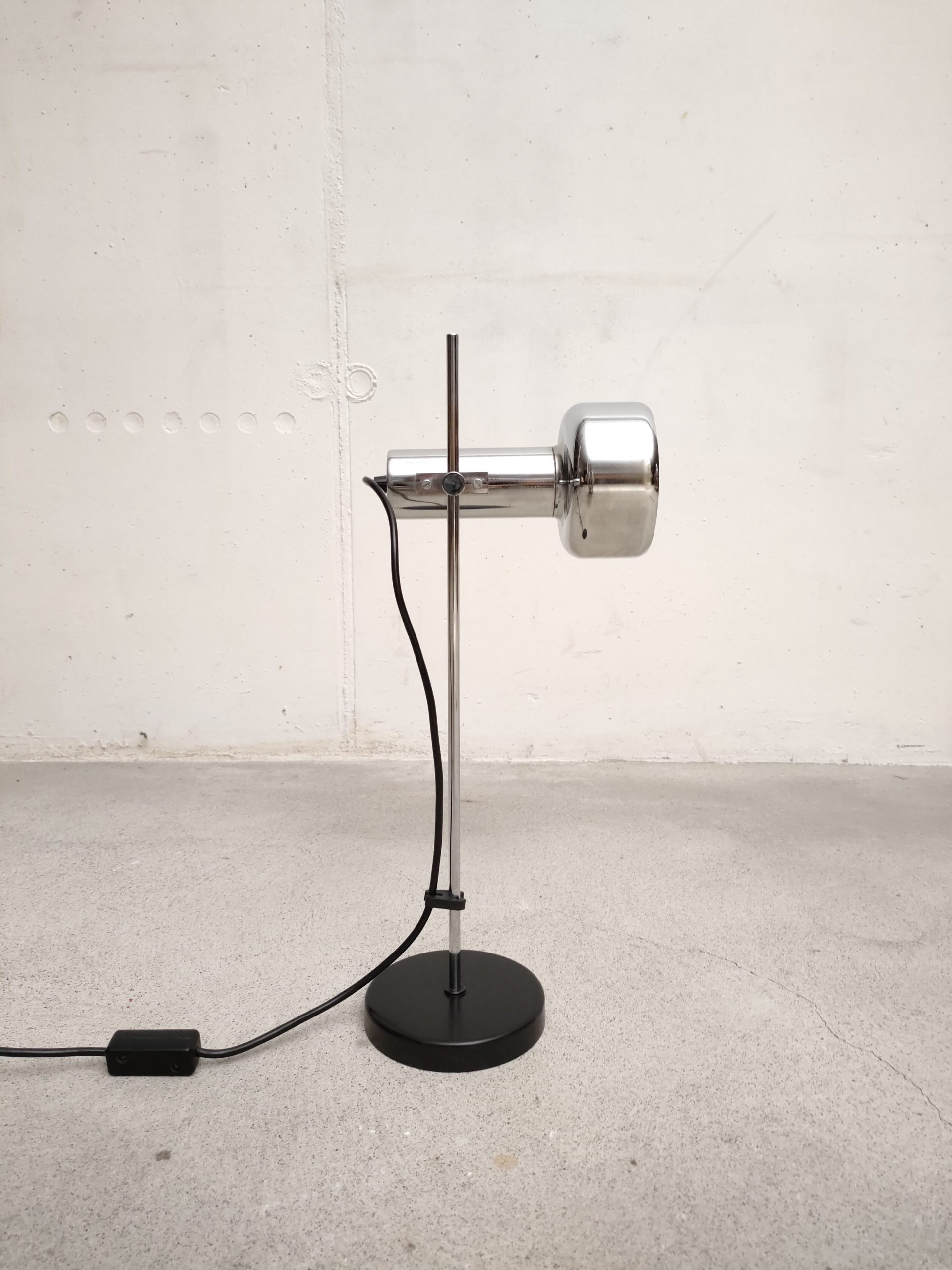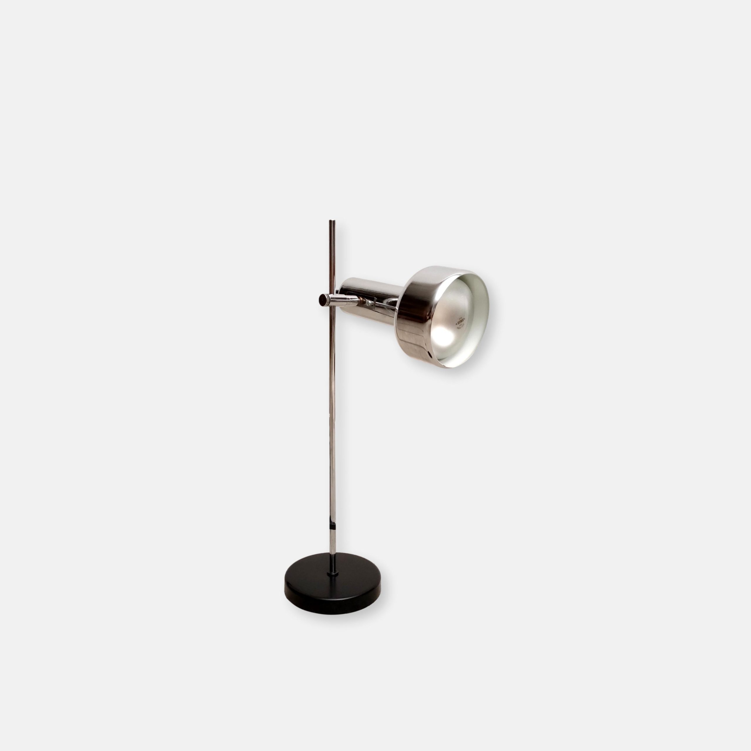 Produit venduLampe de table vintage avec socle en métal noir, spot en métal argenté et tige en métal chromé. Le spot a une très belle forme et peut être orienté dans toutes les directions. Stable et solide et parfaitement fonctionnelle.