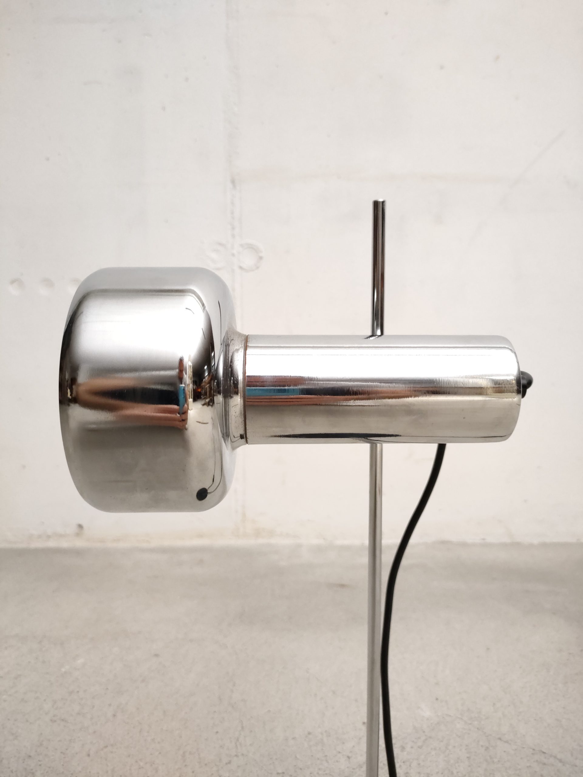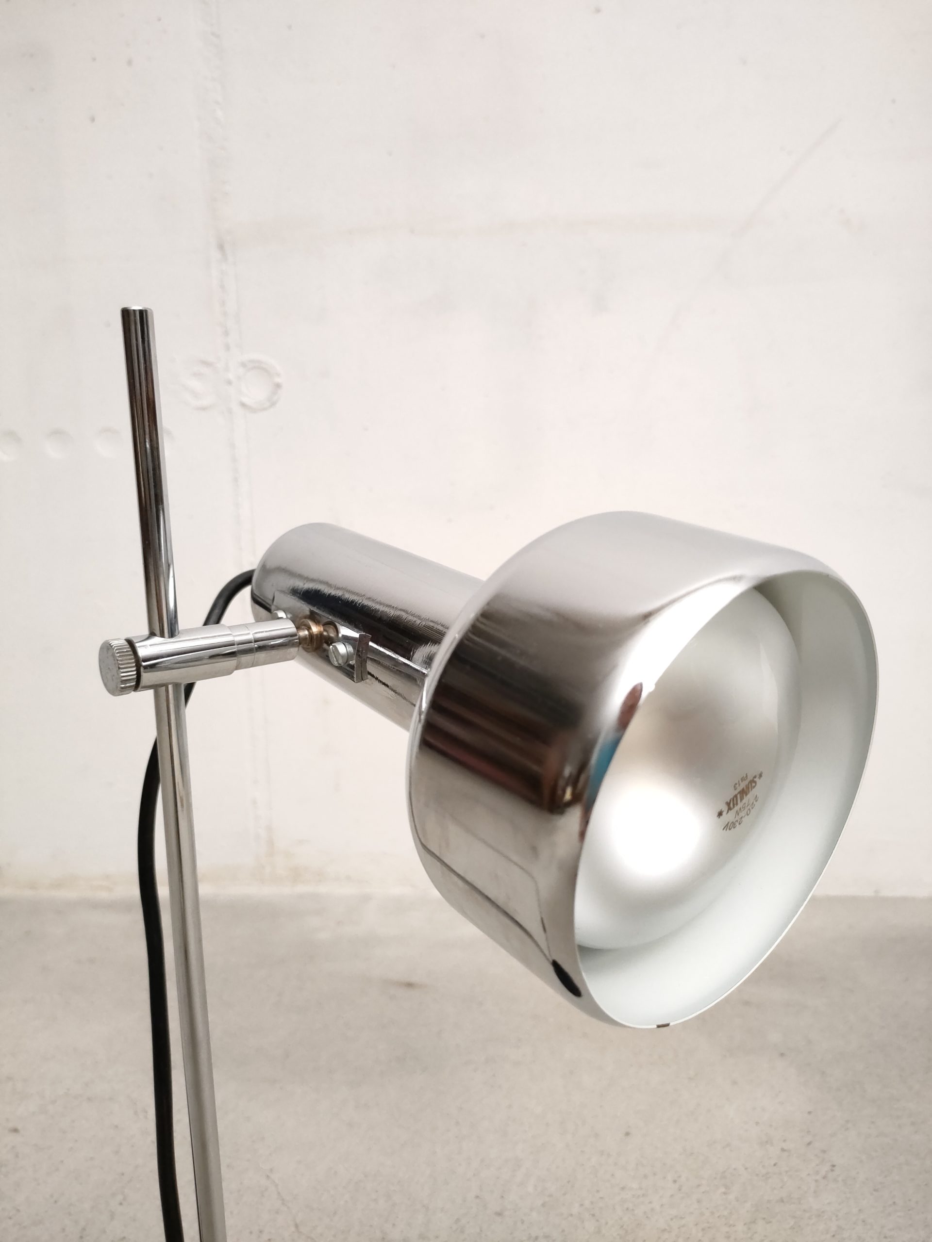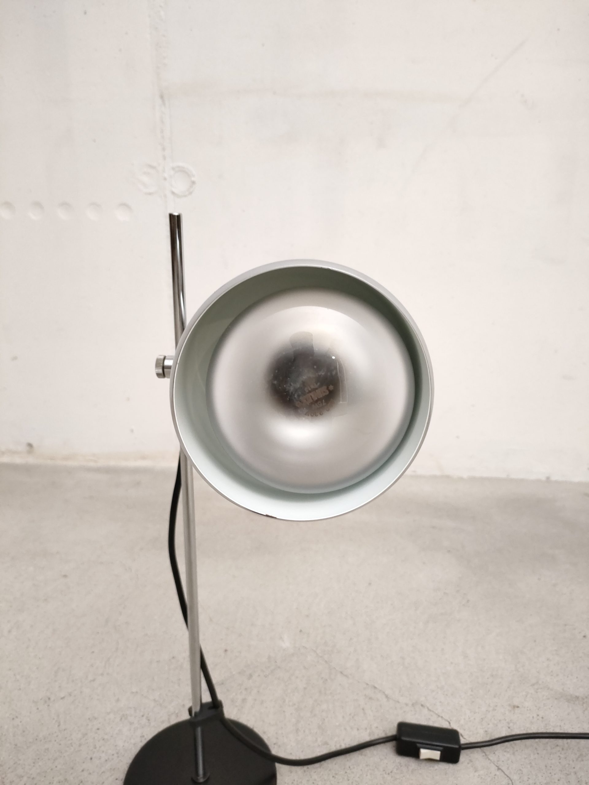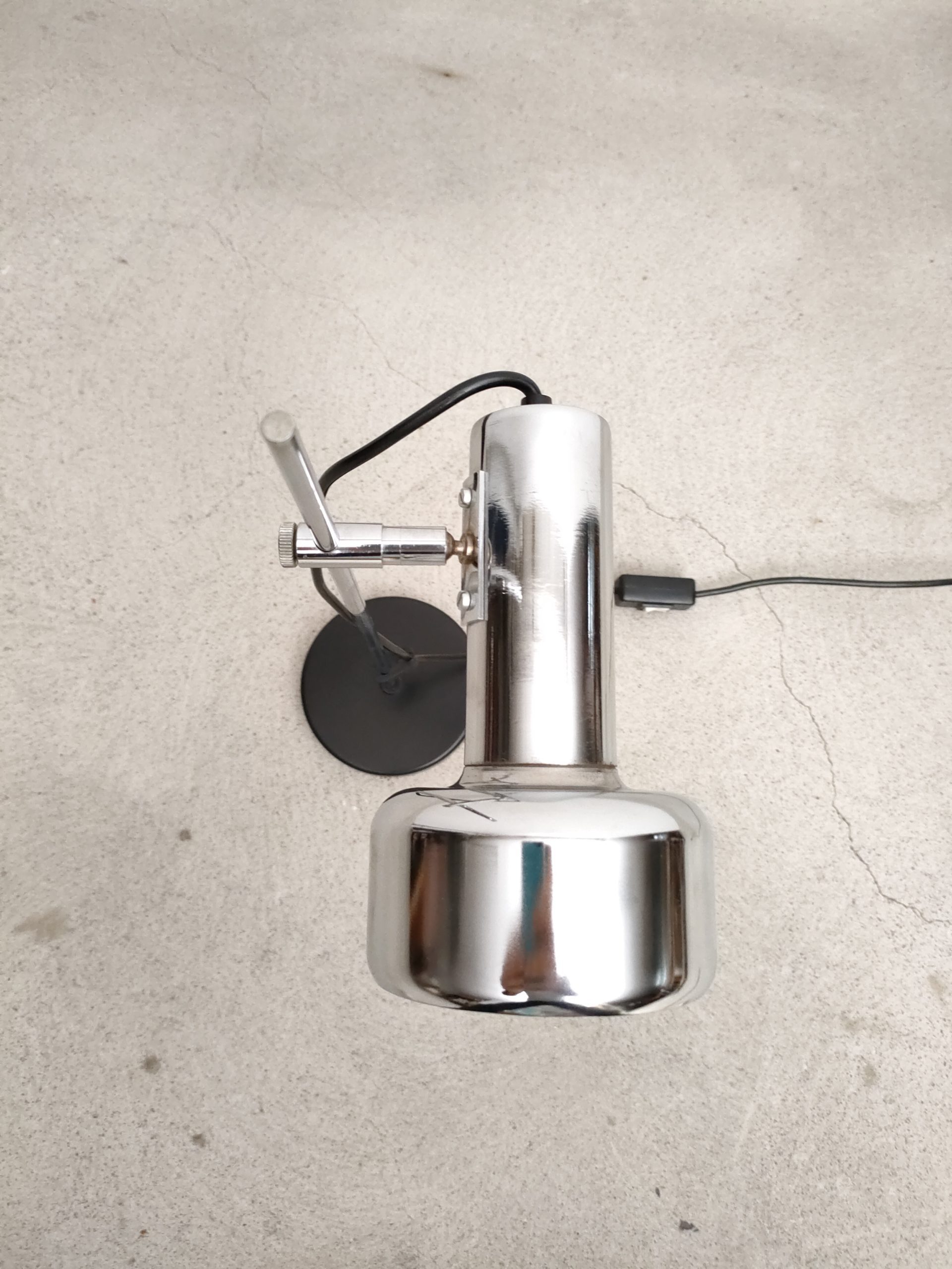Produit venduLampe de table vintage avec socle en métal noir, spot en métal argenté et tige en métal chromé. Le spot a une très belle forme et peut être orienté dans toutes les directions. Stable et solide et parfaitement fonctionnelle.