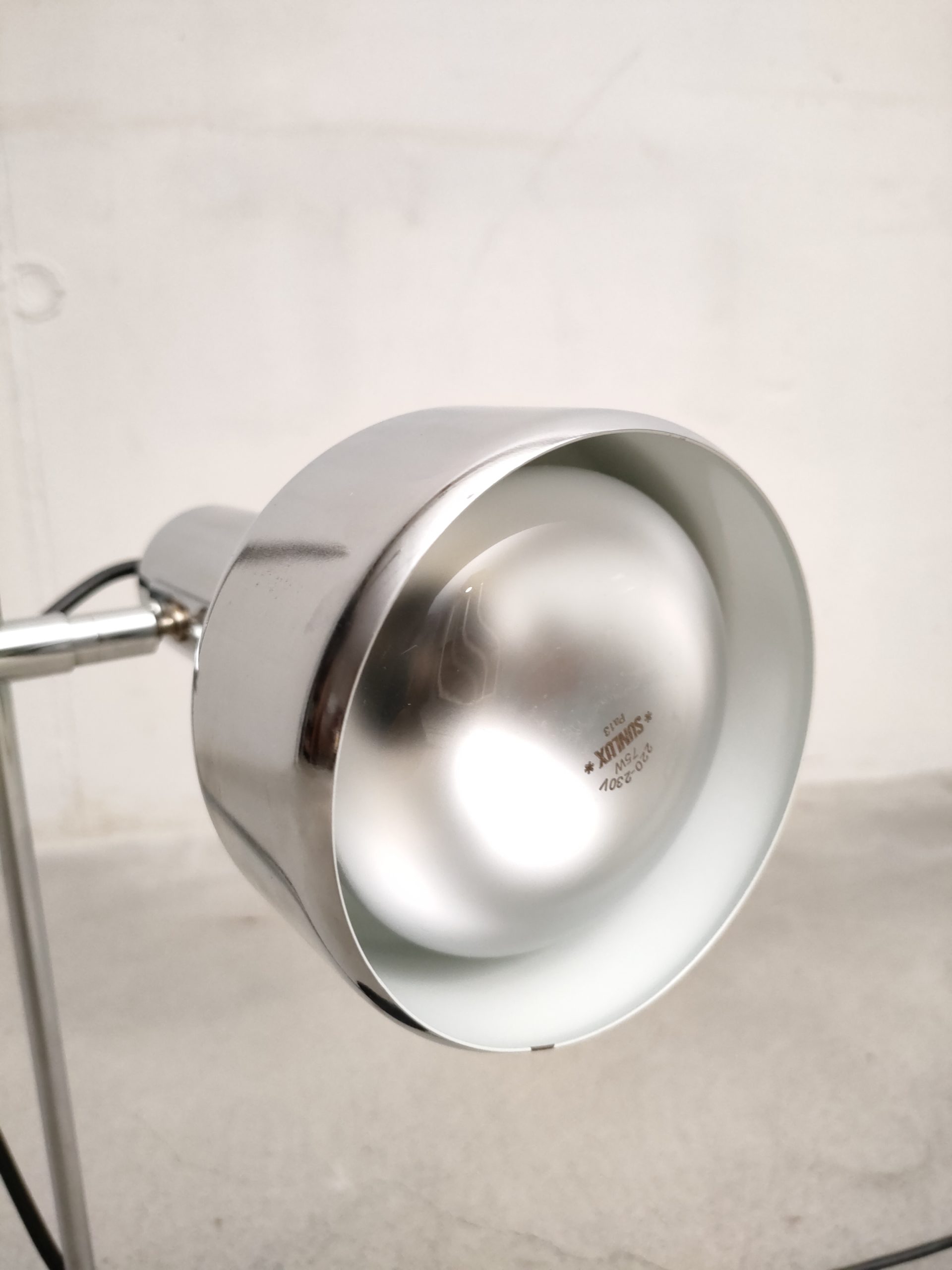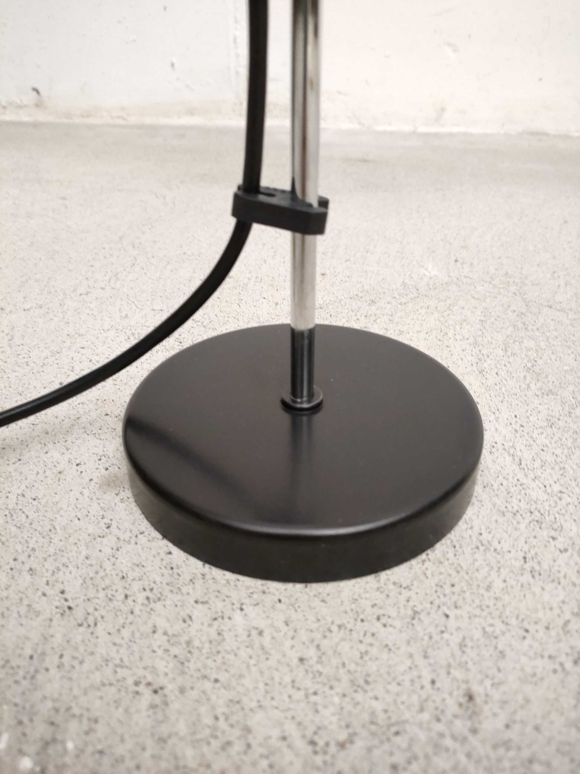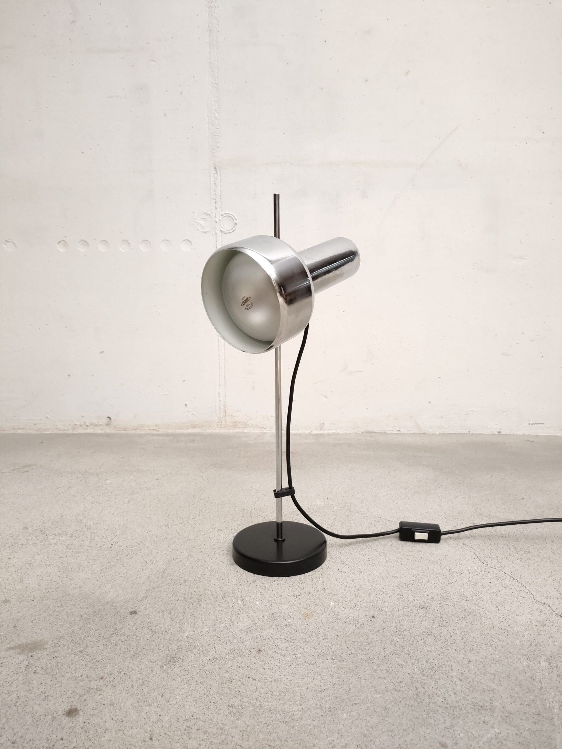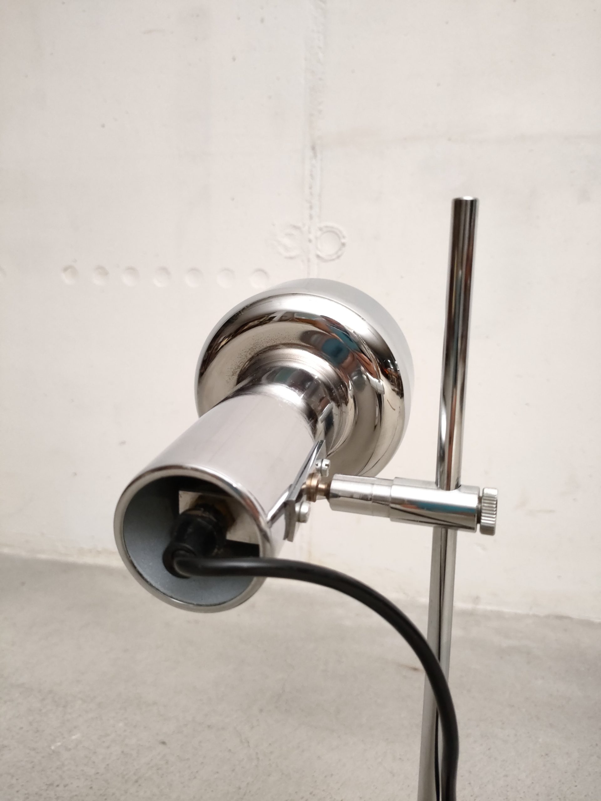 Produit venduLampe de table vintage avec socle en métal noir, spot en métal argenté et tige en métal chromé. Le spot a une très belle forme et peut être orienté dans toutes les directions. Stable et solide et parfaitement fonctionnelle.