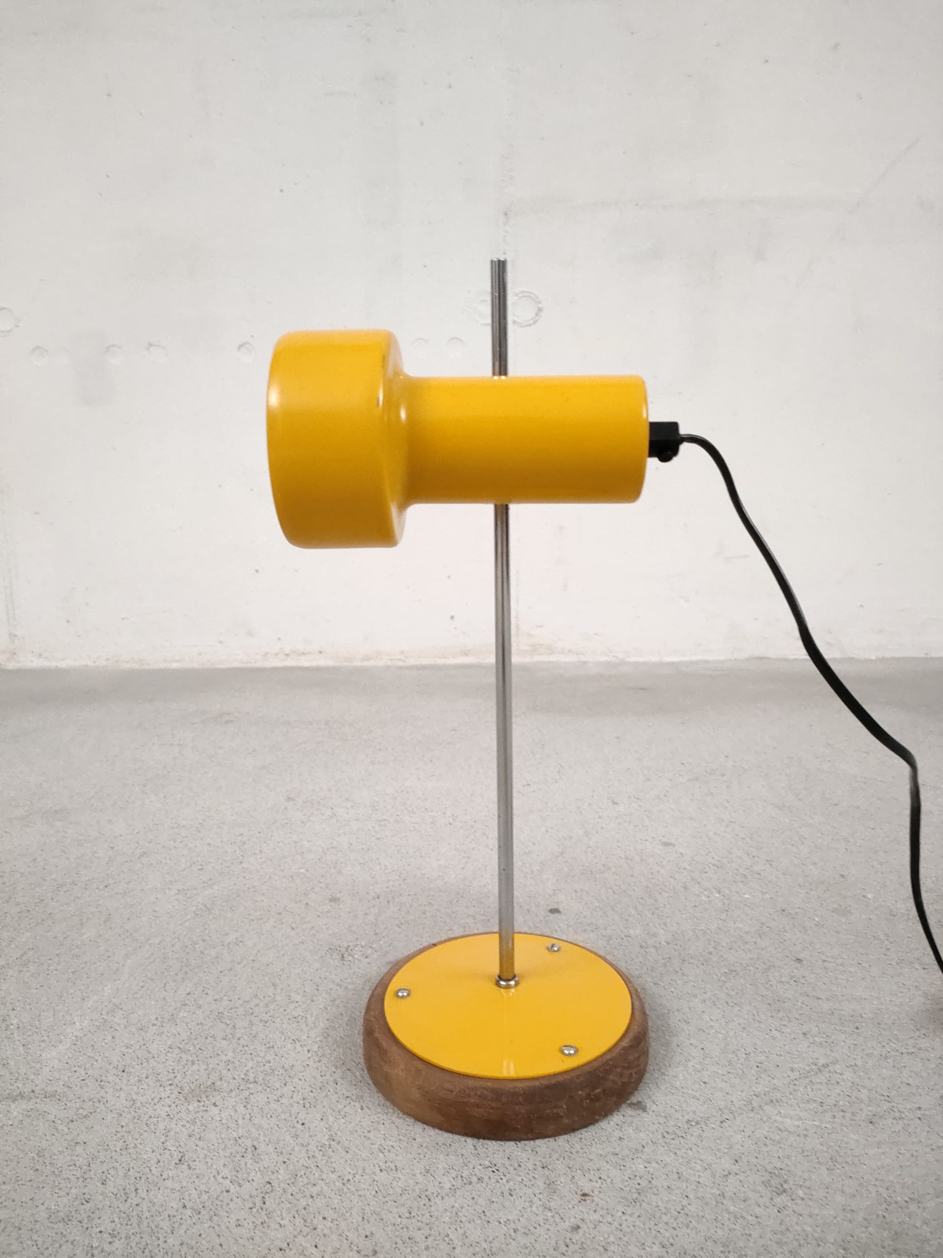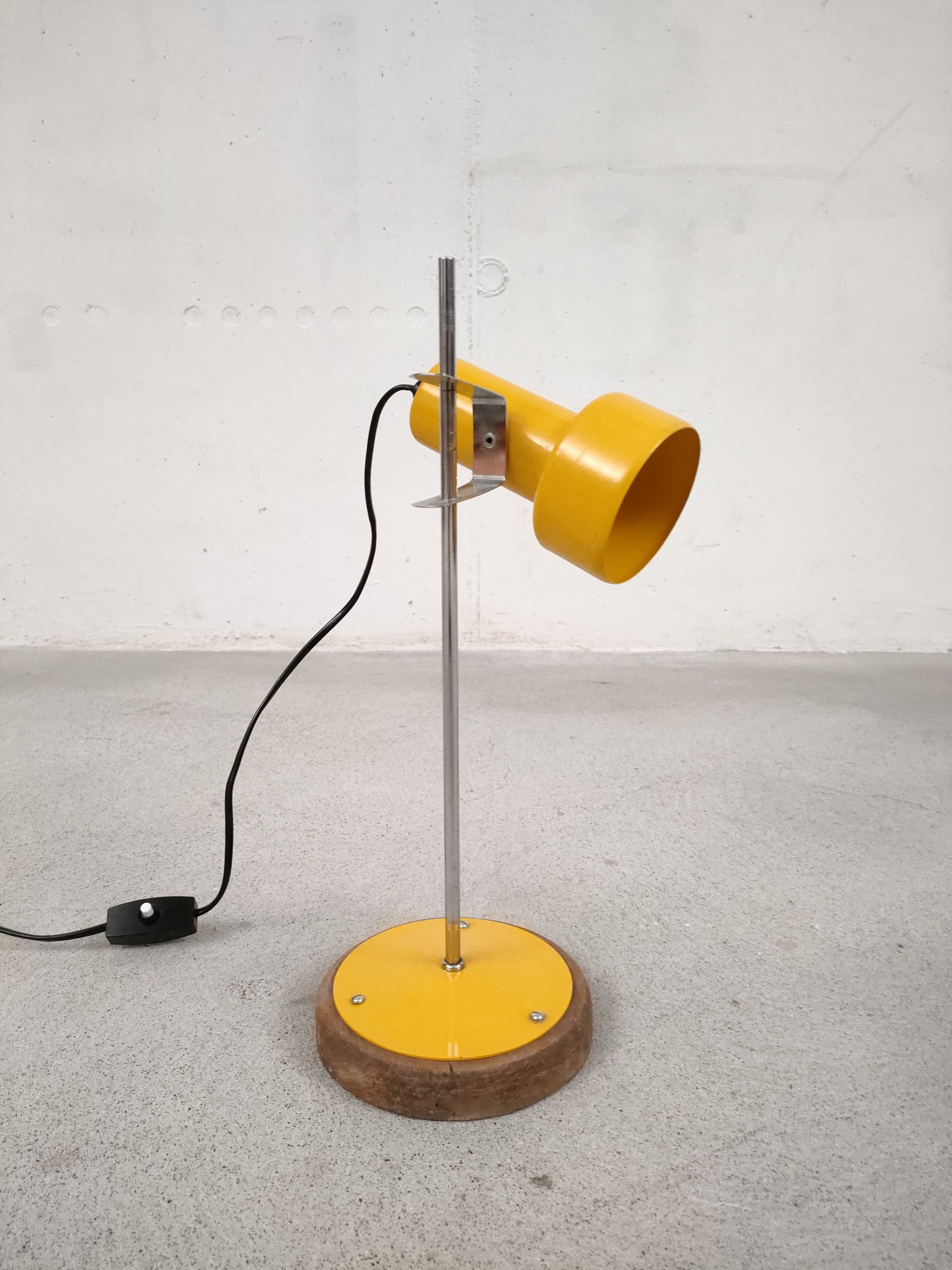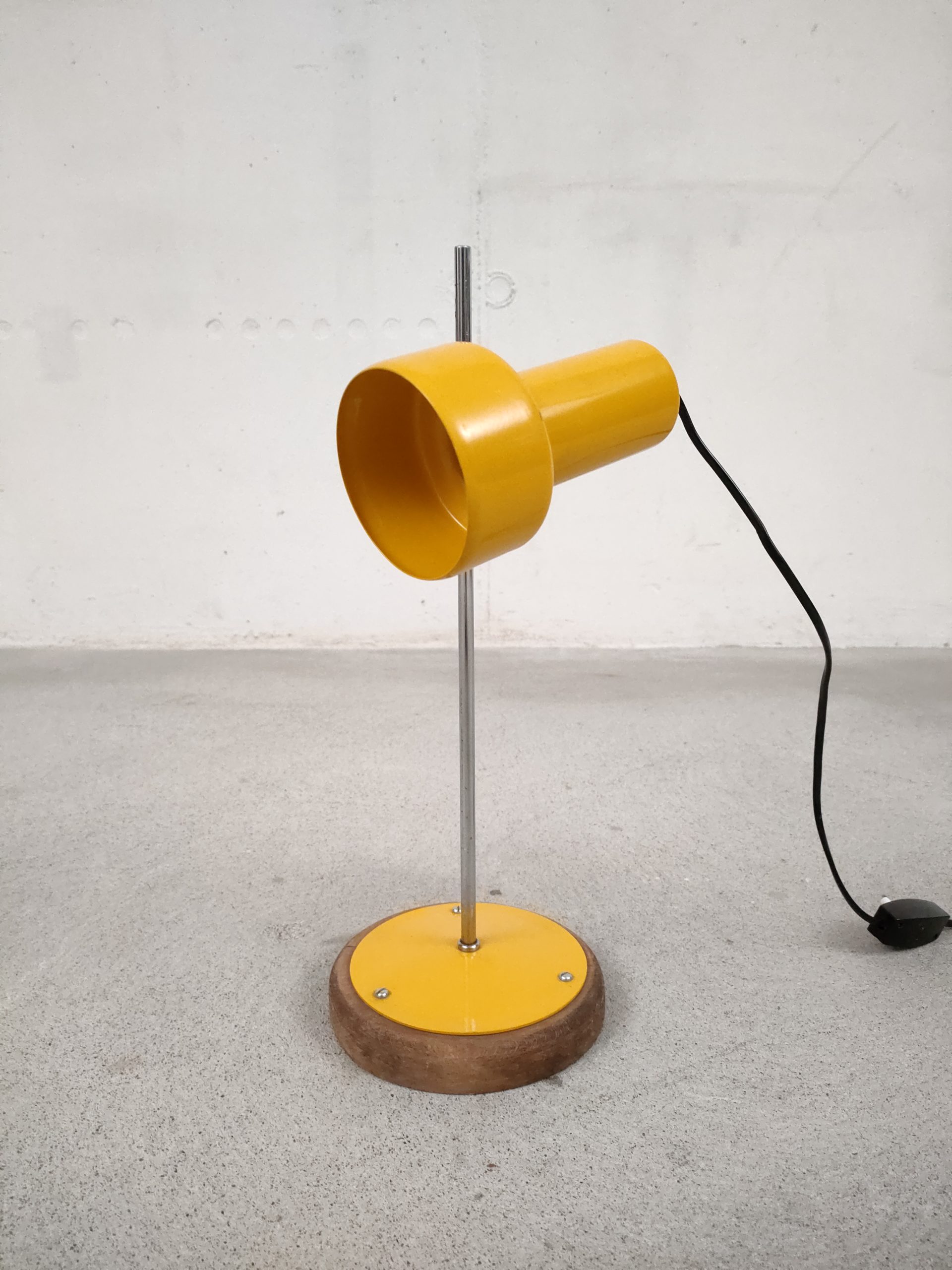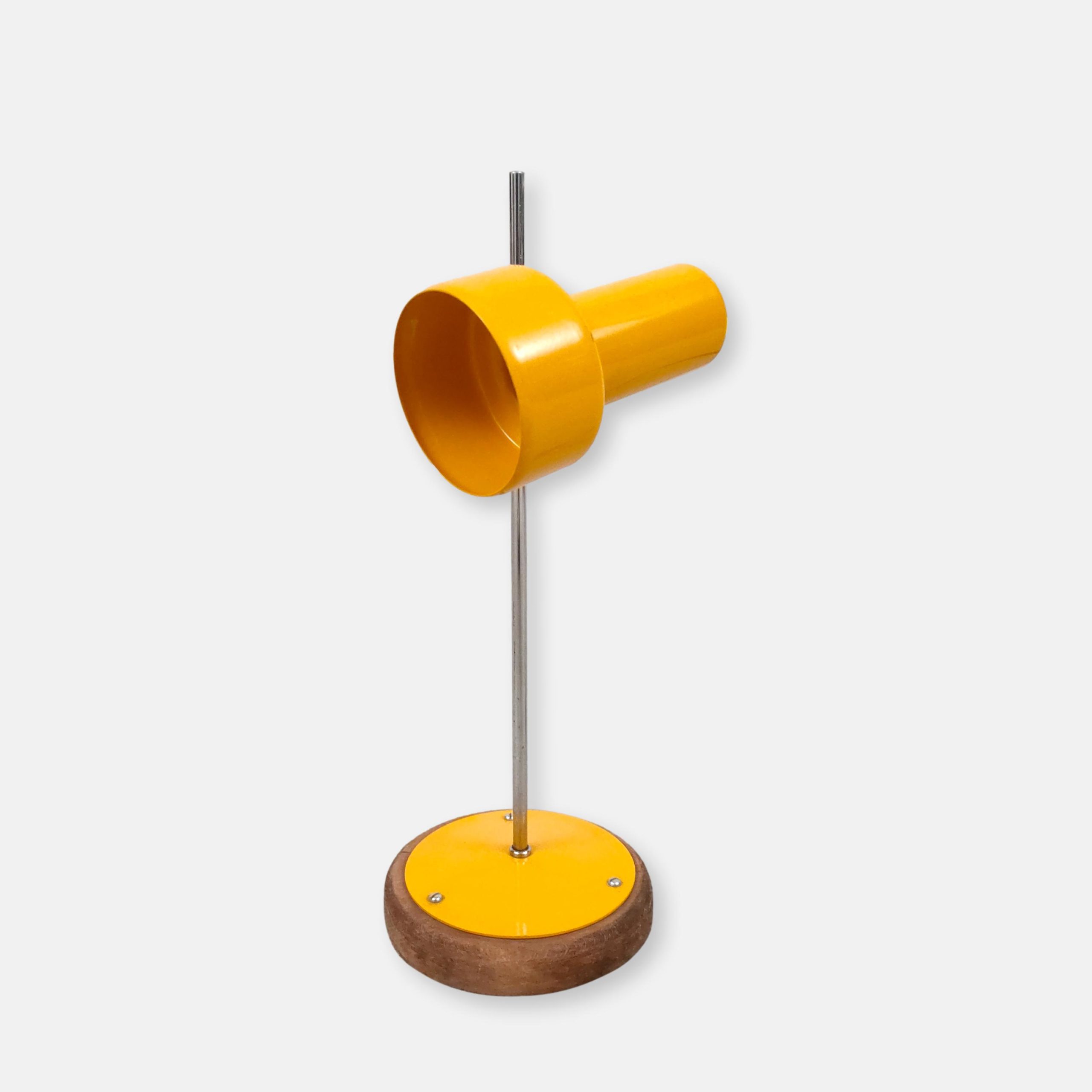 Produit venduLampe de table vintage avec socle en métal et bois, spot en métal de couleur jaune et tige en métal chromé. Le spot peut être orienté dans toutes les directions. Stable et solide, elle focntionne avec une ampoule standard E27.