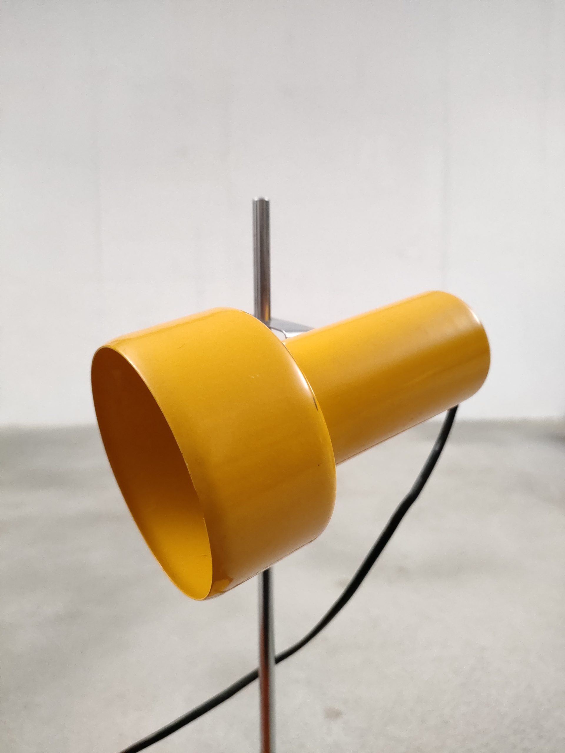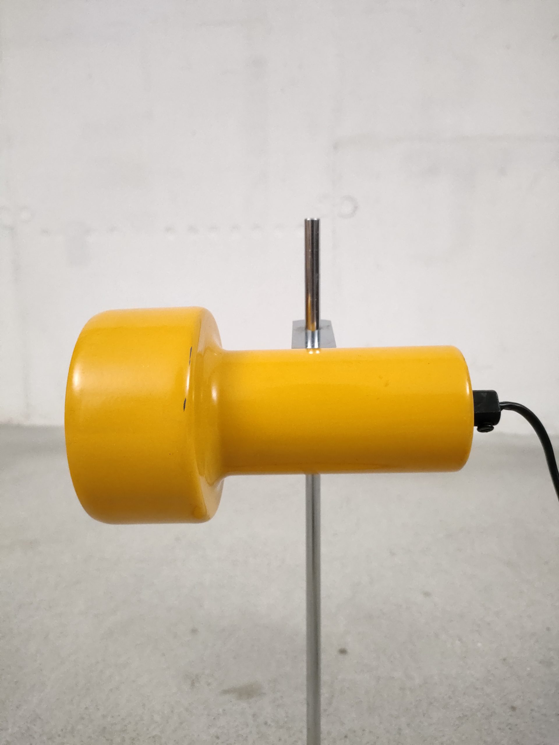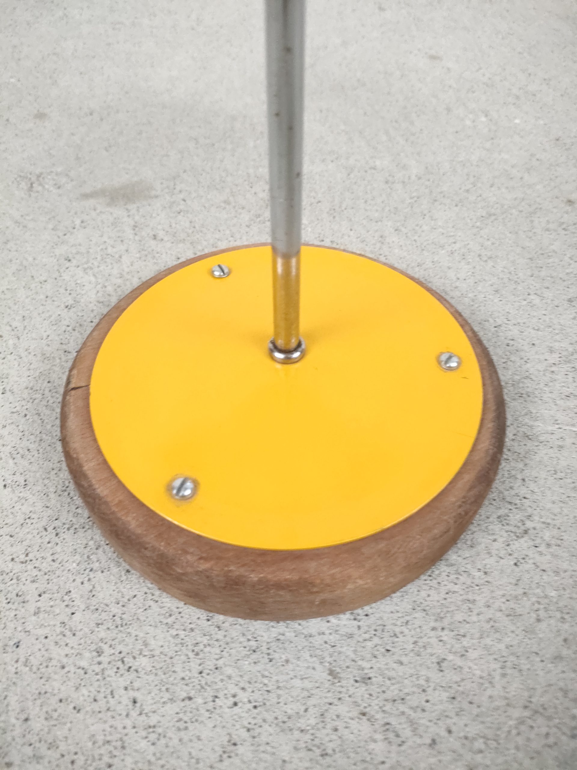 Produit venduLampe de table vintage avec socle en métal et bois, spot en métal de couleur jaune et tige en métal chromé. Le spot peut être orienté dans toutes les directions. Stable et solide, elle focntionne avec une ampoule standard E27.