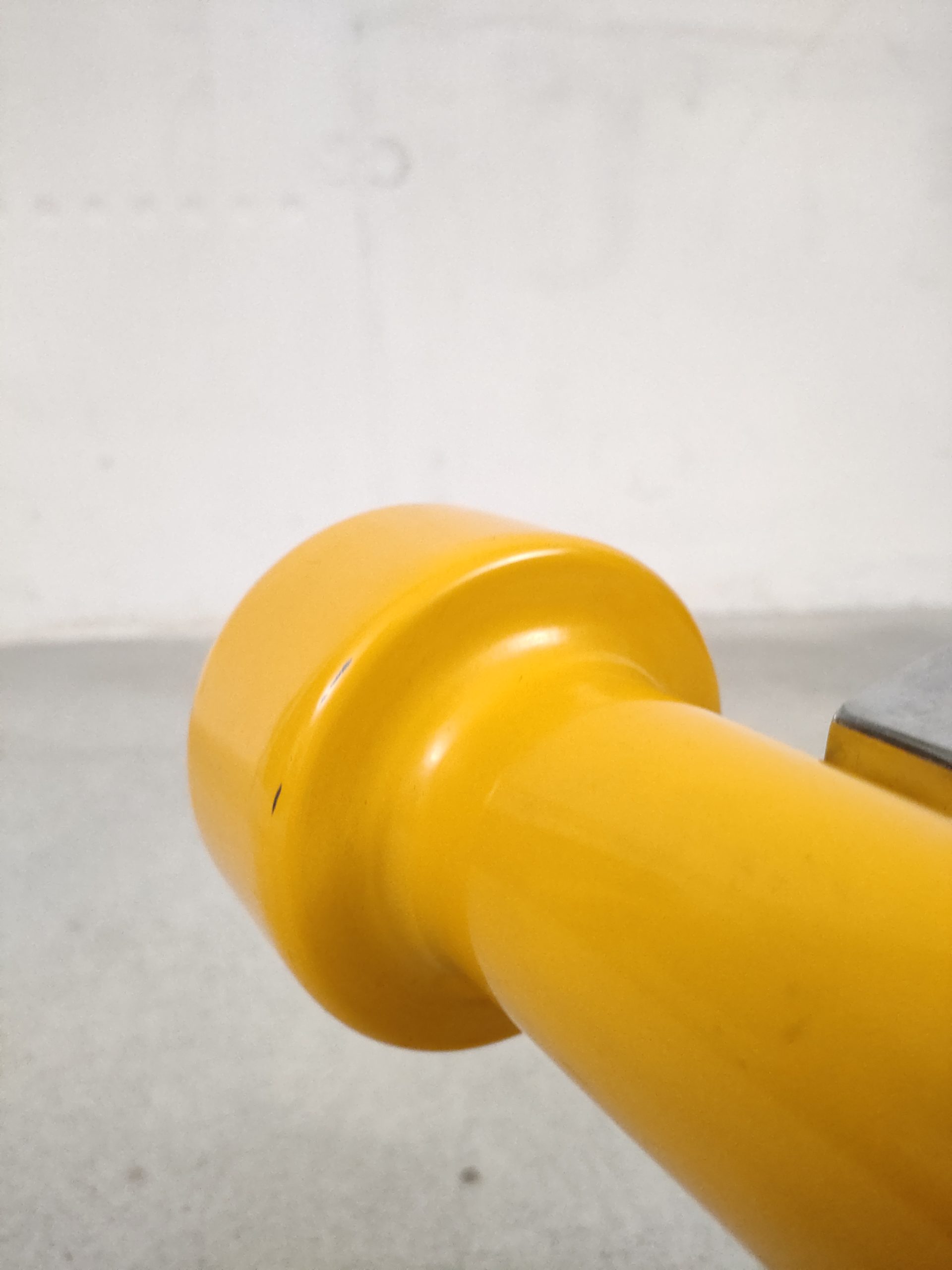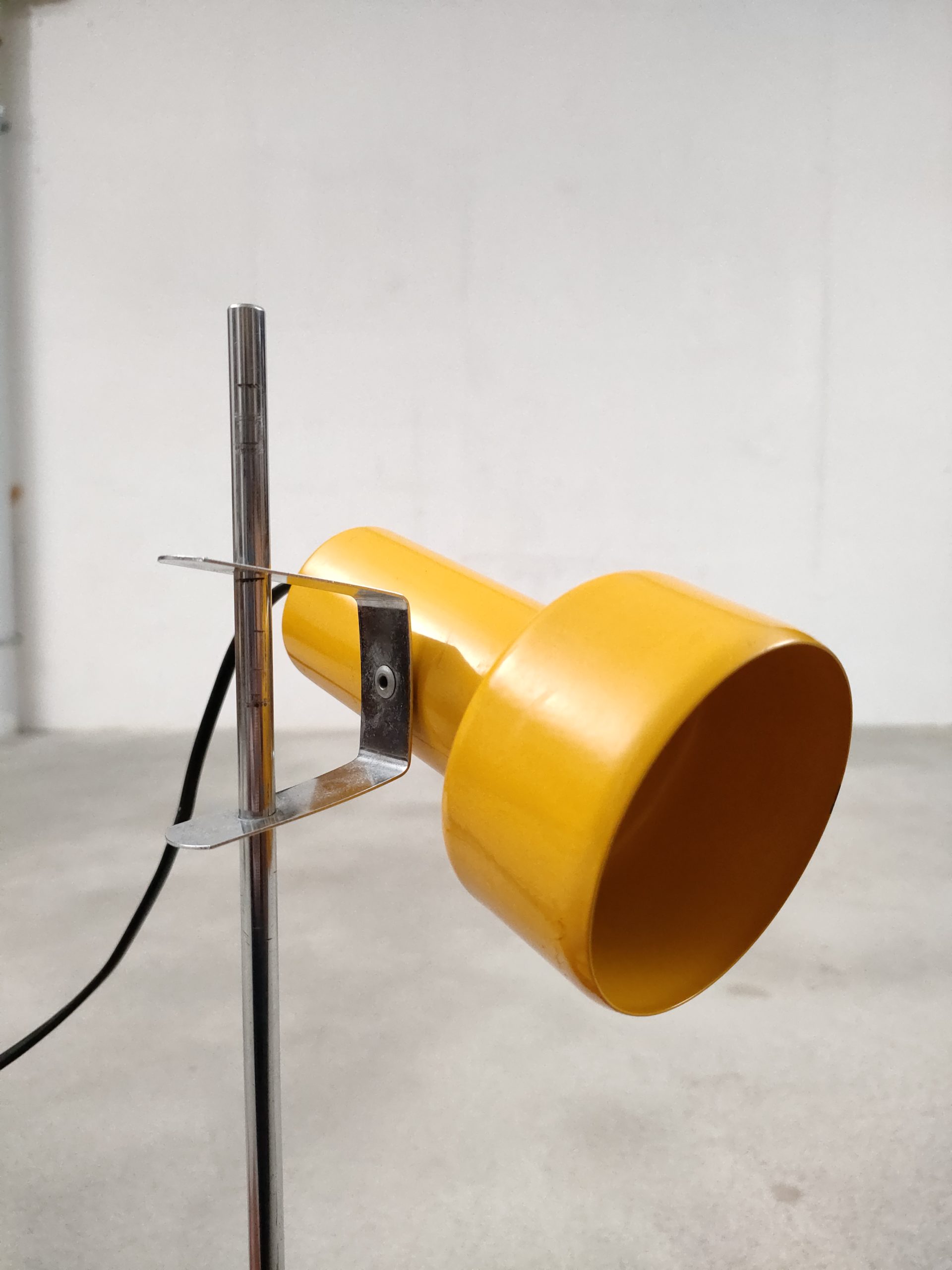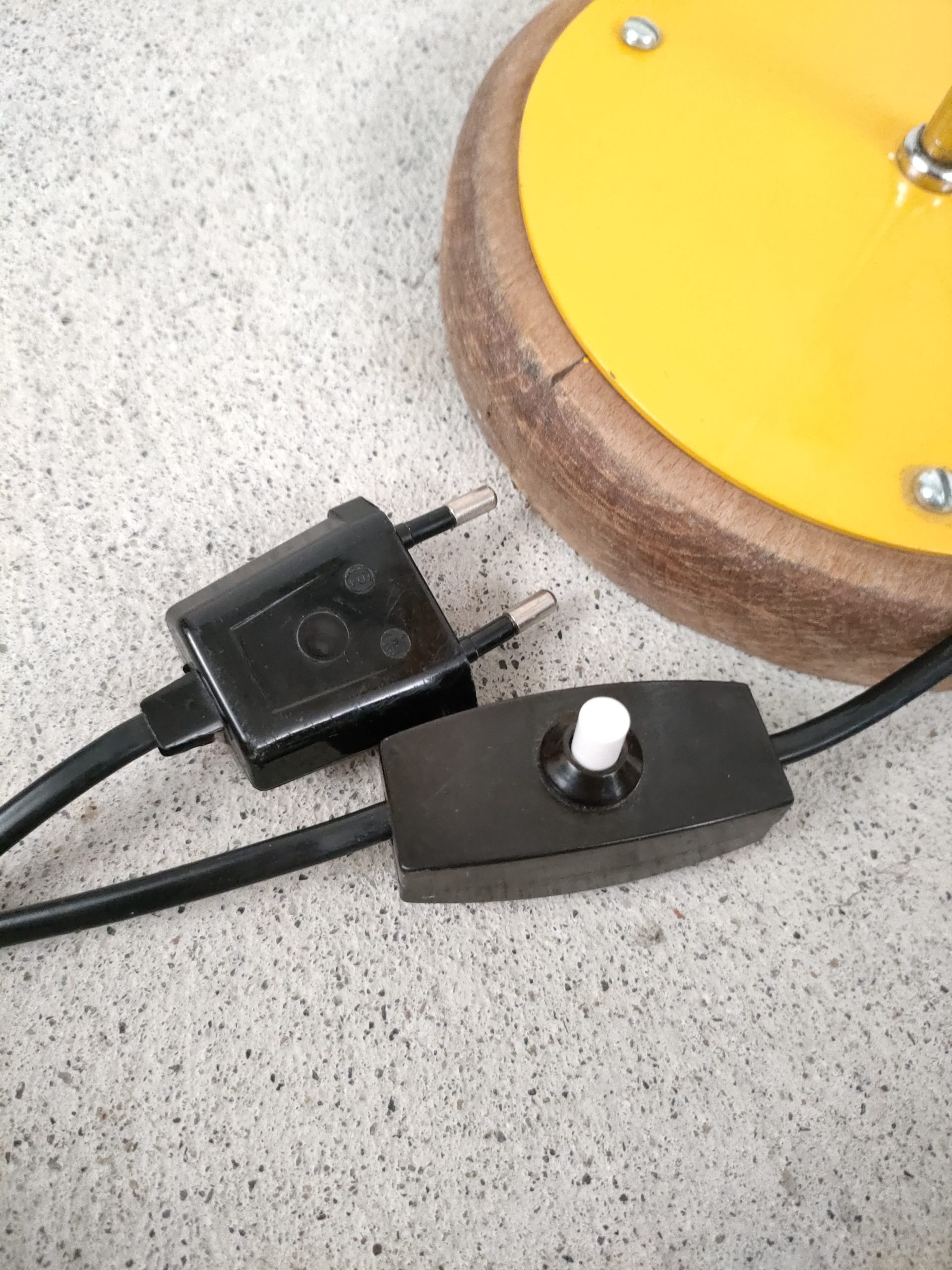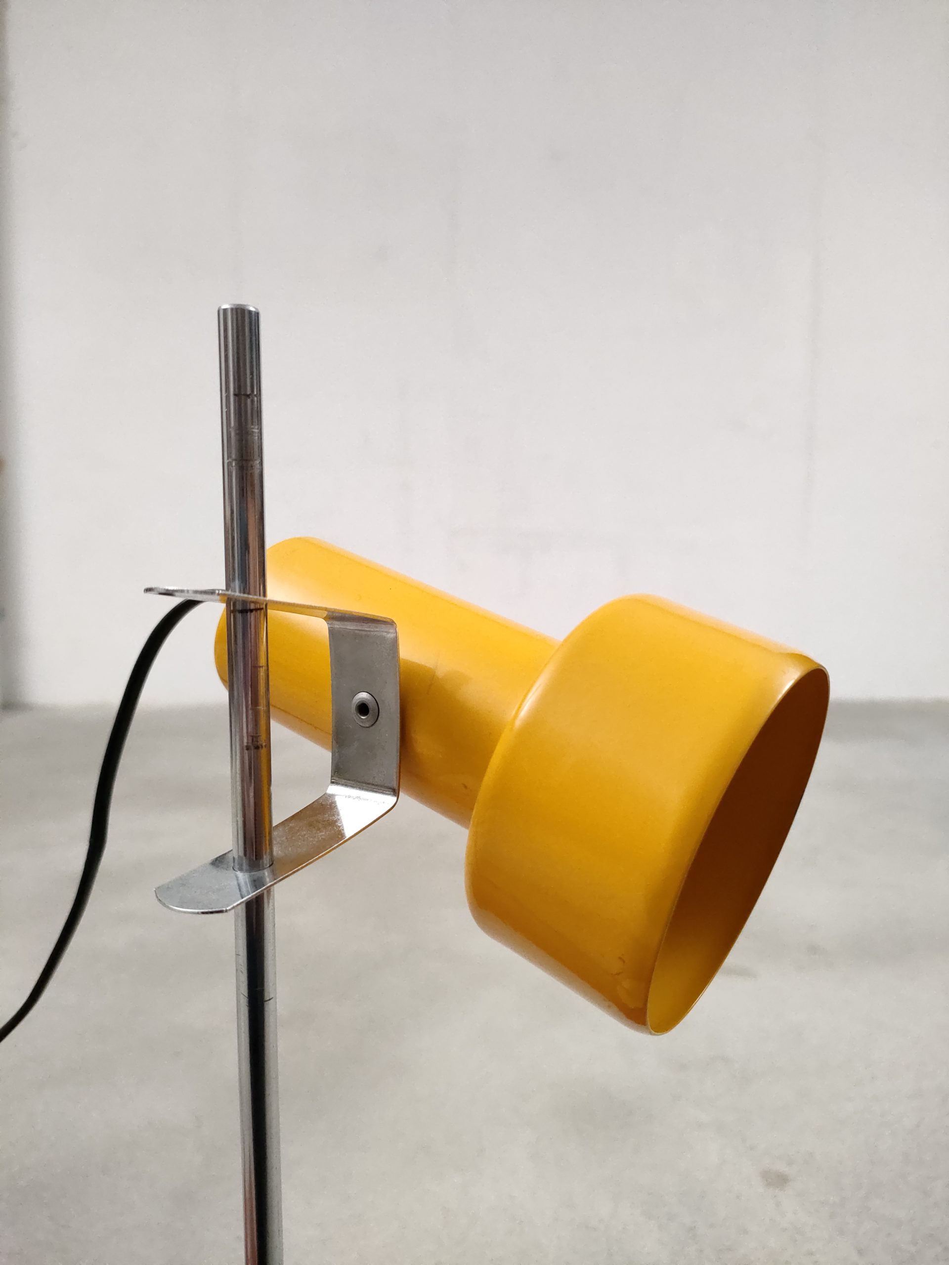 Produit venduLampe de table vintage avec socle en métal et bois, spot en métal de couleur jaune et tige en métal chromé. Le spot peut être orienté dans toutes les directions. Stable et solide, elle focntionne avec une ampoule standard E27.