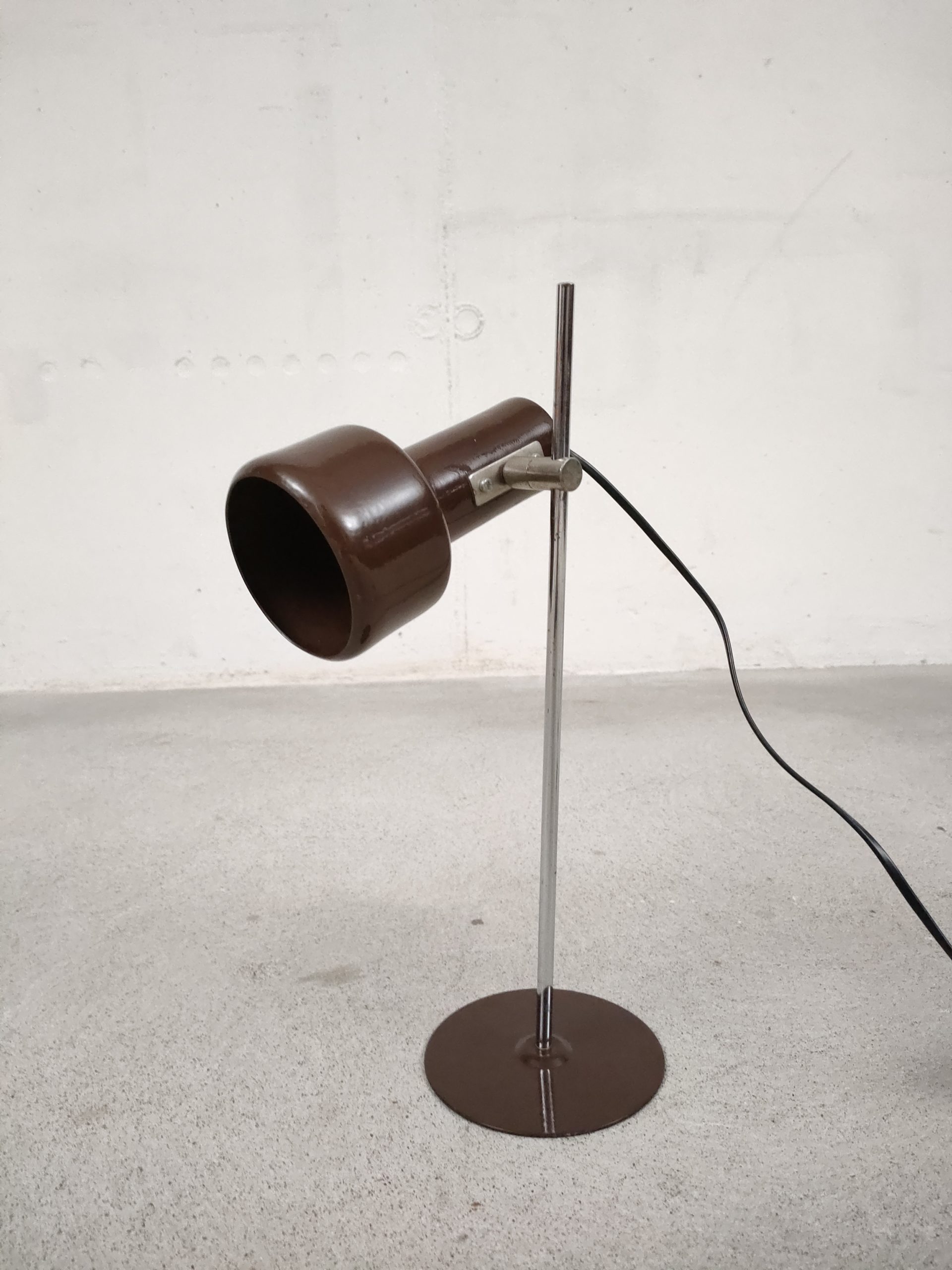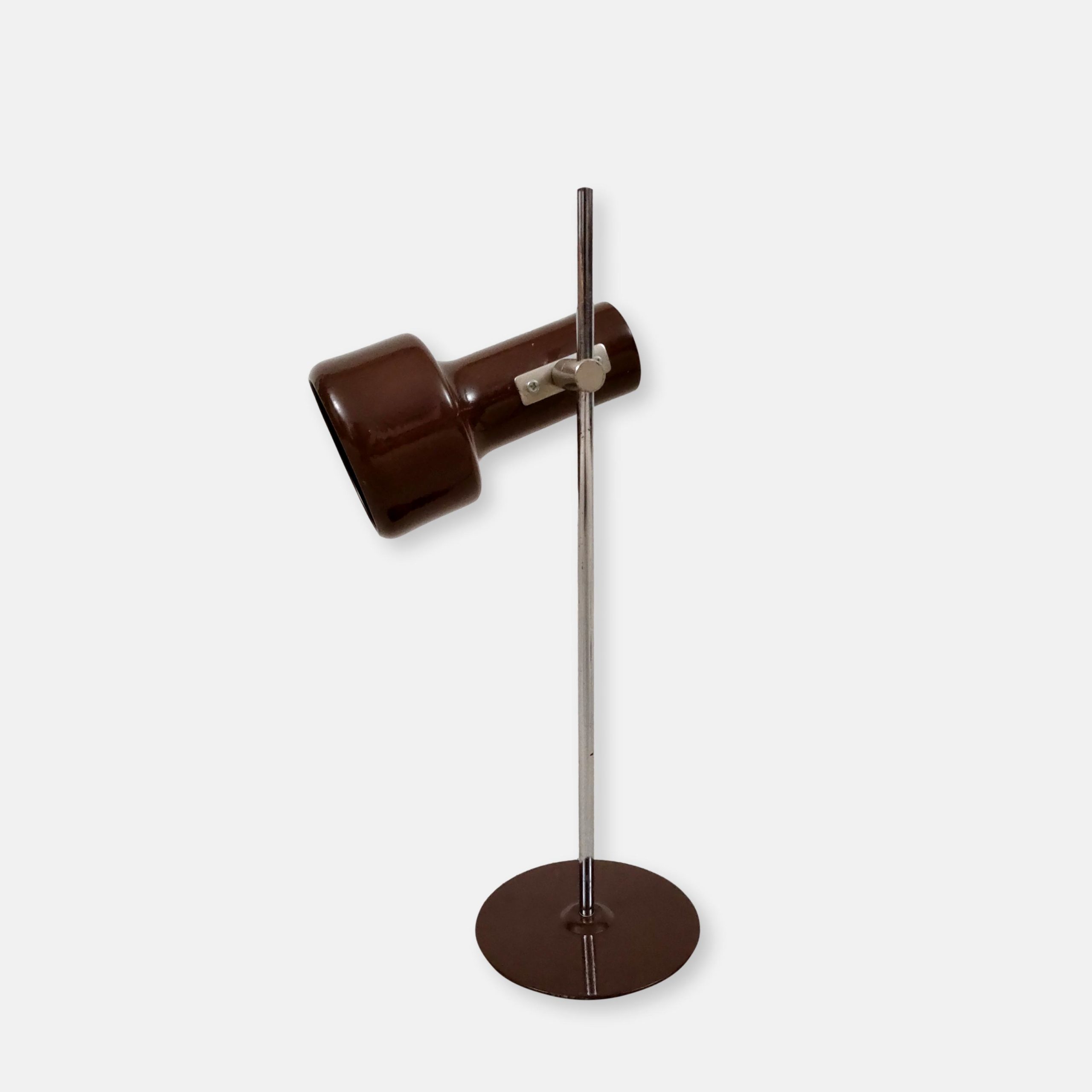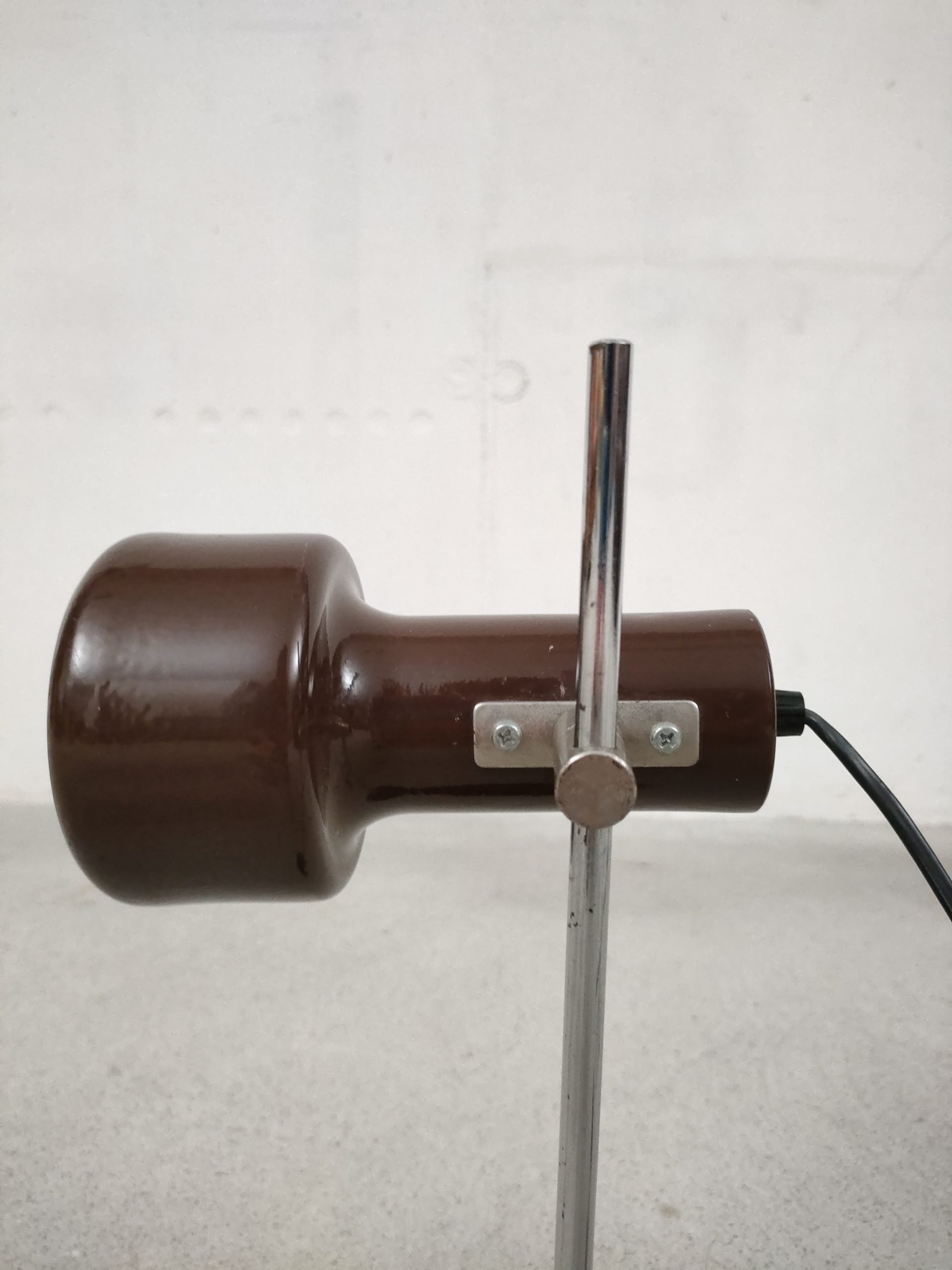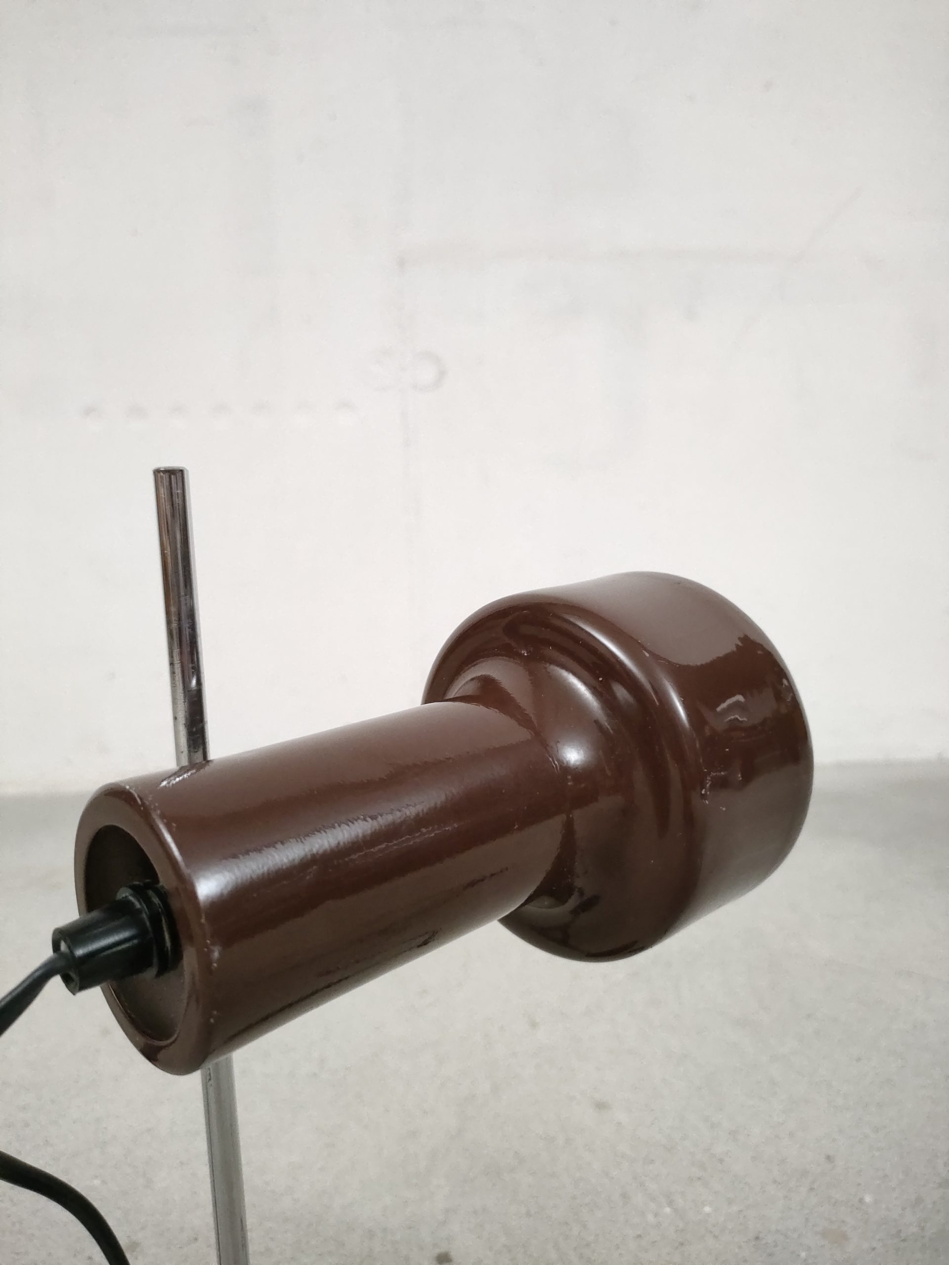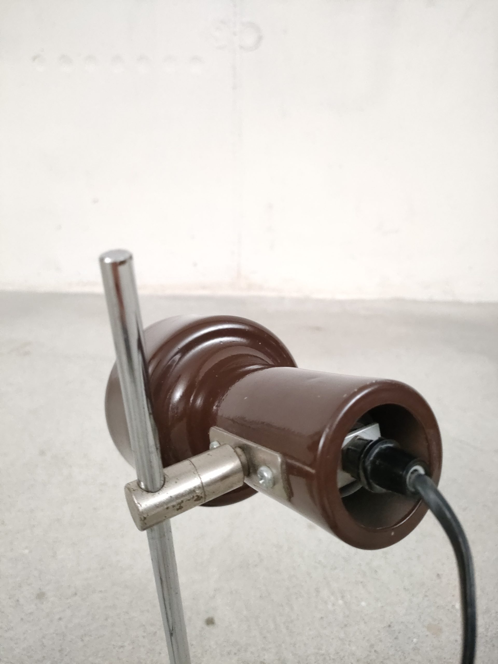 Lampe de table vintage avec socle et spot en métal de couleur marron et tige en métal chromé. Le spot peut être orienté dans toutes les directions. Stable et solide, elle focntionne avec une ampoule standard E27.