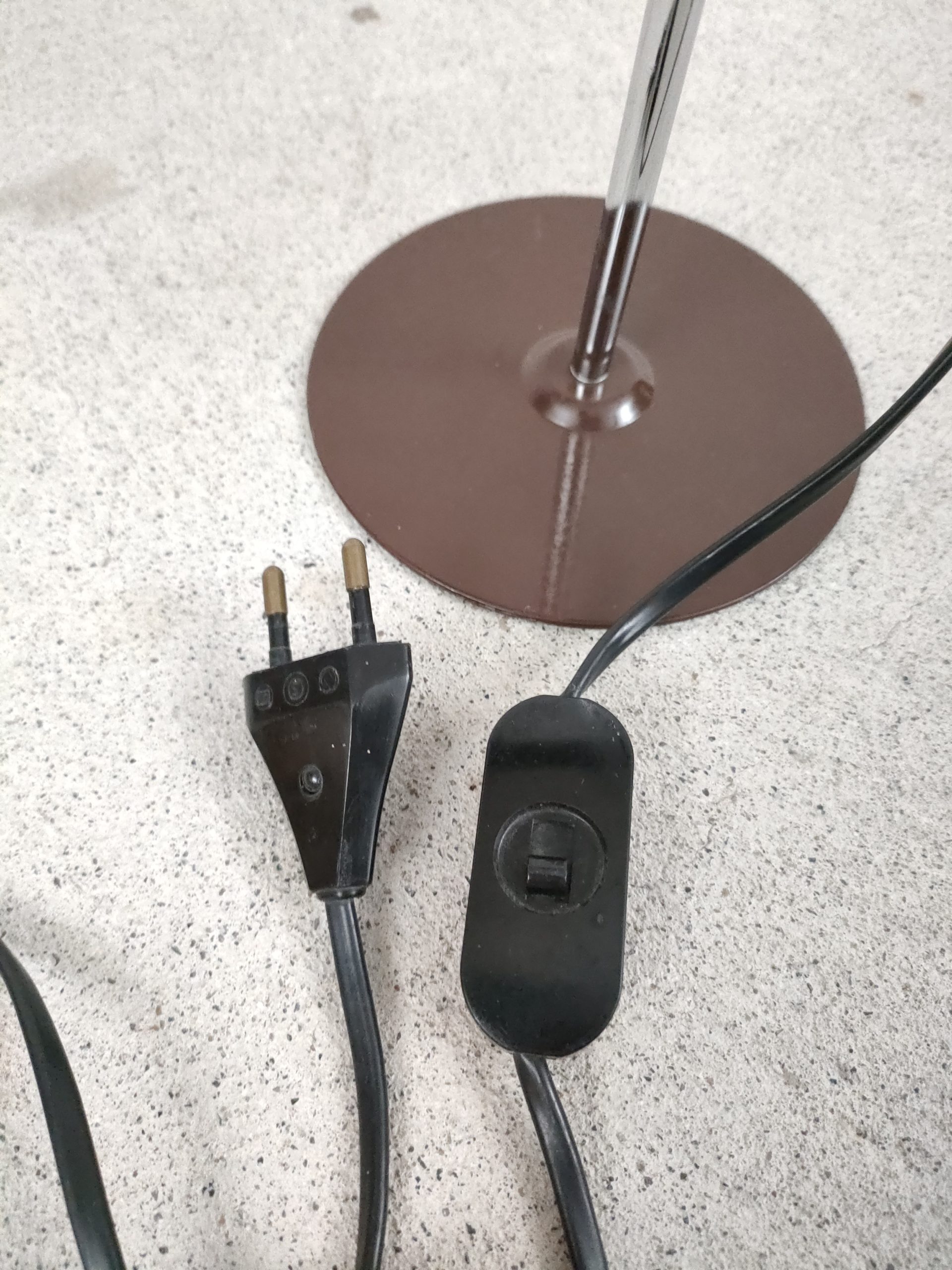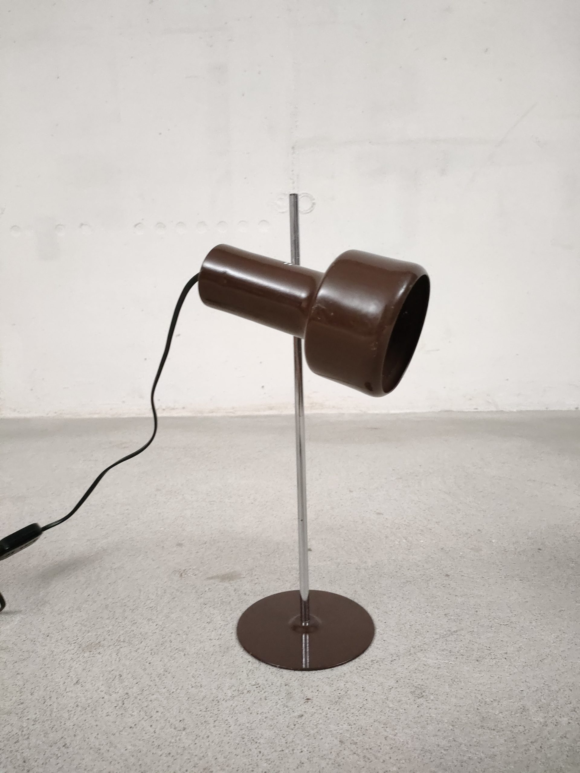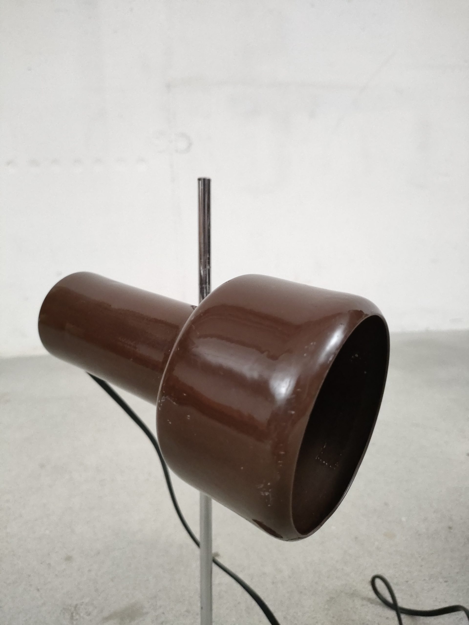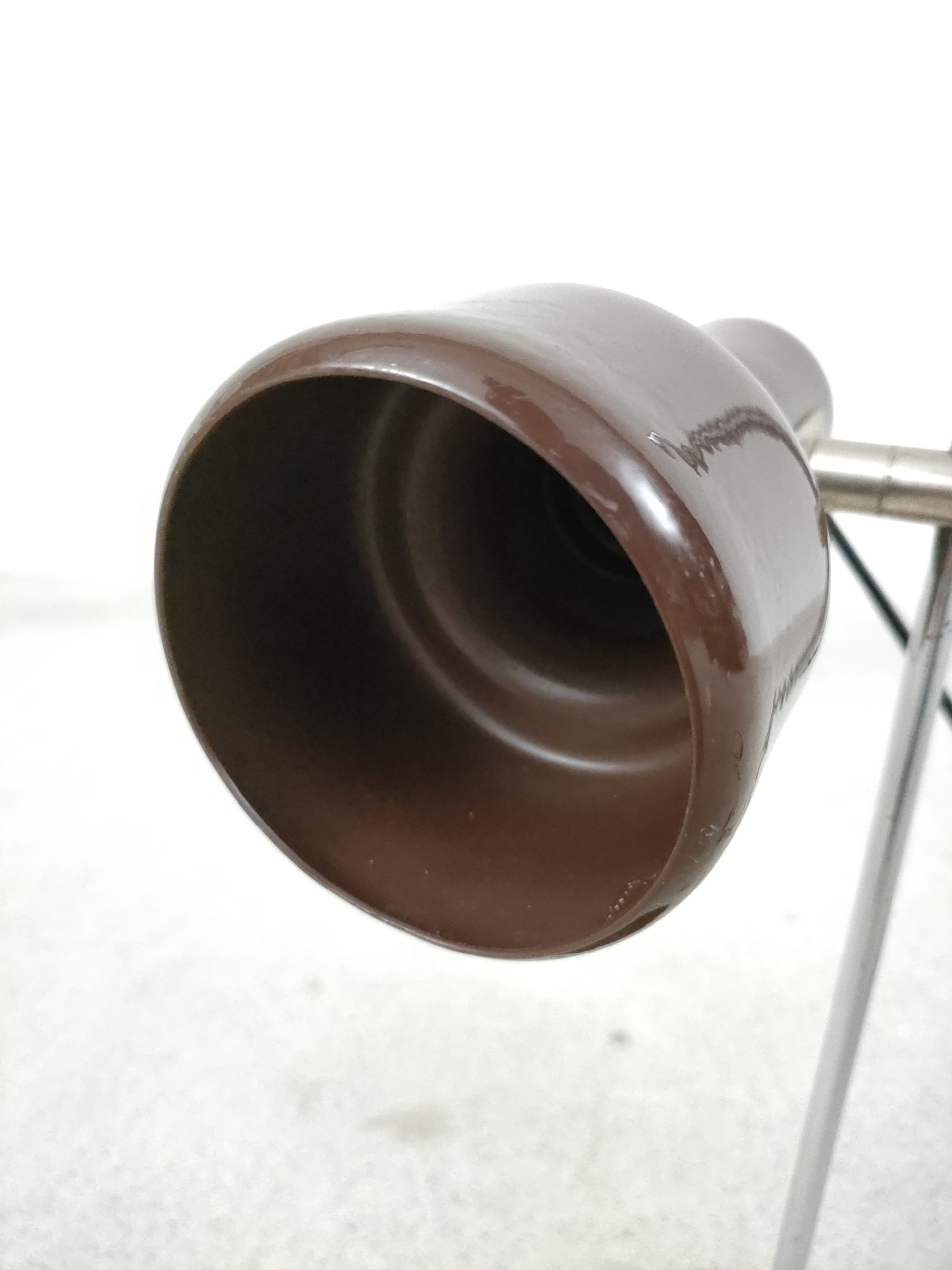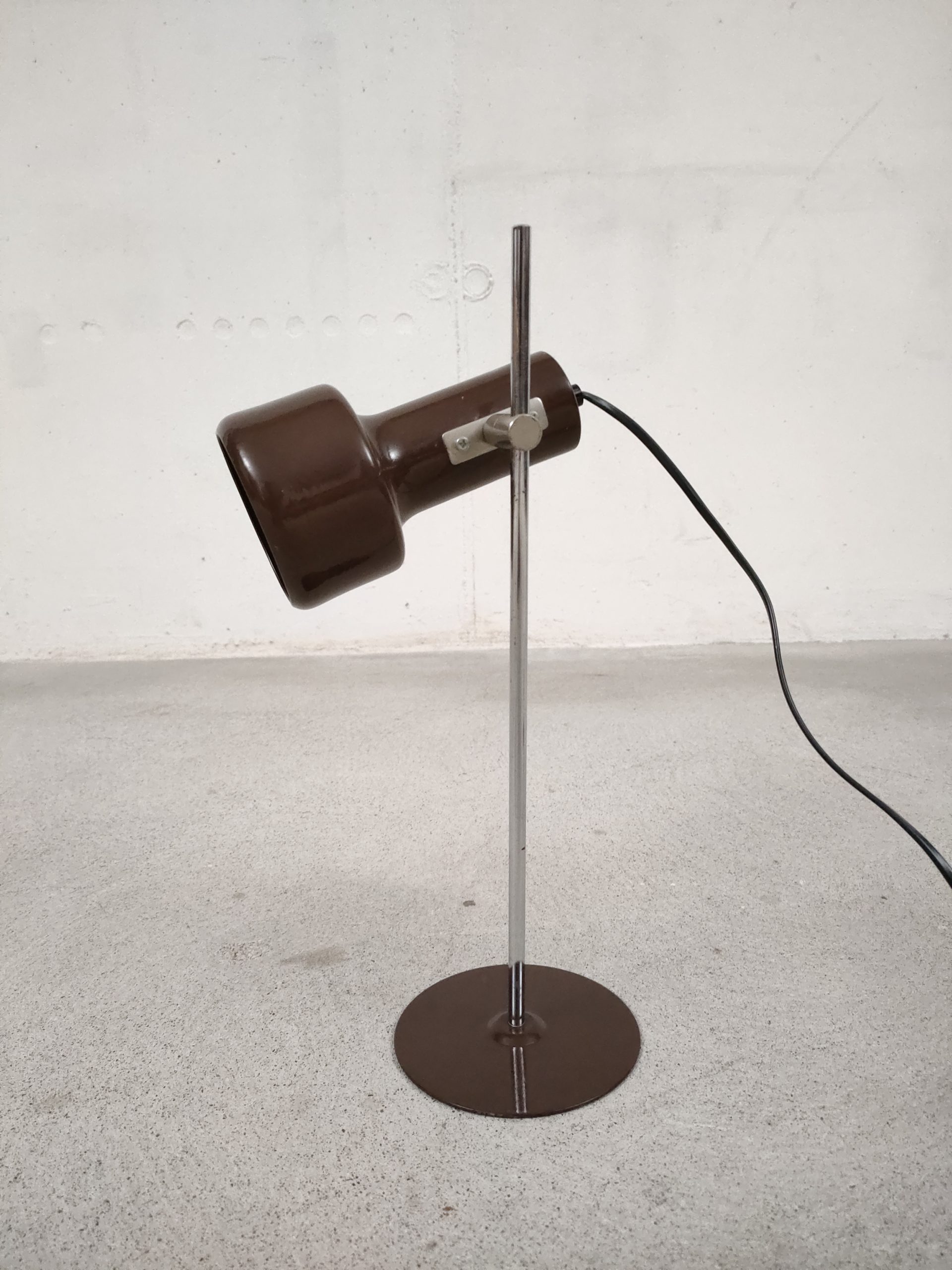 Lampe de table vintage avec socle et spot en métal de couleur marron et tige en métal chromé. Le spot peut être orienté dans toutes les directions. Stable et solide, elle focntionne avec une ampoule standard E27.