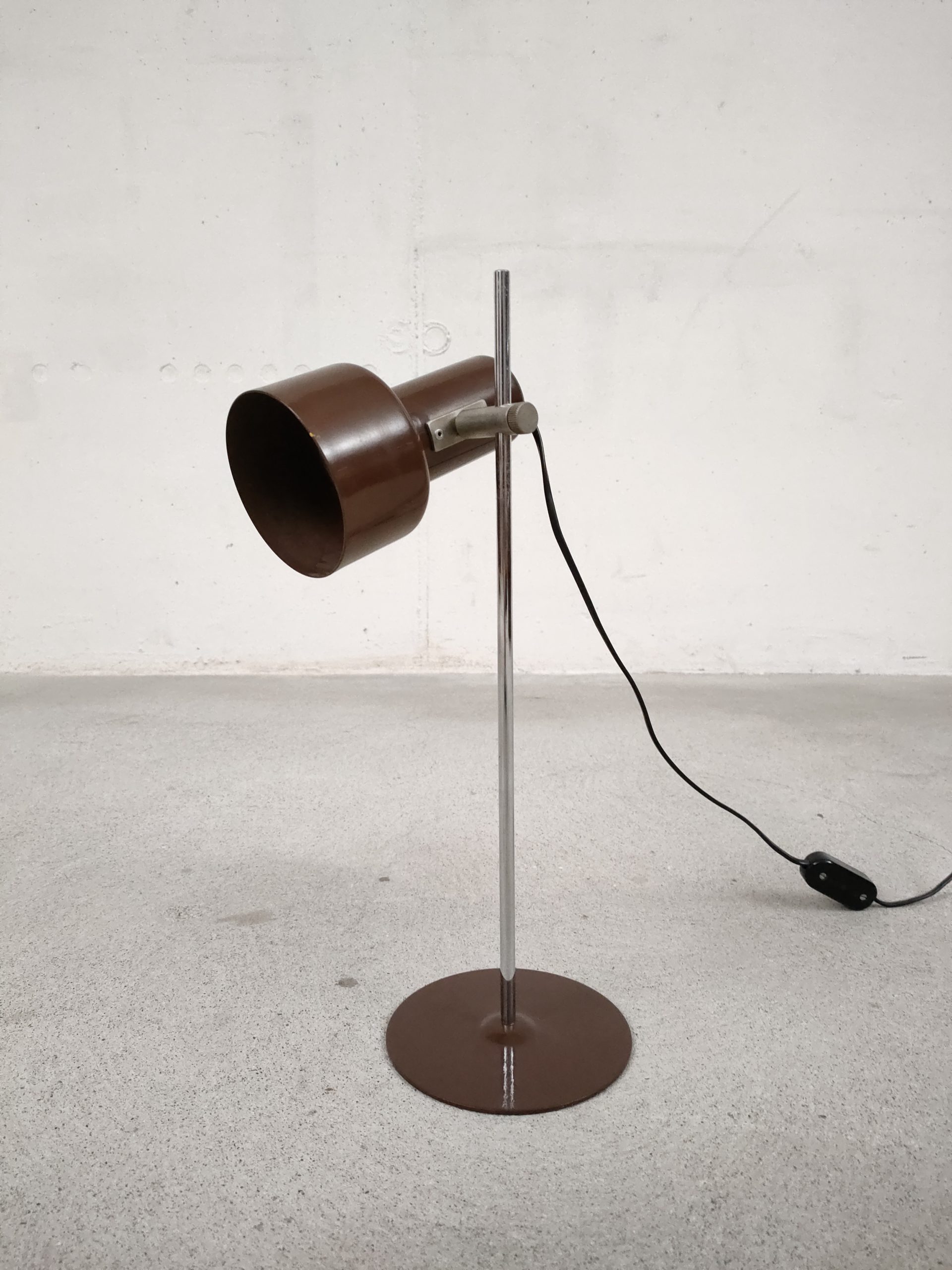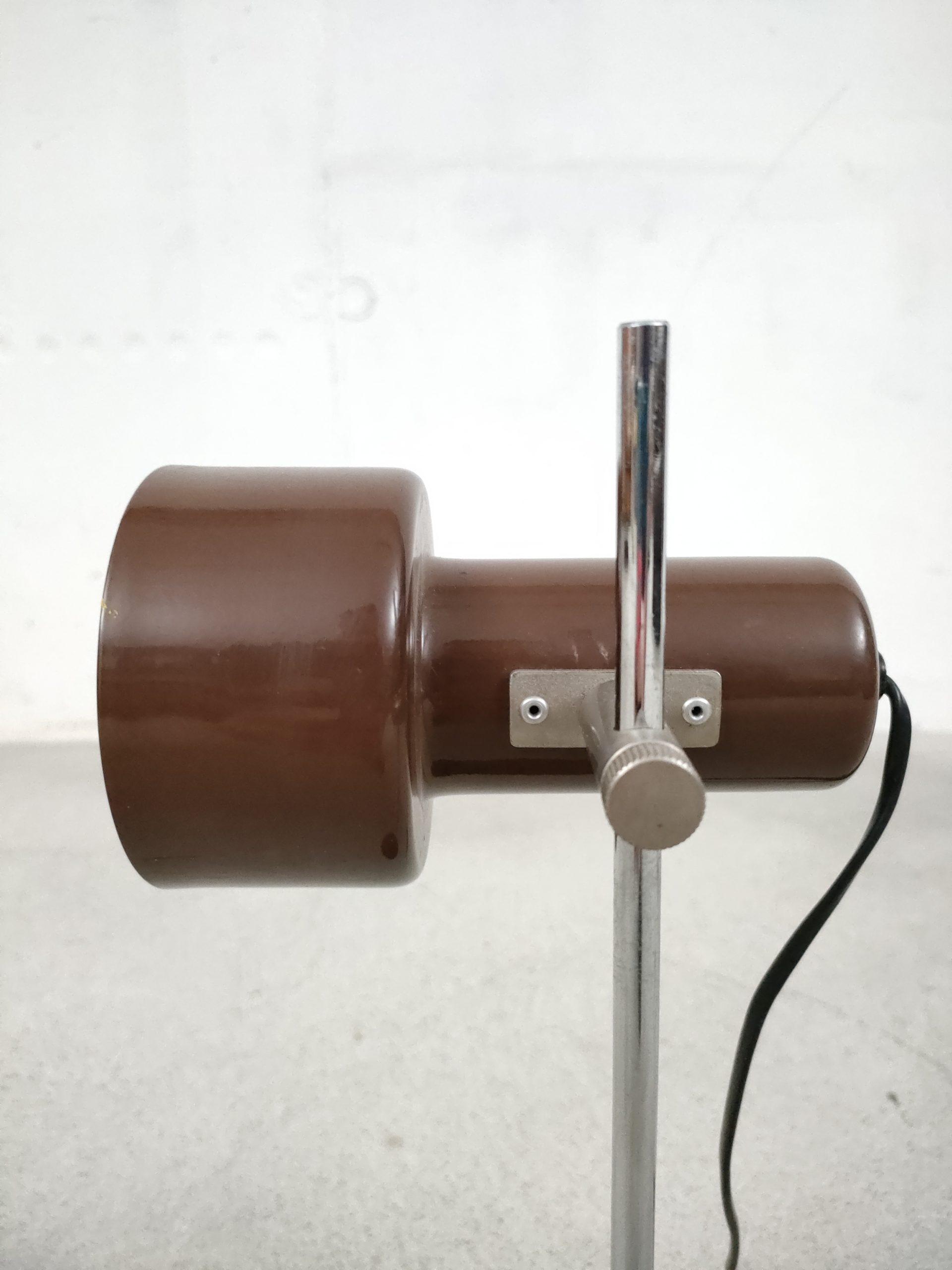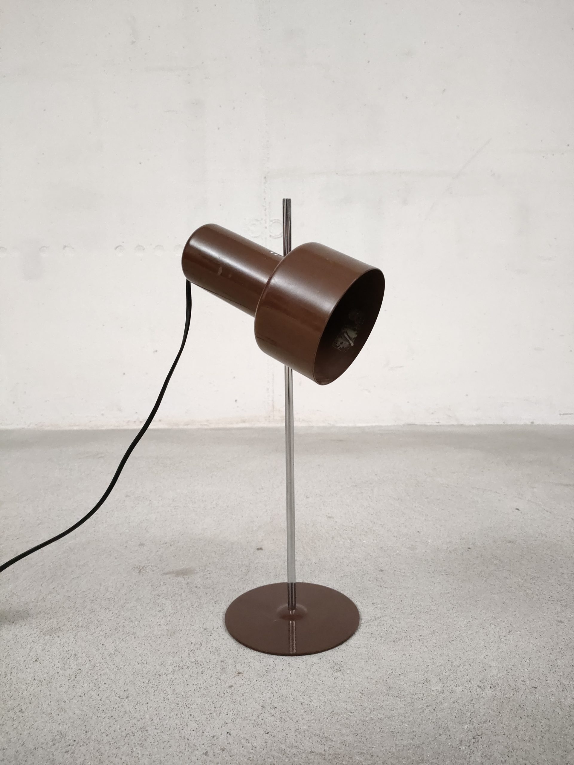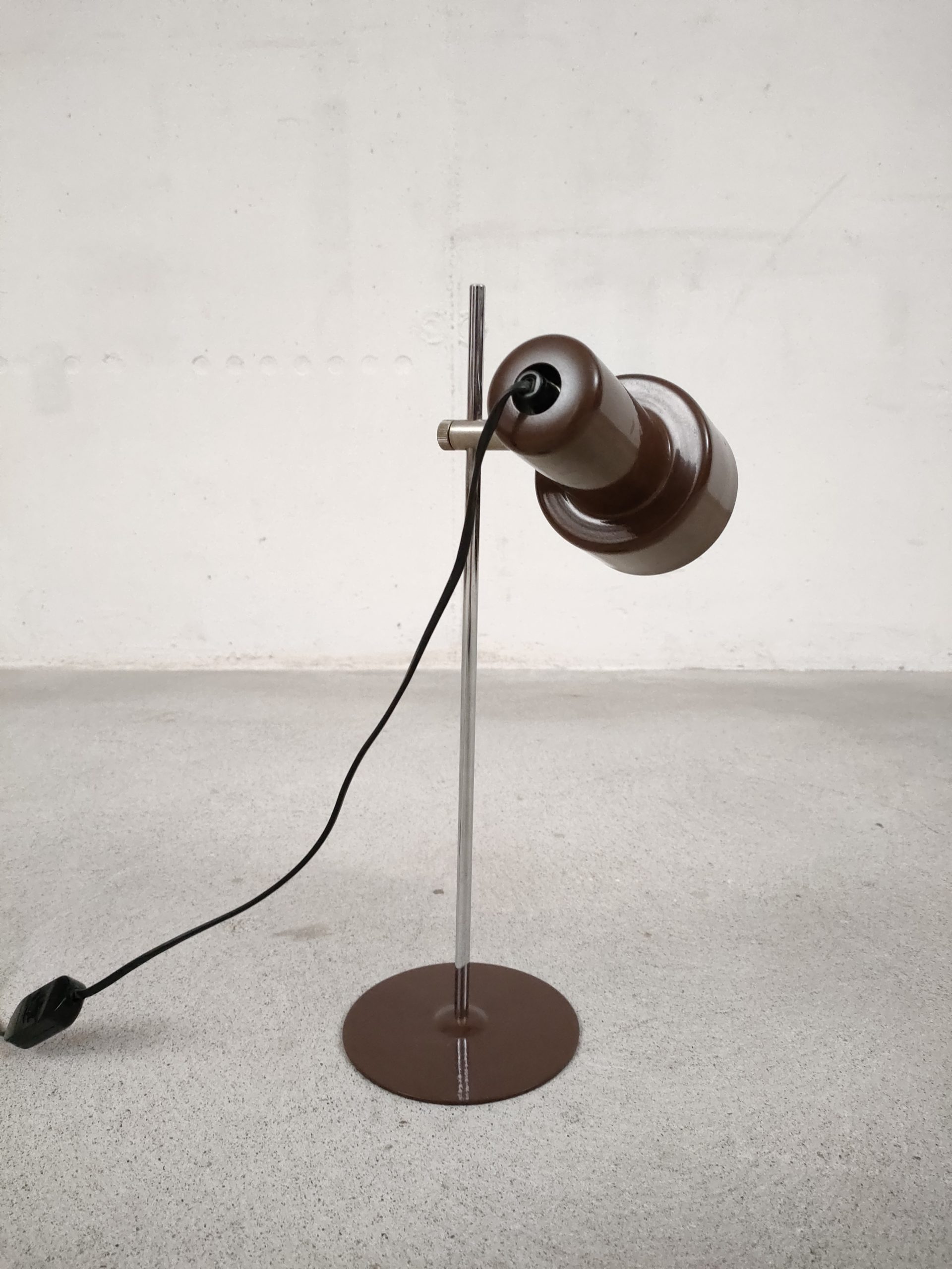 Produit venduLampe de table vintage avec socle et spot en métal de couleur marron et tige en métal chromé. Le spot peut être orienté dans toutes les directions. Stable et solide, elle focntionne avec une ampoule standard E27.