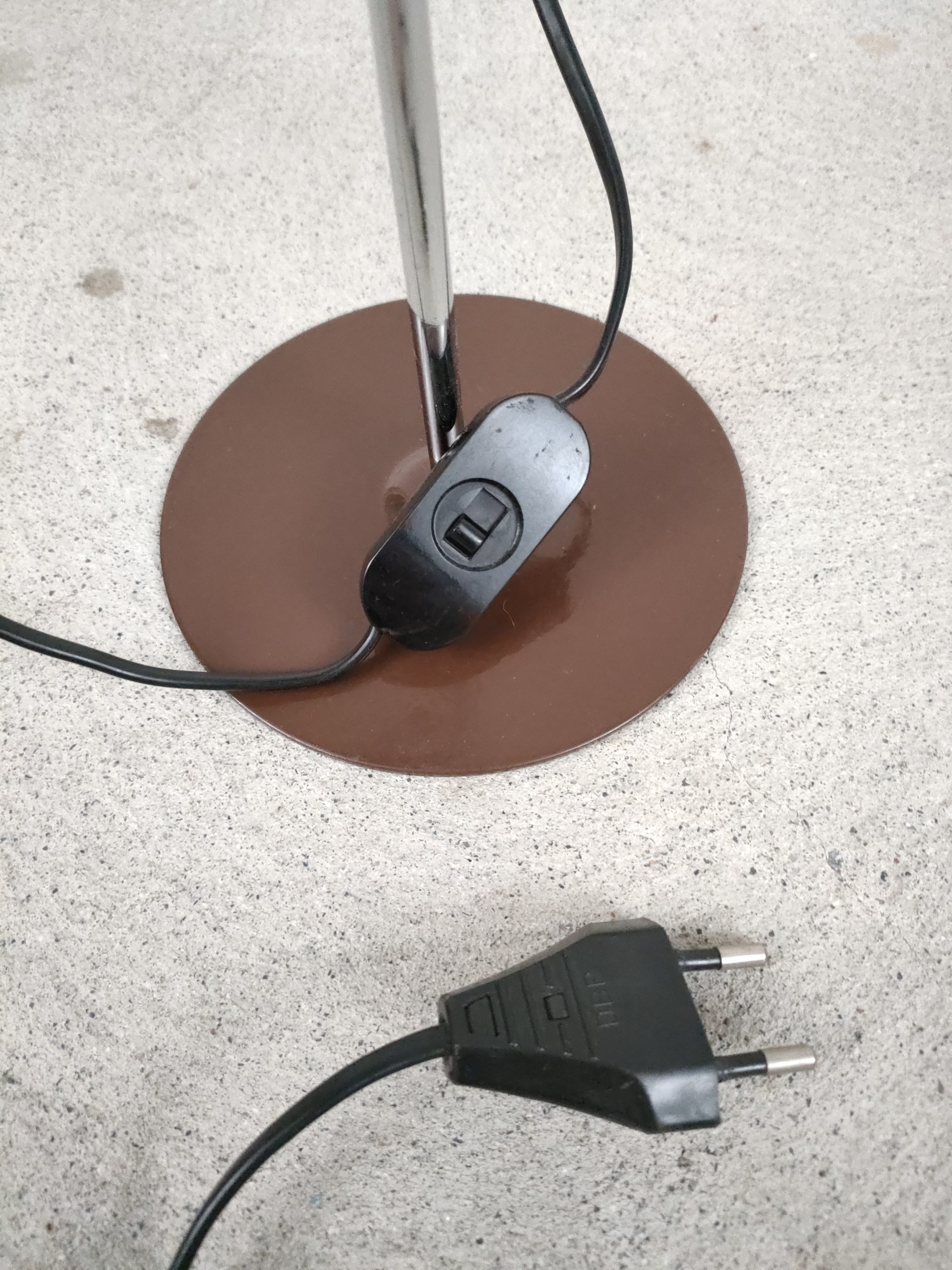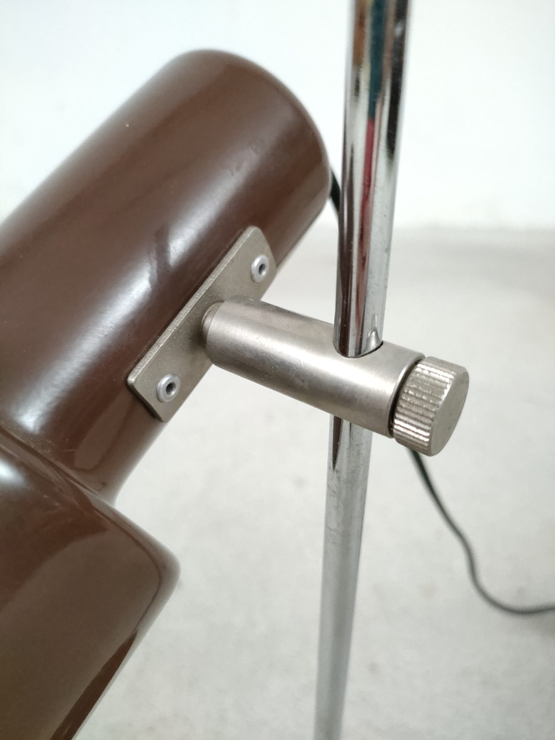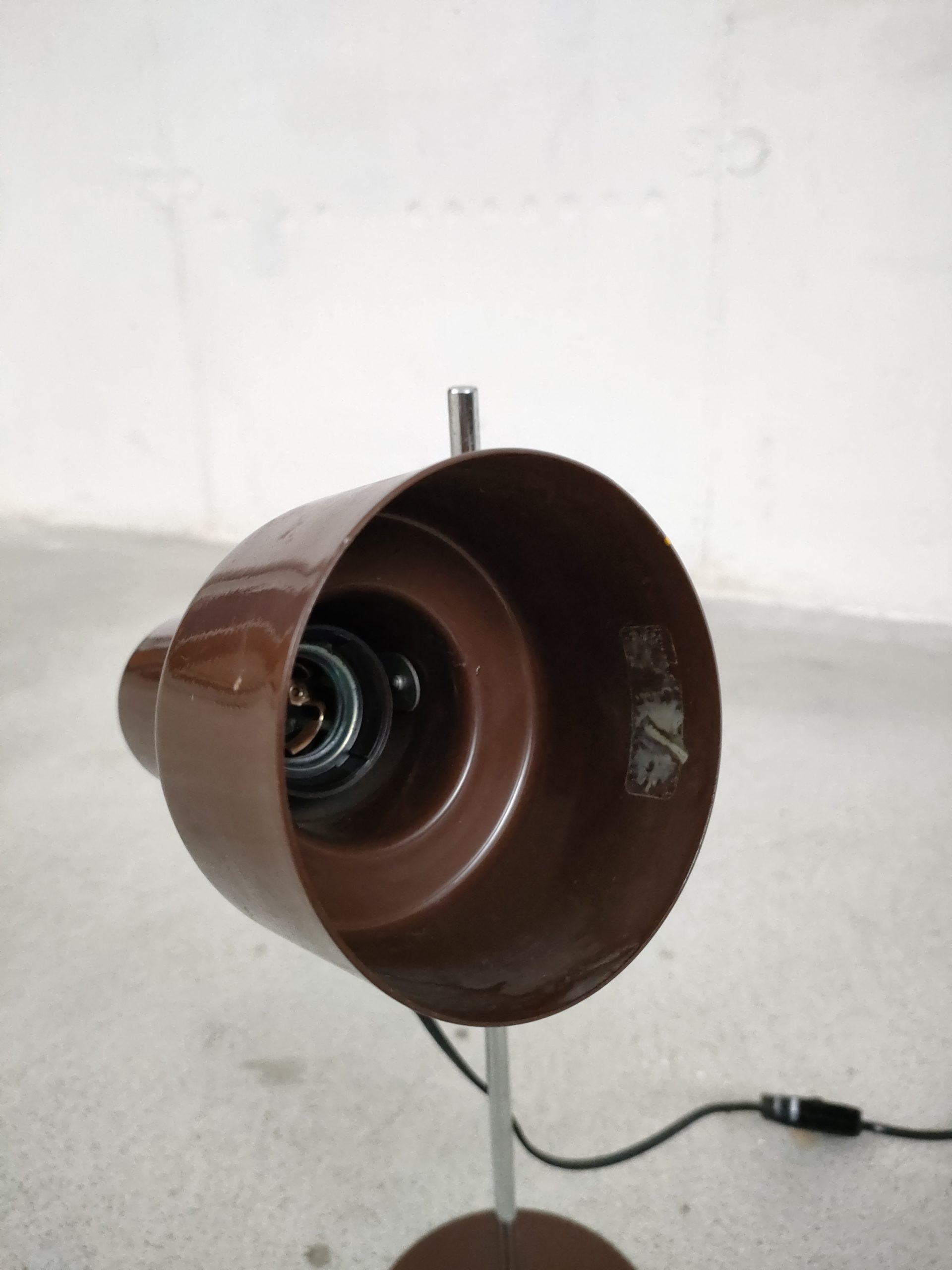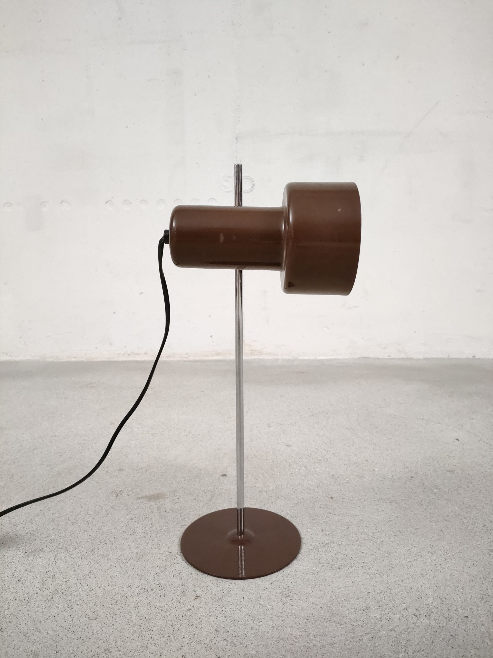 Produit venduLampe de table vintage avec socle et spot en métal de couleur marron et tige en métal chromé. Le spot peut être orienté dans toutes les directions. Stable et solide, elle focntionne avec une ampoule standard E27.