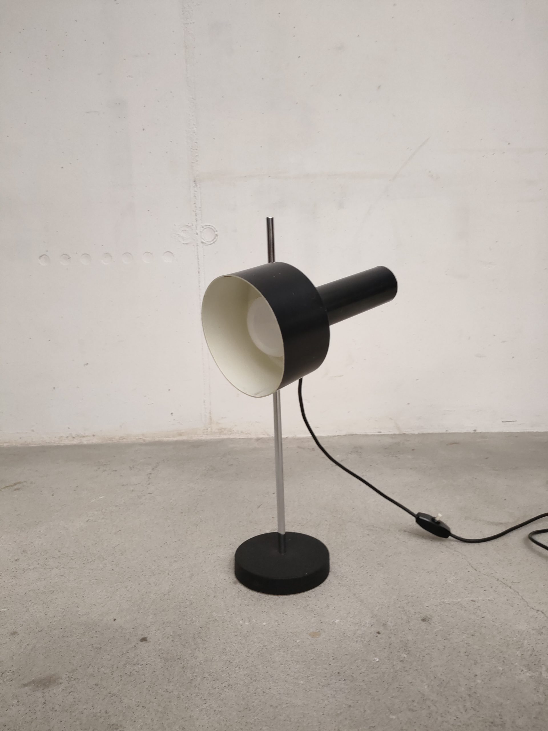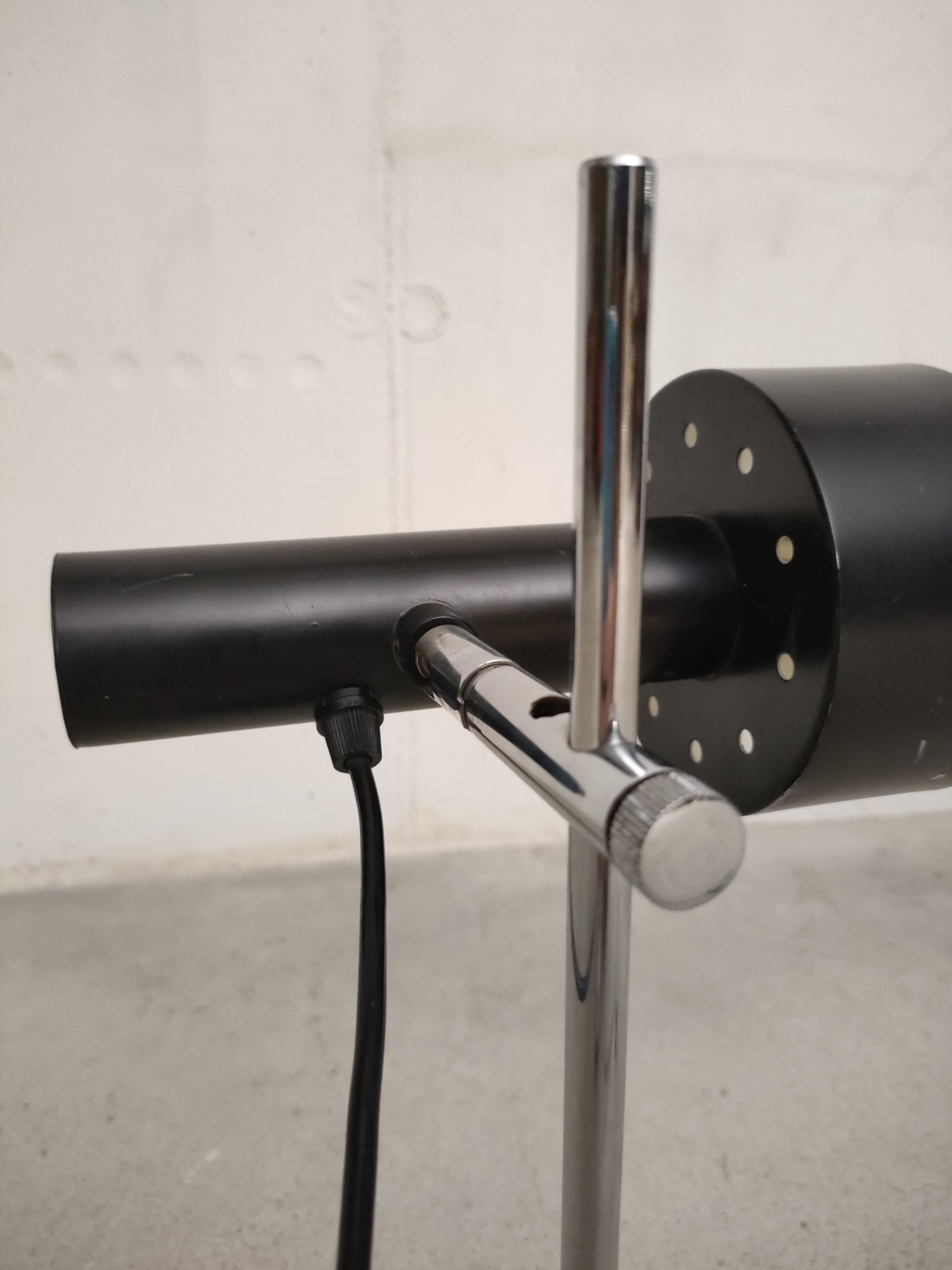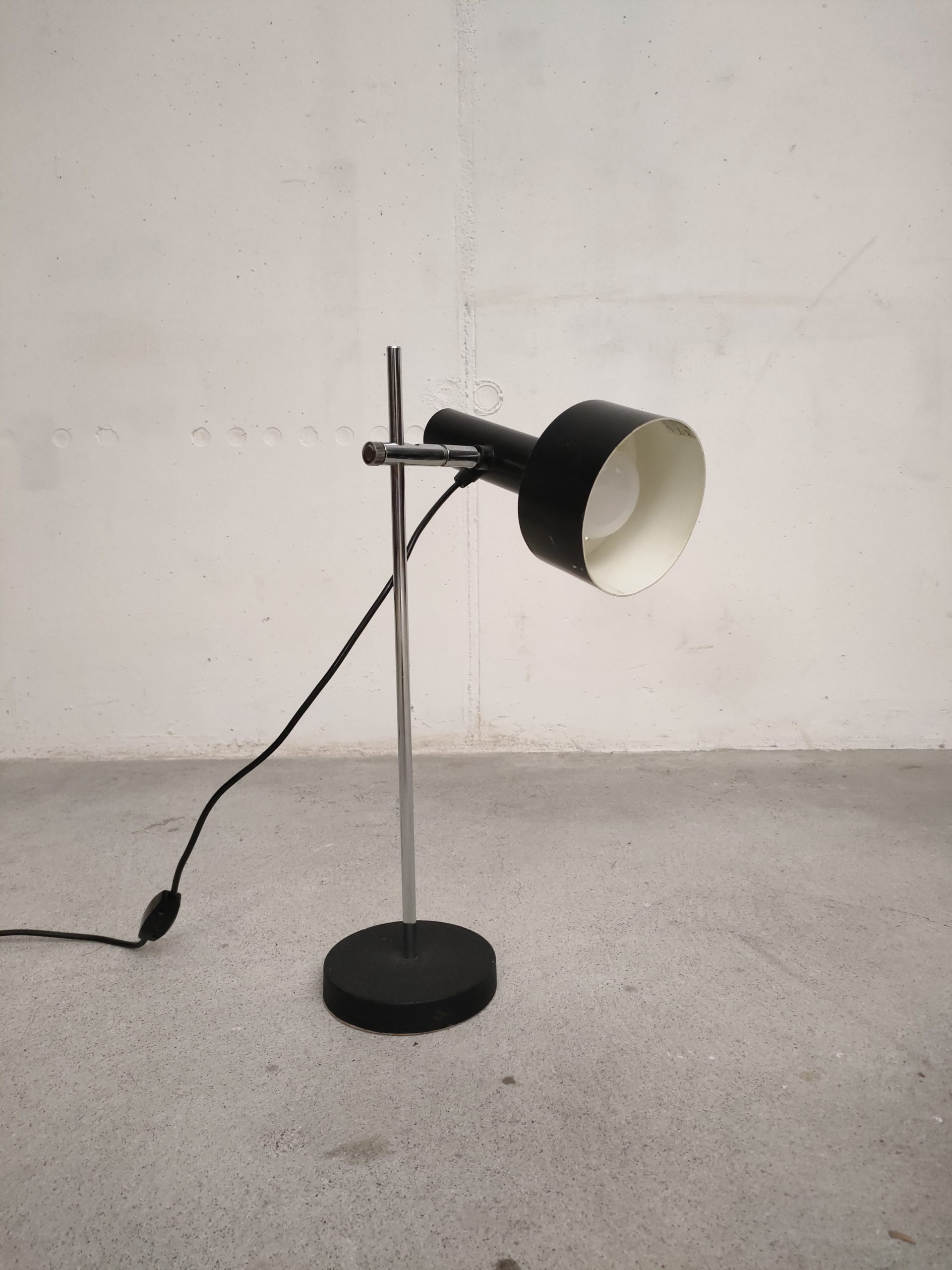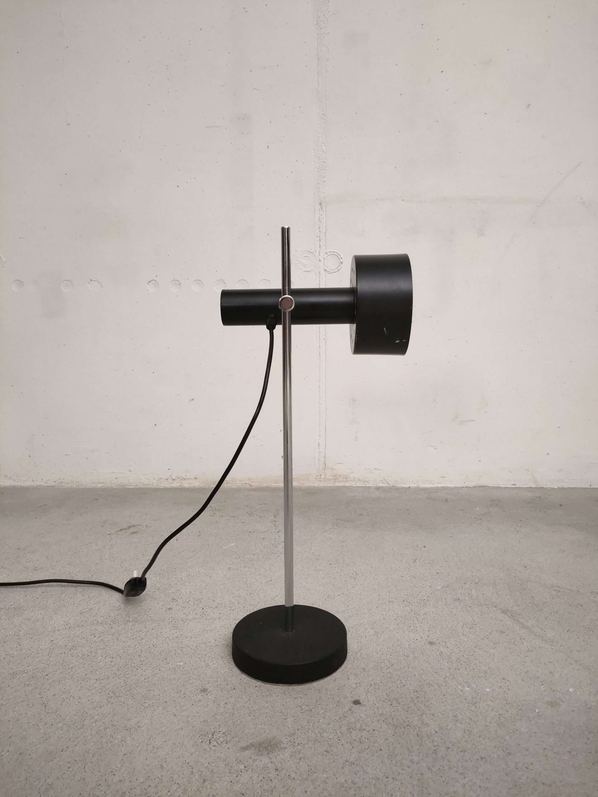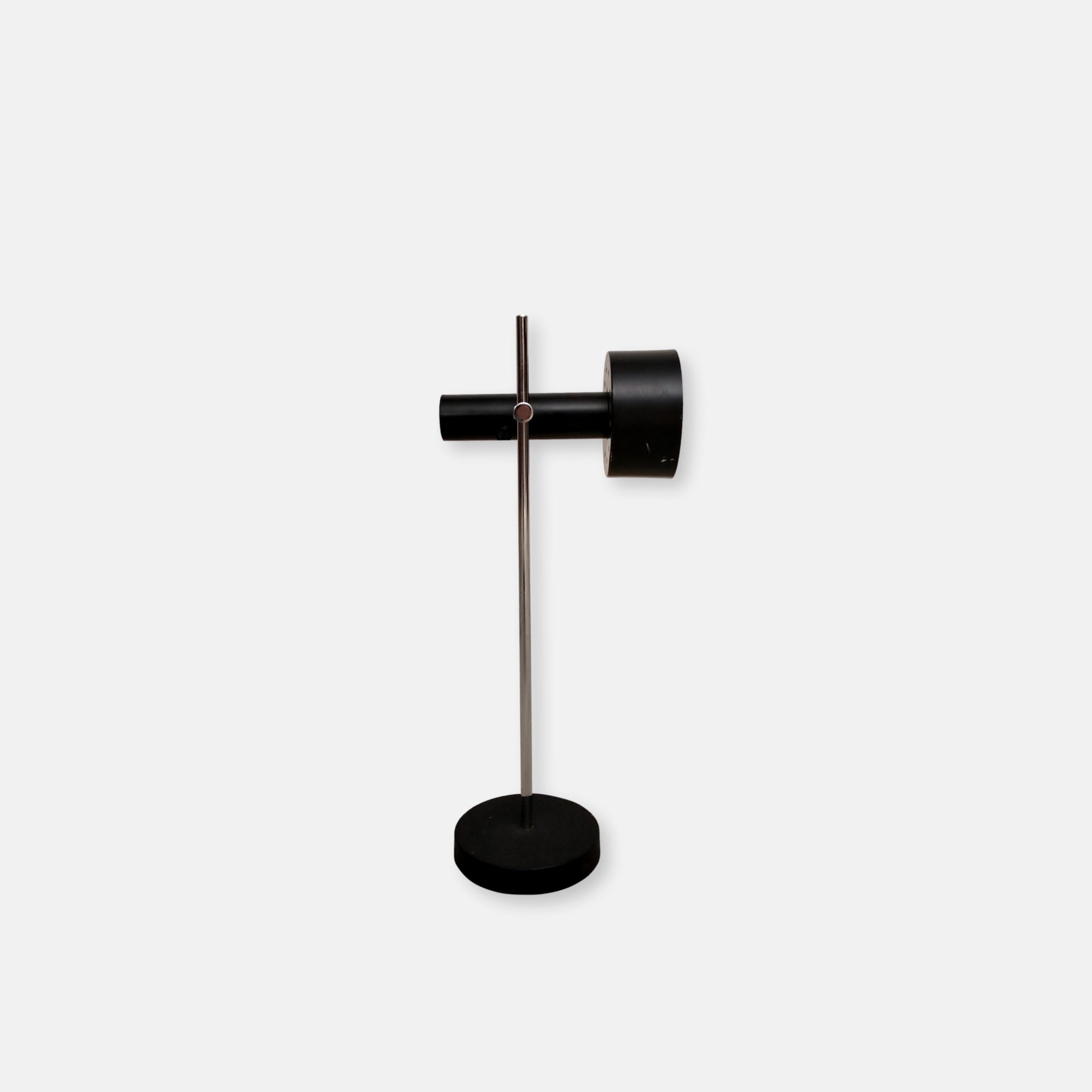 Lampe de table spot vintage avec abat-jour et socle en métal noir et tige en métal chromé. La hauteur est réglable et l’abat-jour peut être orienté dans toutes les directions. Quelques traces d’usure (voir photos) mais parfaitement fonctionnelle.