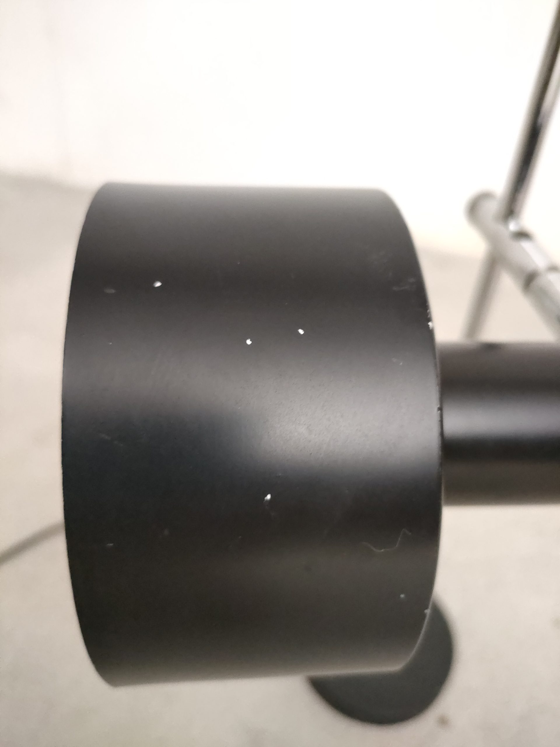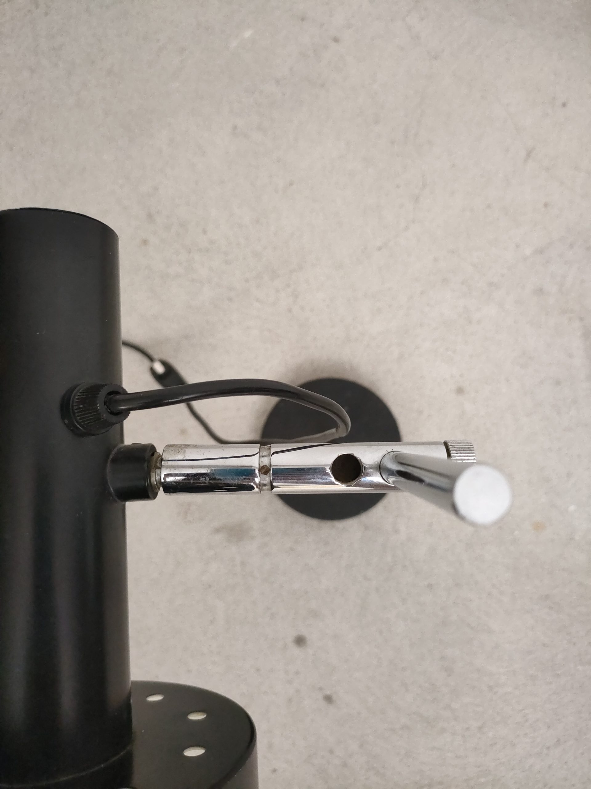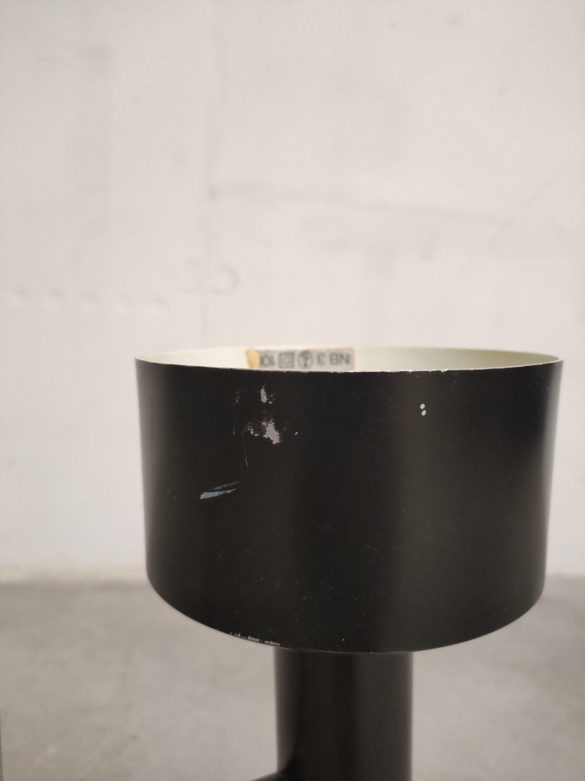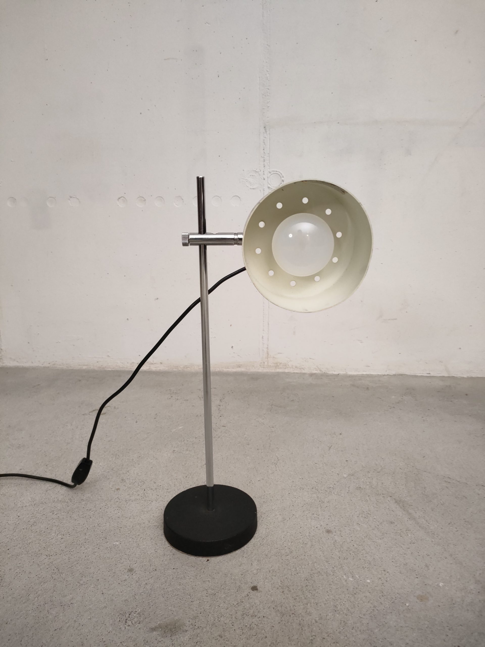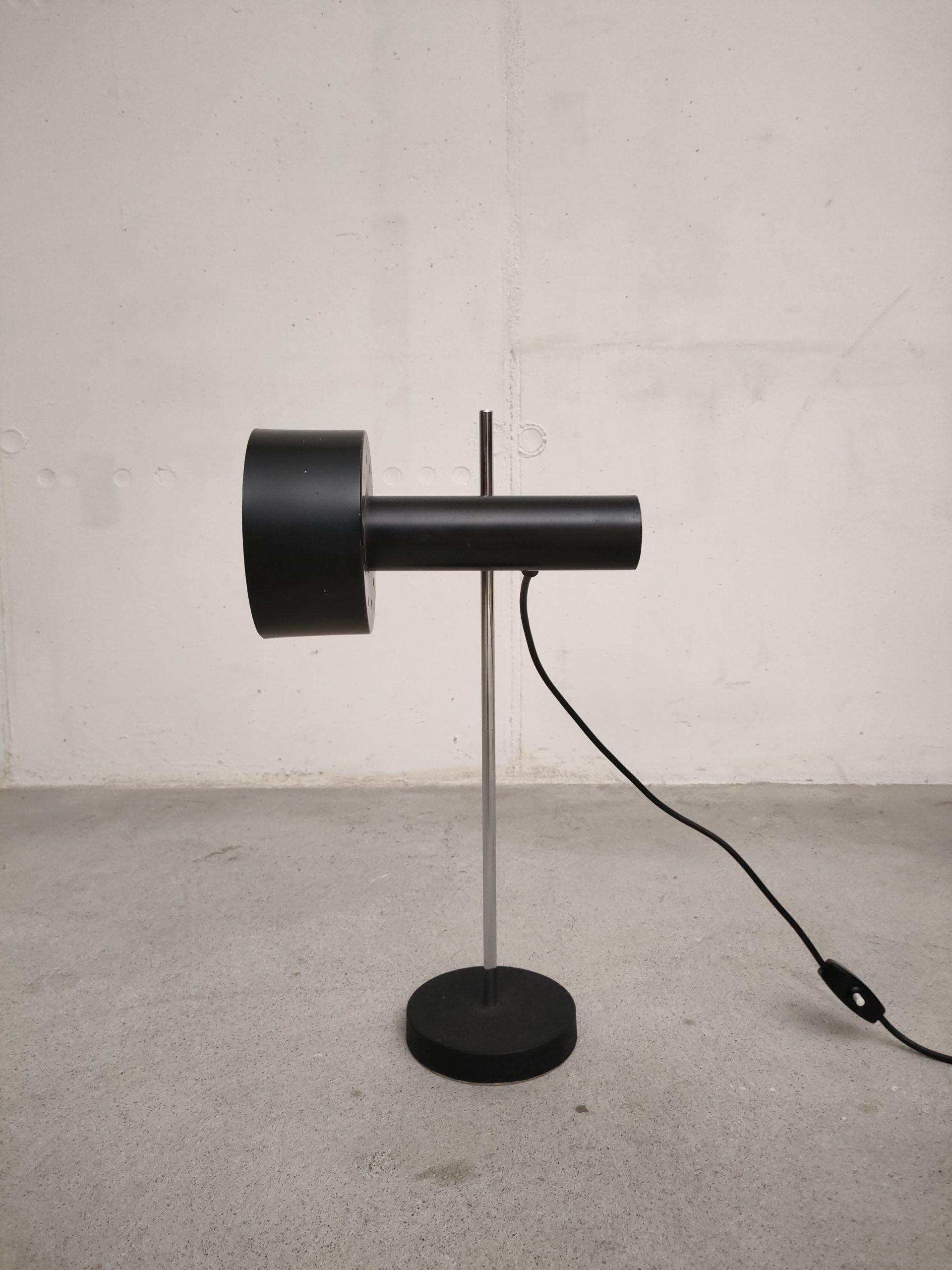 Lampe de table spot vintage avec abat-jour et socle en métal noir et tige en métal chromé. La hauteur est réglable et l’abat-jour peut être orienté dans toutes les directions. Quelques traces d’usure (voir photos) mais parfaitement fonctionnelle.