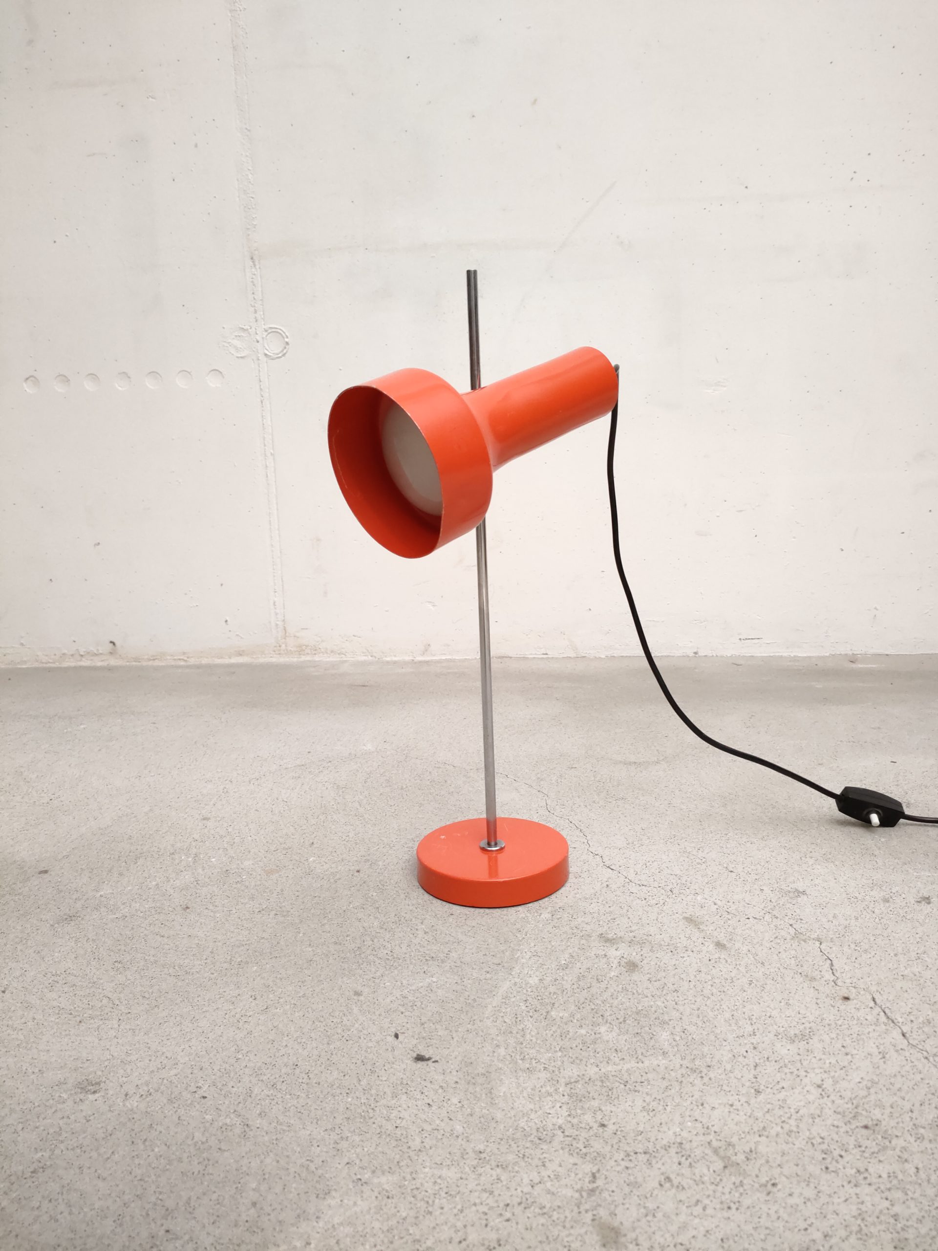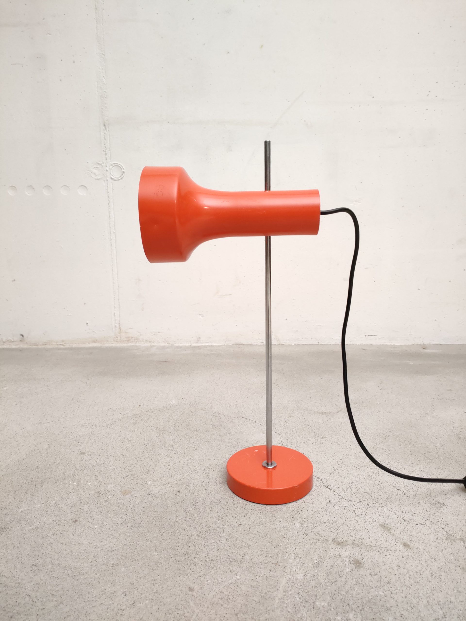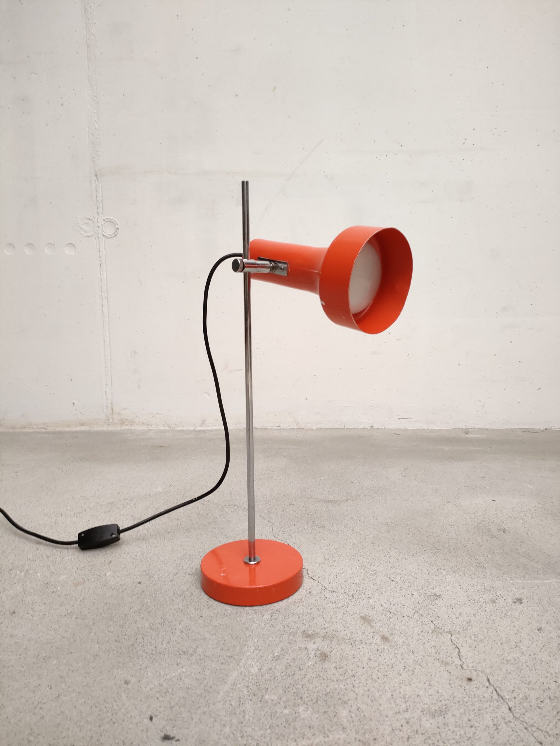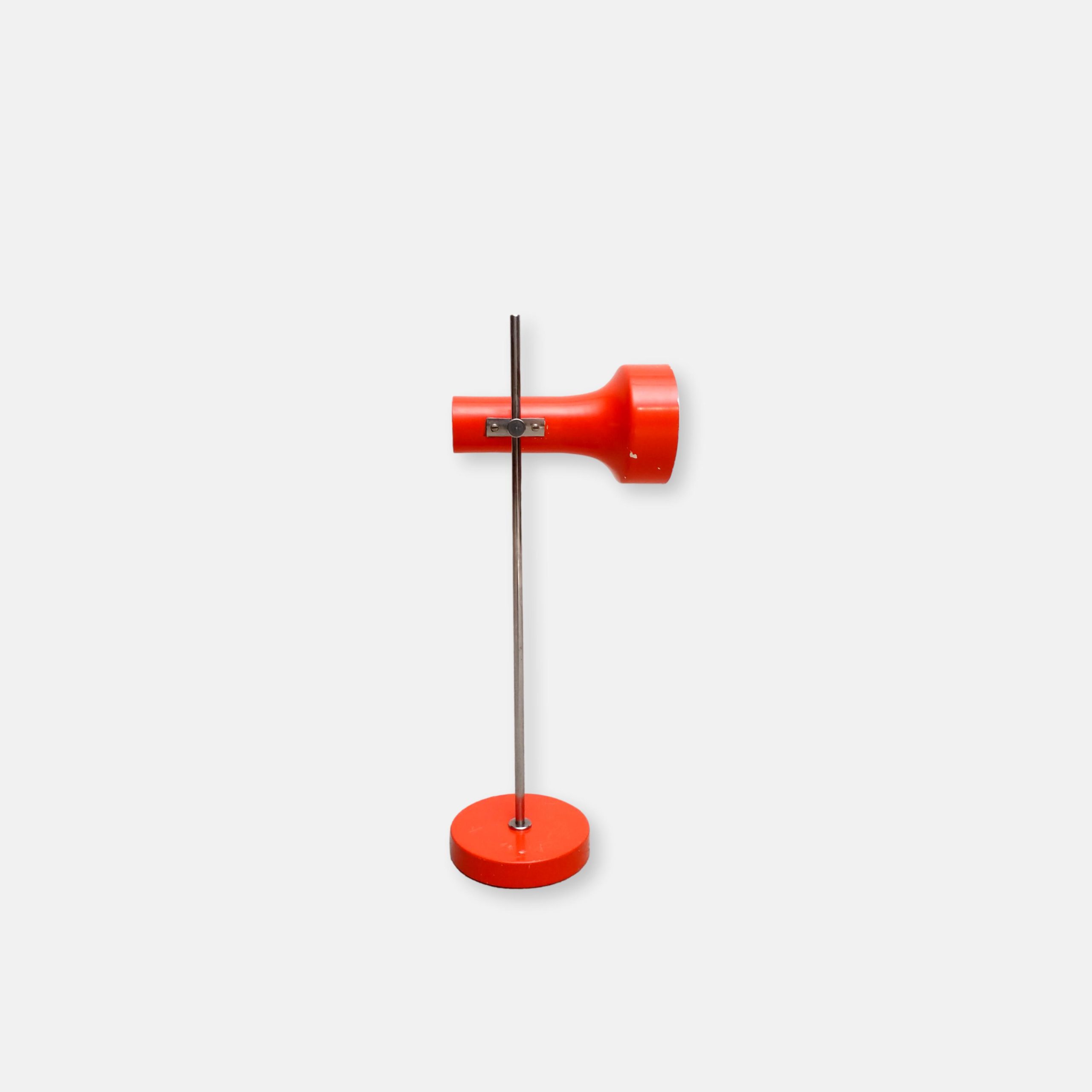 Produit venduLampe de table vintage avec socle et spot en métal de couleur rouge et tige en métal chromé. Le spot a une très belle forme et peut être orienté dans toutes les directions. Quelques traces sur le métal et des petits manques de peinture (voir photos). Stable et solide et parfaitement fonctionnelle.