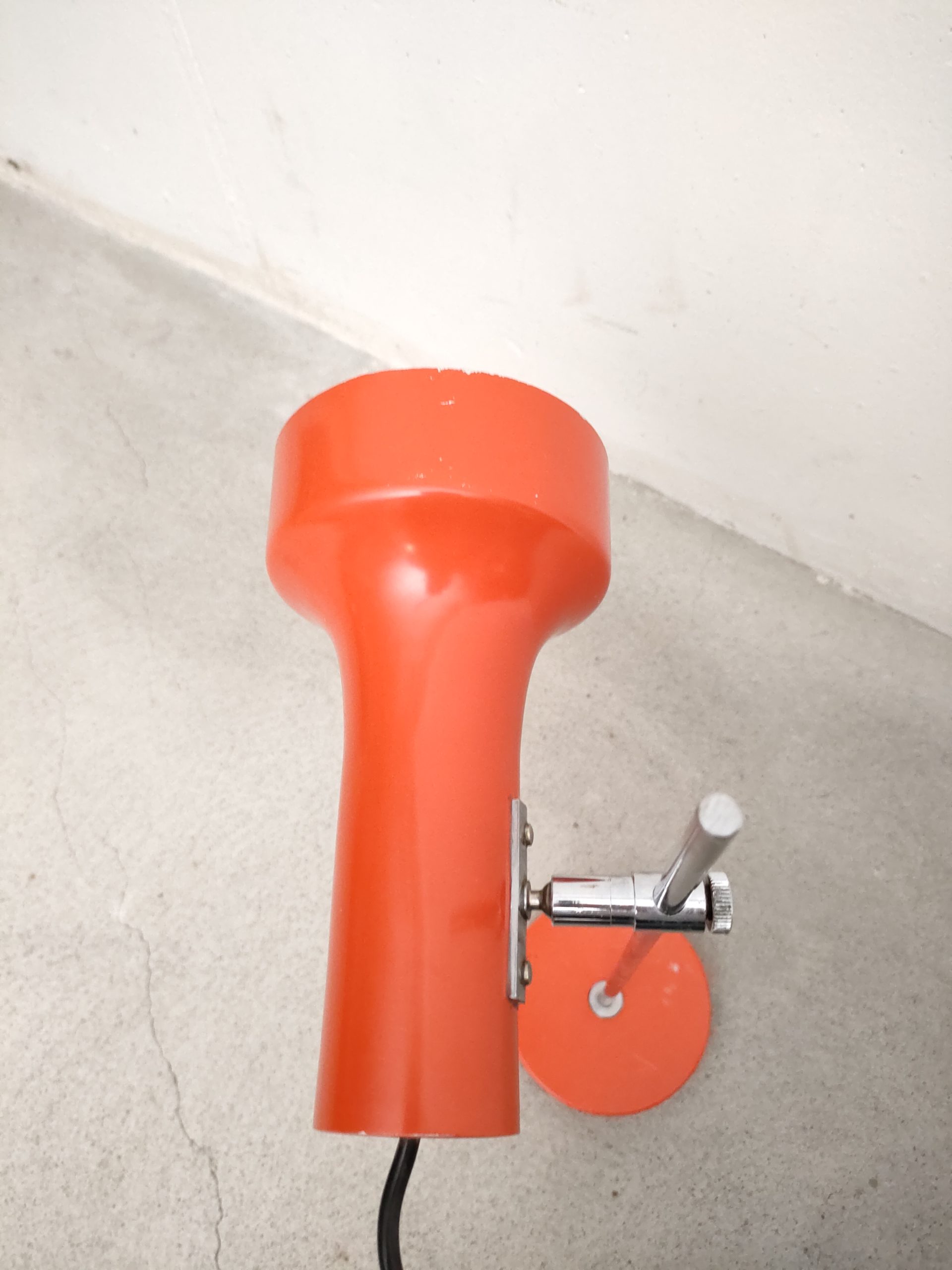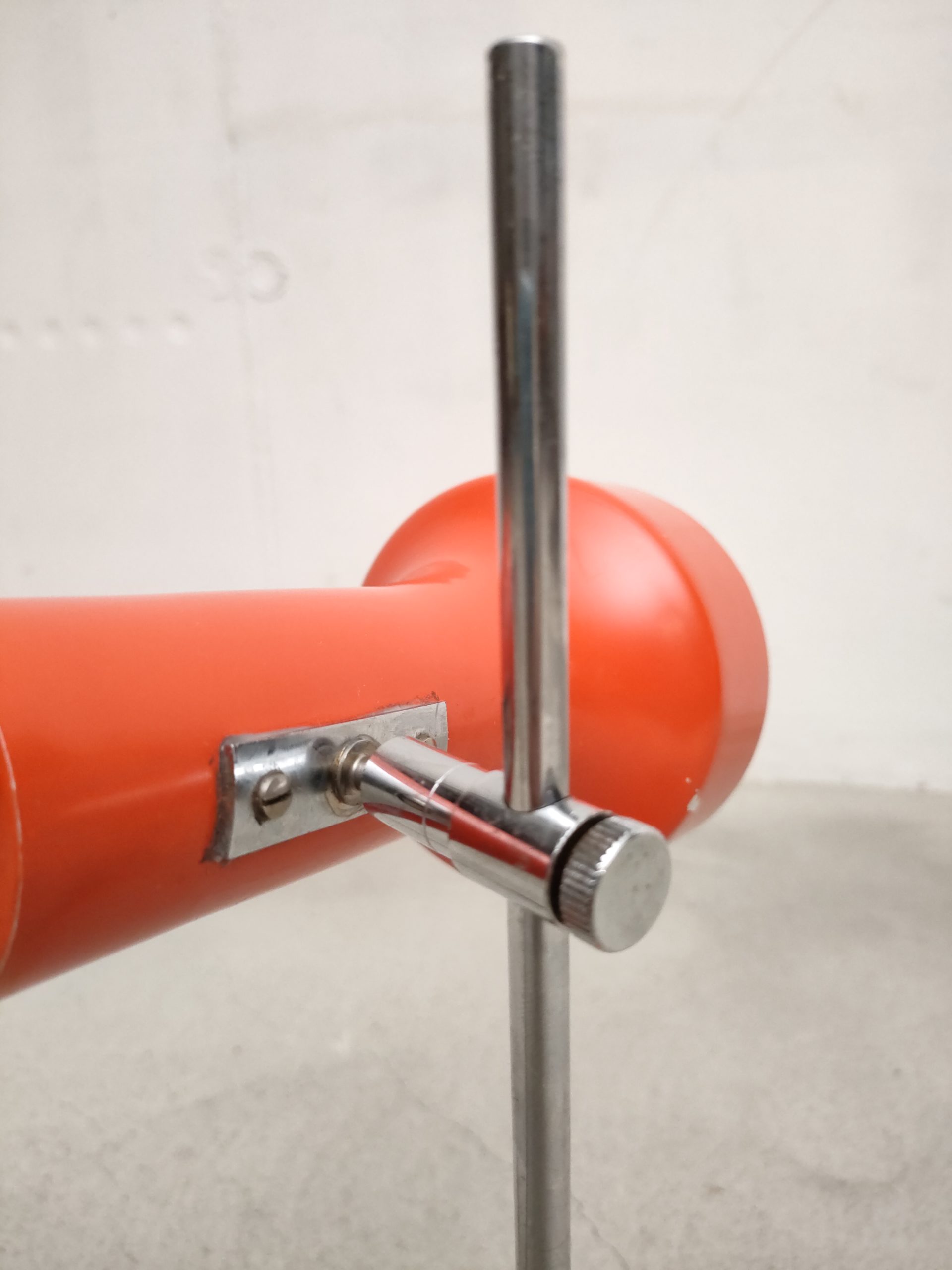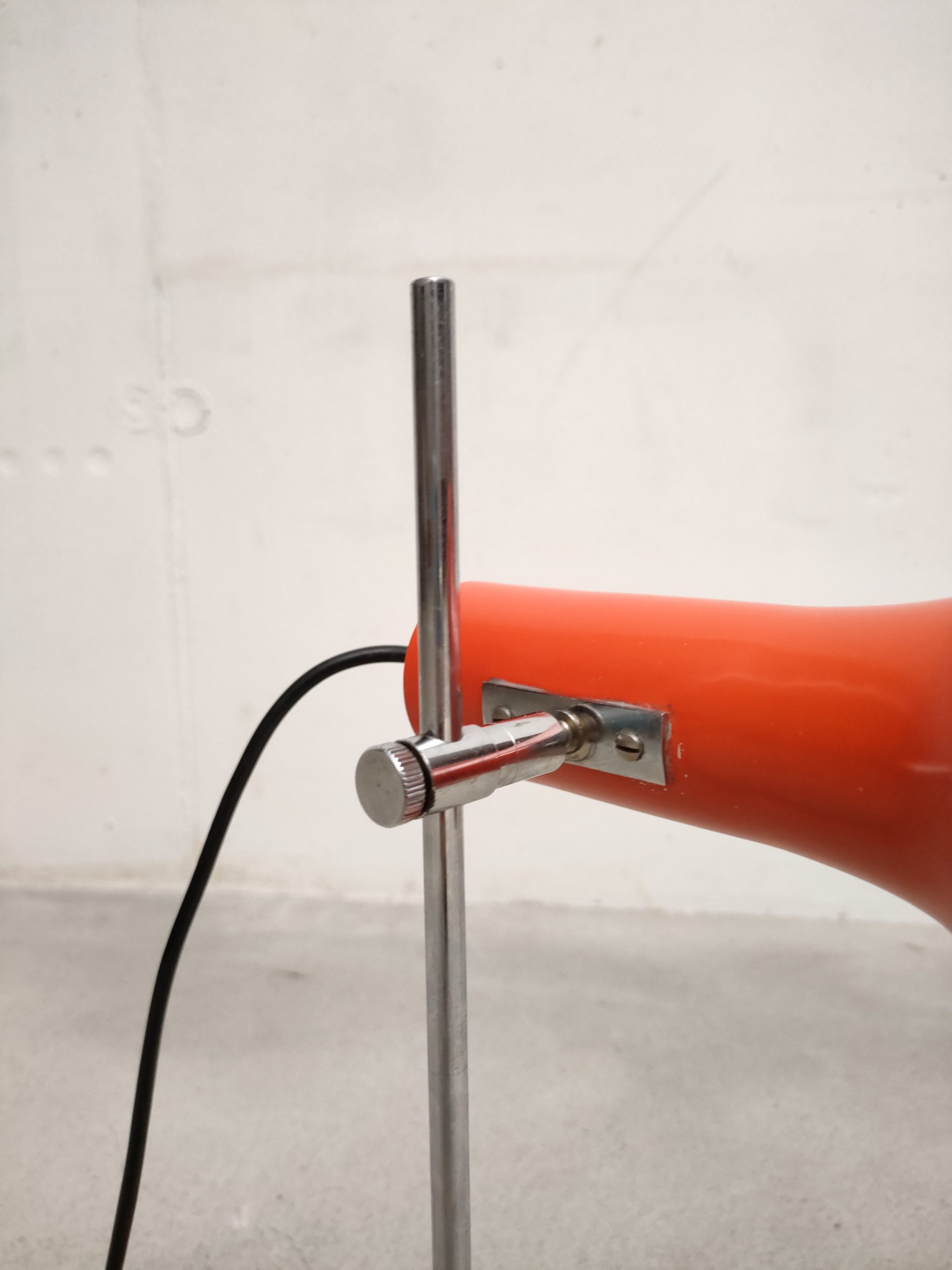 Produit venduLampe de table vintage avec socle et spot en métal de couleur rouge et tige en métal chromé. Le spot a une très belle forme et peut être orienté dans toutes les directions. Quelques traces sur le métal et des petits manques de peinture (voir photos). Stable et solide et parfaitement fonctionnelle.