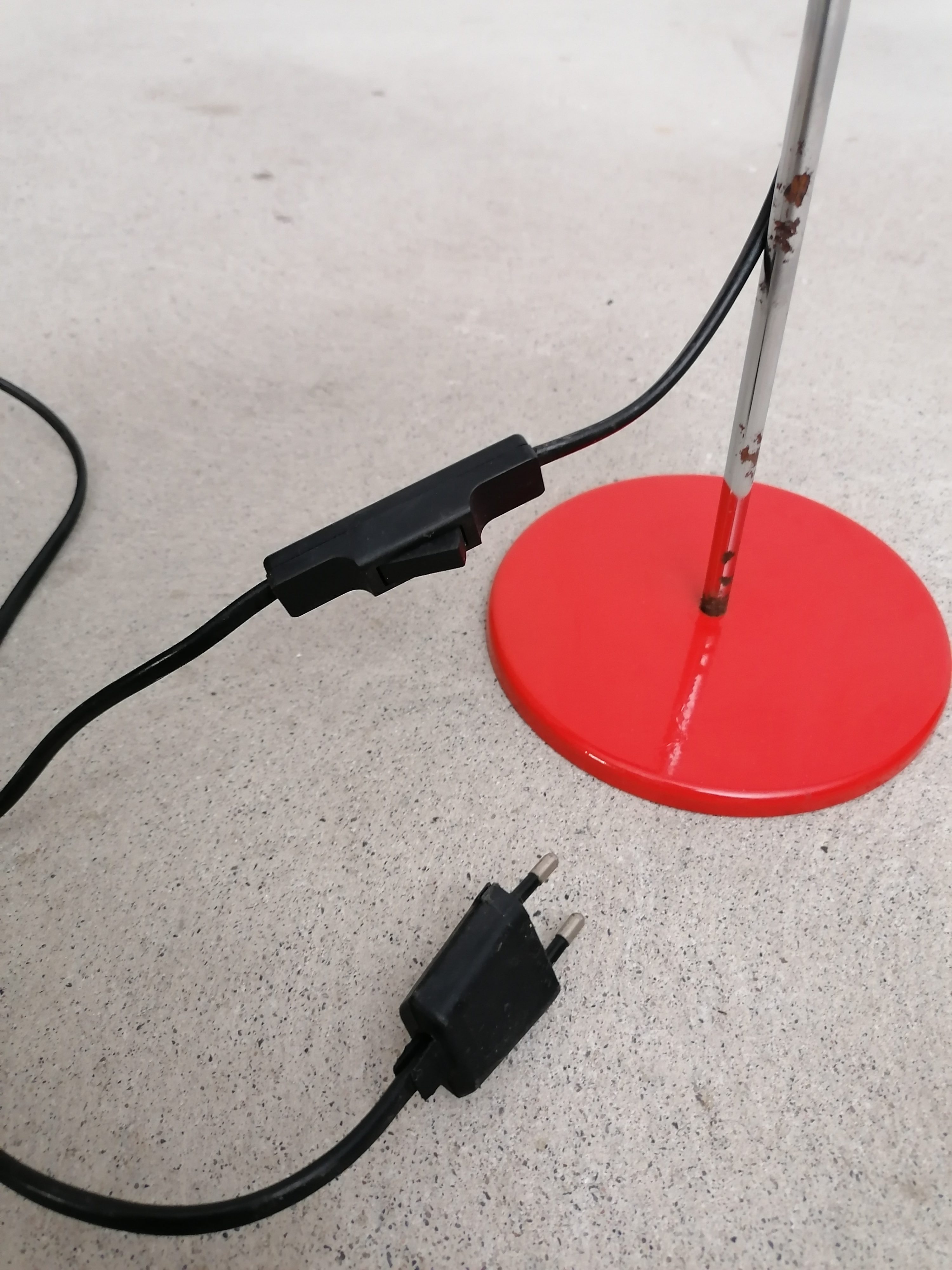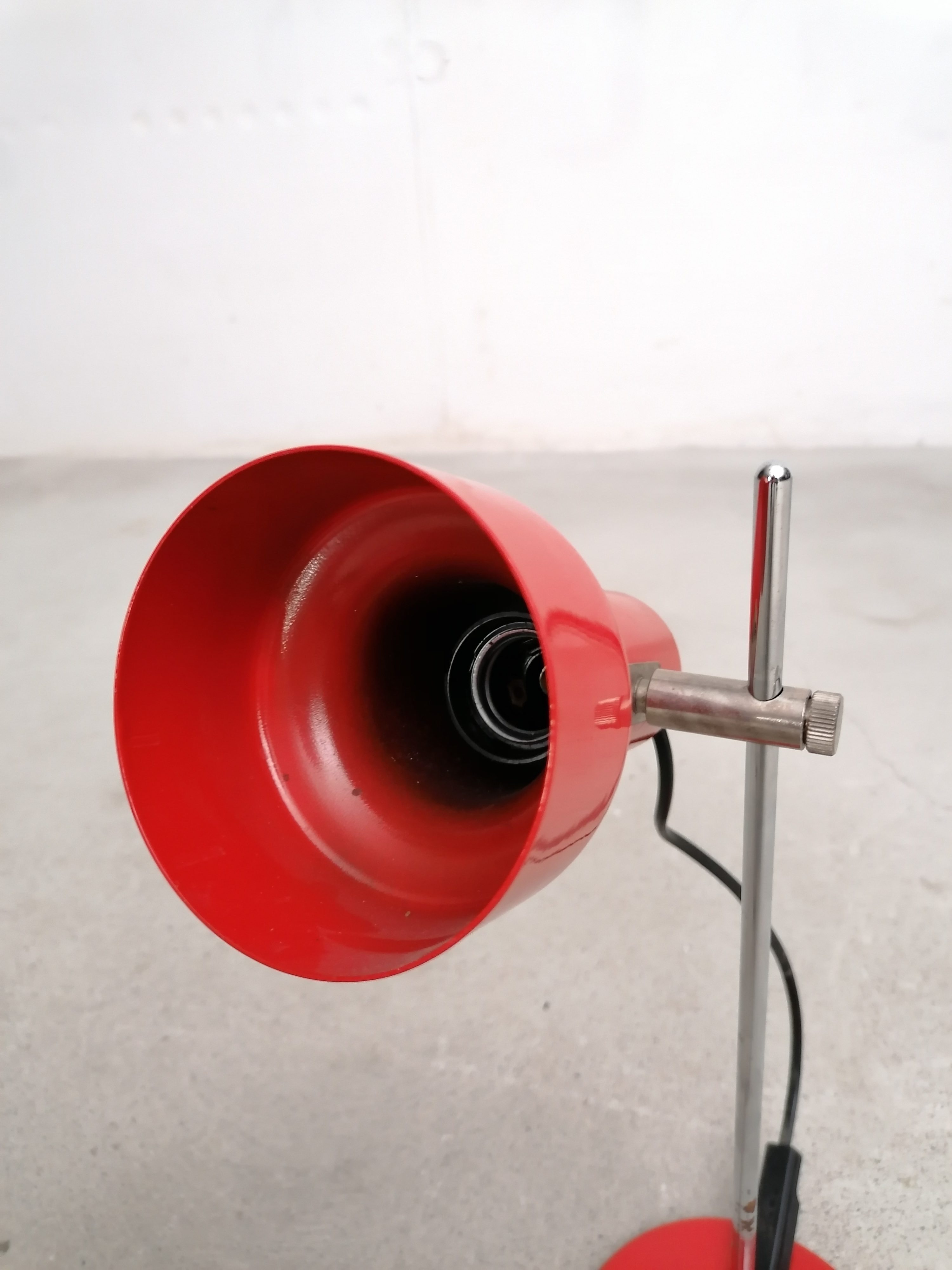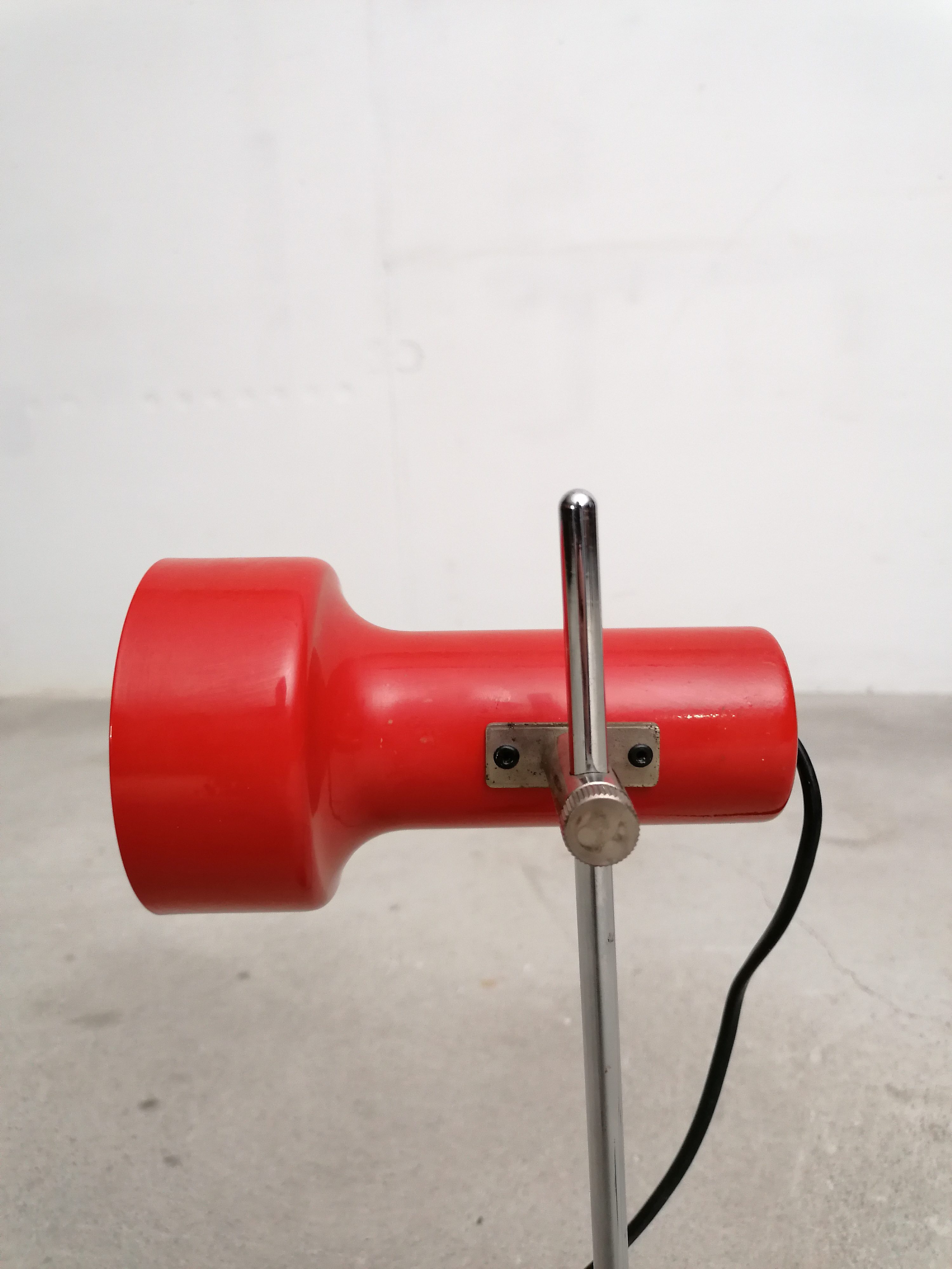 Produit venduLampe de table vintage avec socle et spot en métal rouge et tige en métal chromé. Plusieurs traces d’usure sur la tige (voir photos) mais stable et solide et parfaitement fonctionnelle. Le câble a été réparé à un endroit.