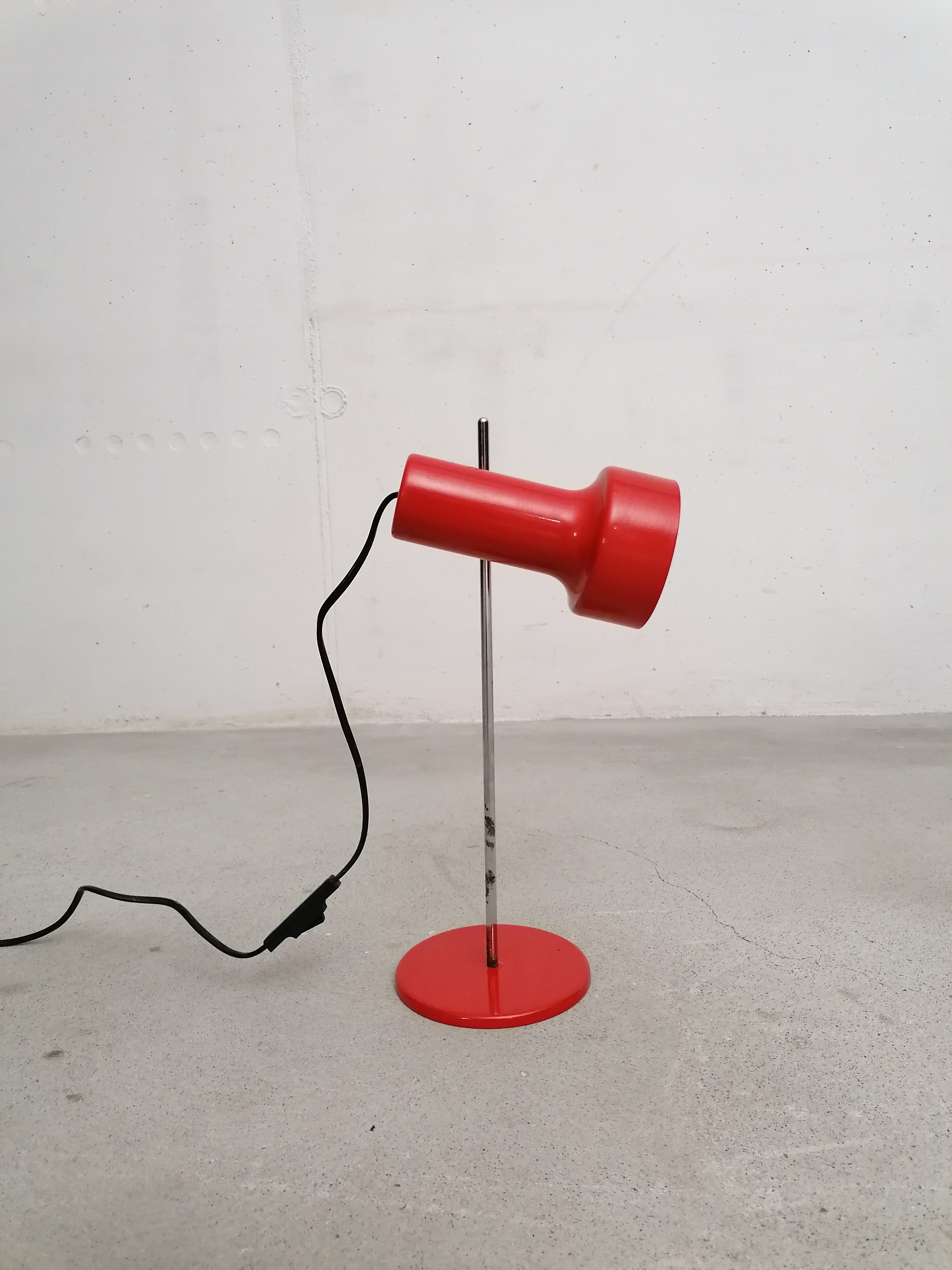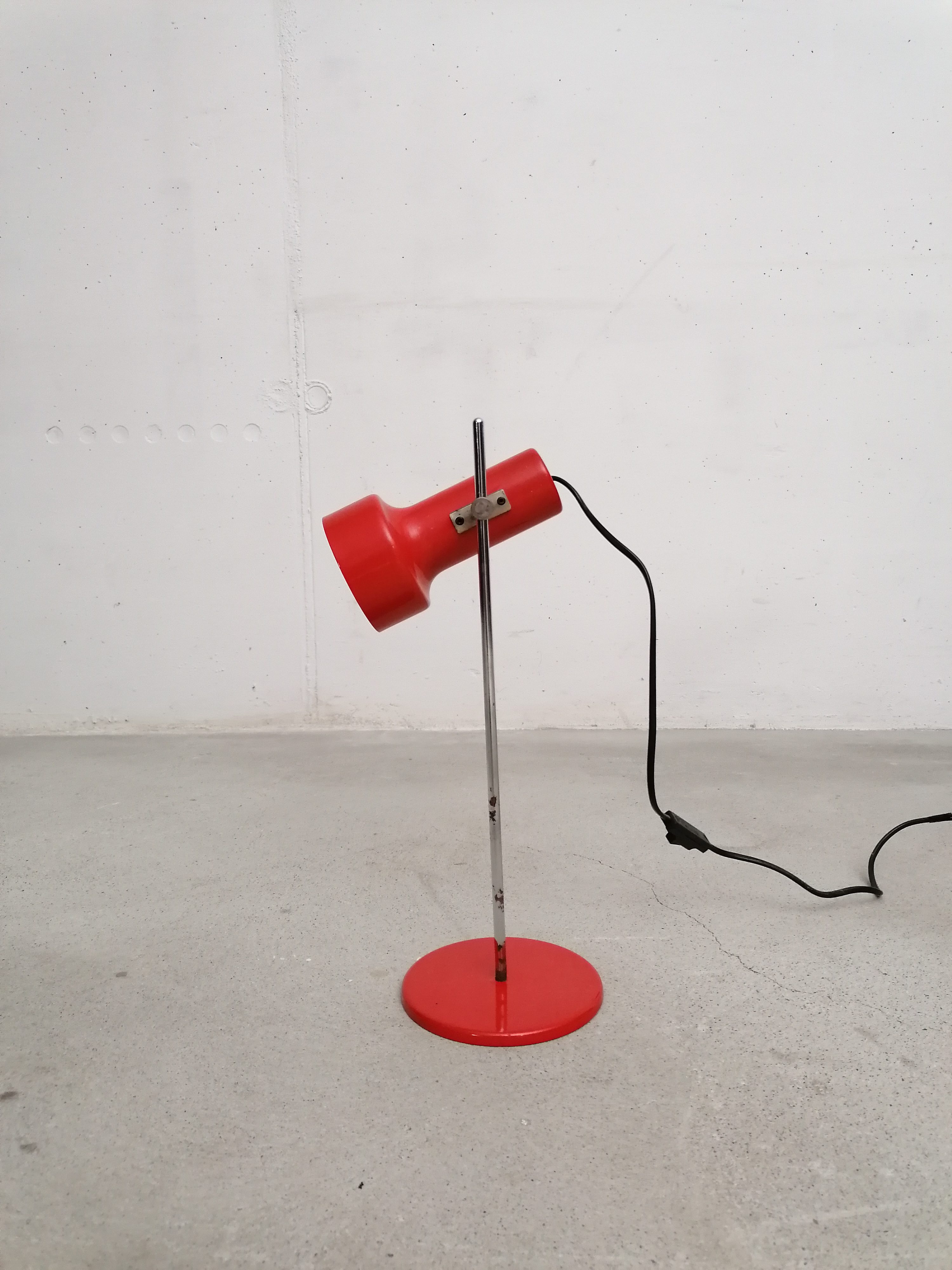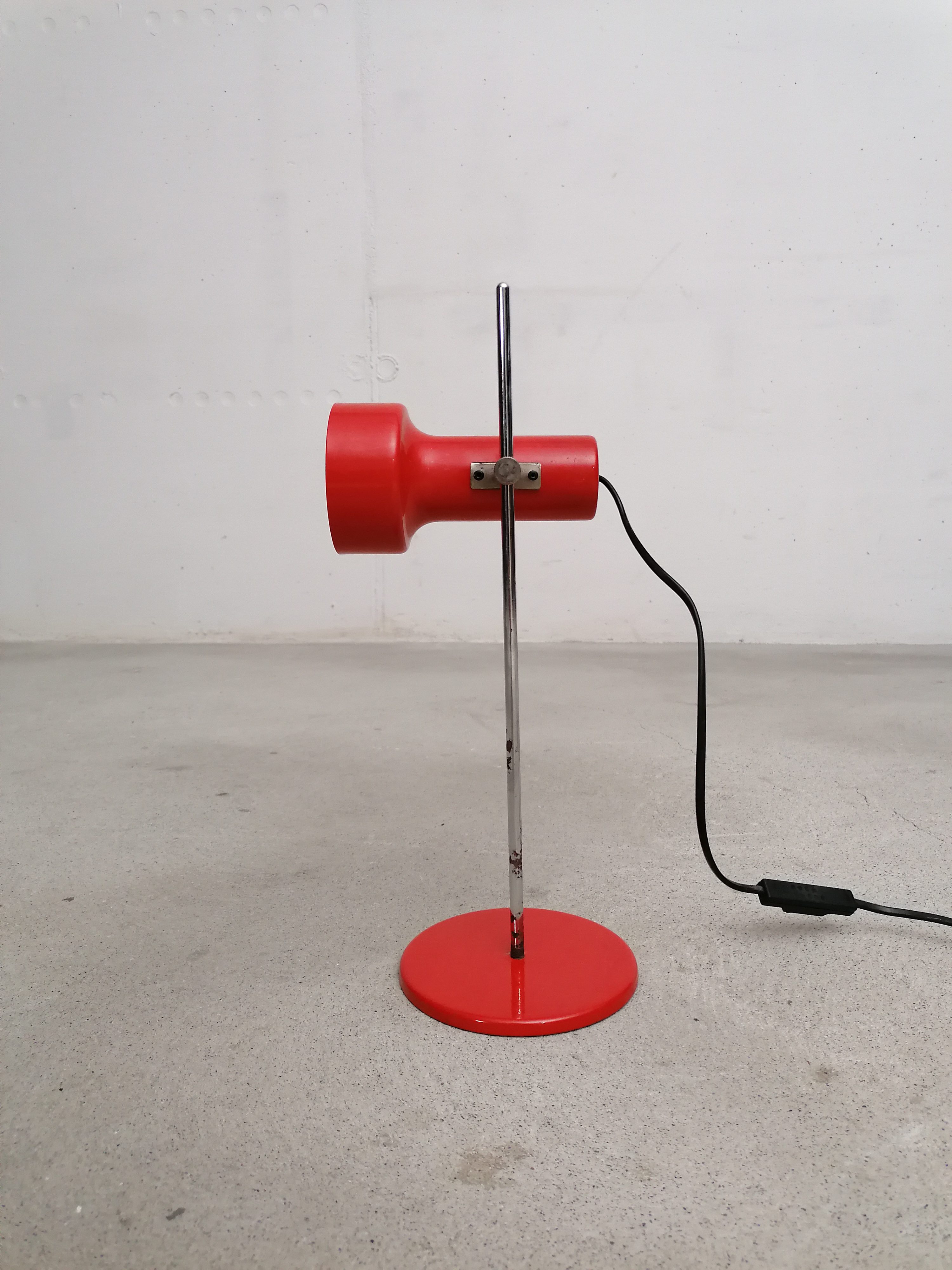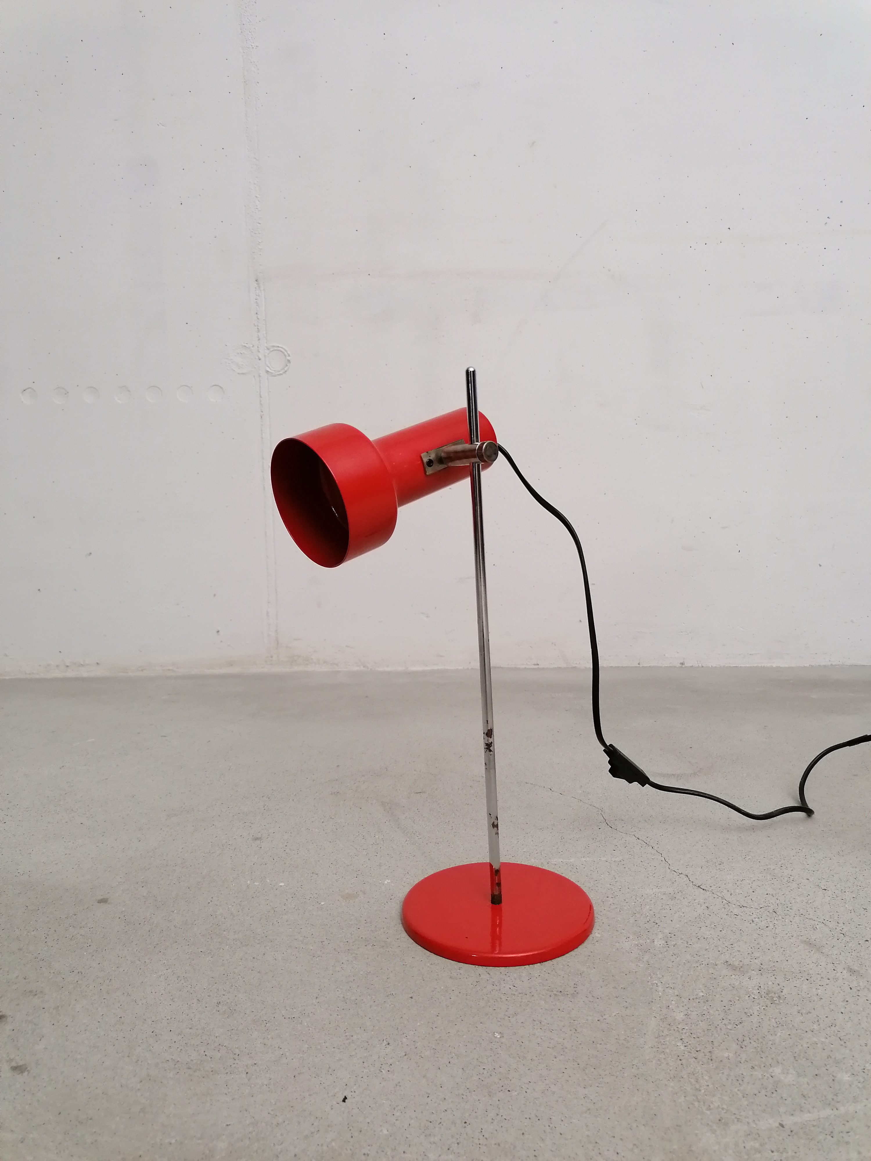 Produit venduLampe de table vintage avec socle et spot en métal rouge et tige en métal chromé. Plusieurs traces d’usure sur la tige (voir photos) mais stable et solide et parfaitement fonctionnelle. Le câble a été réparé à un endroit.