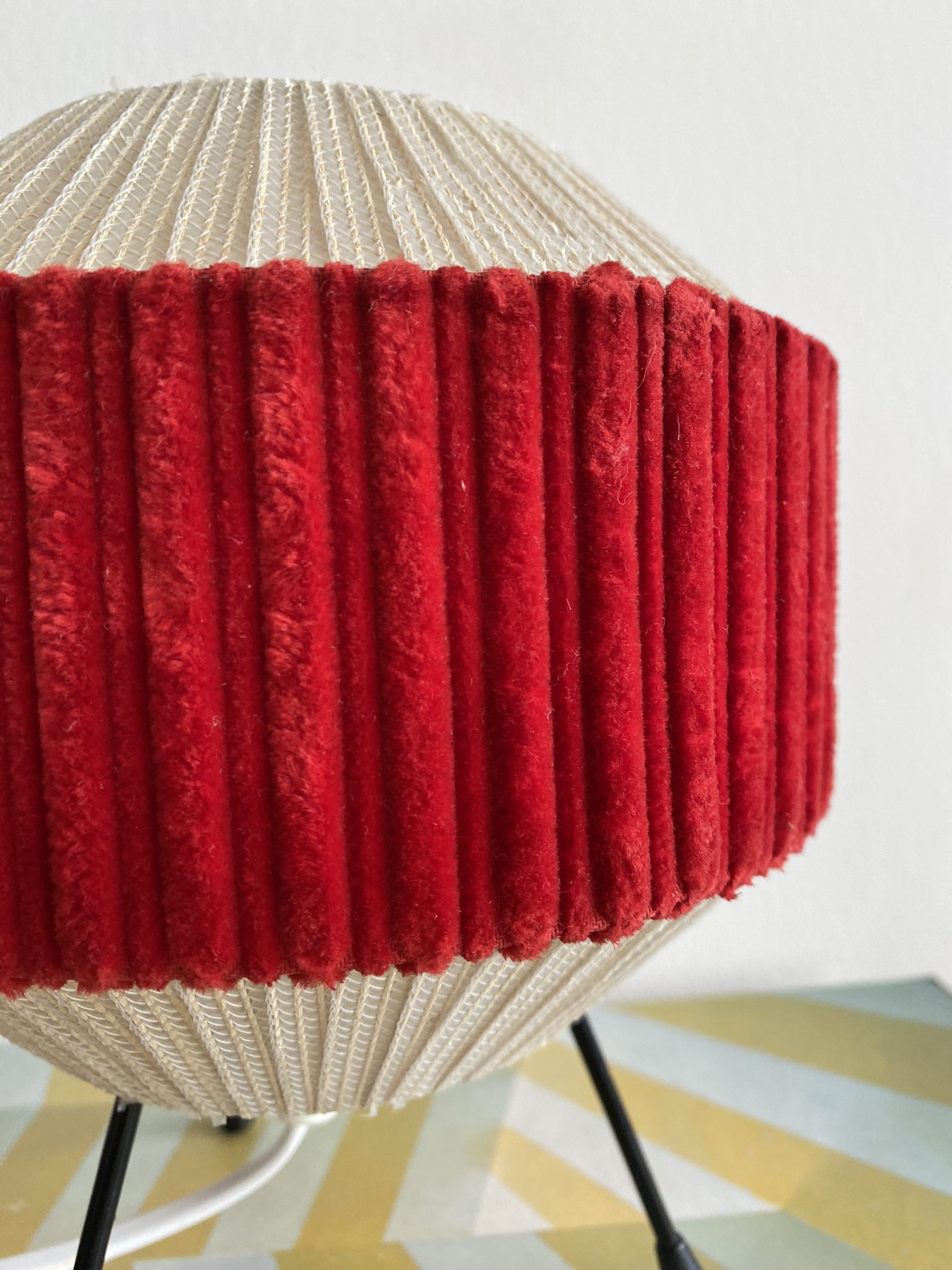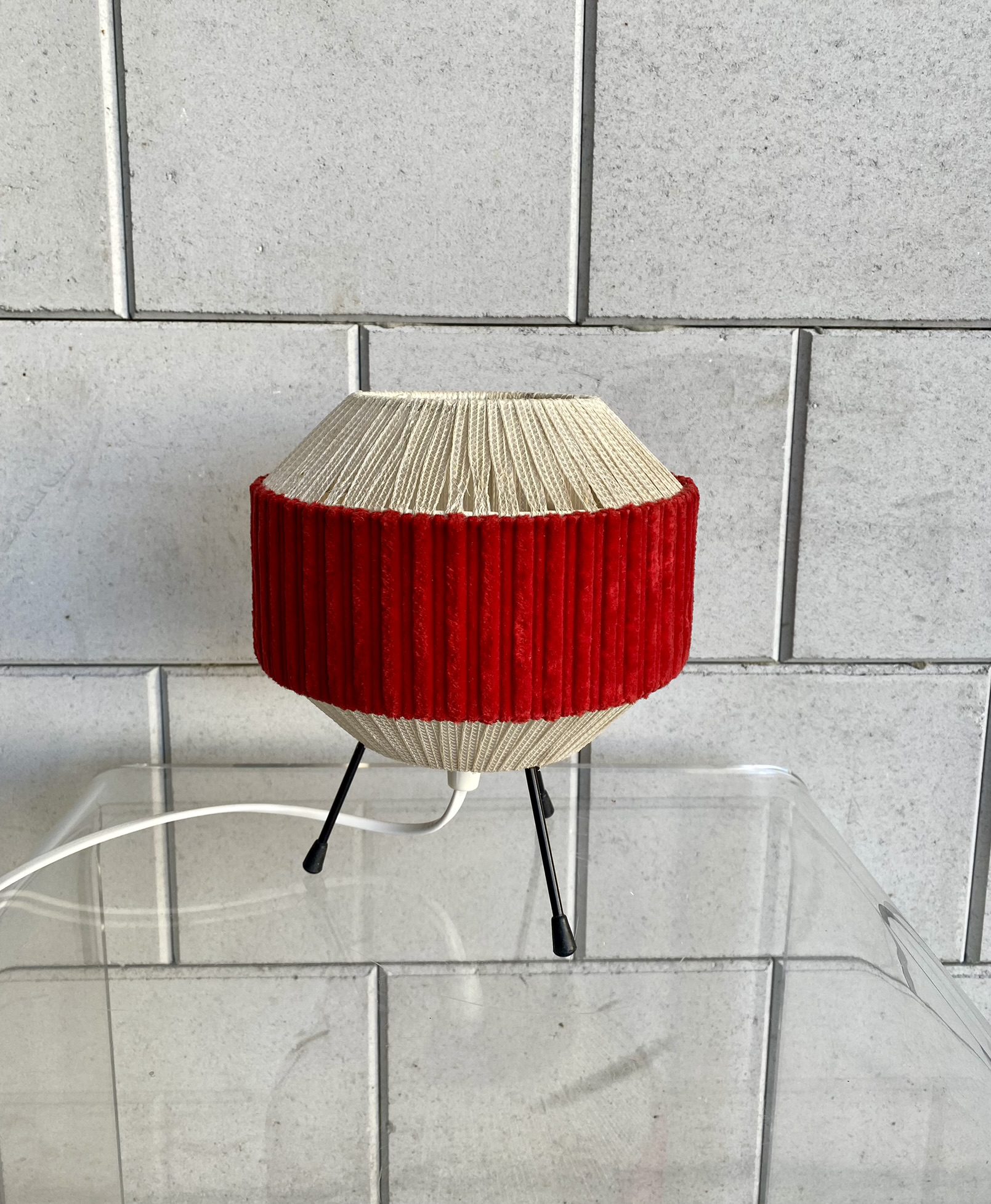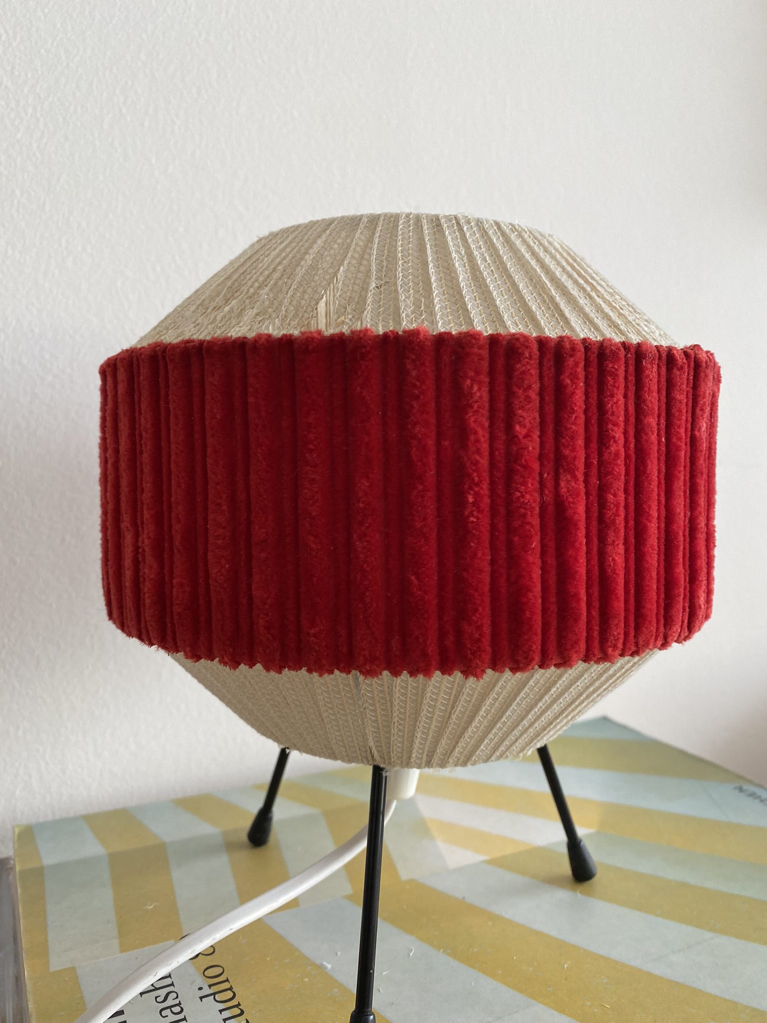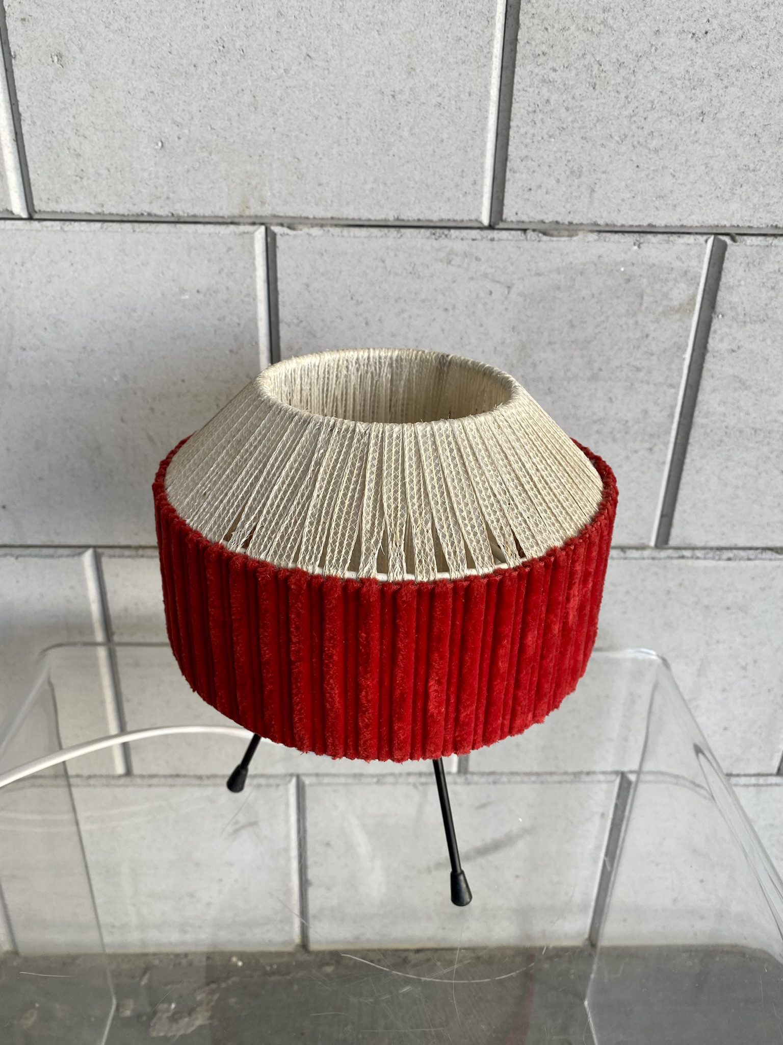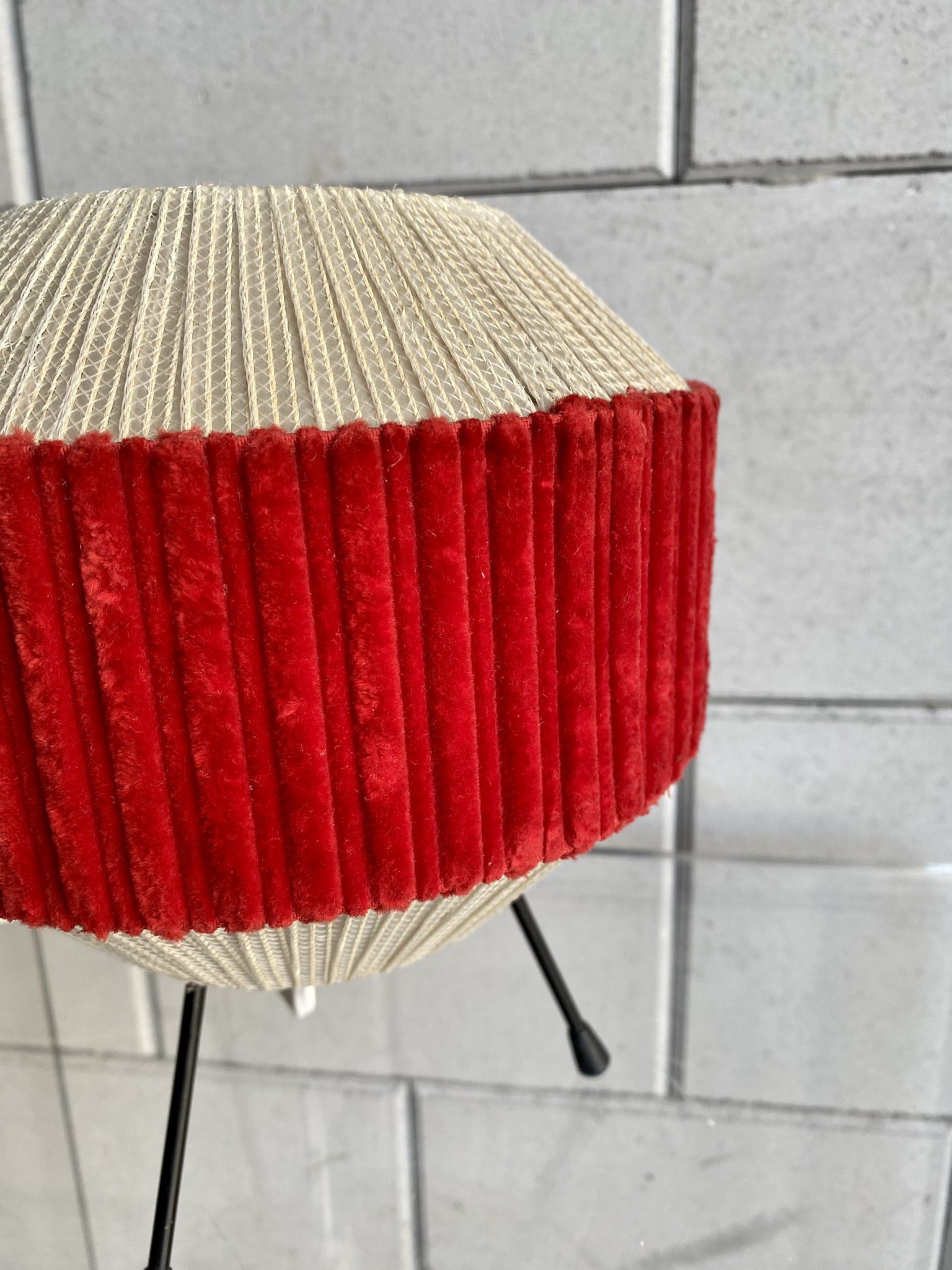 Produit venduLampe de table vintage tripode, structure en métal laqué noir et patins en caoutchouc, abat-jour avec finition en velours rouge pour un style typique des années 1960.