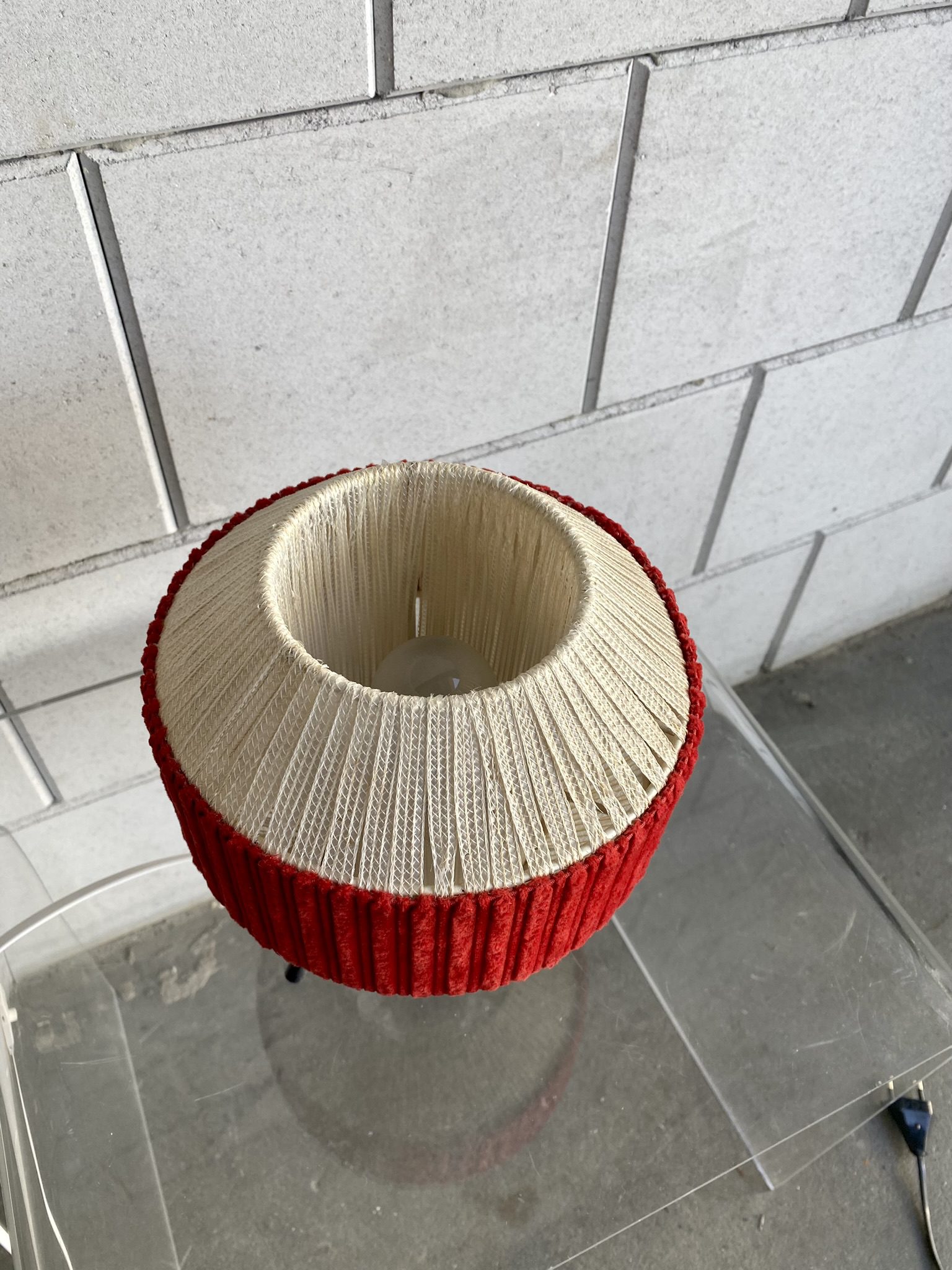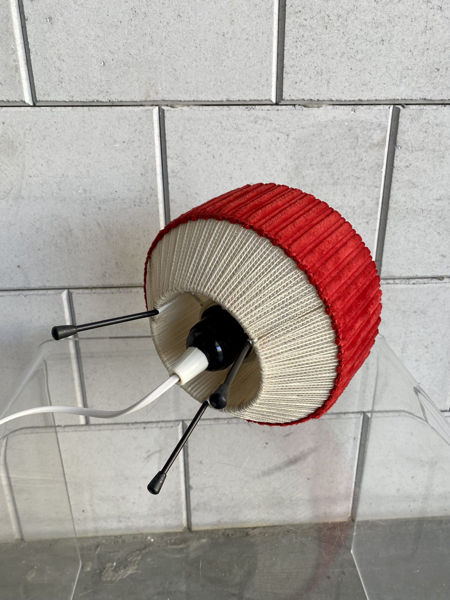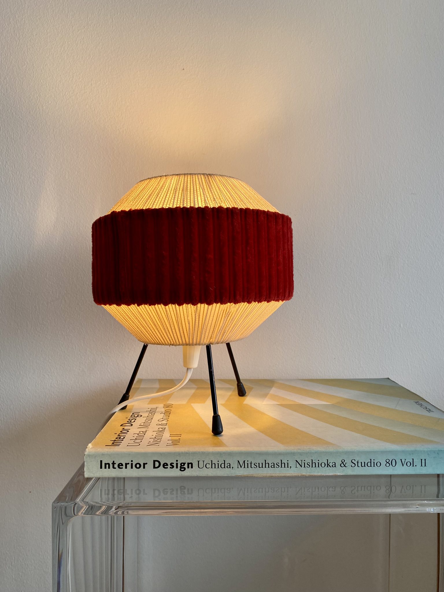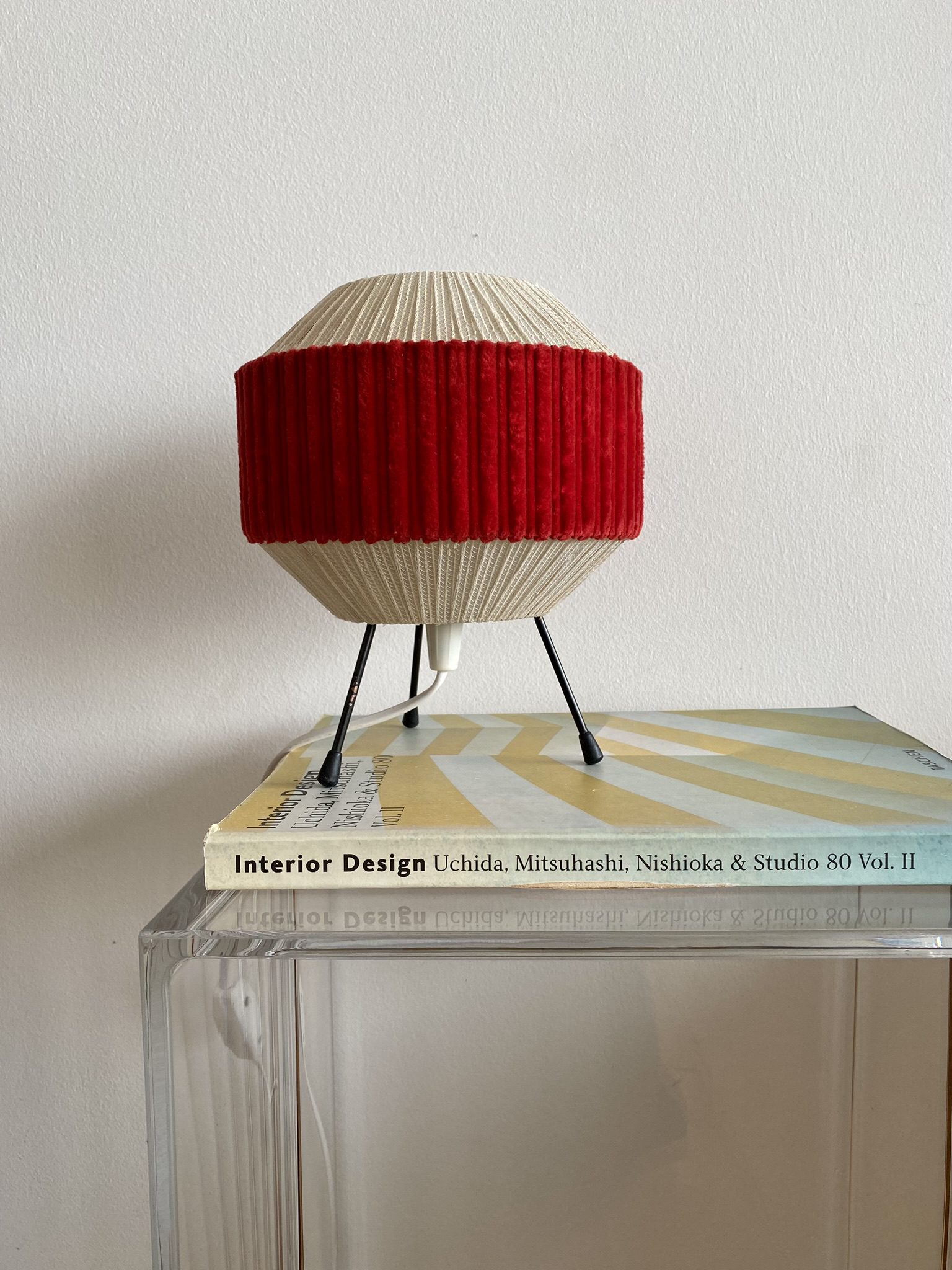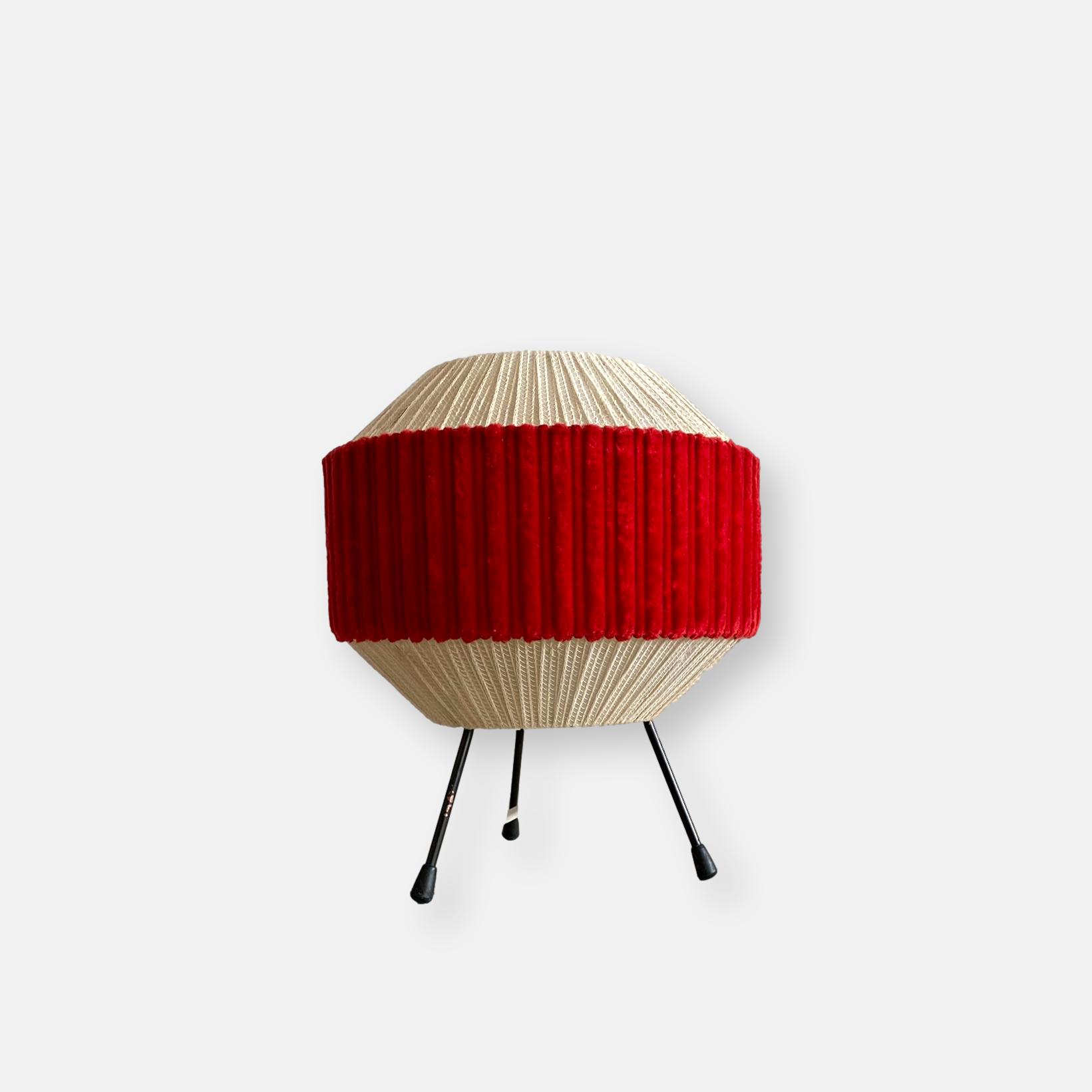 Produit venduLampe de table vintage tripode, structure en métal laqué noir et patins en caoutchouc, abat-jour avec finition en velours rouge pour un style typique des années 1960.
