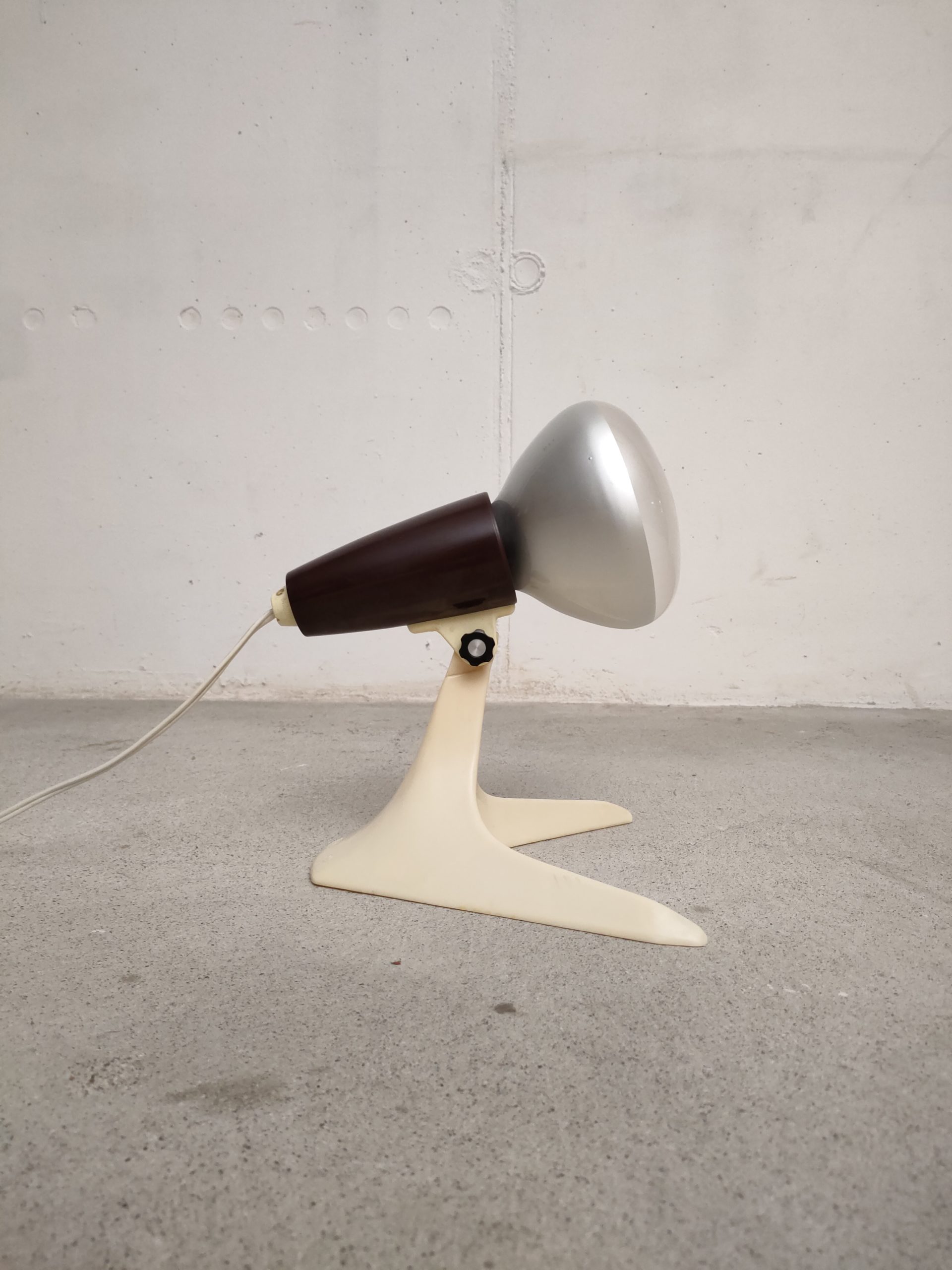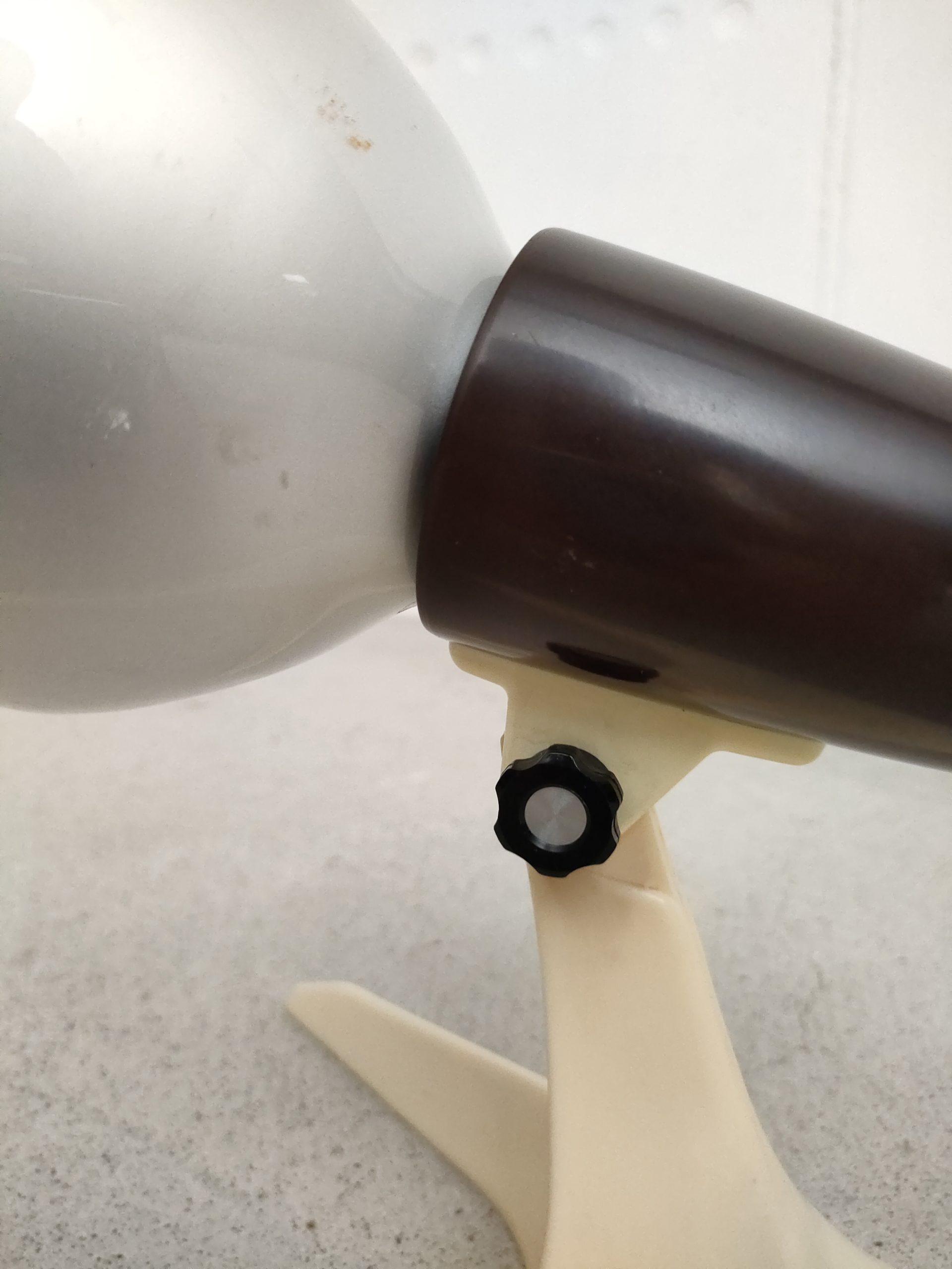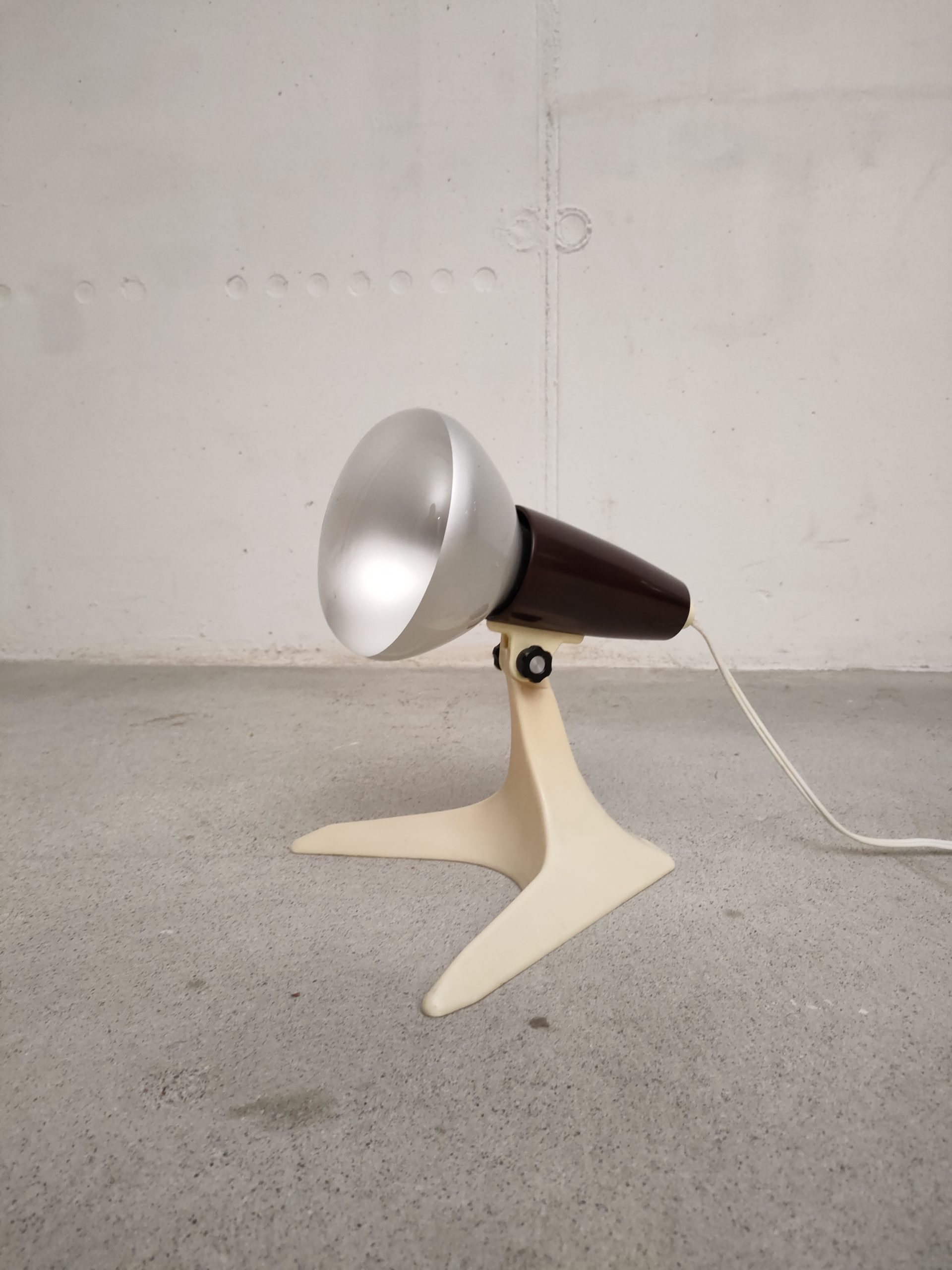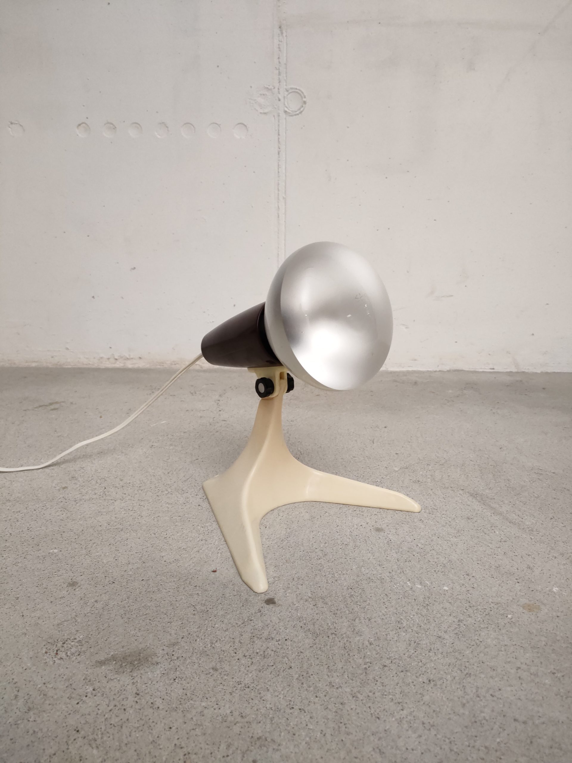 Produit venduLampe de table vintage avec piètement en plastique avec petit mécanisme permettant d’orienter légèrement la direction de l’ampoule. Quelques traces d’usure mais la lampe est parfaitement fonctionnelle.