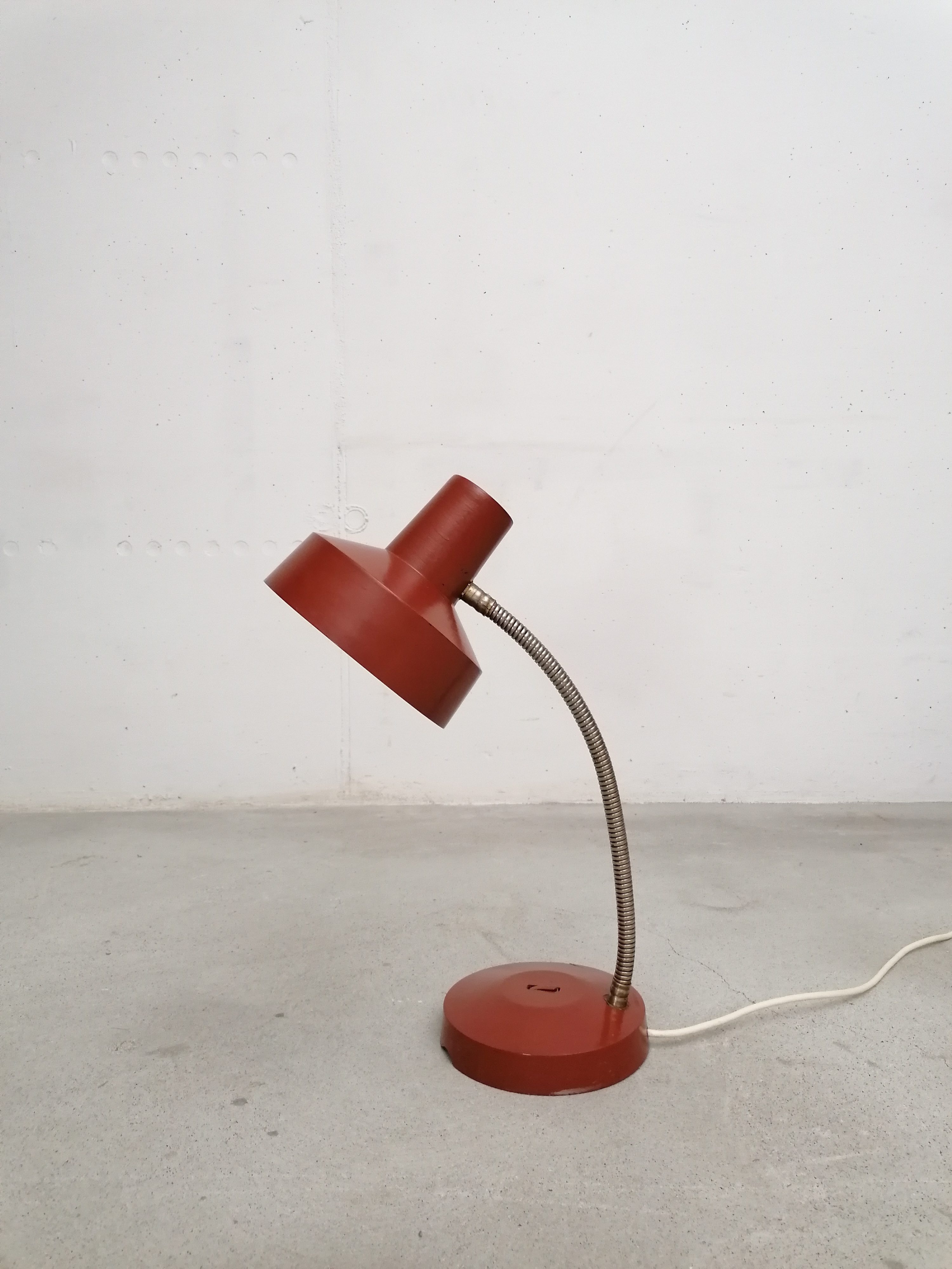 Produit venduLampe de table vintage. Socle et abat-jour en métal rouge et flexible en métal doré. Interrupteur sur le socle. Le socle est endommagé à plusieurs endroits mais la lampe est parfaitement stable et fonctionnelle.