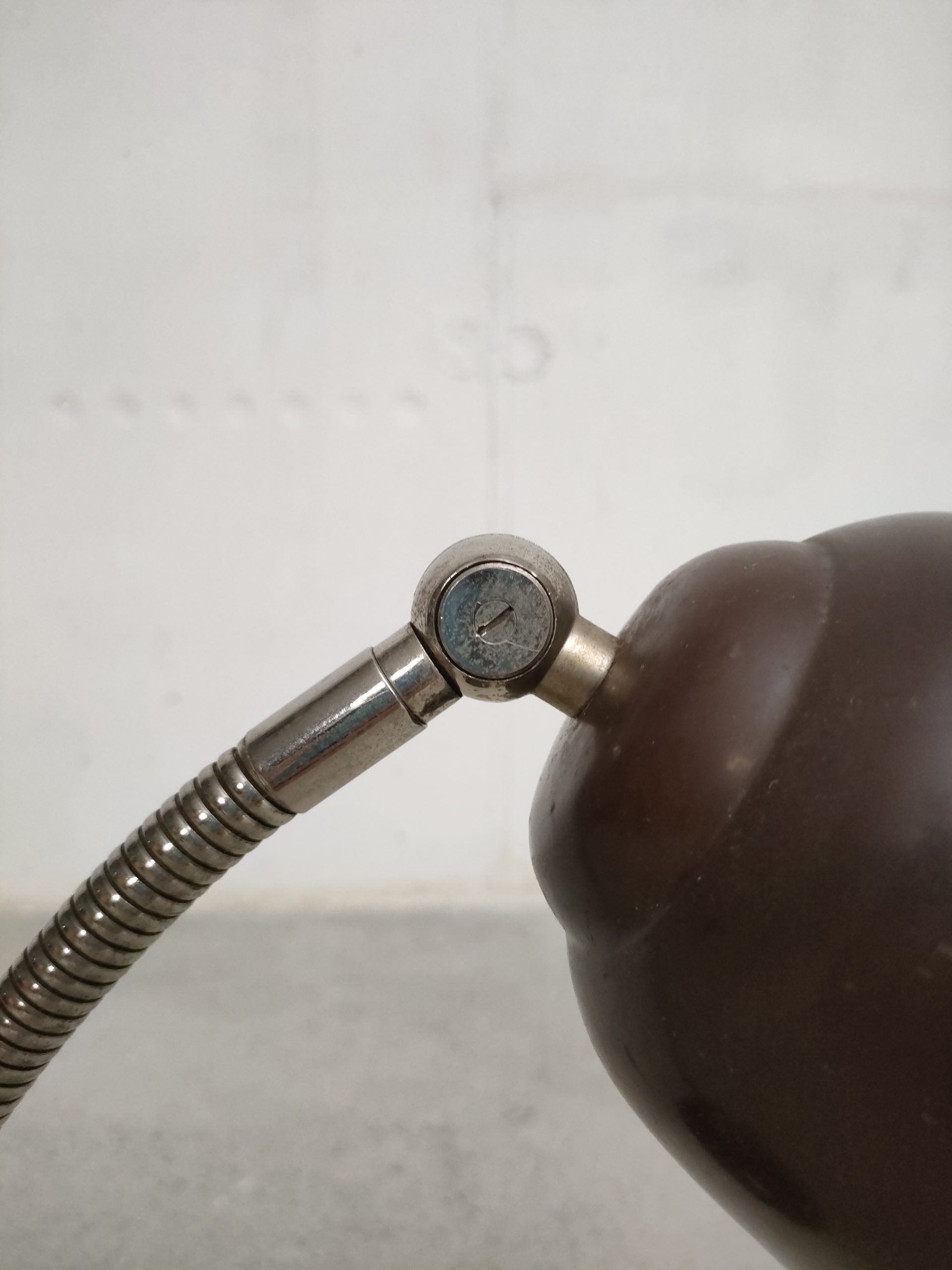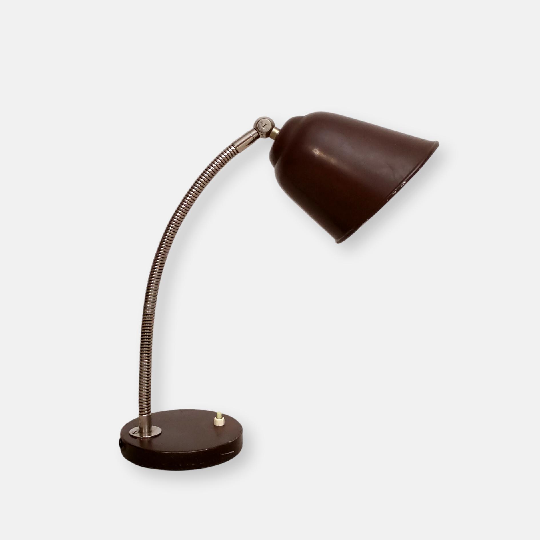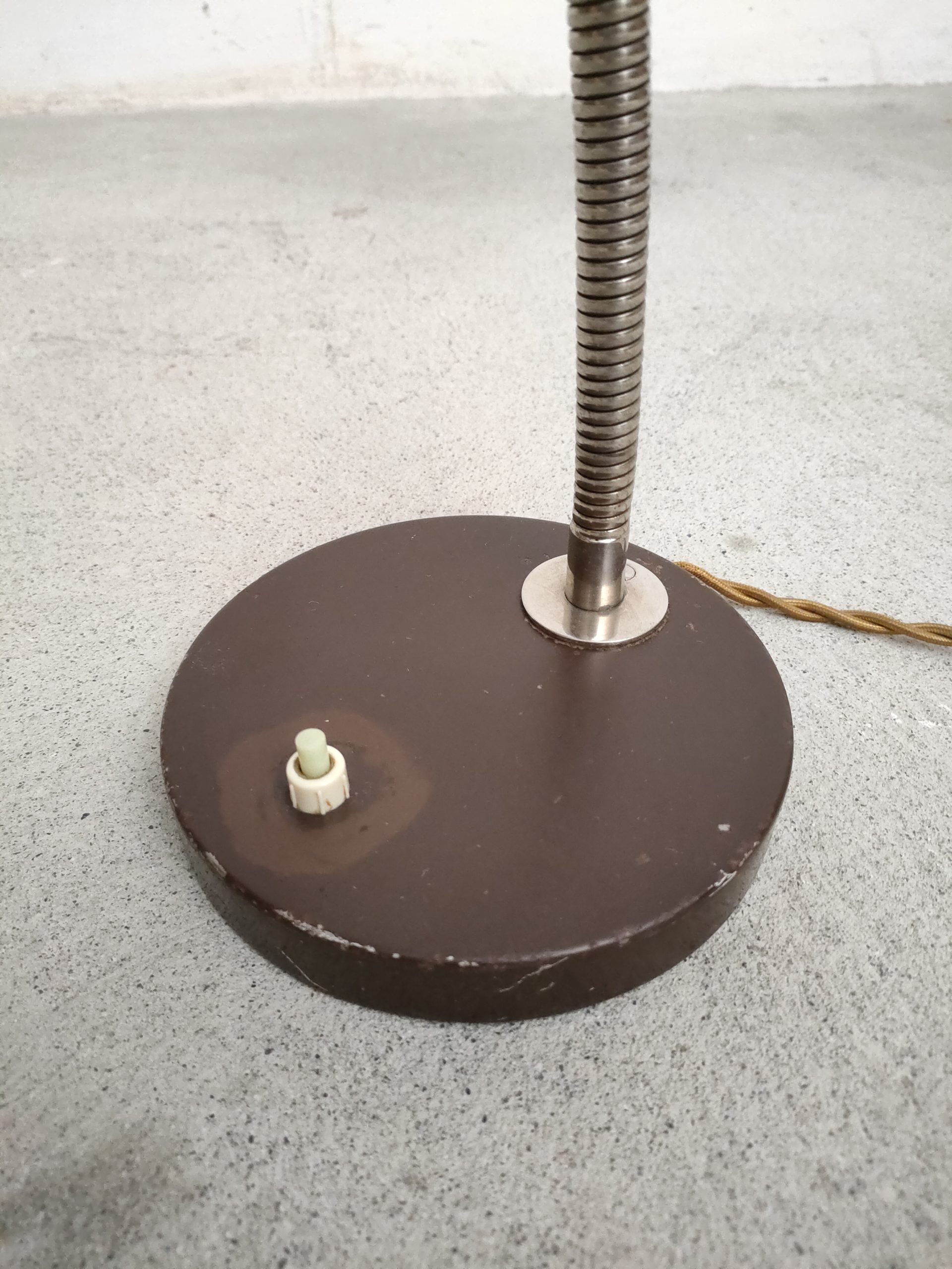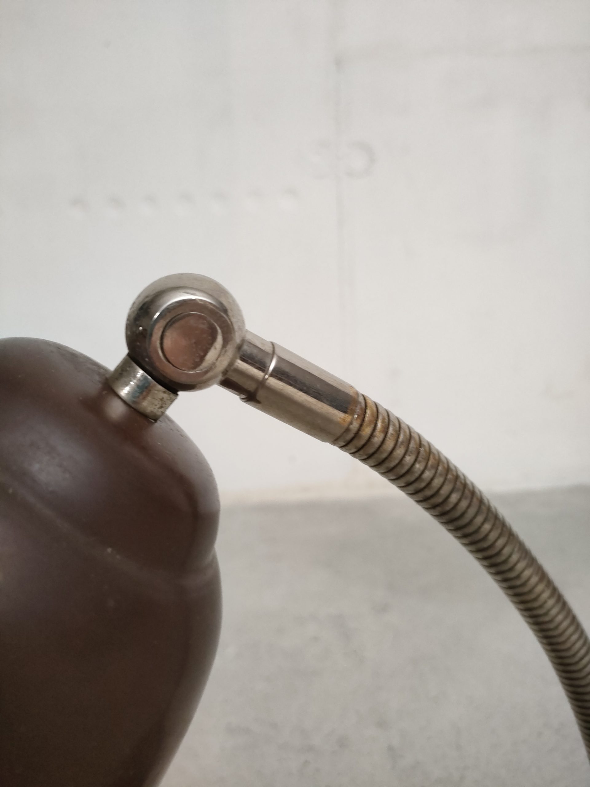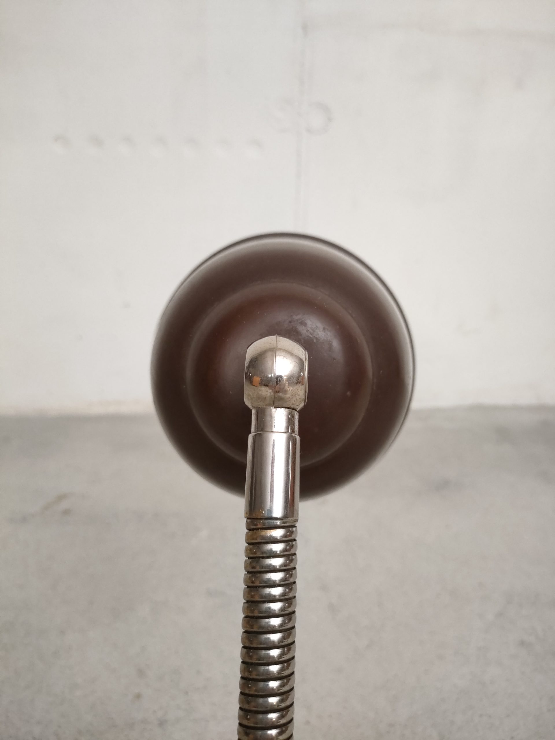 Produit venduLampe de table vintage avec socle et abat-jour en métal marron, flexible en métal chromé et interrupteur sur le socle. L’abat-jour peut être orienté en avant et en arrière. Quelques traces d’usure sur la le socle et à l’intérieur de l’abat-jour.