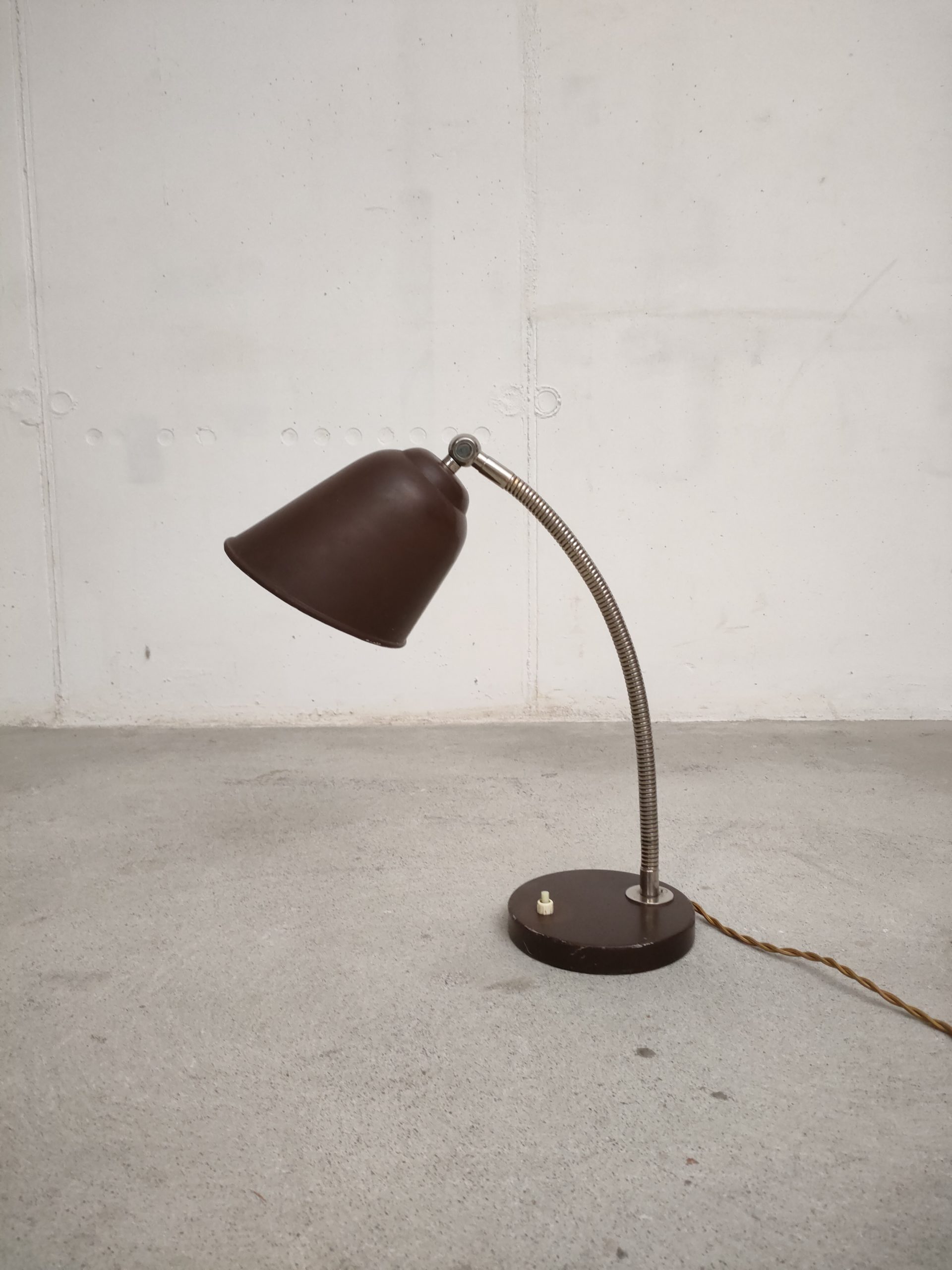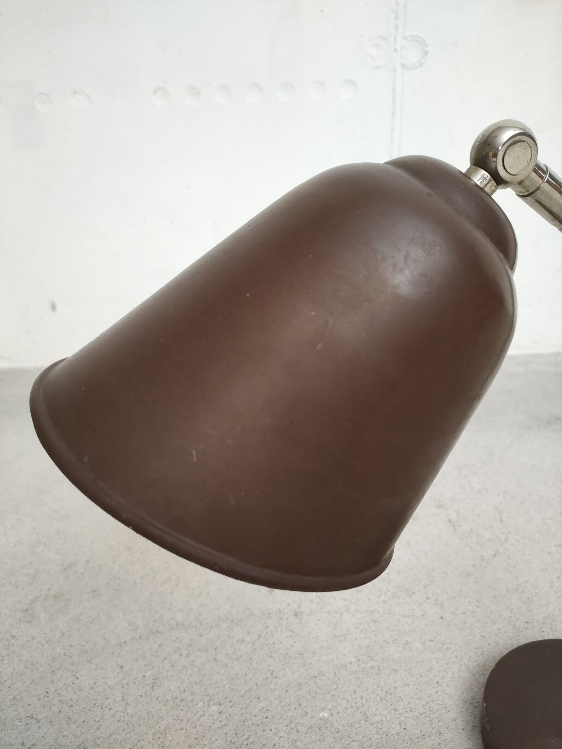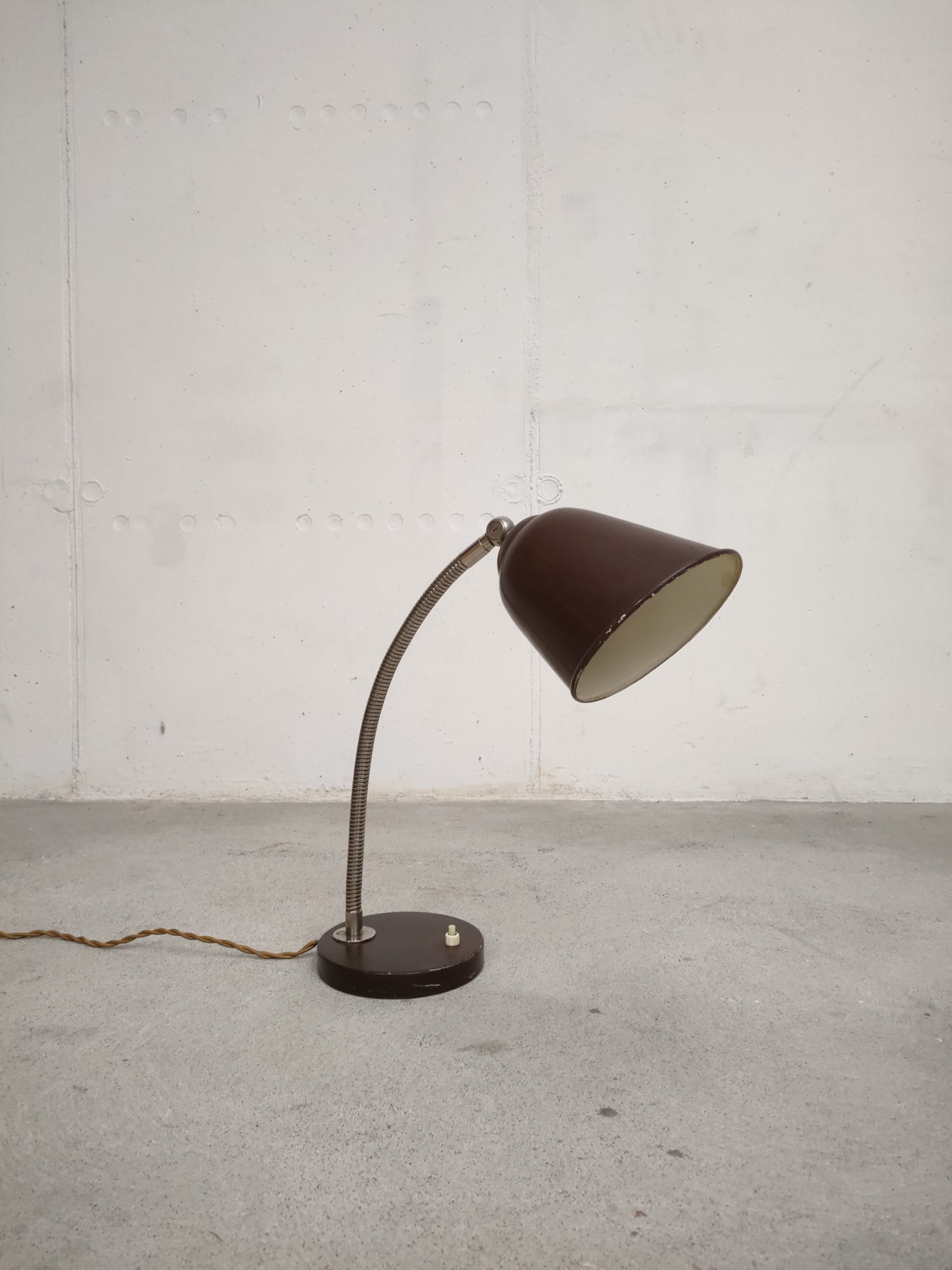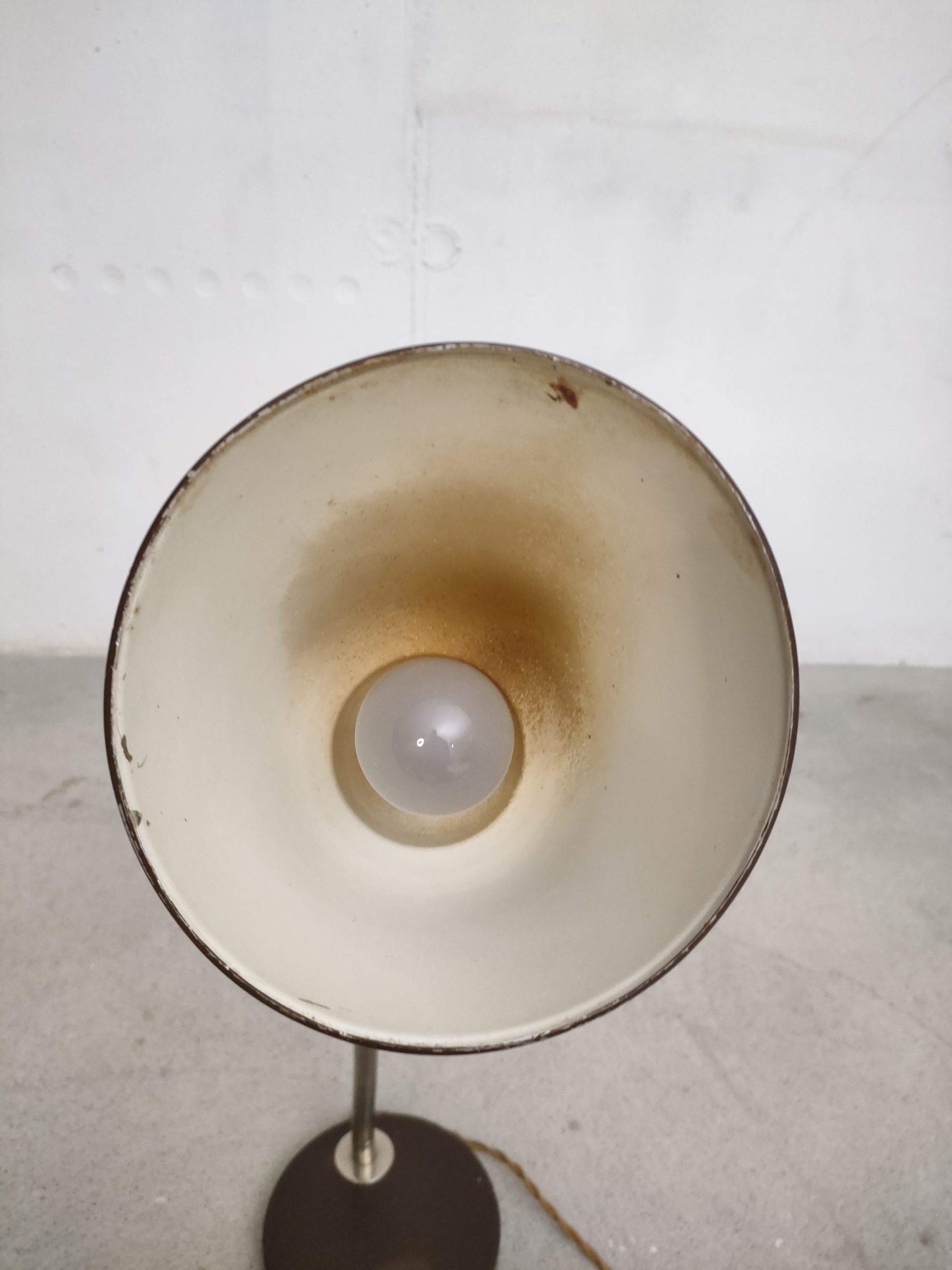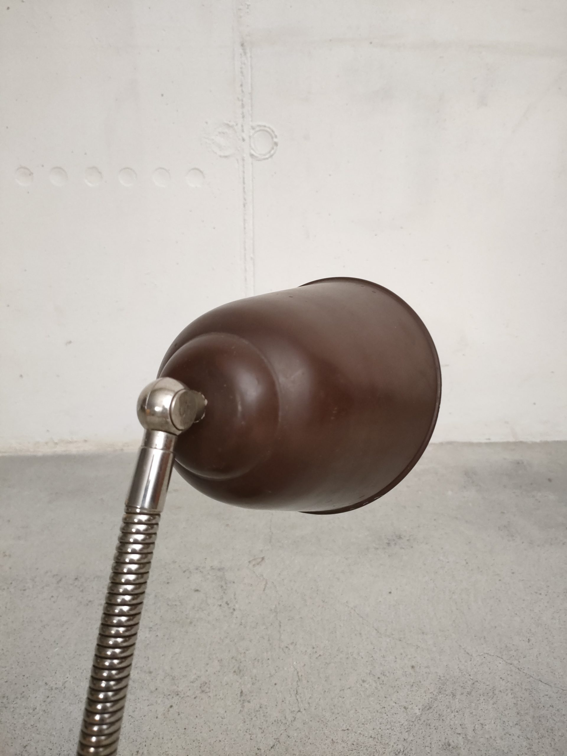 Produit venduLampe de table vintage avec socle et abat-jour en métal marron, flexible en métal chromé et interrupteur sur le socle. L’abat-jour peut être orienté en avant et en arrière. Quelques traces d’usure sur la le socle et à l’intérieur de l’abat-jour.