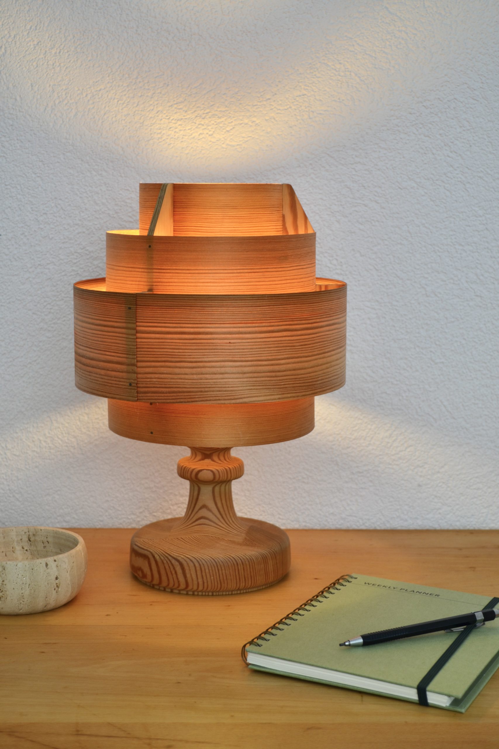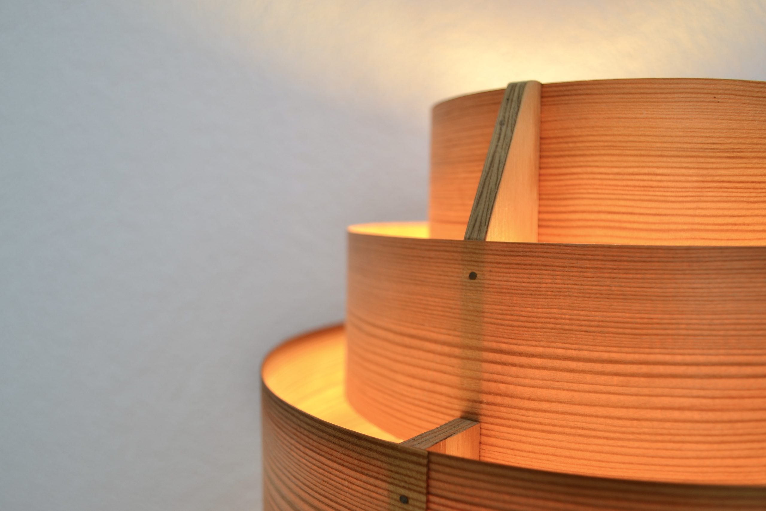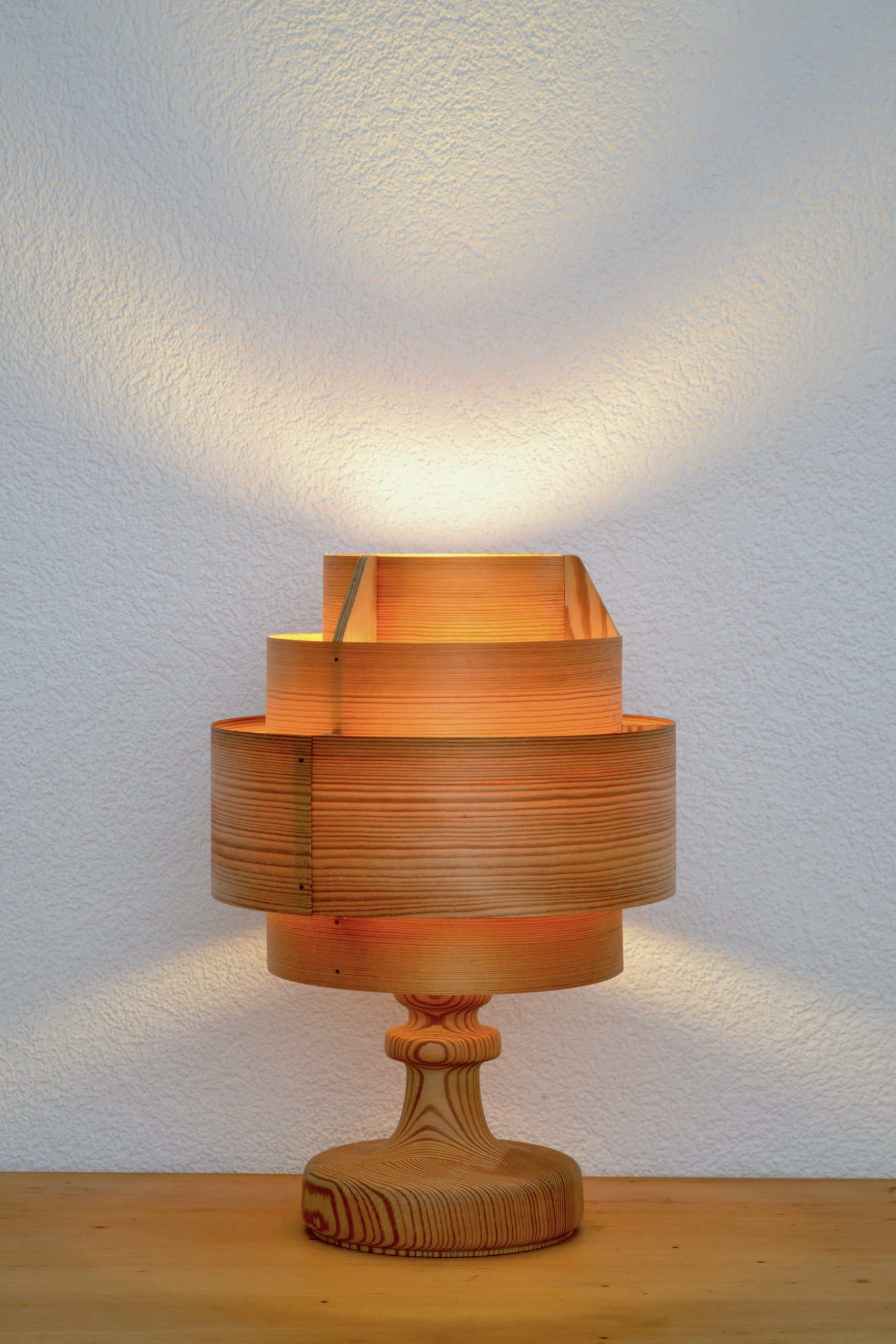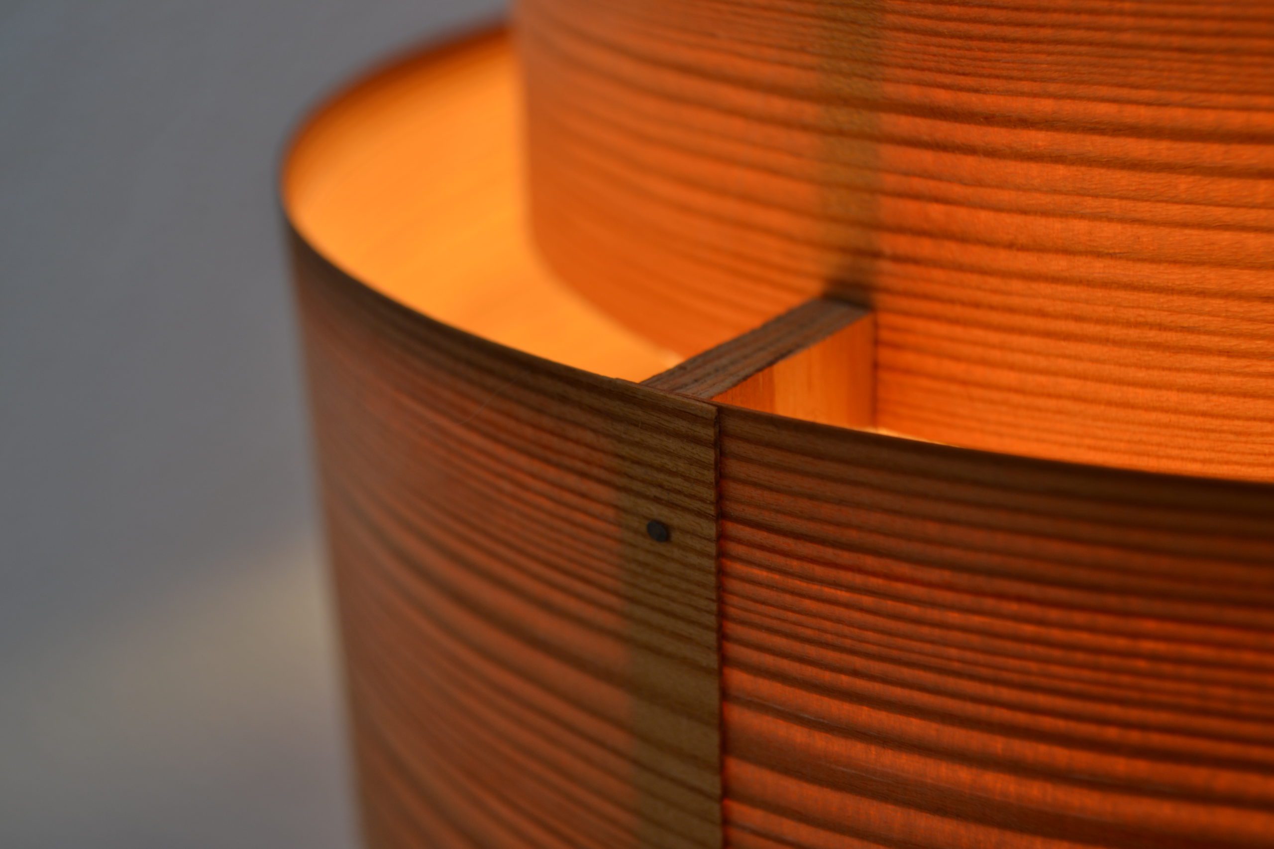 Lorsqu’elle s’illumine, le bois laisse transparaitre comme une lueur de feu de bois à travers ses cernes et diffuse par le haut et le bas une luminosité apaisante.