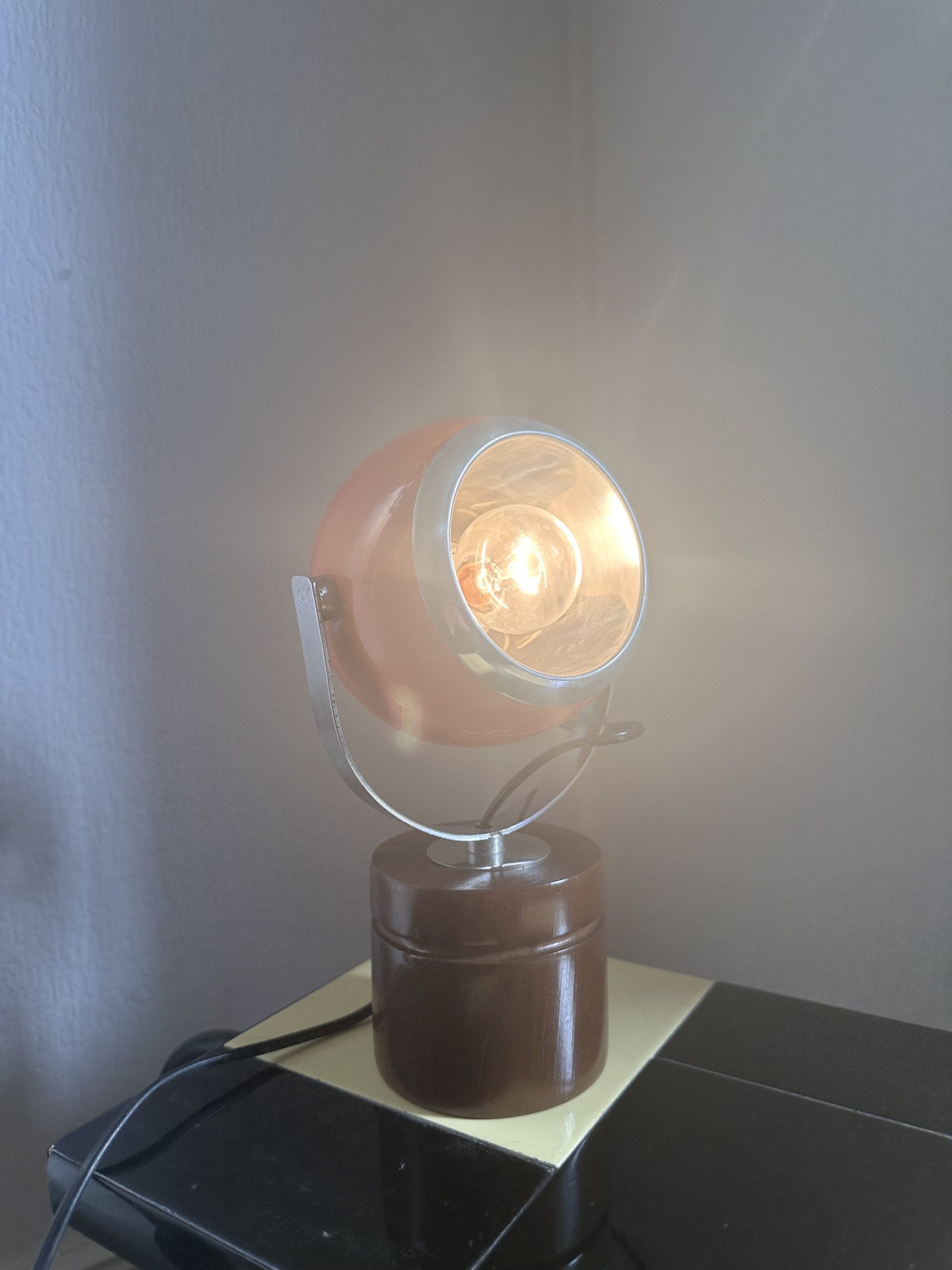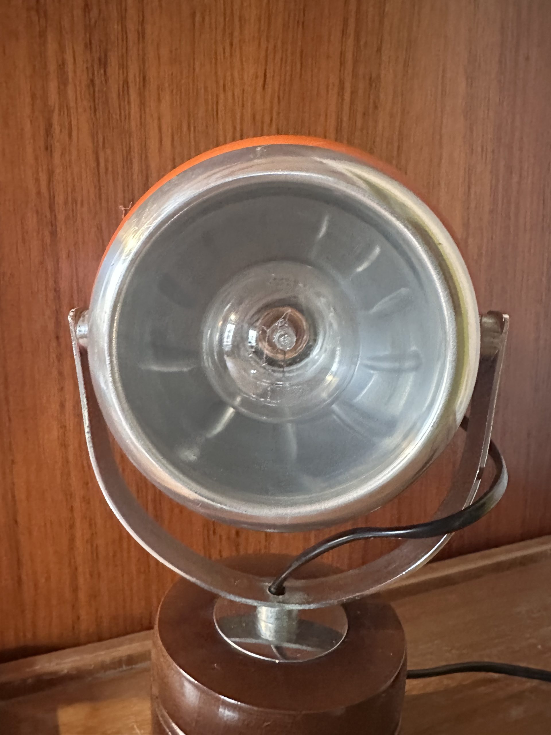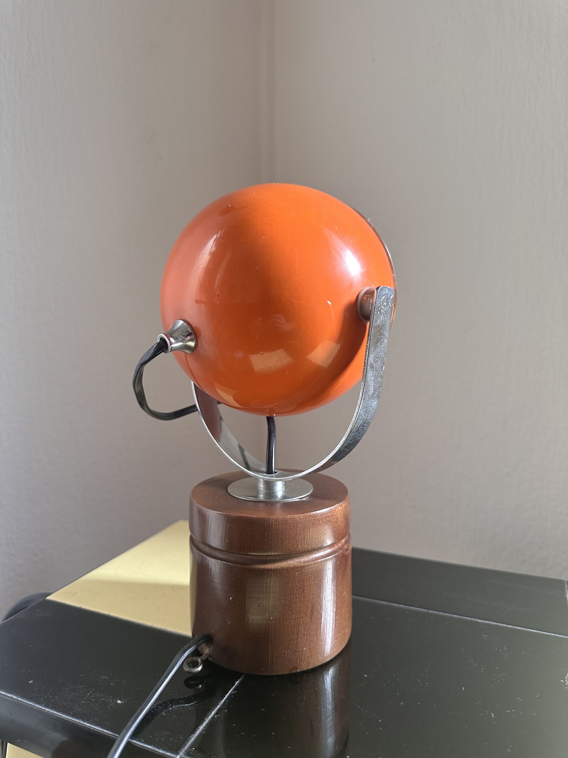 Produit venduIl s’agit d’une Lampe à poser “Eyeball” vintage de style “Space Age”, qui d’après mes recherches, a été fabriquée par Zonca avec un abat-jour sphérique orange et chrome, orientable et une base cylindrique marron en bois.