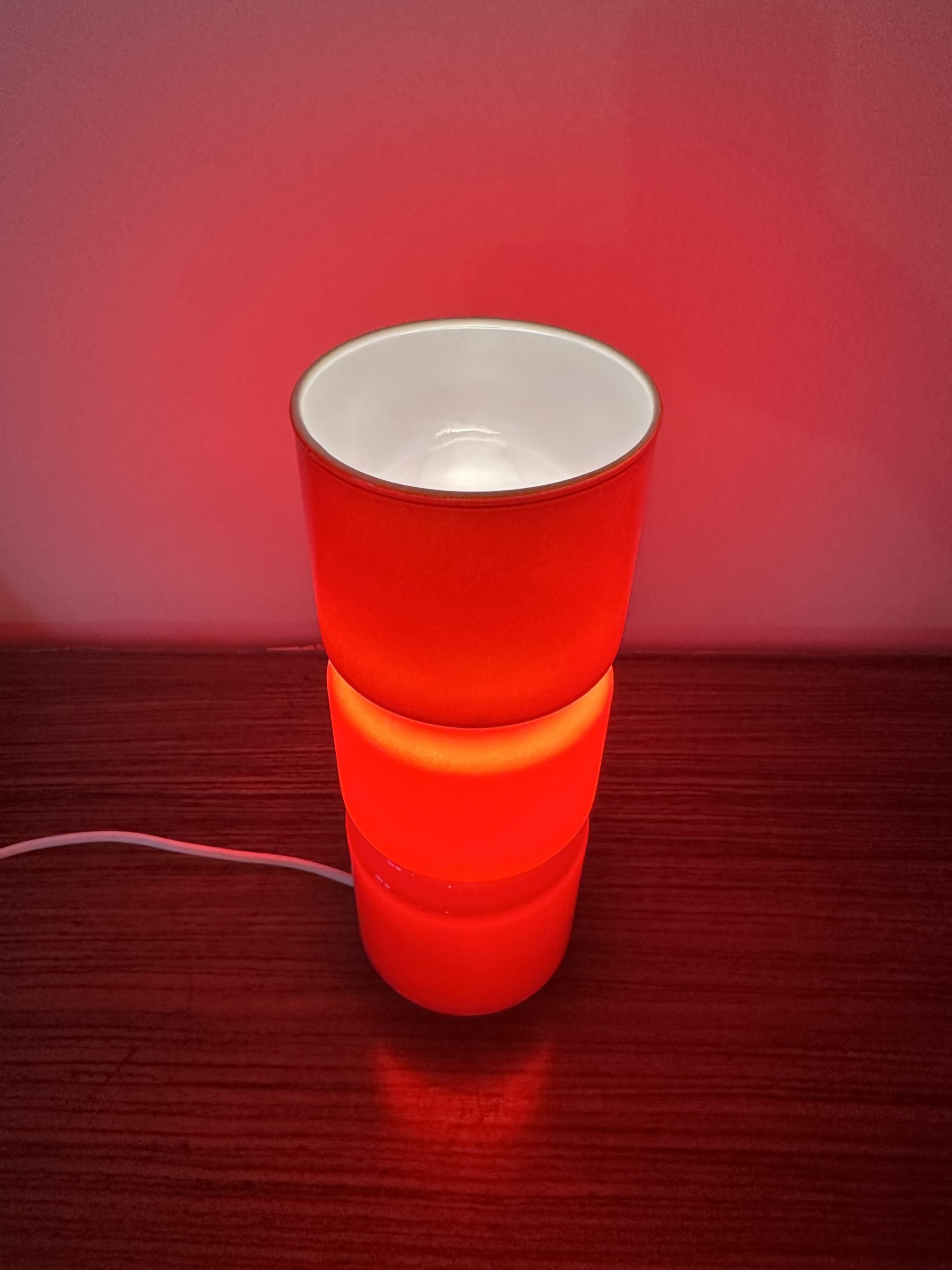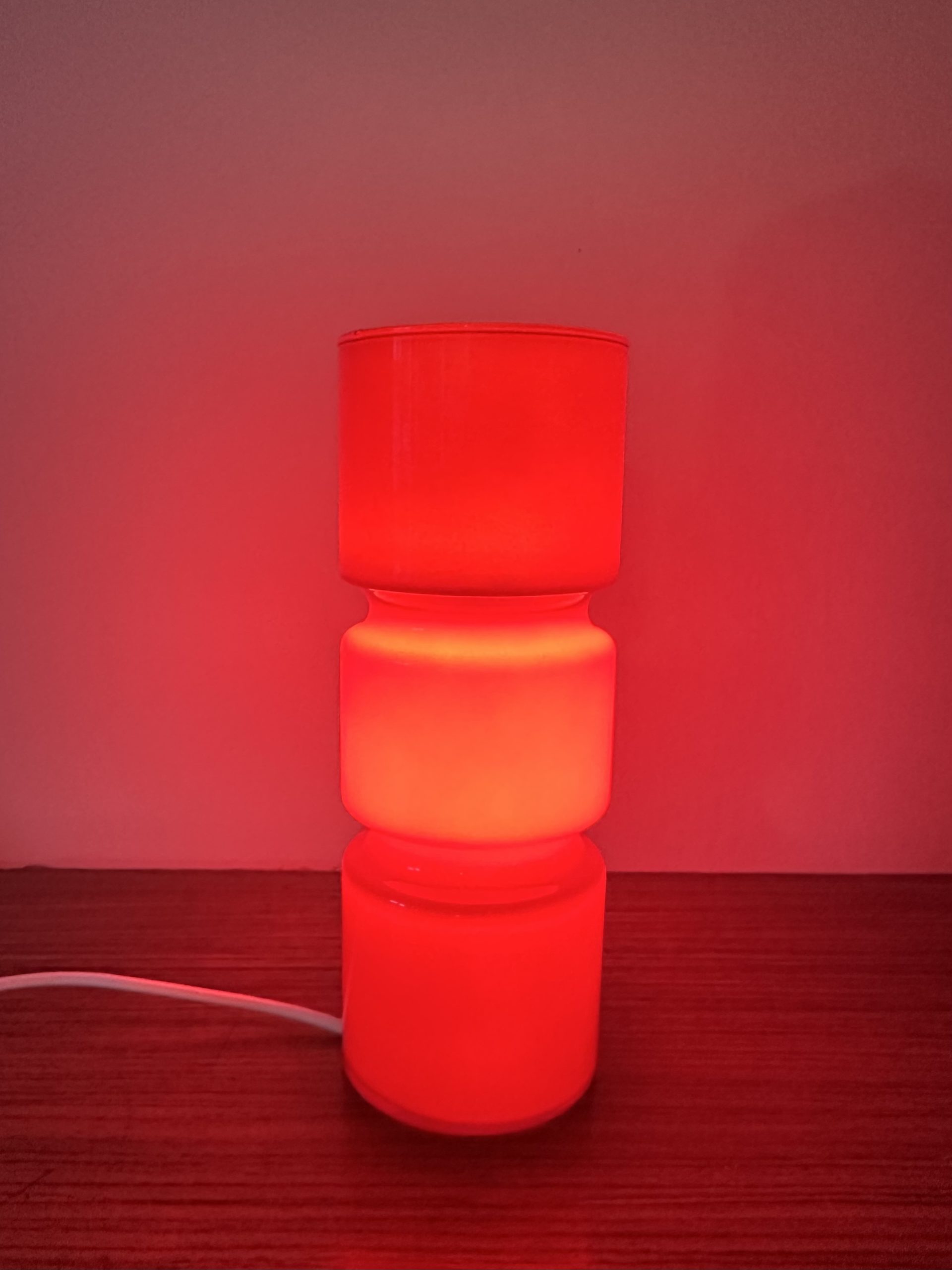 La forme est composée de volumes superposés, très graphique, avec une vraie présence sculpturale sur une table de chevet, une console, une étagère ou un bureau. La teinte rouge reste profonde même éteinte, et la diffusion est homogène grâce à l’opaline interne.