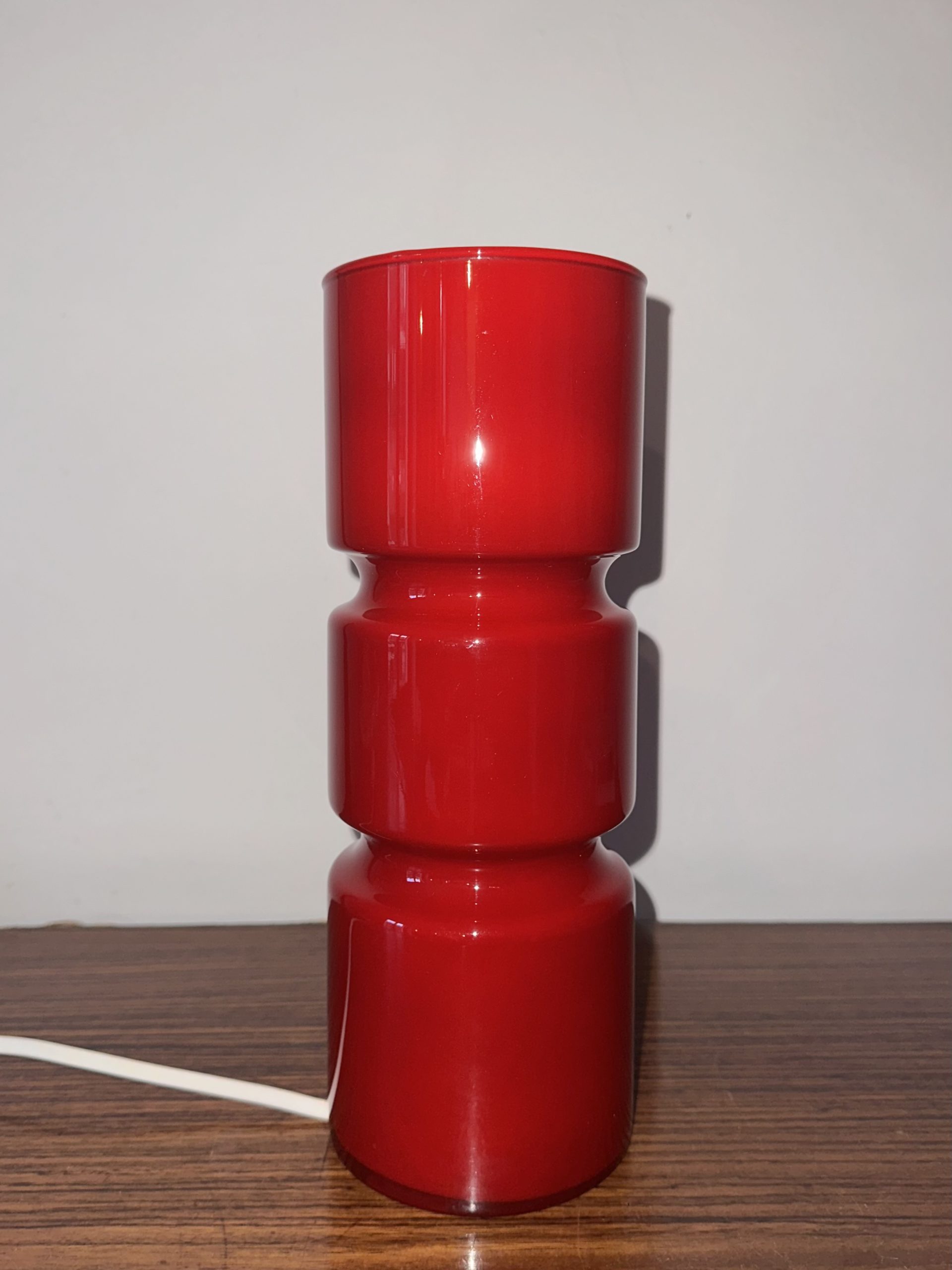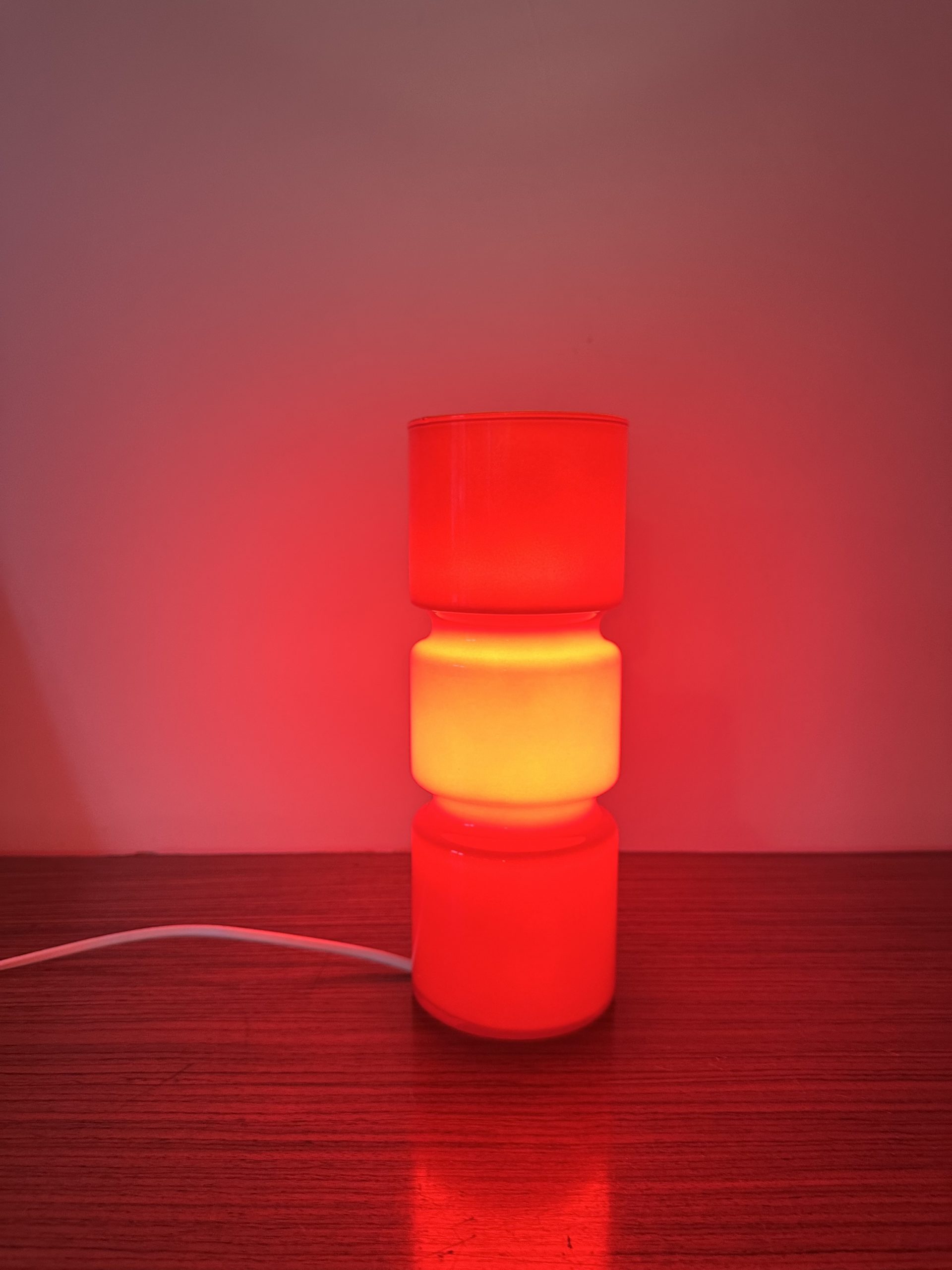 Lampe à poser vintage Fitz pour Habitat, fabriquée en Pologne dans les années 80-90. Modèle en verre rouge à l’extérieur et blanc opalin à l’intérieur, ce qui donne une lumière douce, chaude et très diffuse une fois allumée.