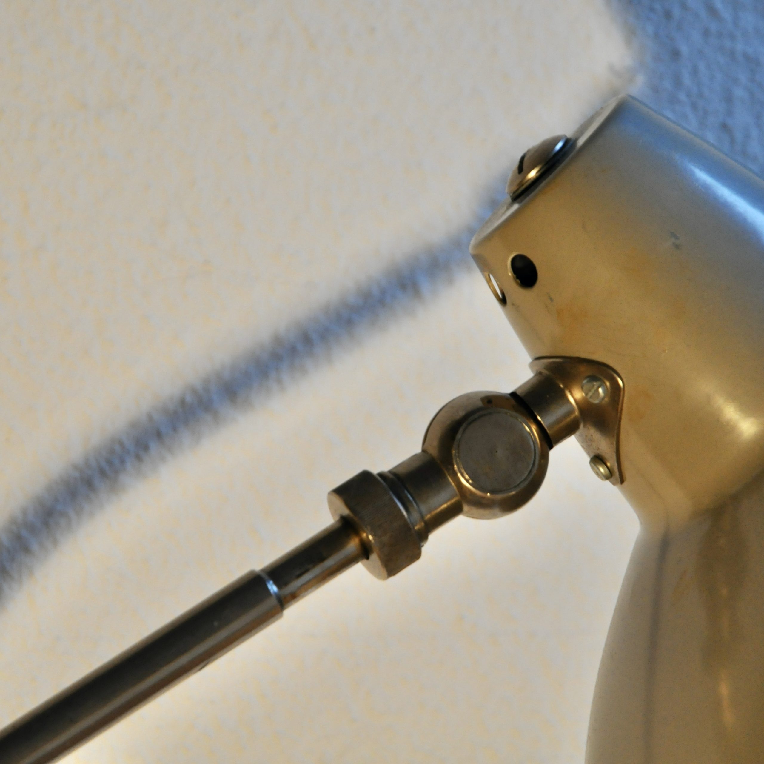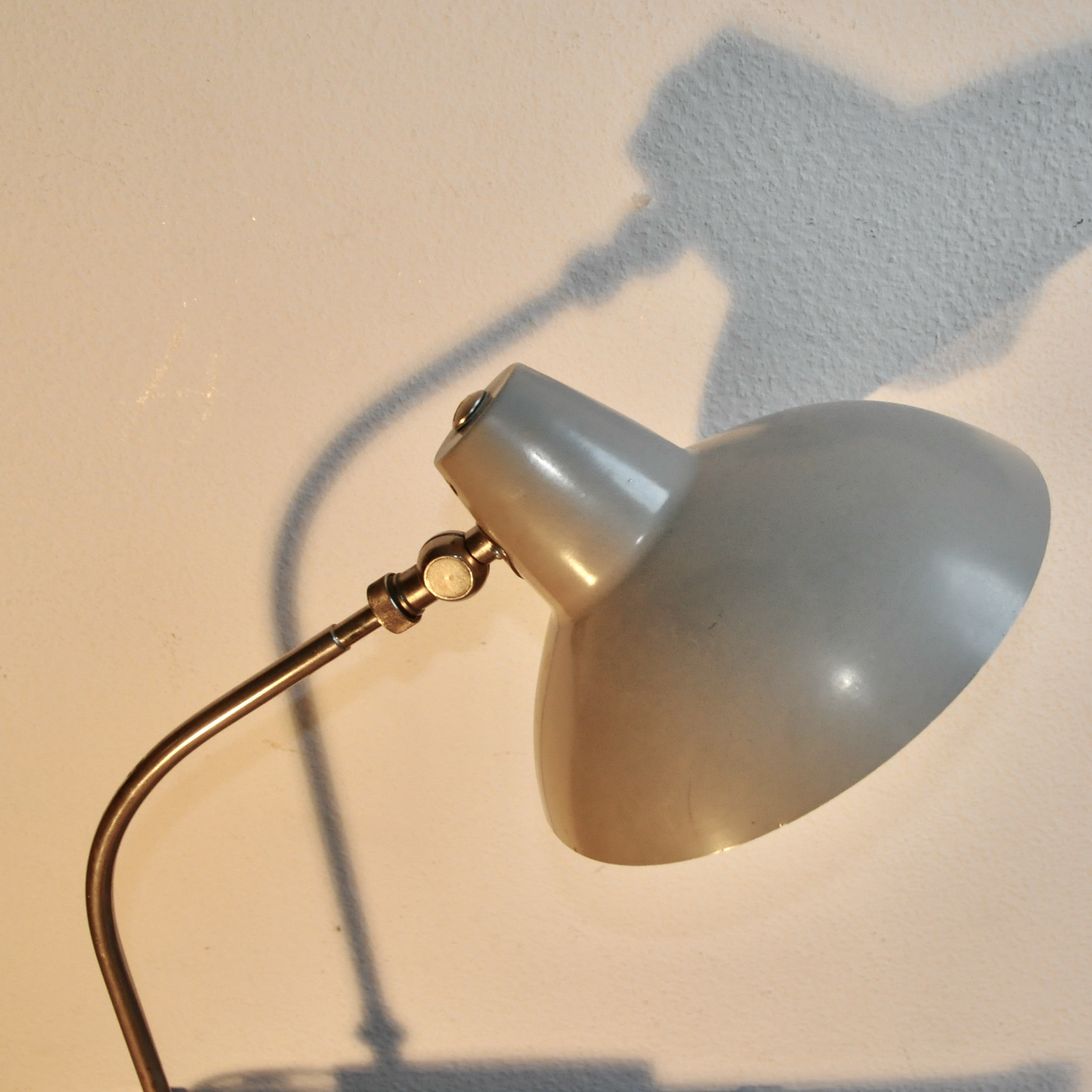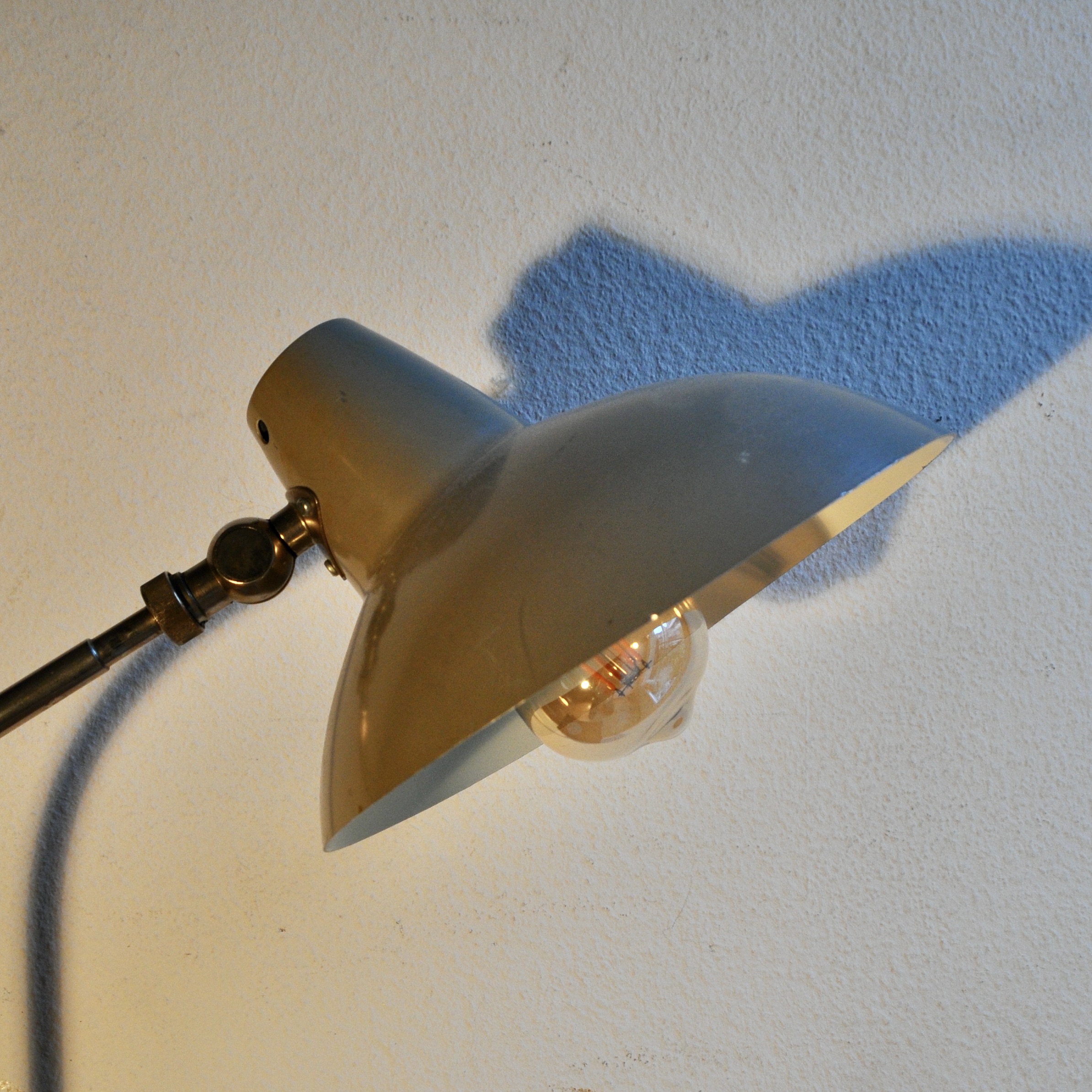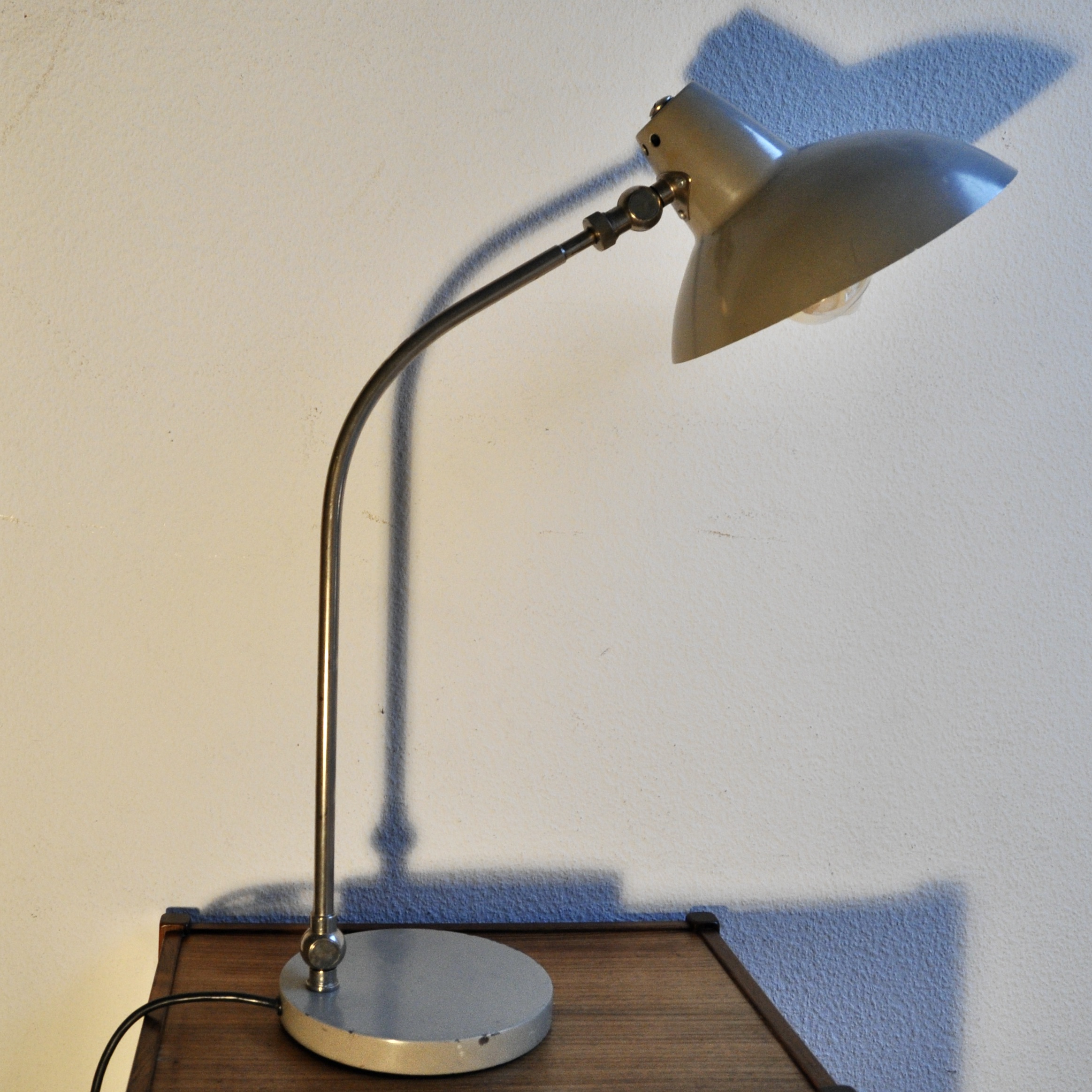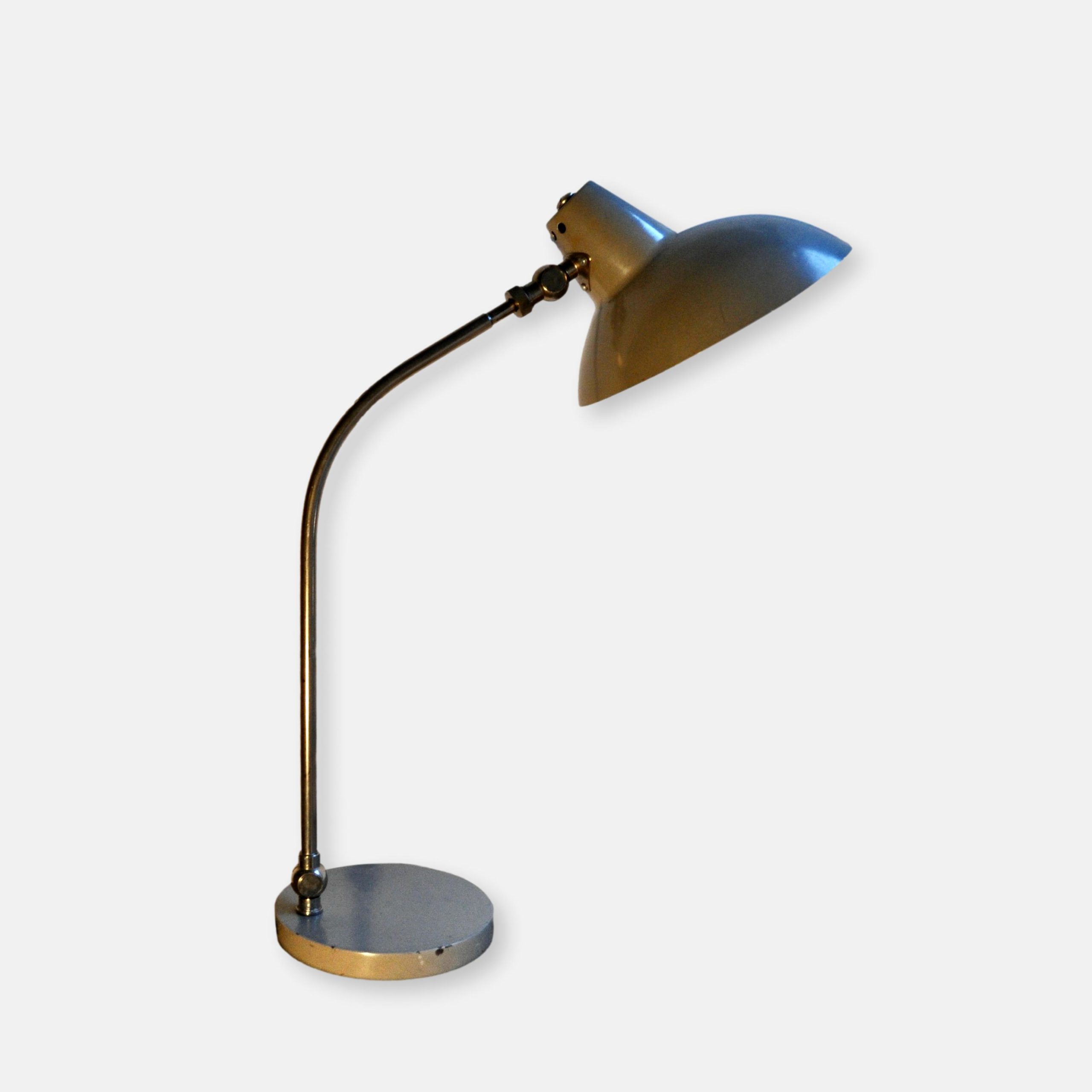 Lampe de bureau de type bauhaus du designer H.TH.J.A Busquet pour Hala Zeist datant des années 50-60. Ce modèle en métal chromé et en métal peint de couleur beige possède deux rotules de réglage. La peinture de l’abat-jour est légèrement mate à deux endroits mais l’ensemble est en bel état et fonctionne parfaitement.