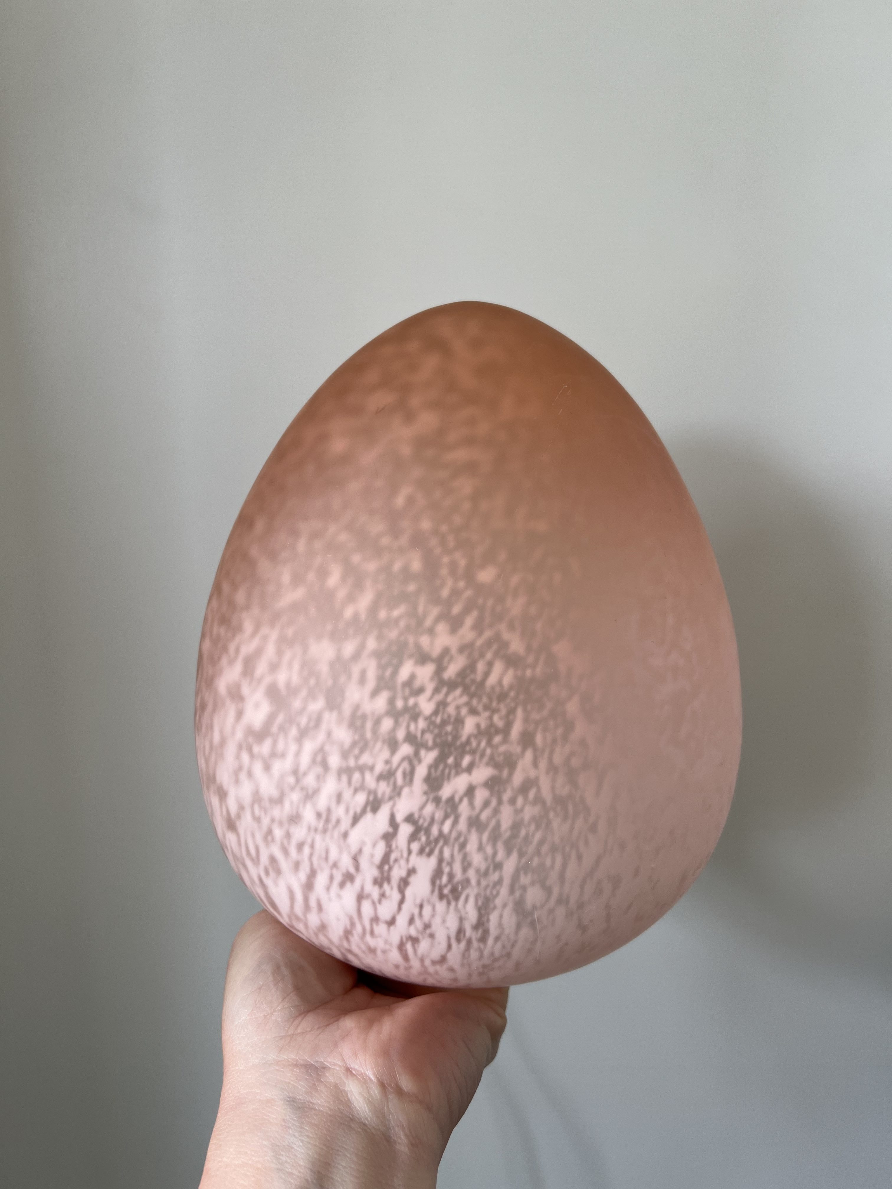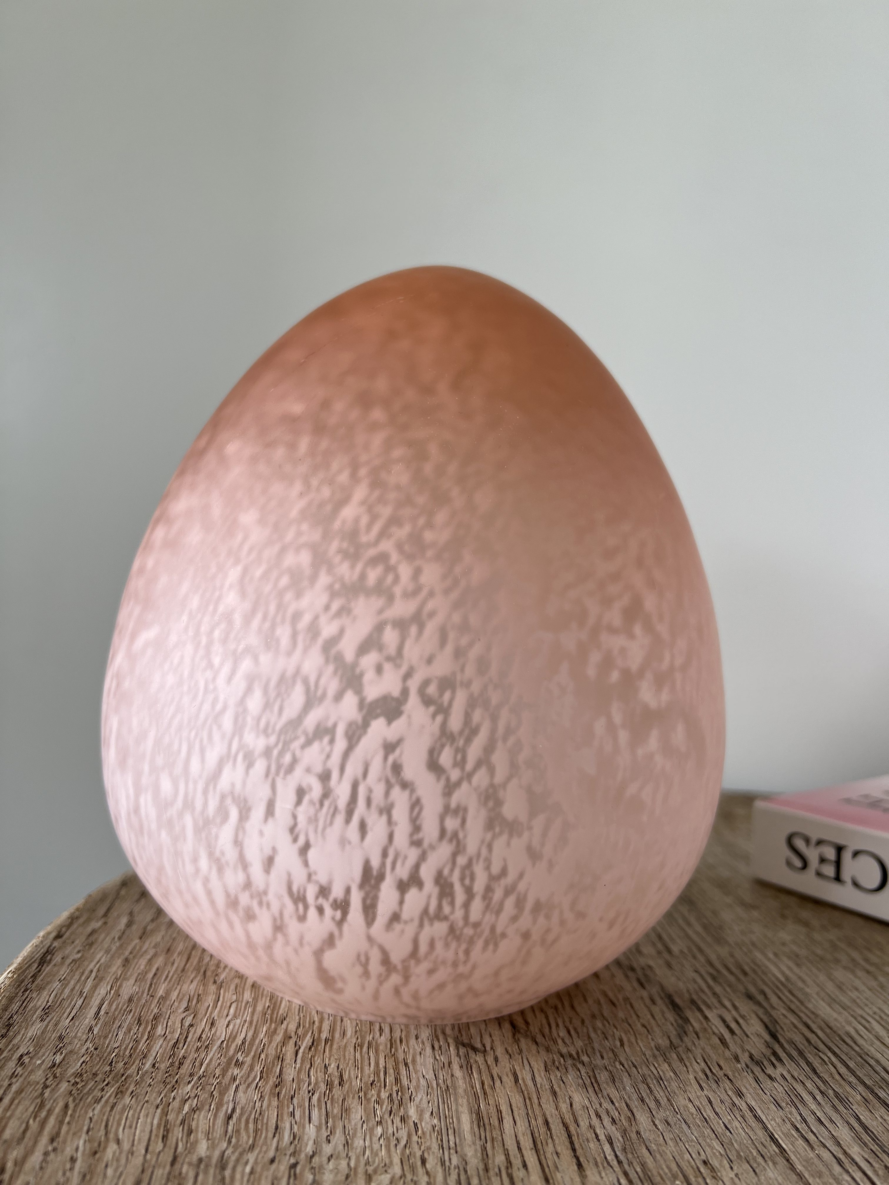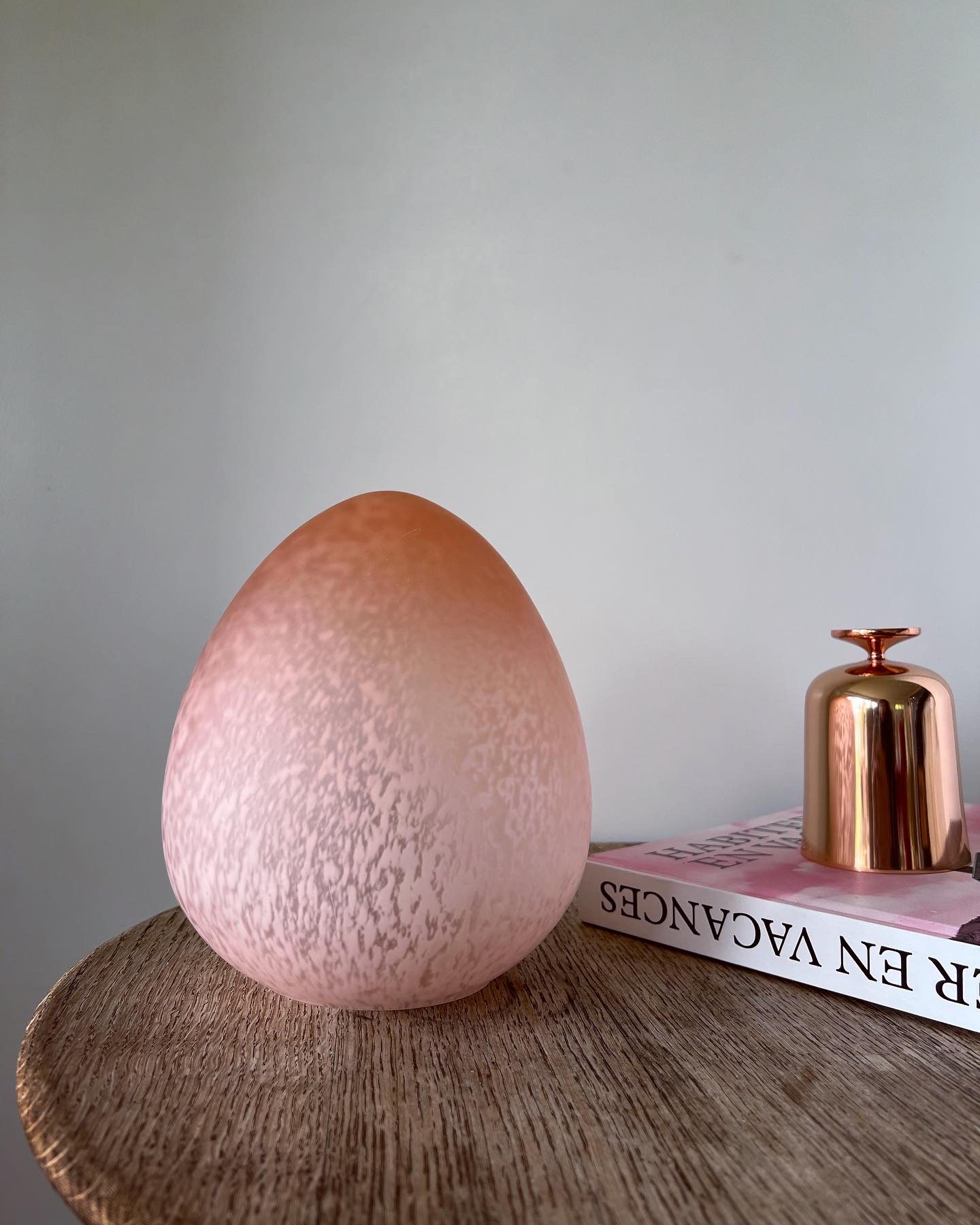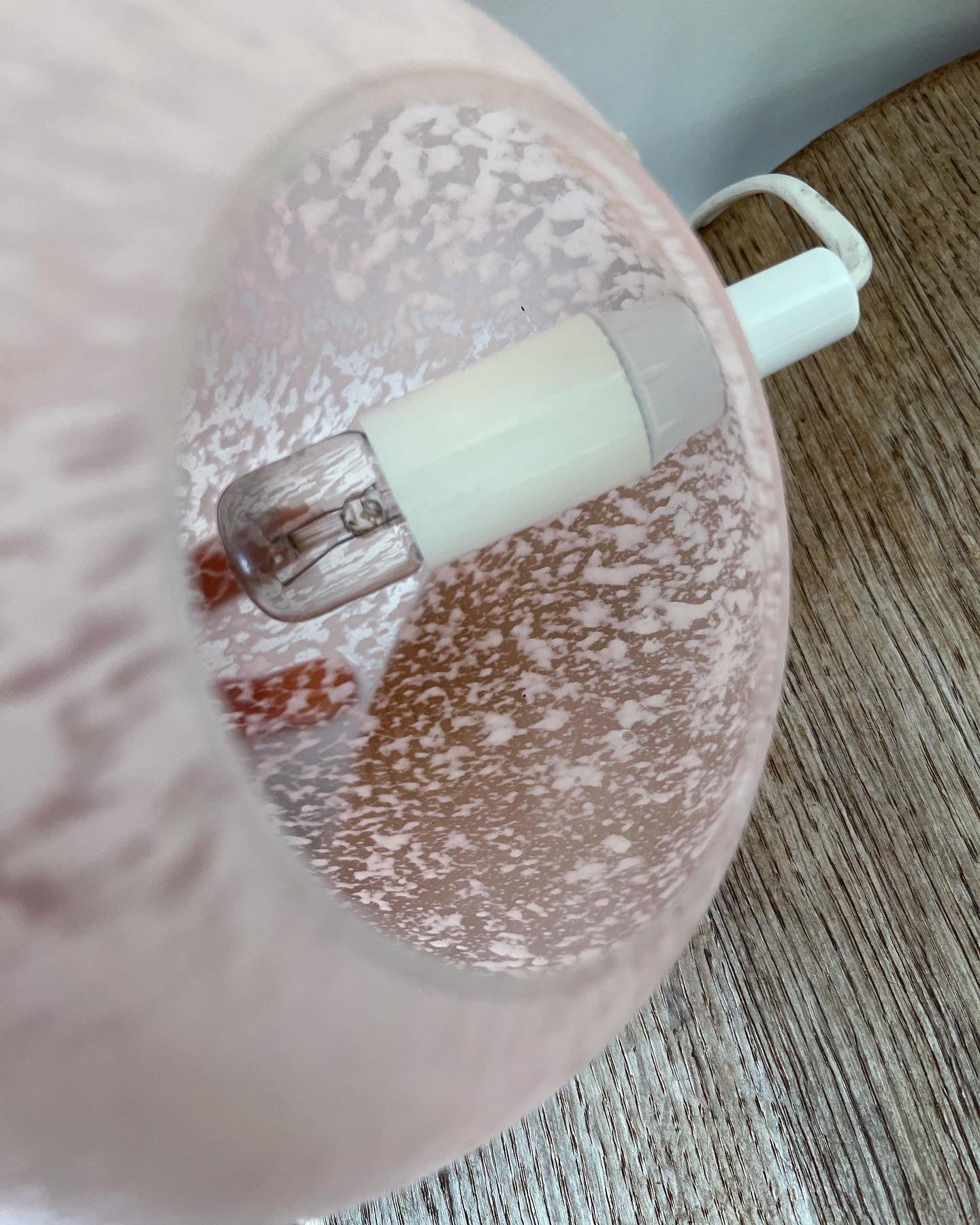 La lampe est faite en verre, coloré rose. Effet moucheté.