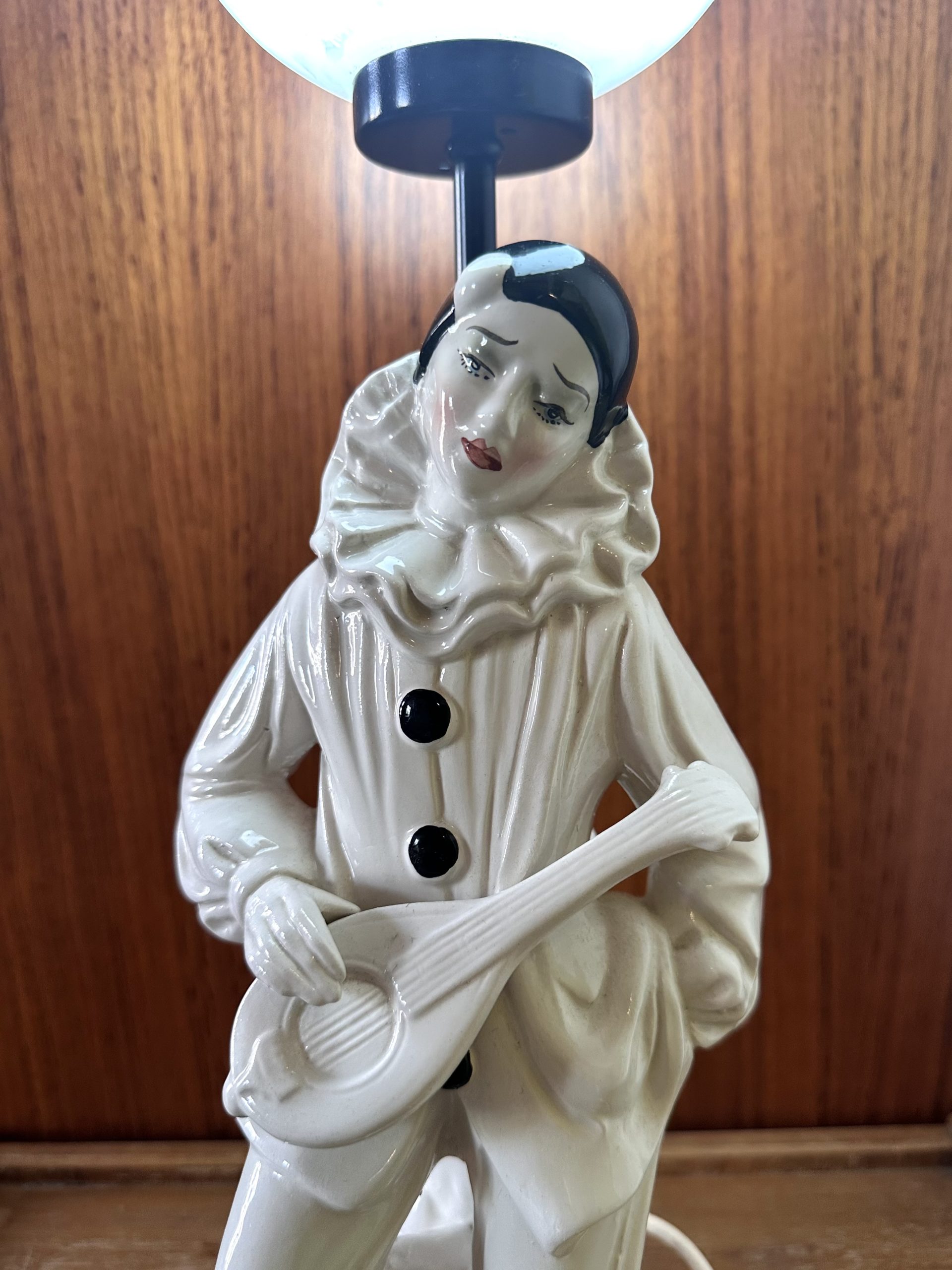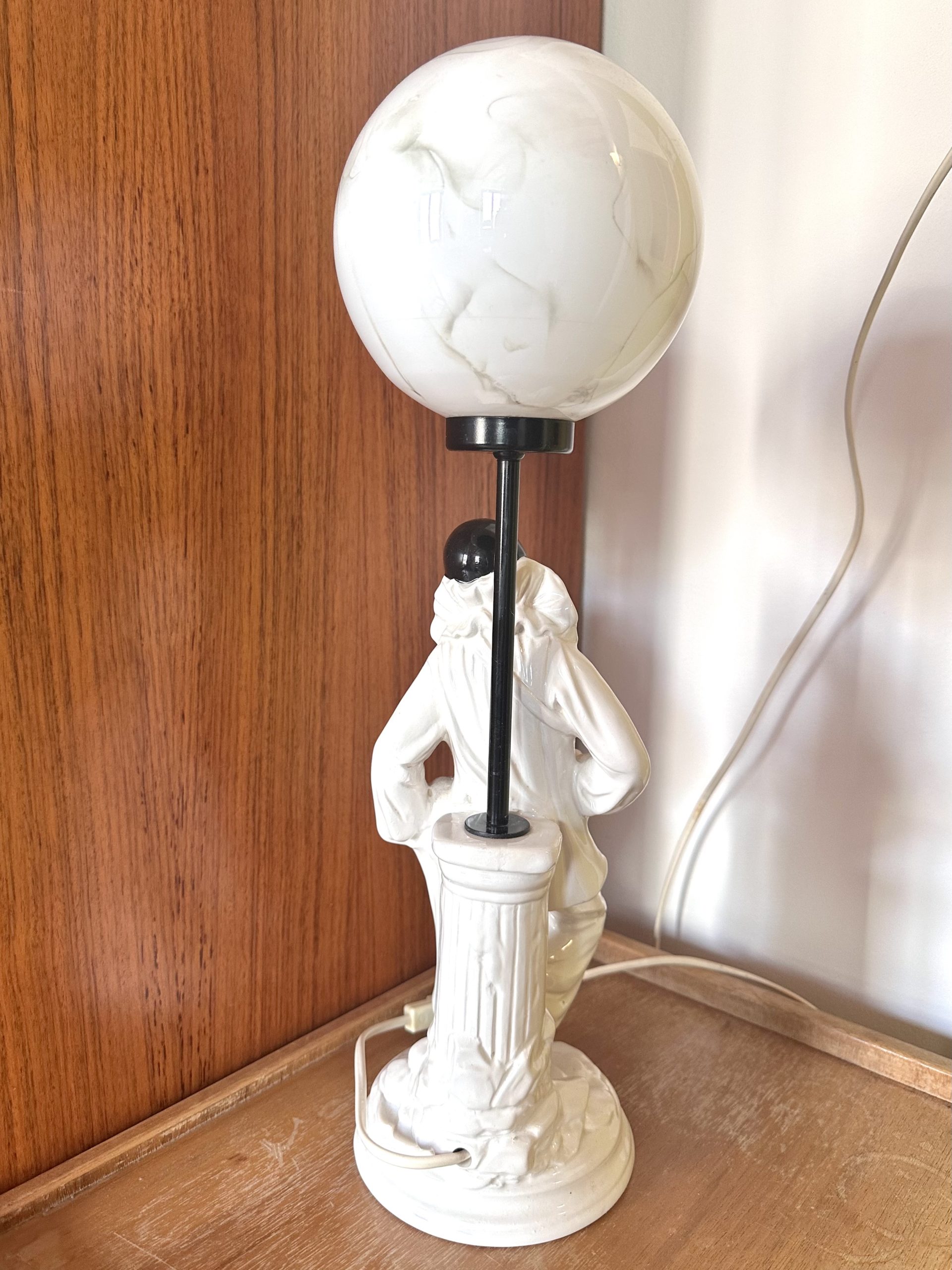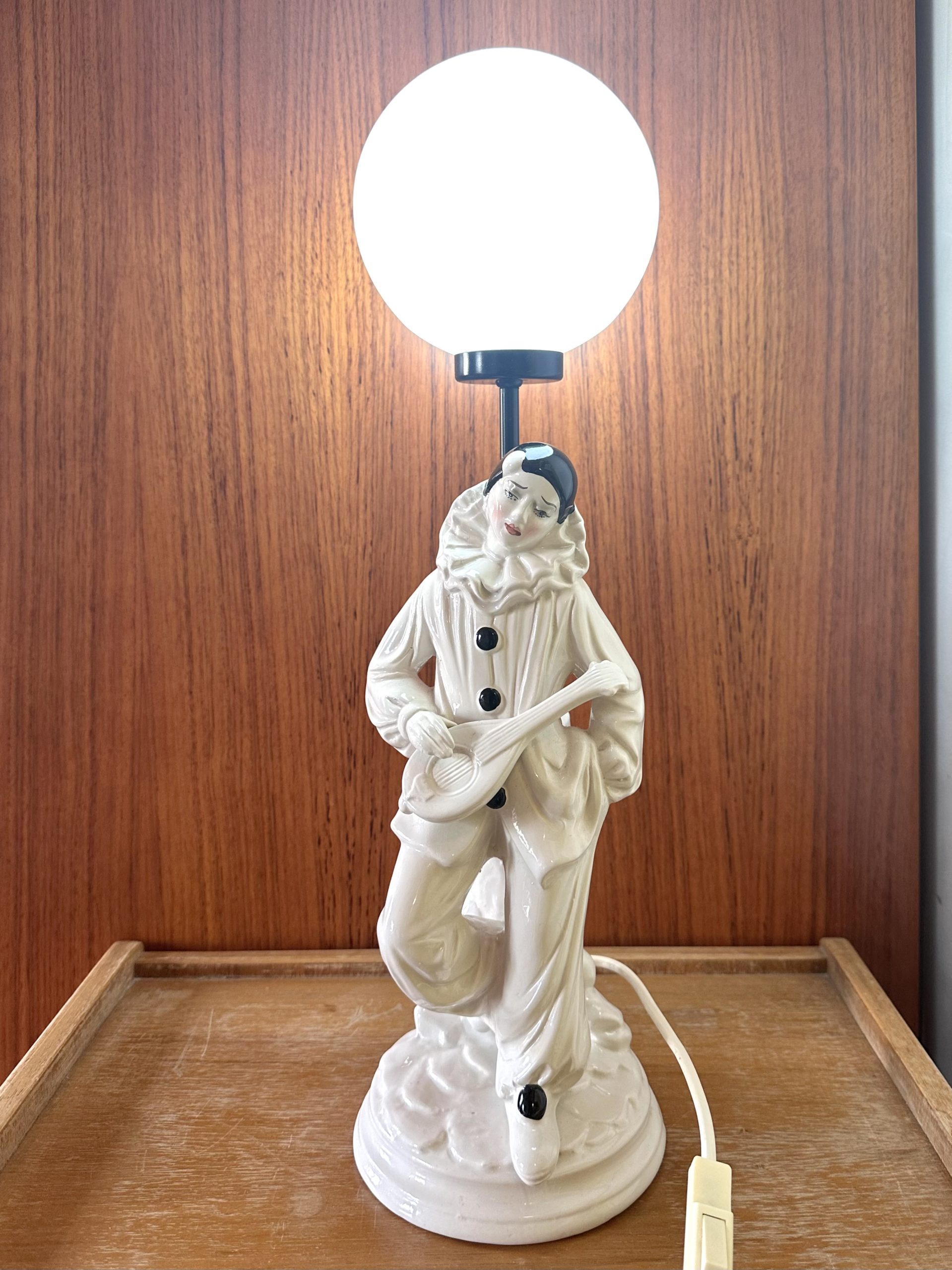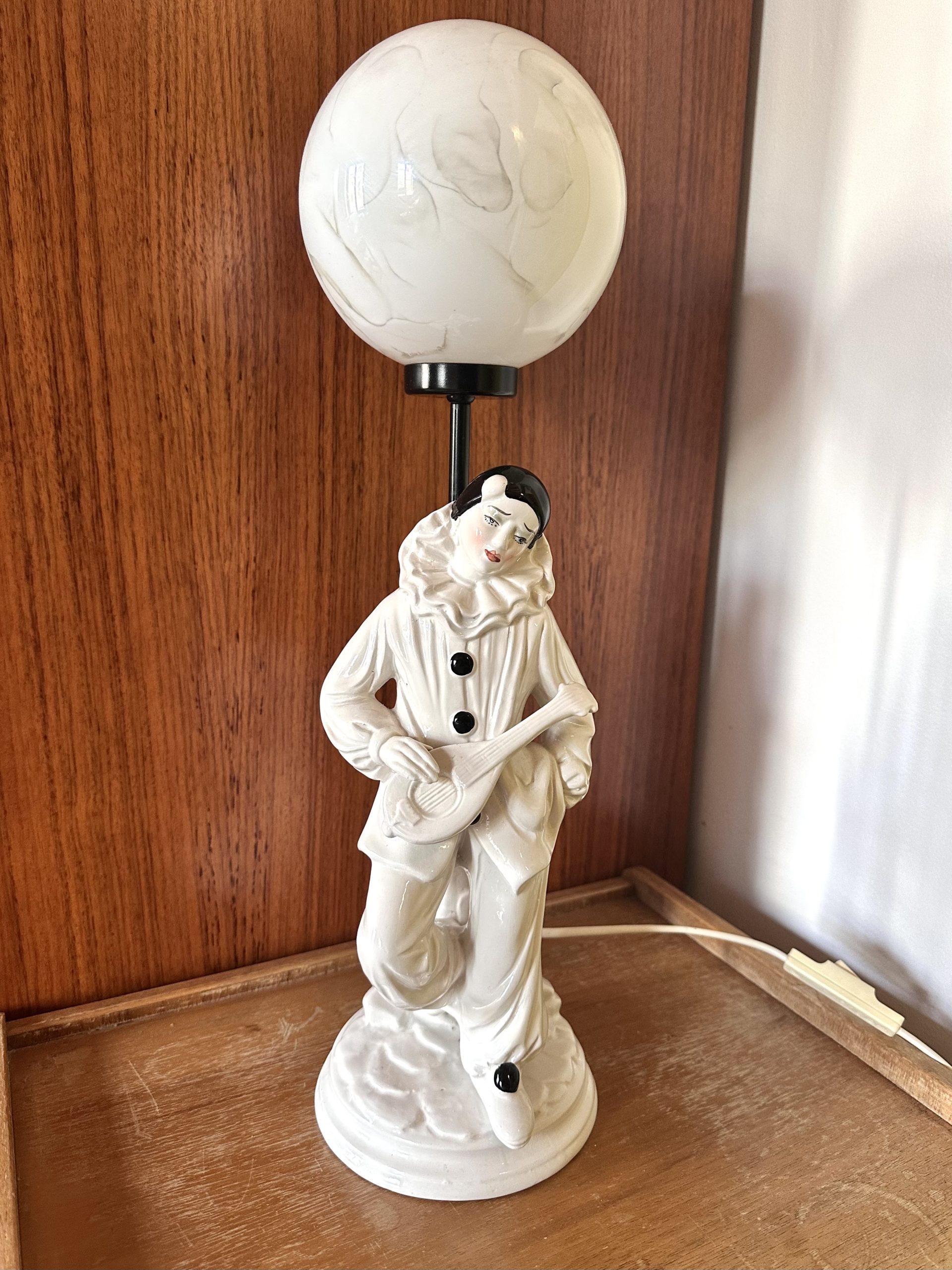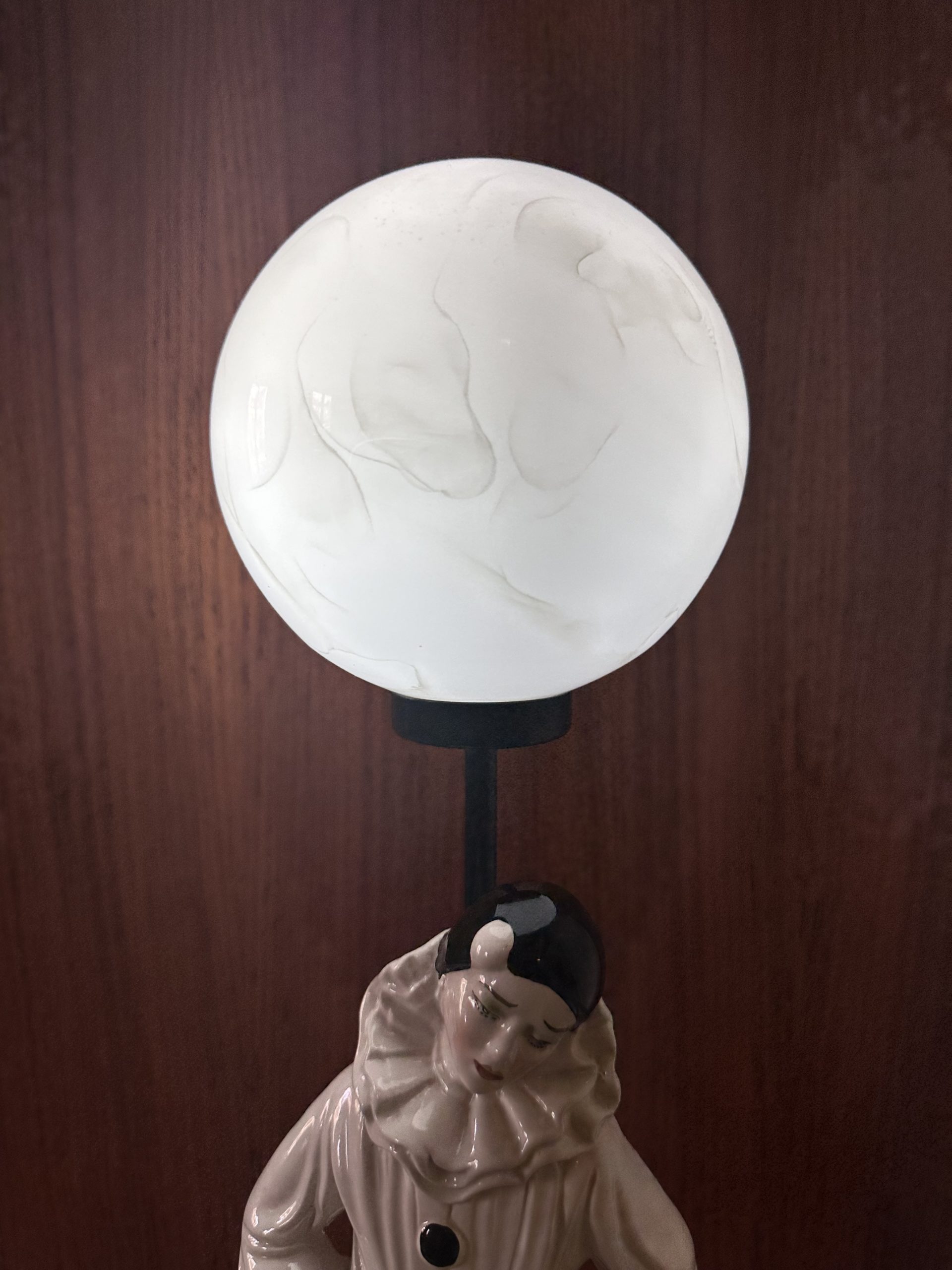 Il s’agit d’une lampe vintage avec un Pierrot et une lune en verre. J’imagine qu’elle date des années 70-80 et sa lumière est douce et d’ambiance. Elle est en super état et n’a pas de défaut, on peut juste noter un léger jaunissement du cordon électrique.