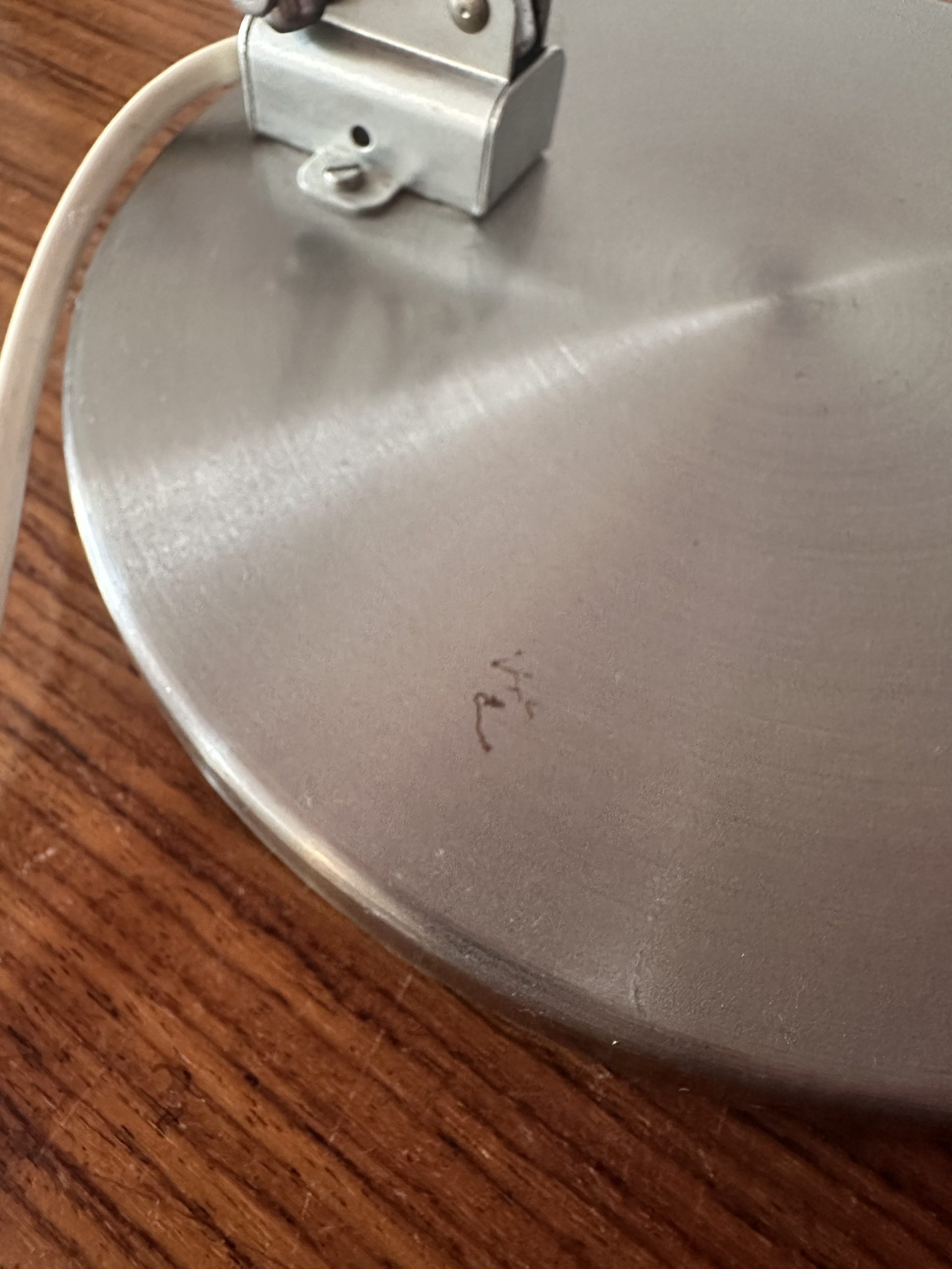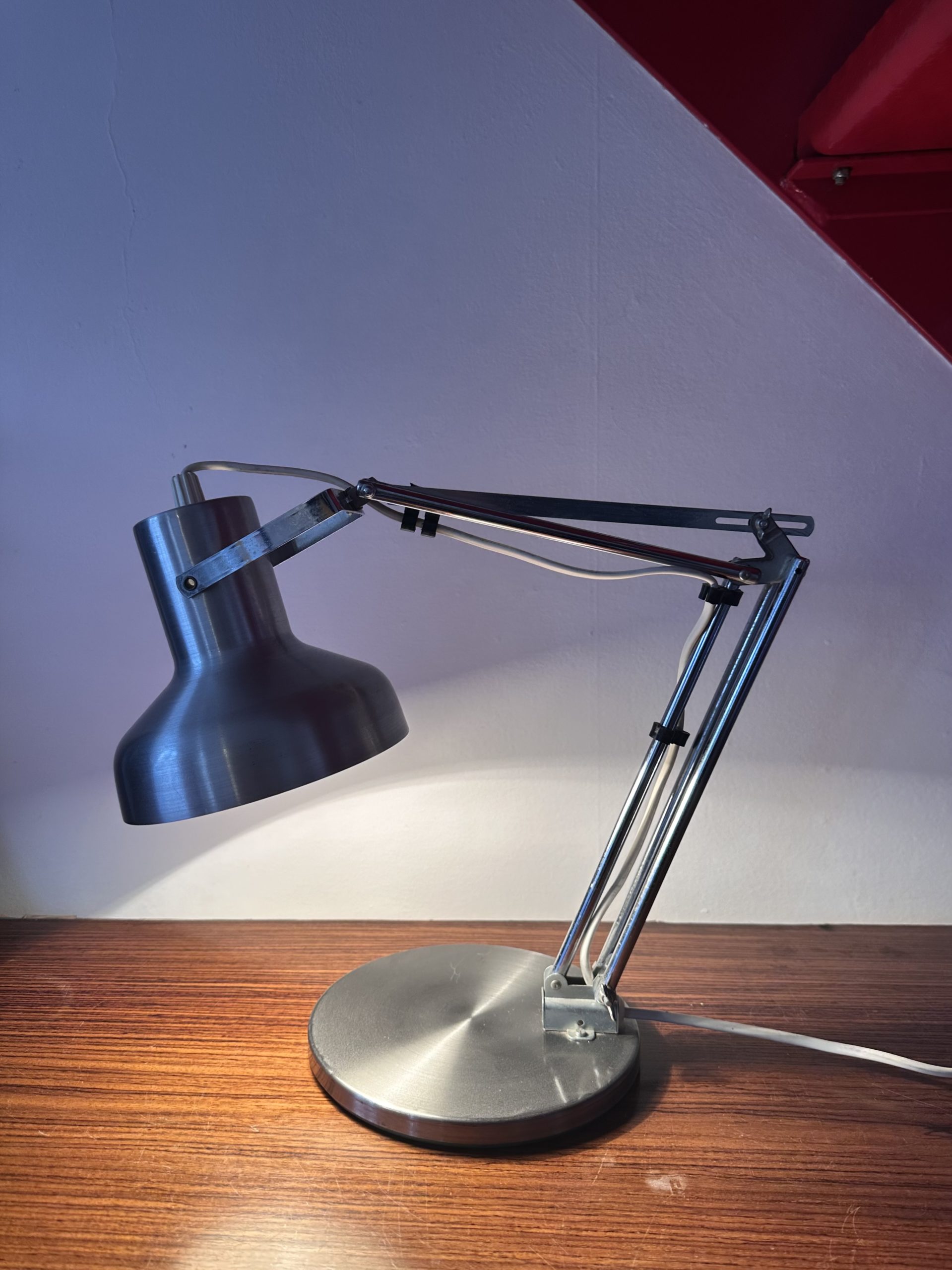 Produit venduIl s’agit d’une très jolie lampe chromée à poser et articulable qui date de 1970. Elle est en bon état, on peut juste noter que le métal est légèrement oxydé à certains endroits.