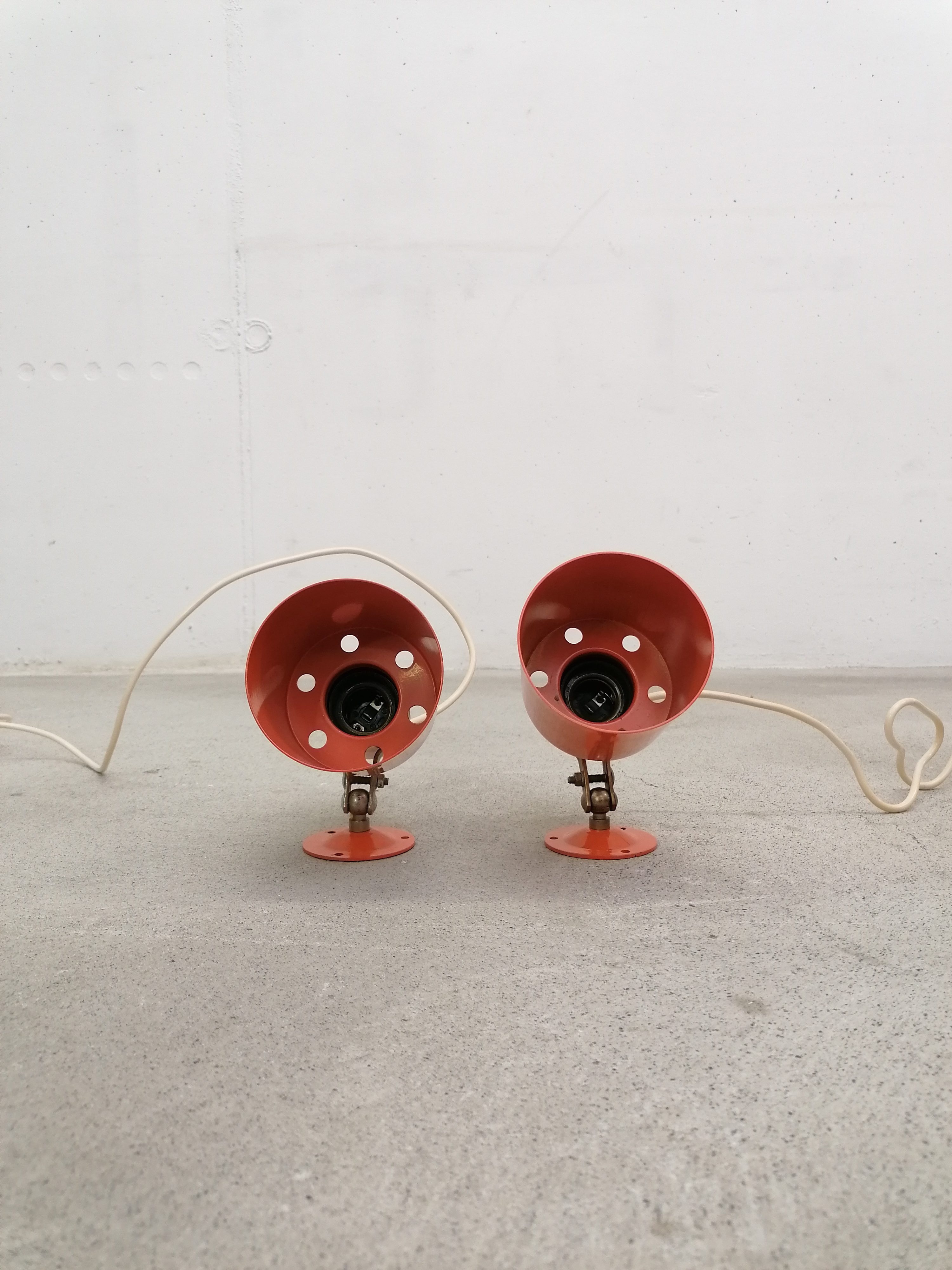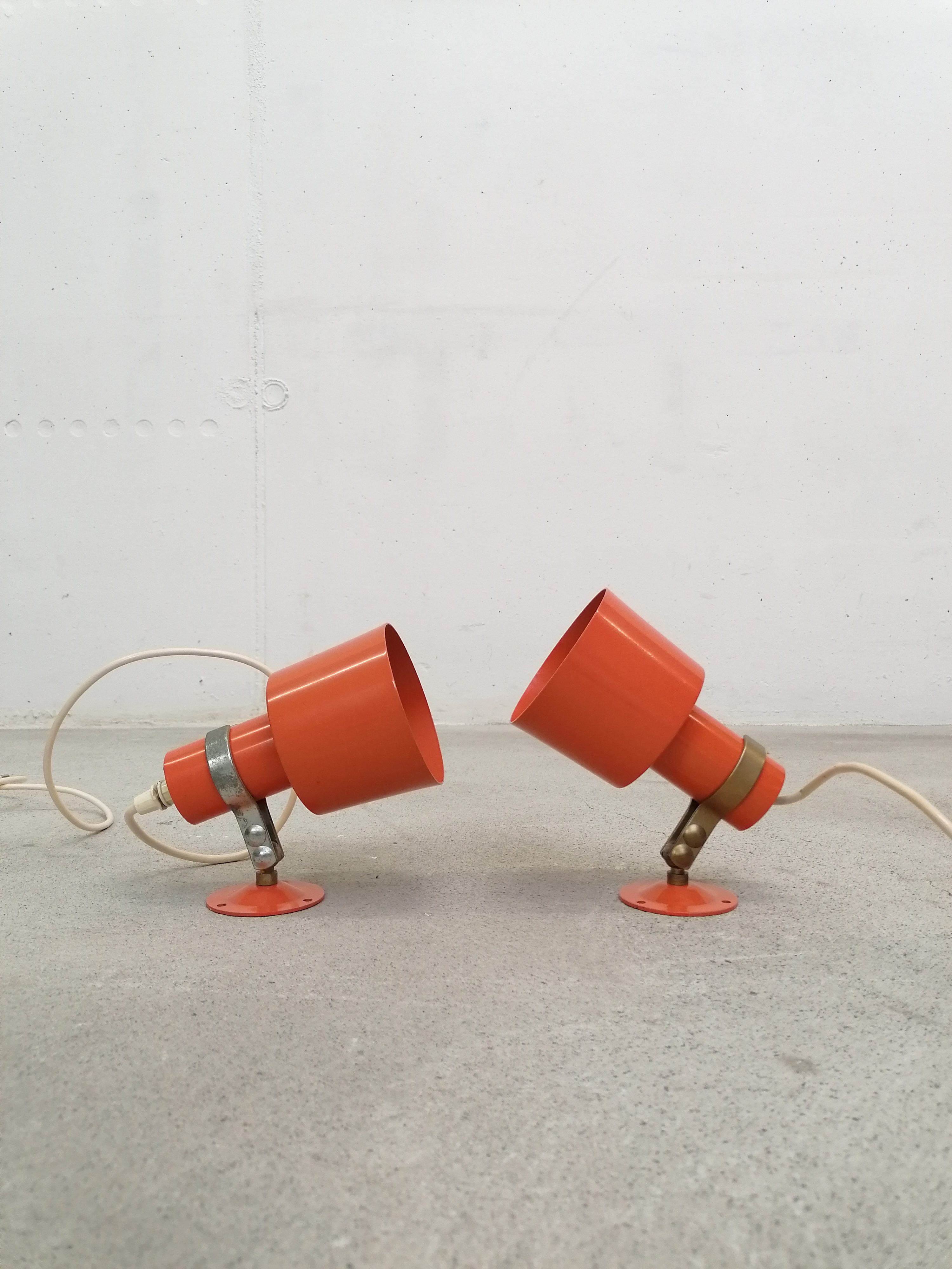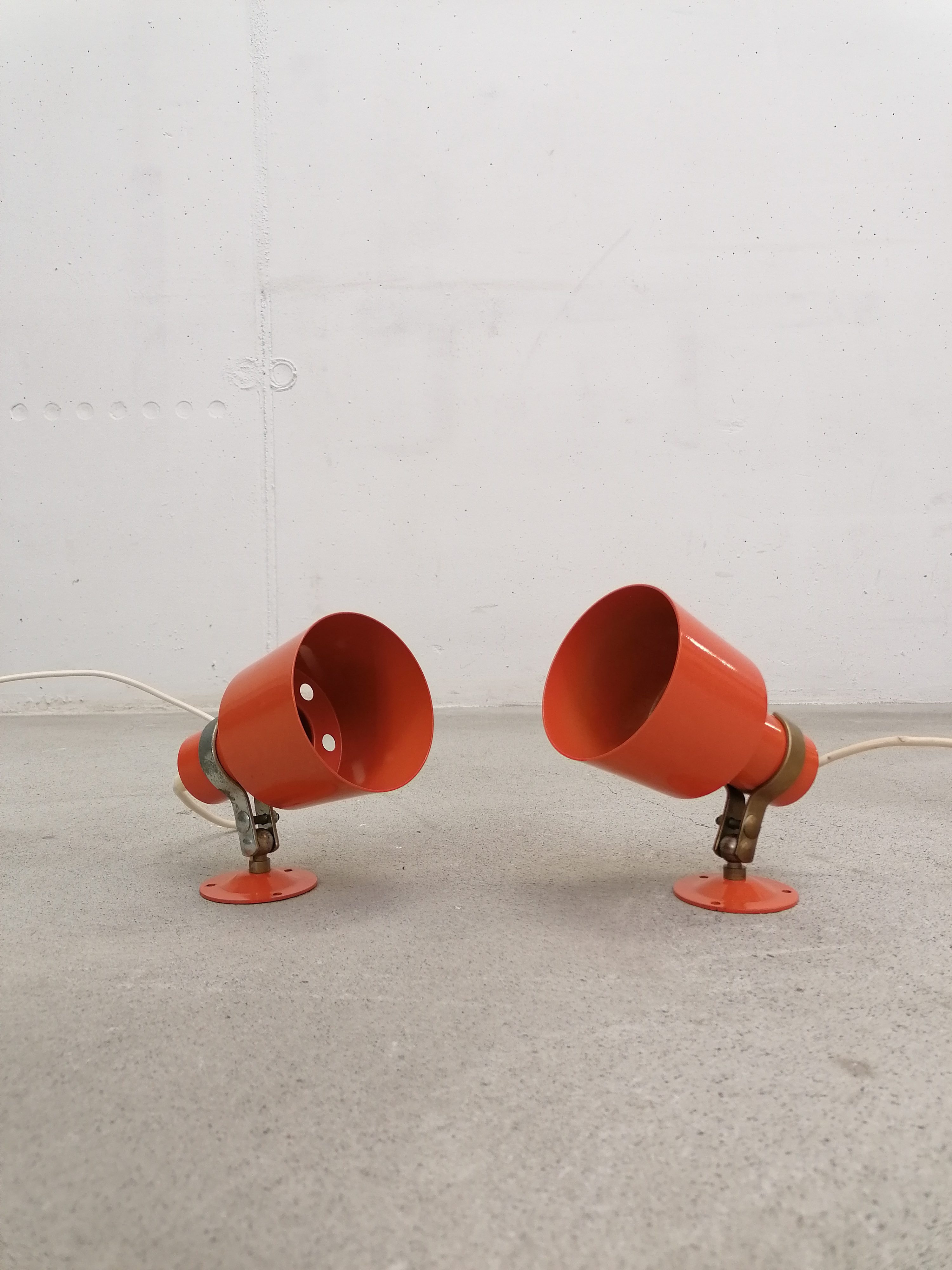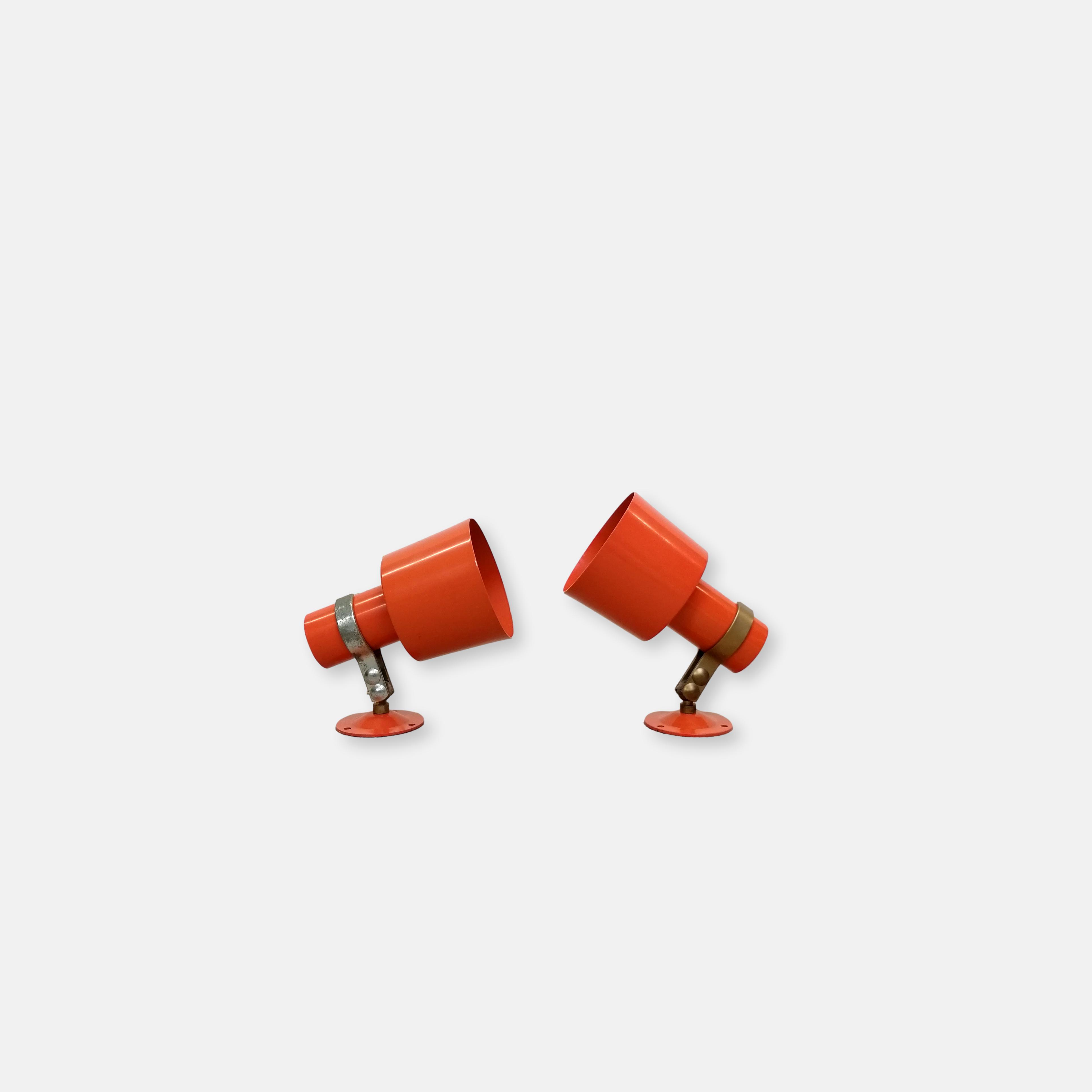 Paire de lampes vintage en métal orange. Les lampes peuvent être fixées au mur comme des appliques mais elles peuvent aussi être utilisées comme lampes de table ou de chevet simplement posées (sans besoin de les fixer). Quelques traces en particulier sur la structure en métal argenté.