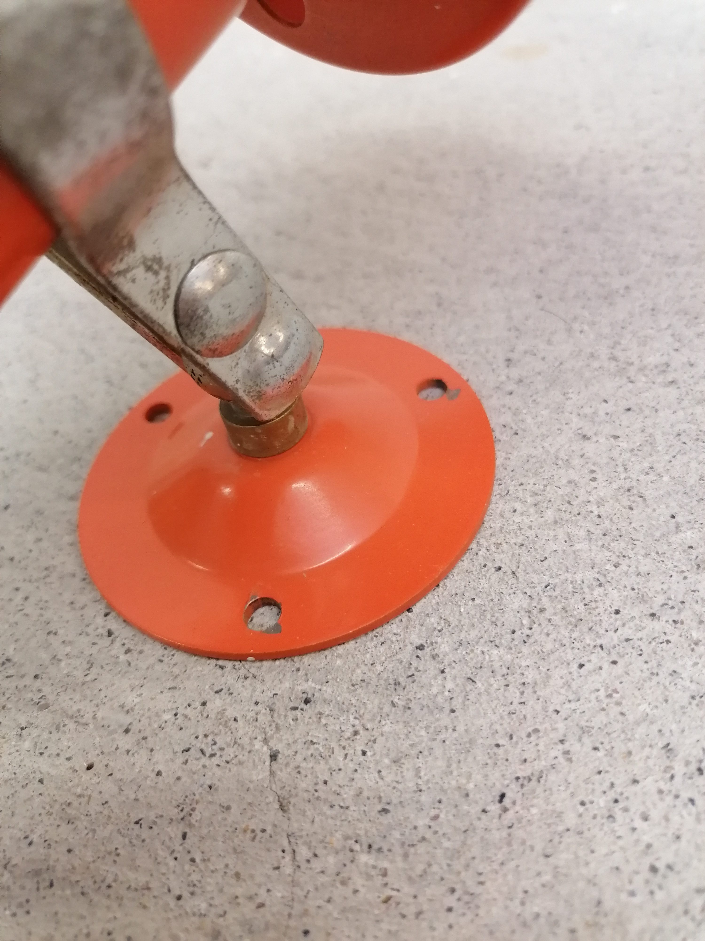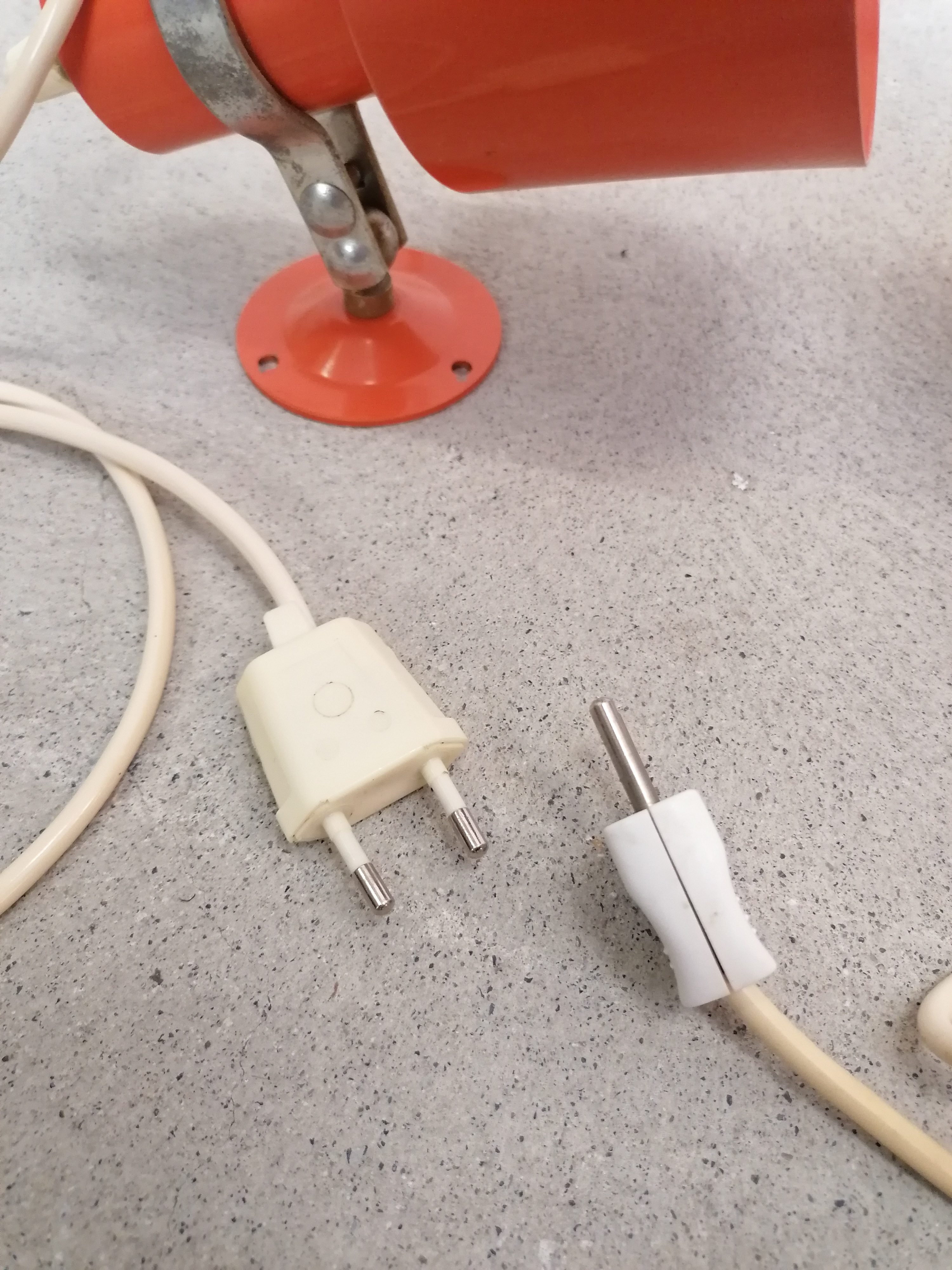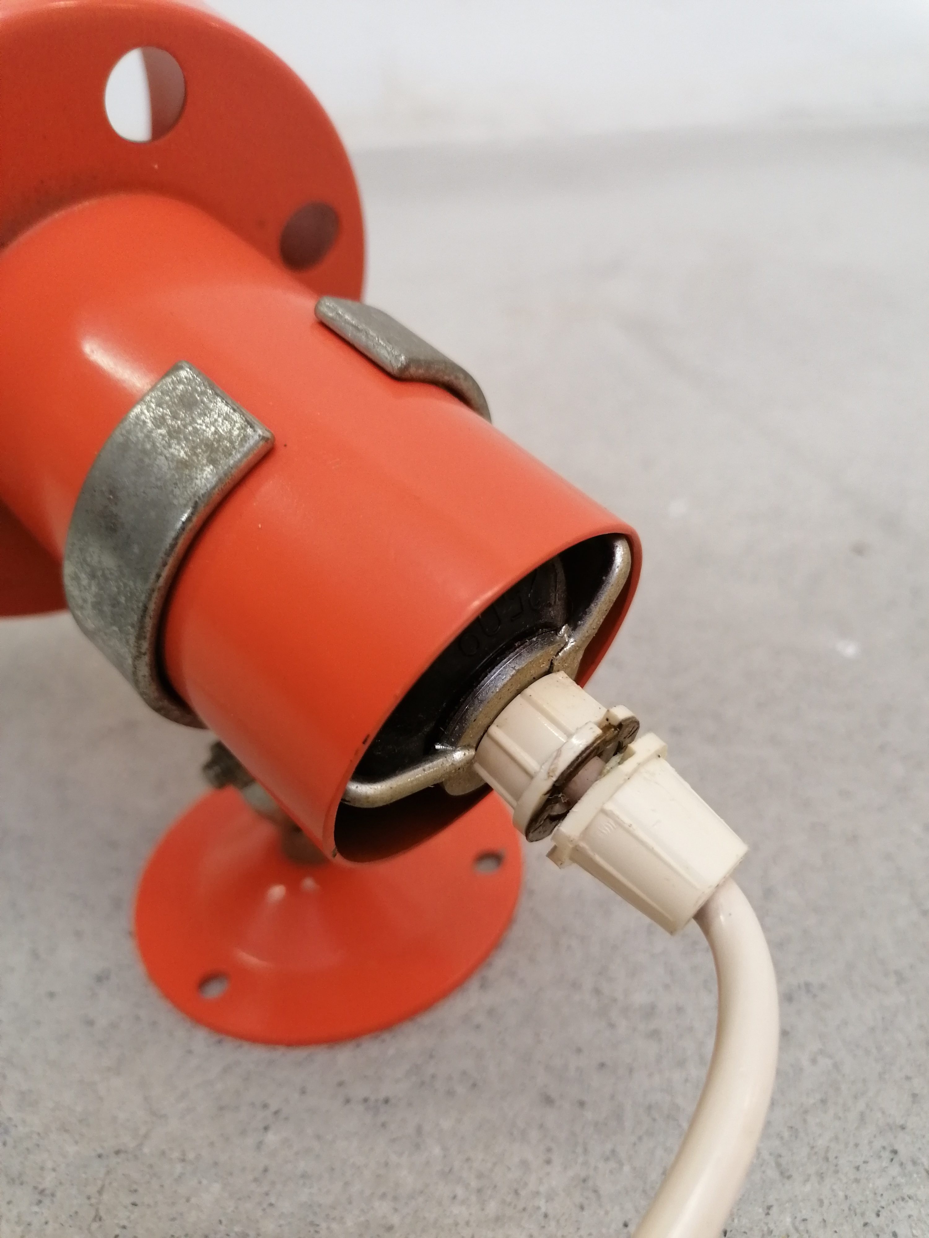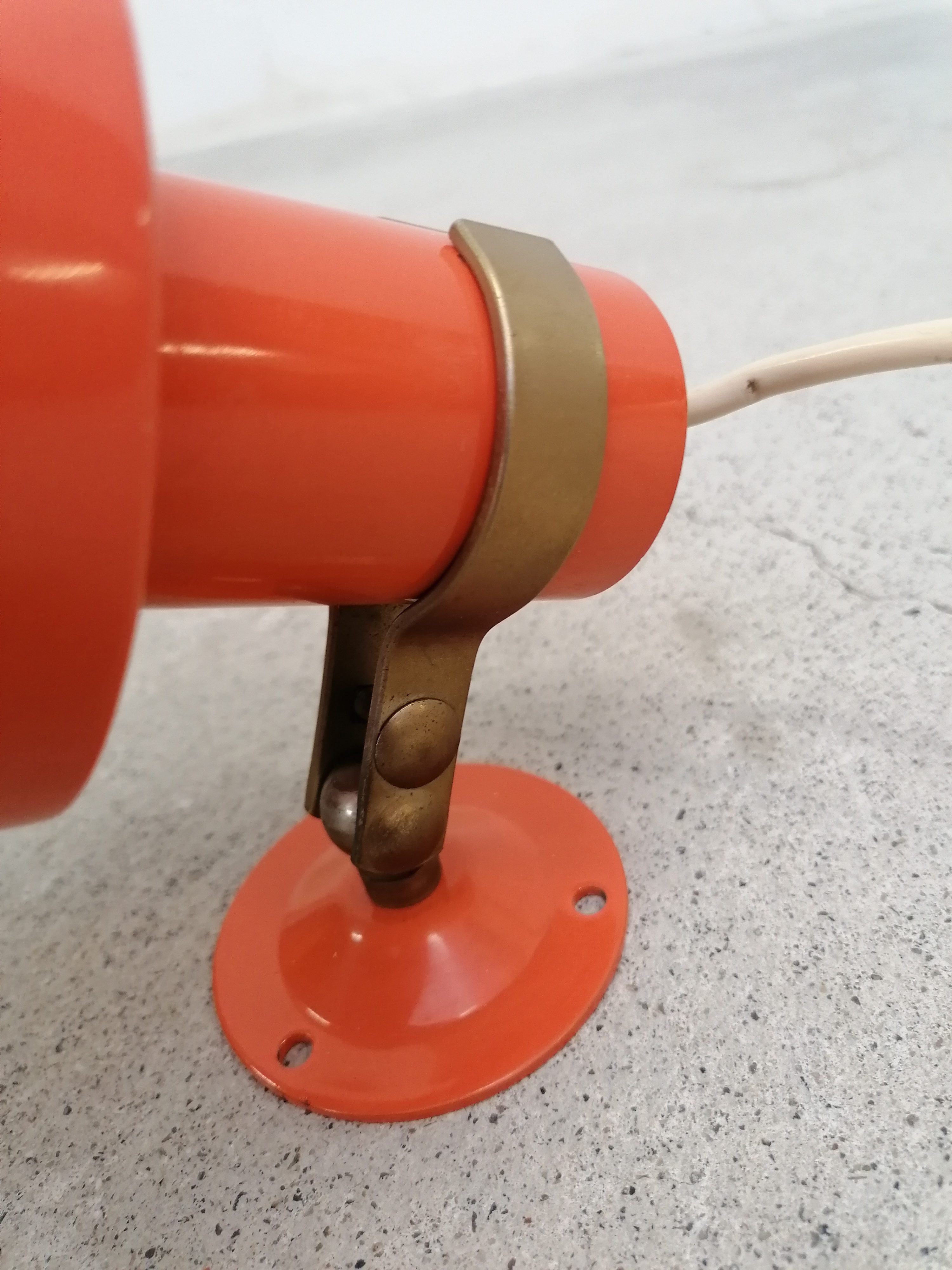 Paire de lampes vintage en métal orange. Les lampes peuvent être fixées au mur comme des appliques mais elles peuvent aussi être utilisées comme lampes de table ou de chevet simplement posées (sans besoin de les fixer). Quelques traces en particulier sur la structure en métal argenté.