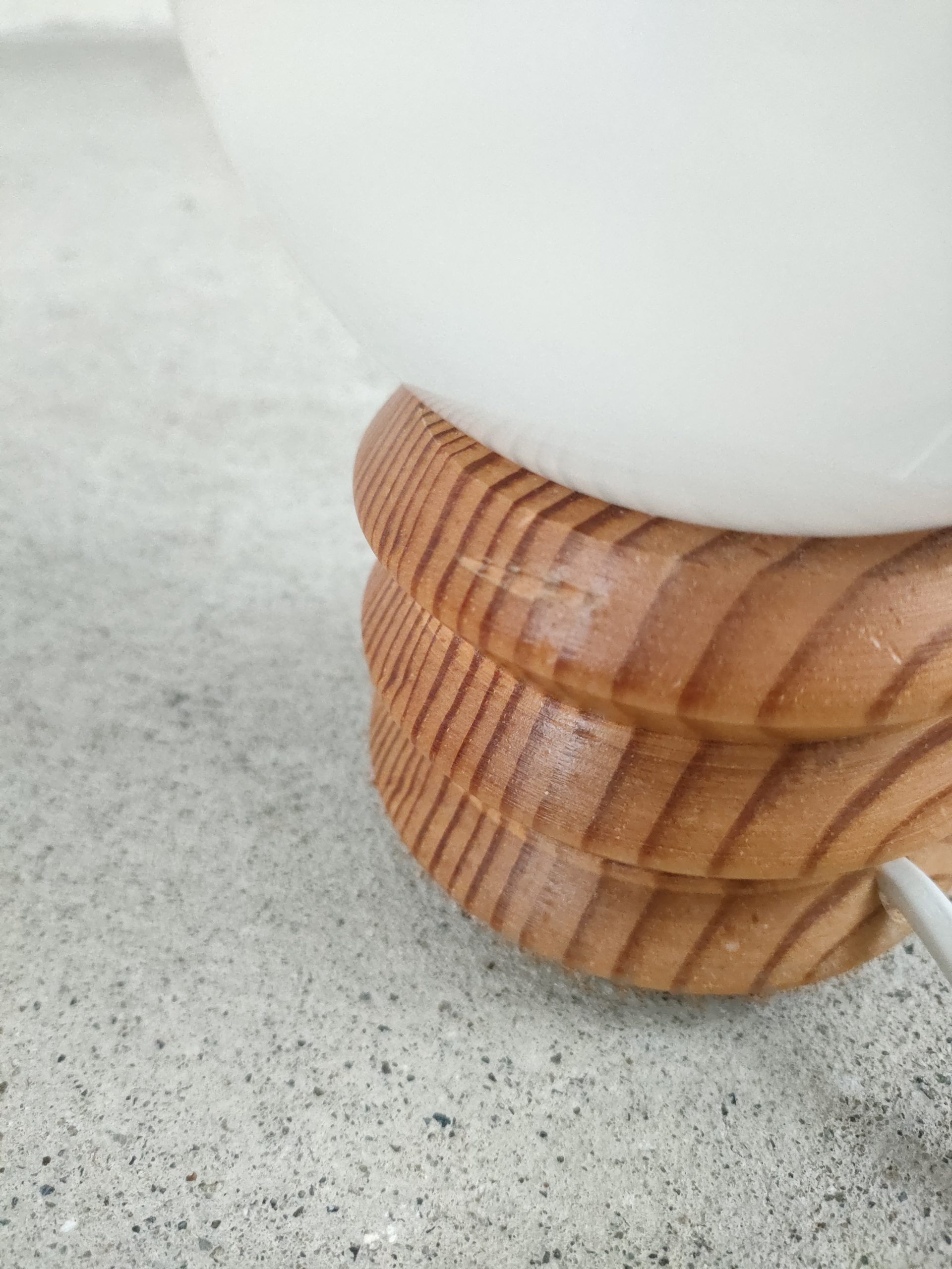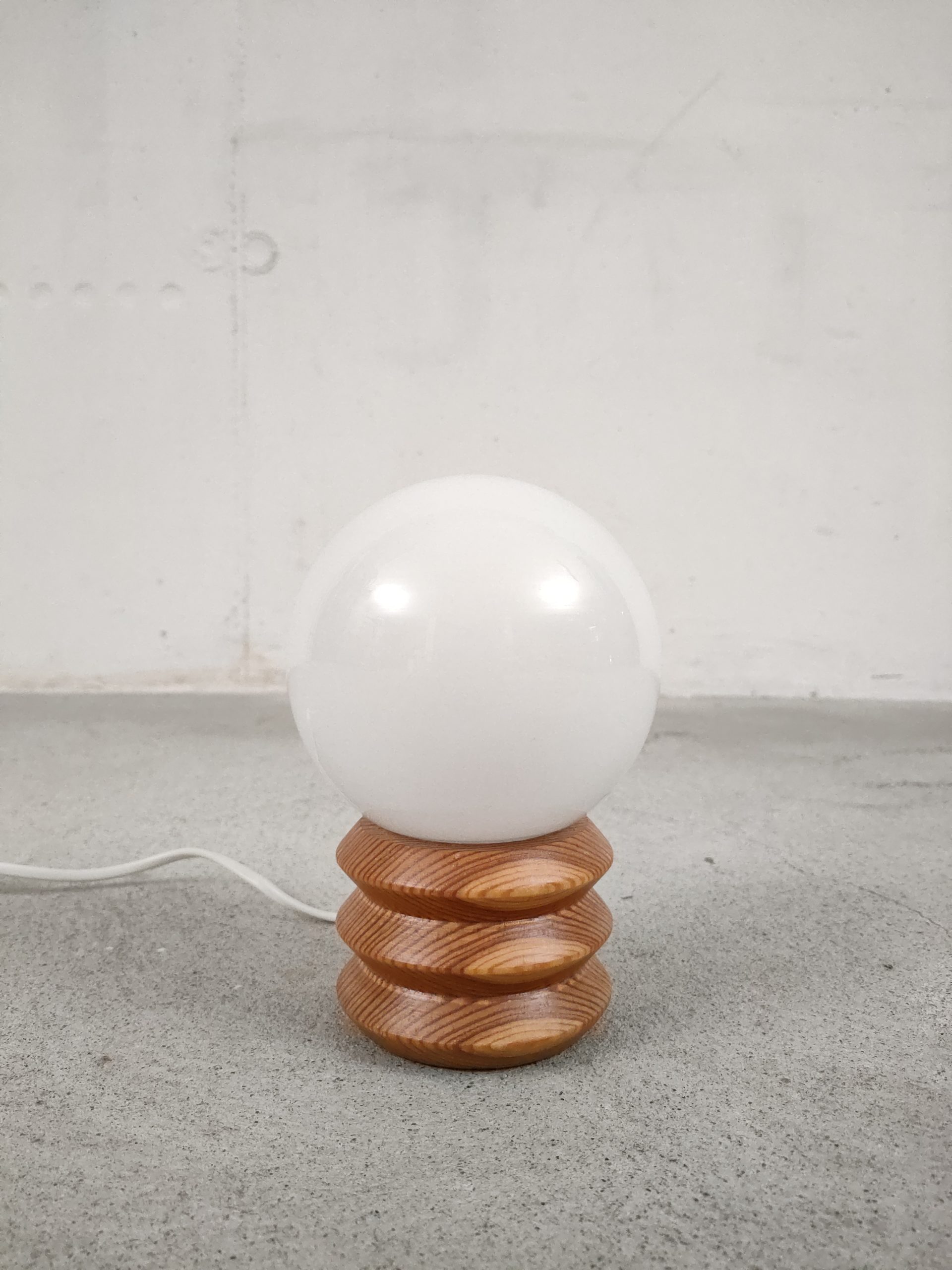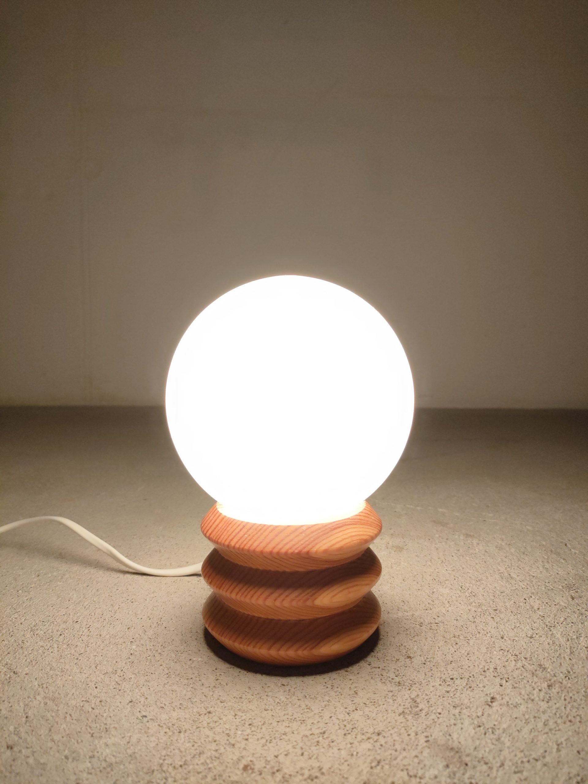 Produit venduPetite lampe avec base en bois en boule en verre. Intérrupteur sur le fil. Elle fonctionne avec des ampoules standard E14.