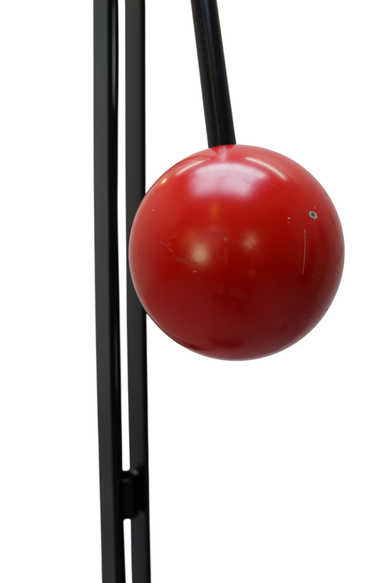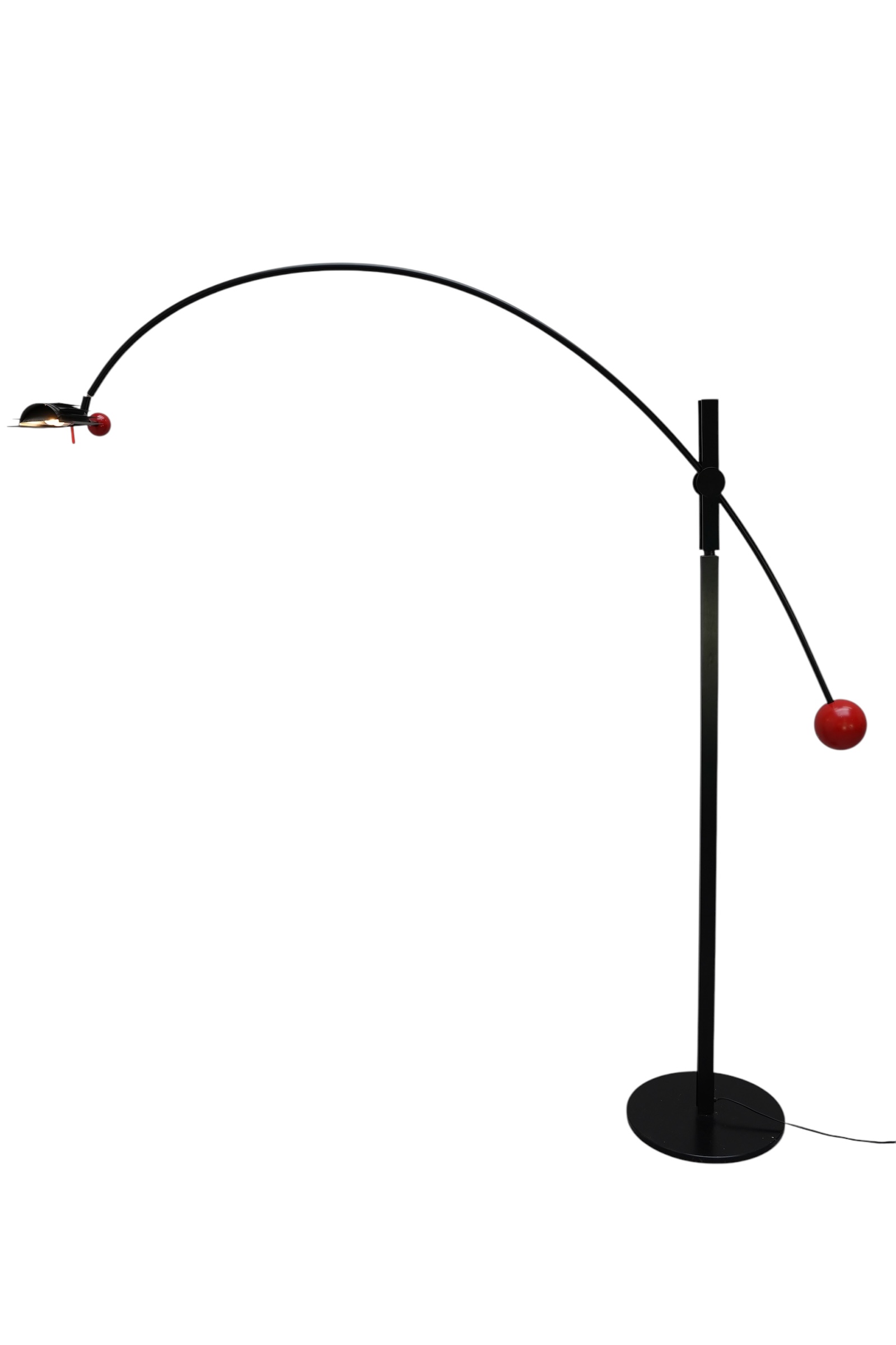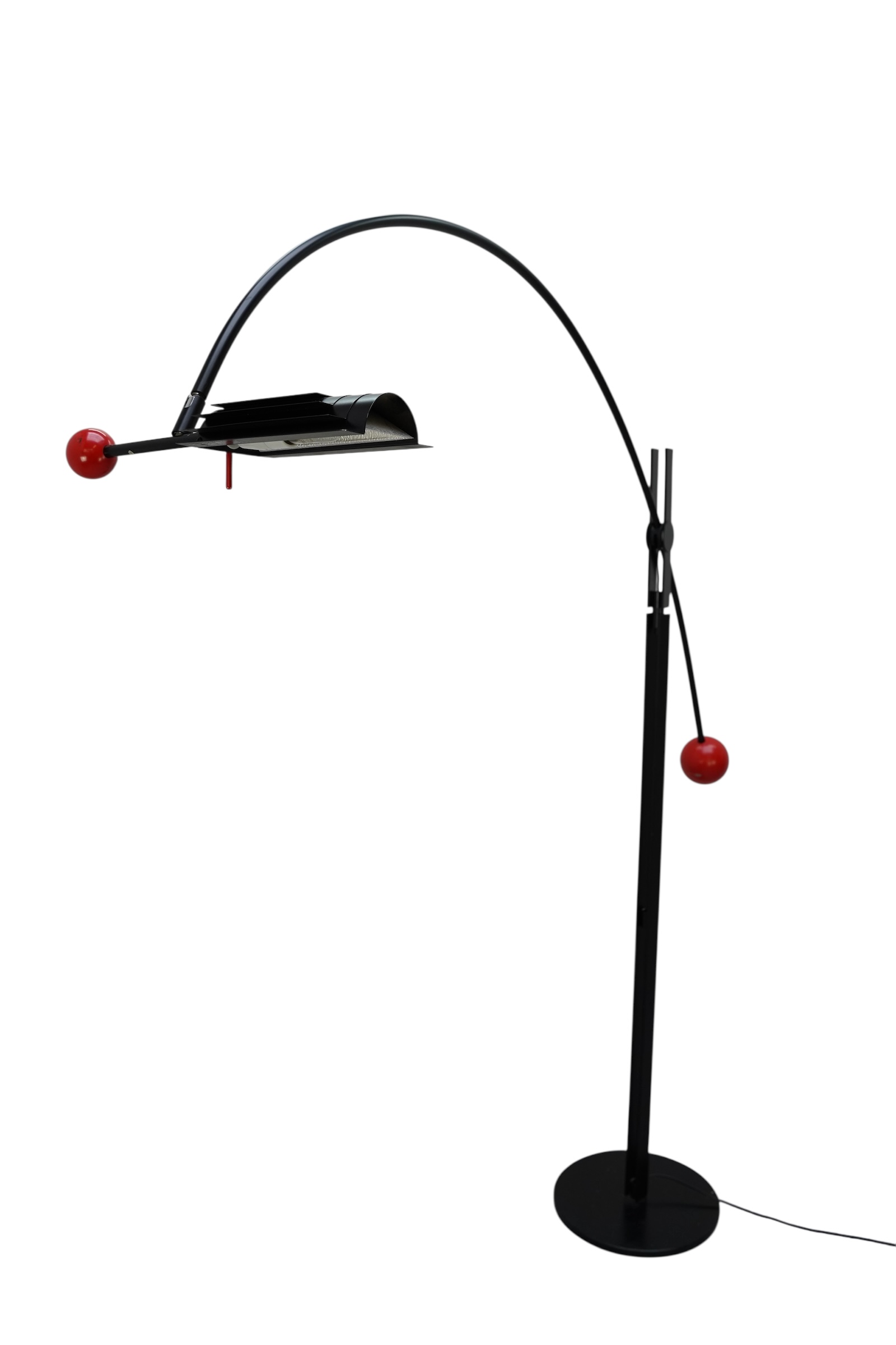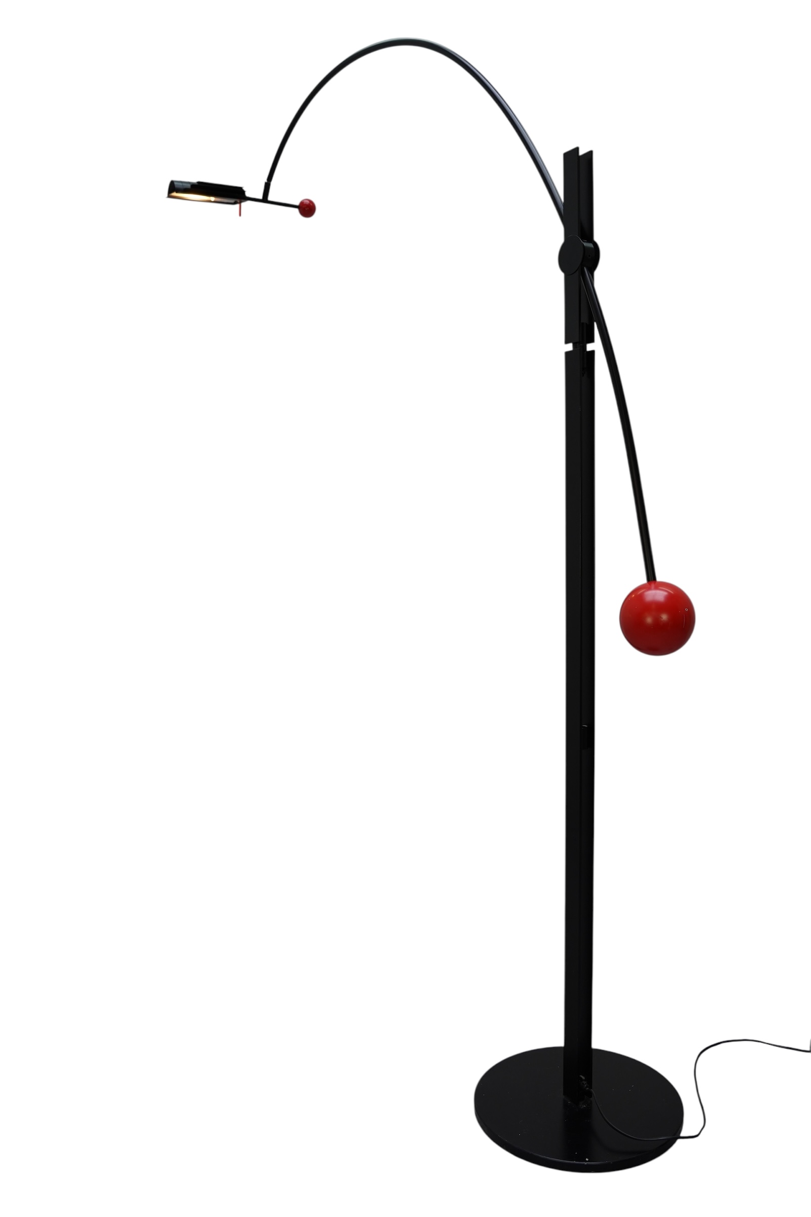 Lampadaire en acier laqué noir. Modèle 8023 de l’architecte Suisse Robert Haussman pour Swisslamp International édité vers 1880’s/1990’s. Bras d’équilibre ajustable par ses poids en métal de couleur rouges, réflecteur rotatif. Équipé d’un gradateur