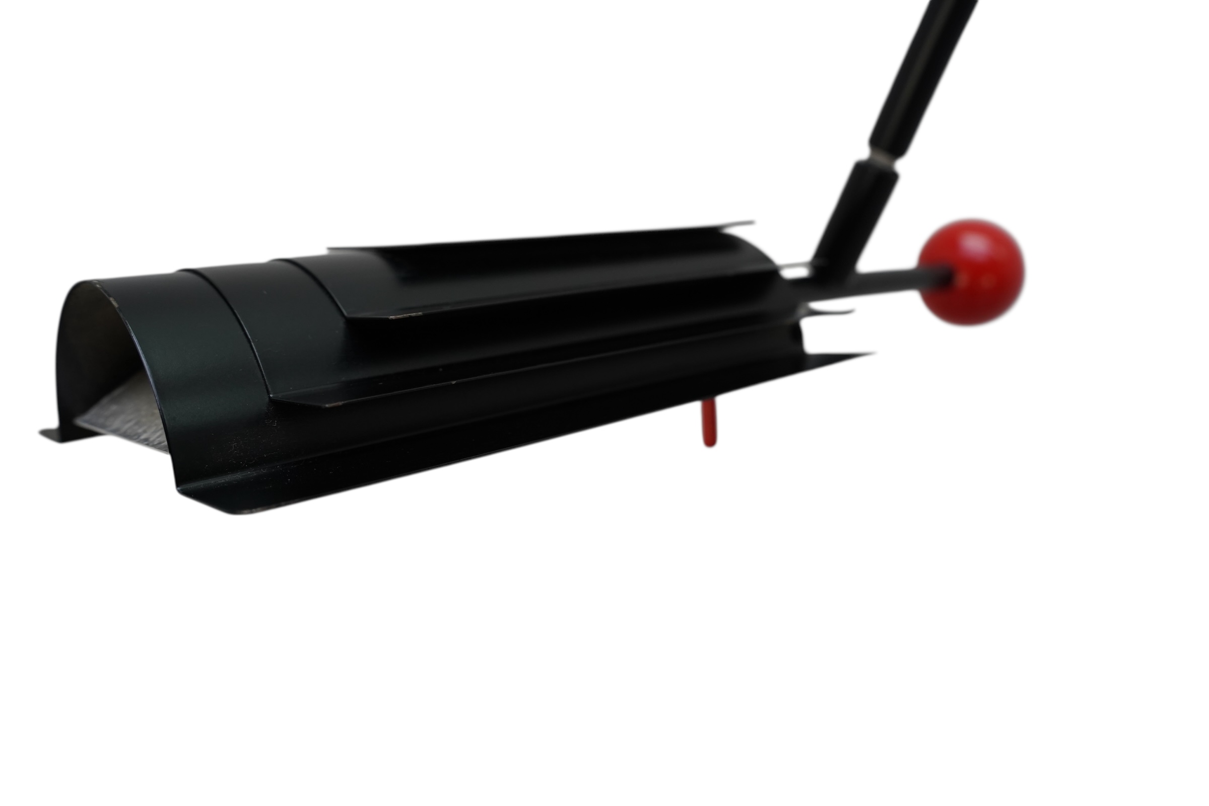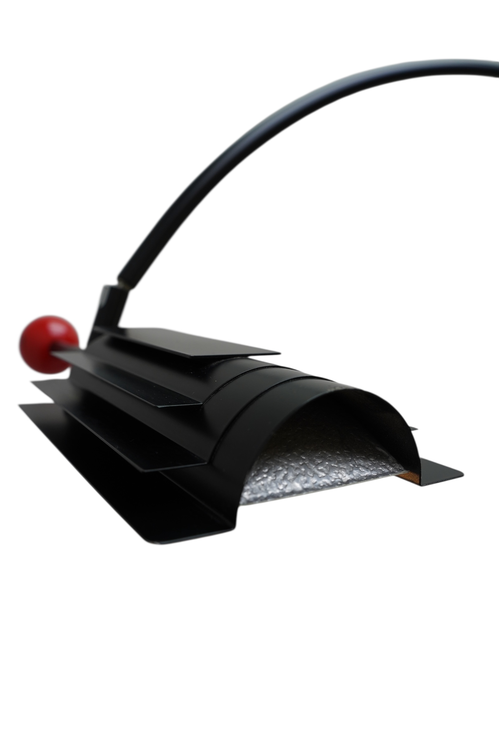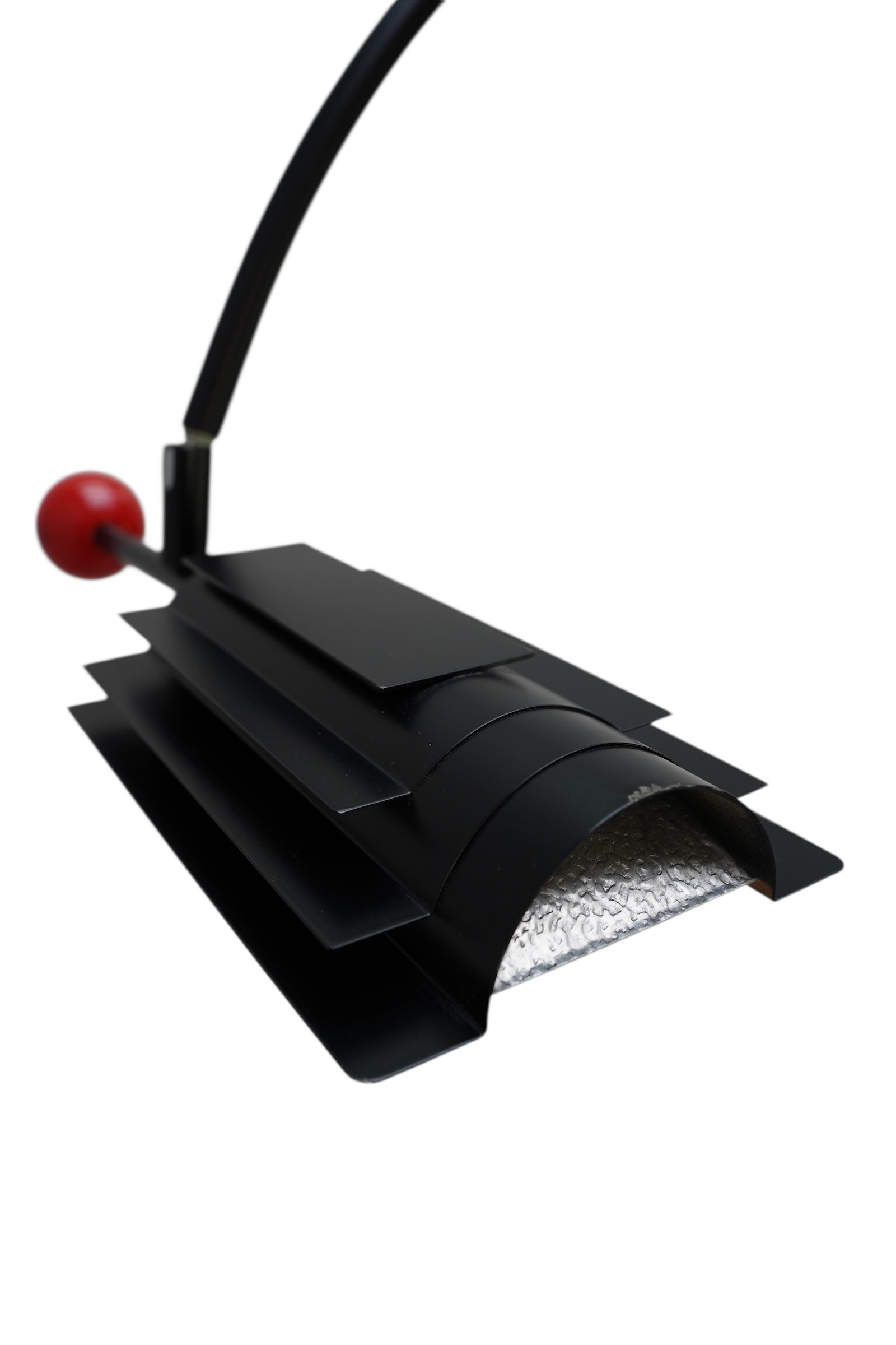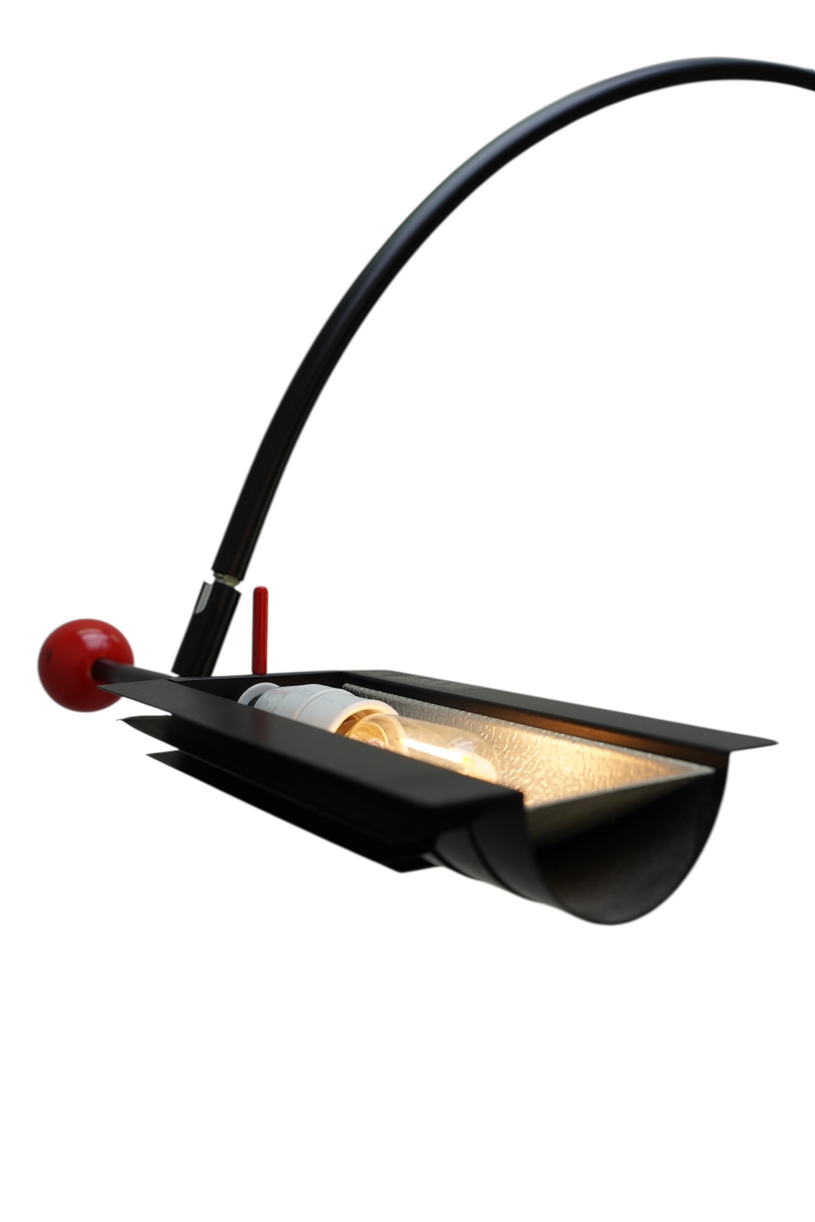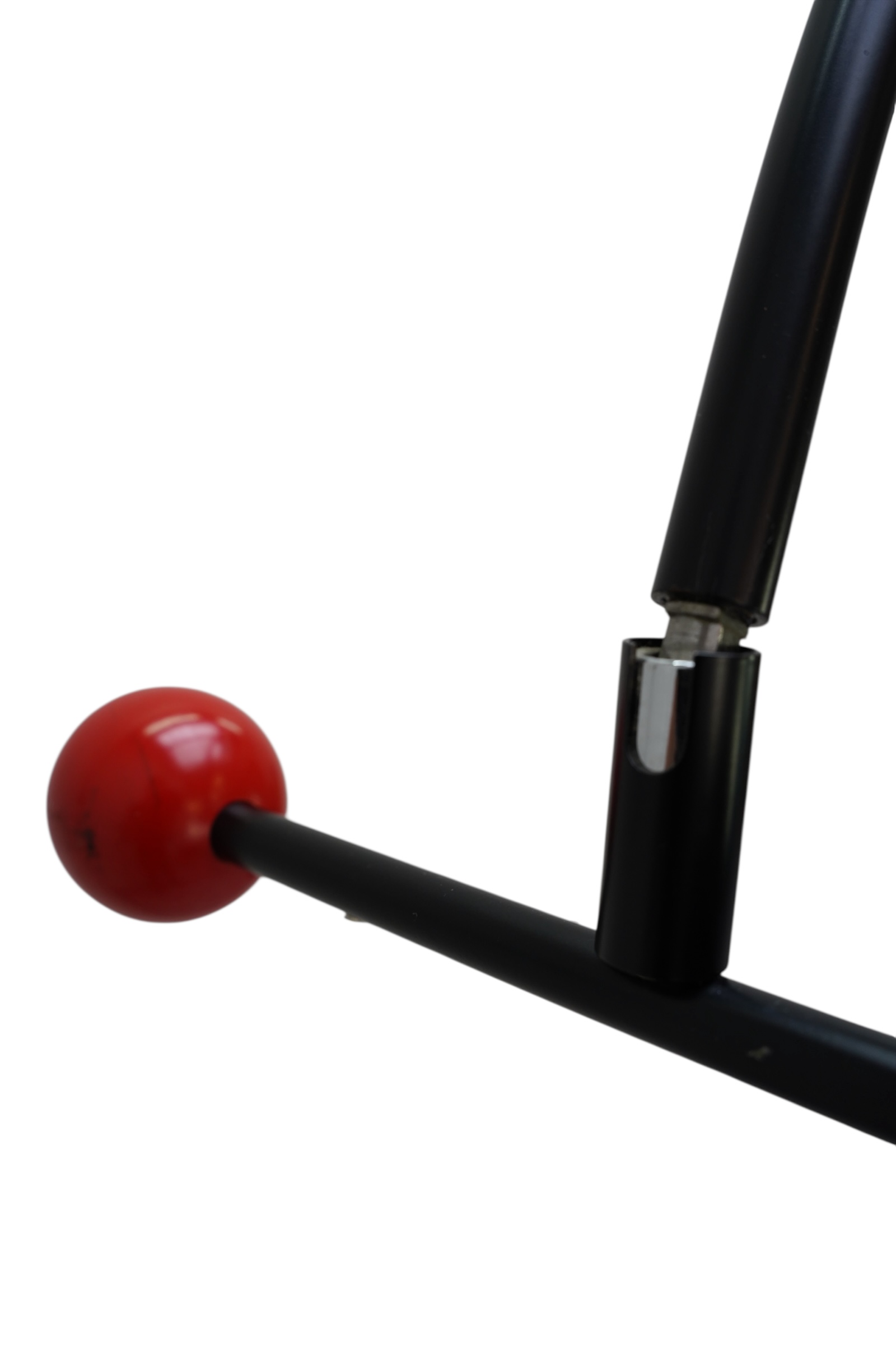 Lampadaire en acier laqué noir. Modèle 8023 de l’architecte Suisse Robert Haussman pour Swisslamp International édité vers 1880’s/1990’s. Bras d’équilibre ajustable par ses poids en métal de couleur rouges, réflecteur rotatif. Équipé d’un gradateur