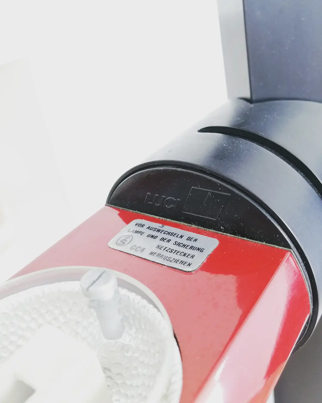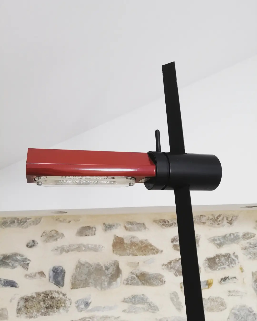 Réflecteur en métal laqué rouge, de hauteur ajustable et rotatif. Avec variateur intégré. Socle en fonte.