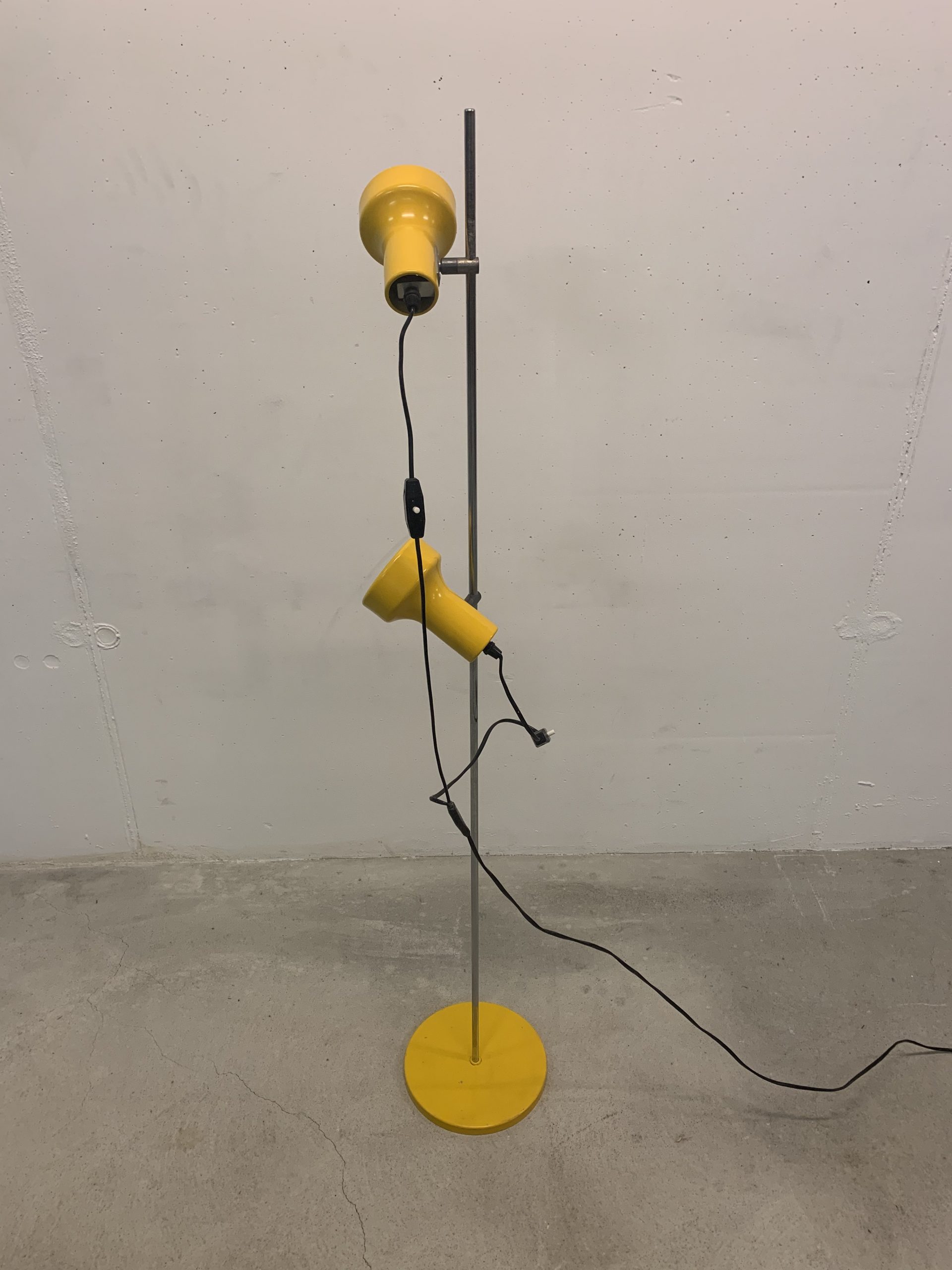 La lampe à déjà bien vécu: la tige en métal comporte de nombreuses traces d’utilisation et, surtout, la peinture jaune a quelques éclats, en particulier sur le pied et sur un spot (ces défauts sont visibles sur 2 photos). Mais l’ensemble reste sympa et fonctionnel! Le câble électrique fait plus de 2 mètres. La lampe est vendue sans ampoules.