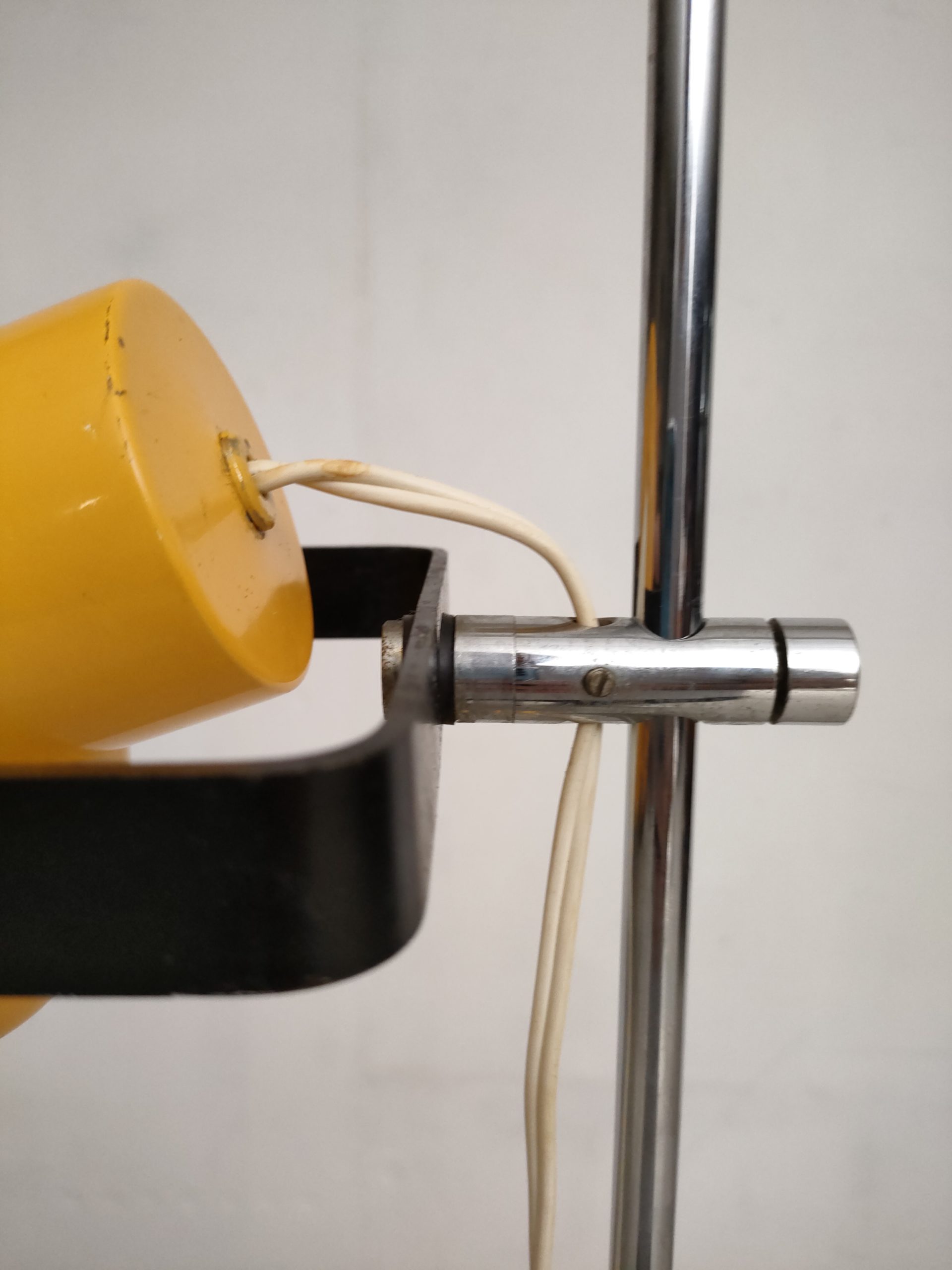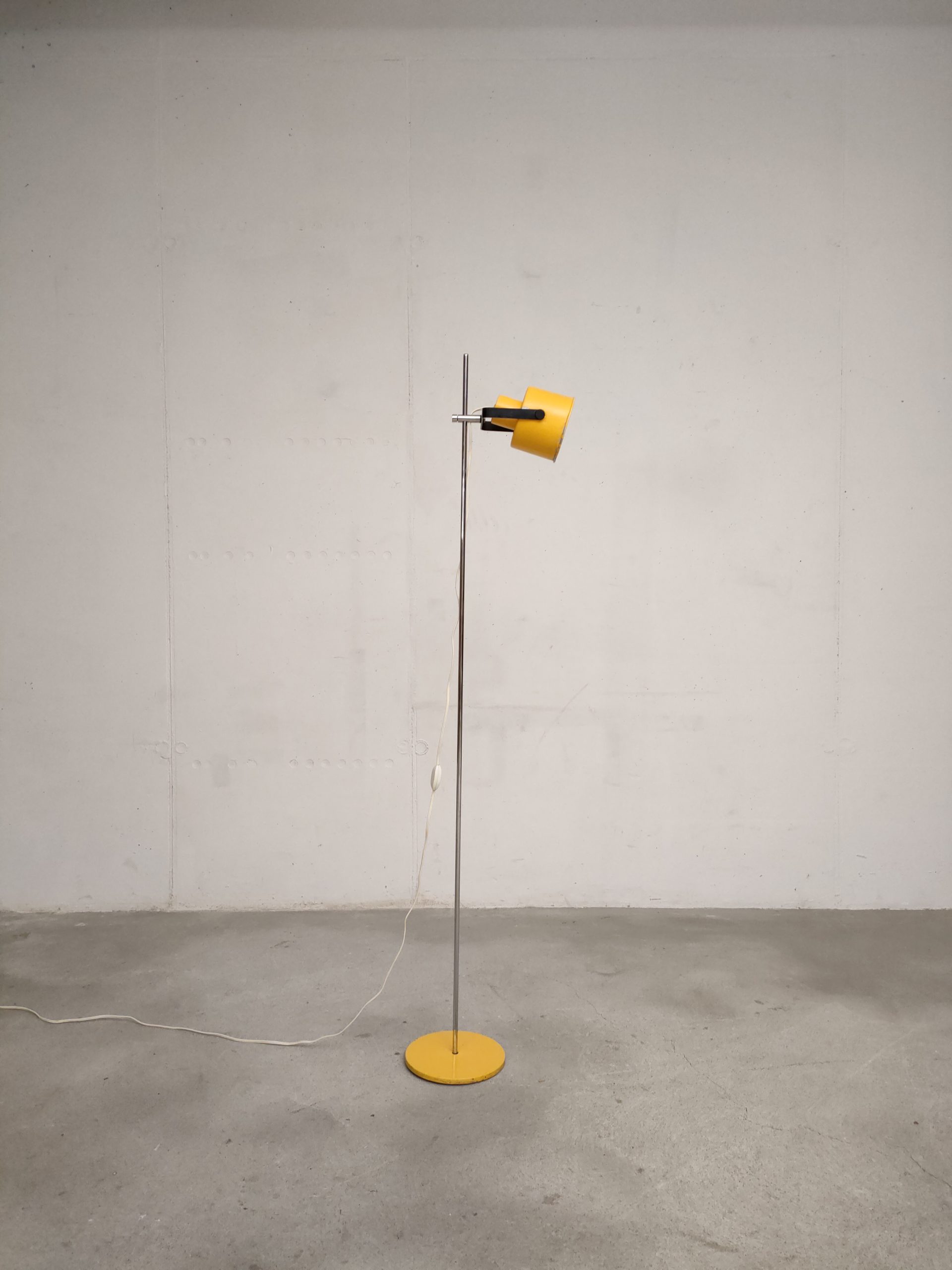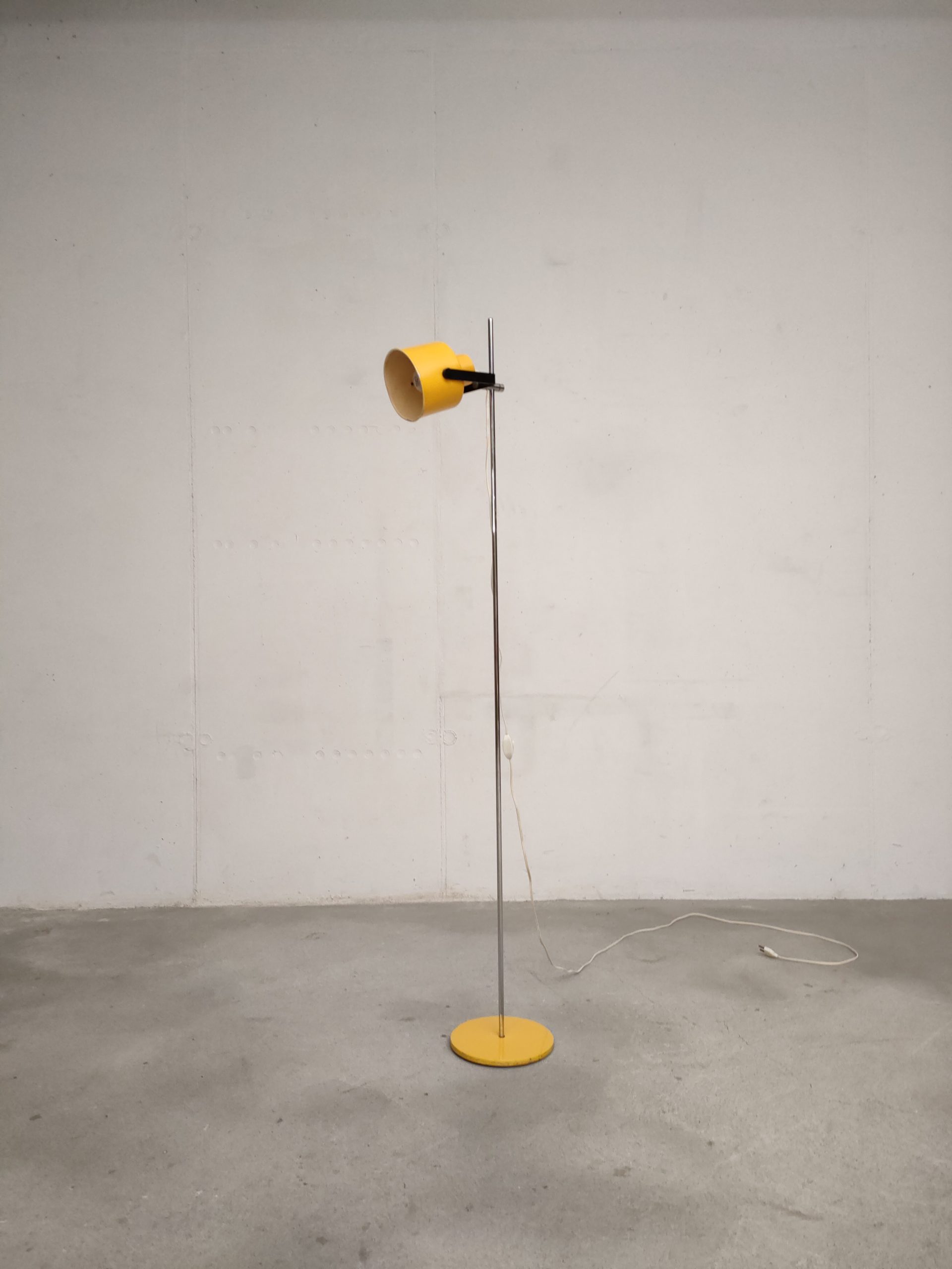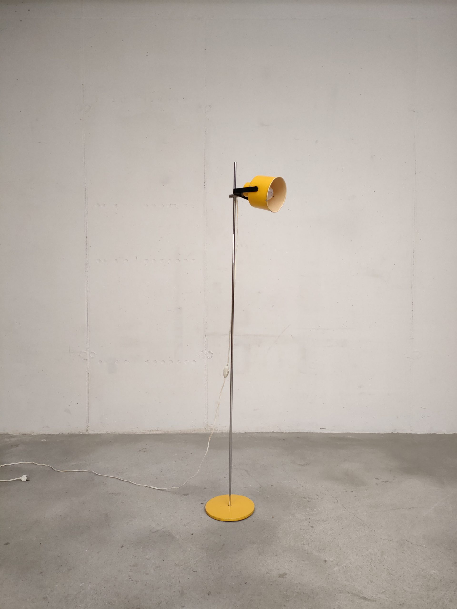 Lampe sur pied vintage avec abat-jour et socle en métal jaune et tige en métal chromé. La hauteur est réglable et l’abat-jour peut être orienté dans toutes les directions. Quelques traces d’usure et manques de peinture (voir photos). La lampe est sable et solide et parfaitement fonctionnelle.