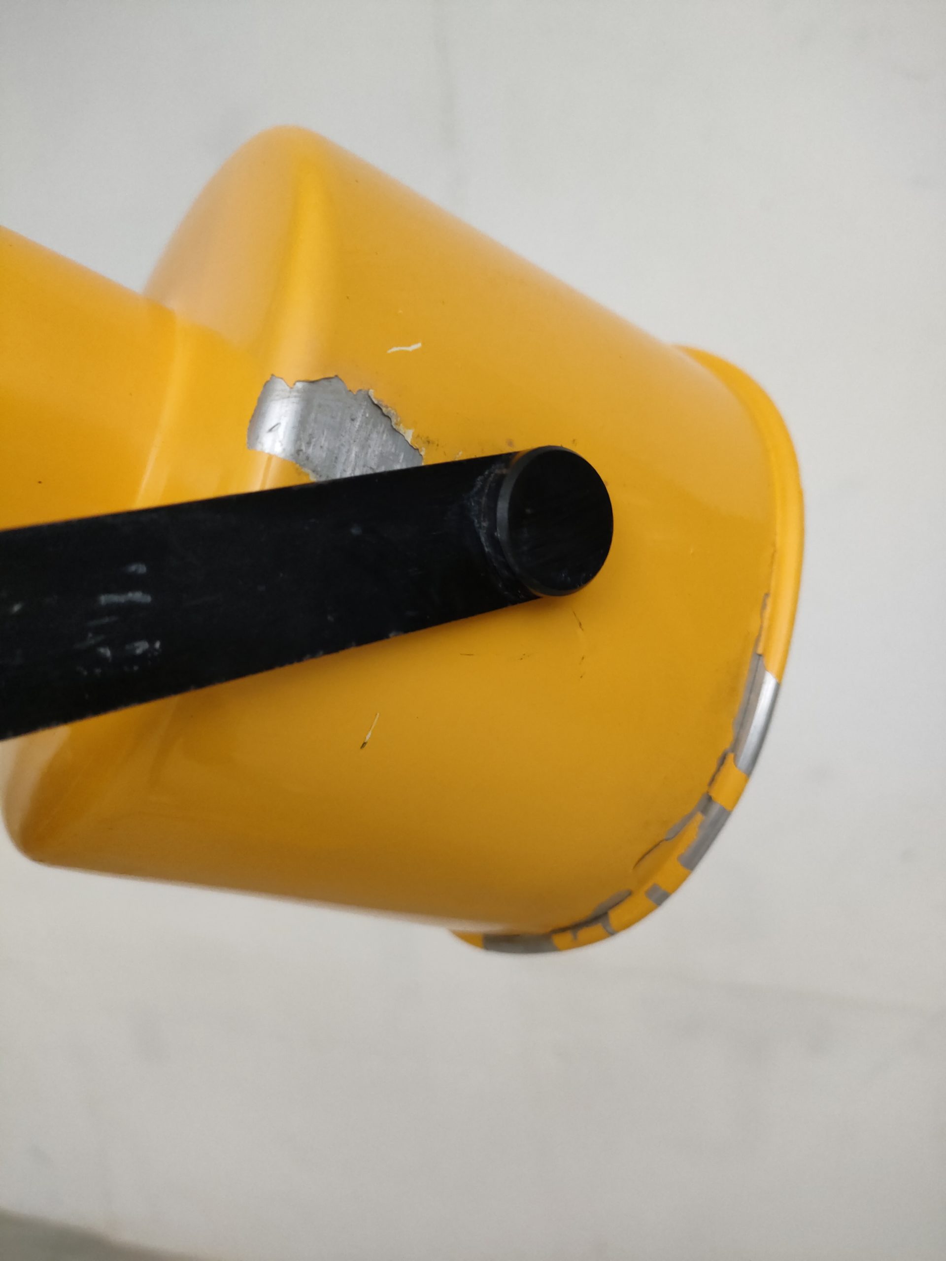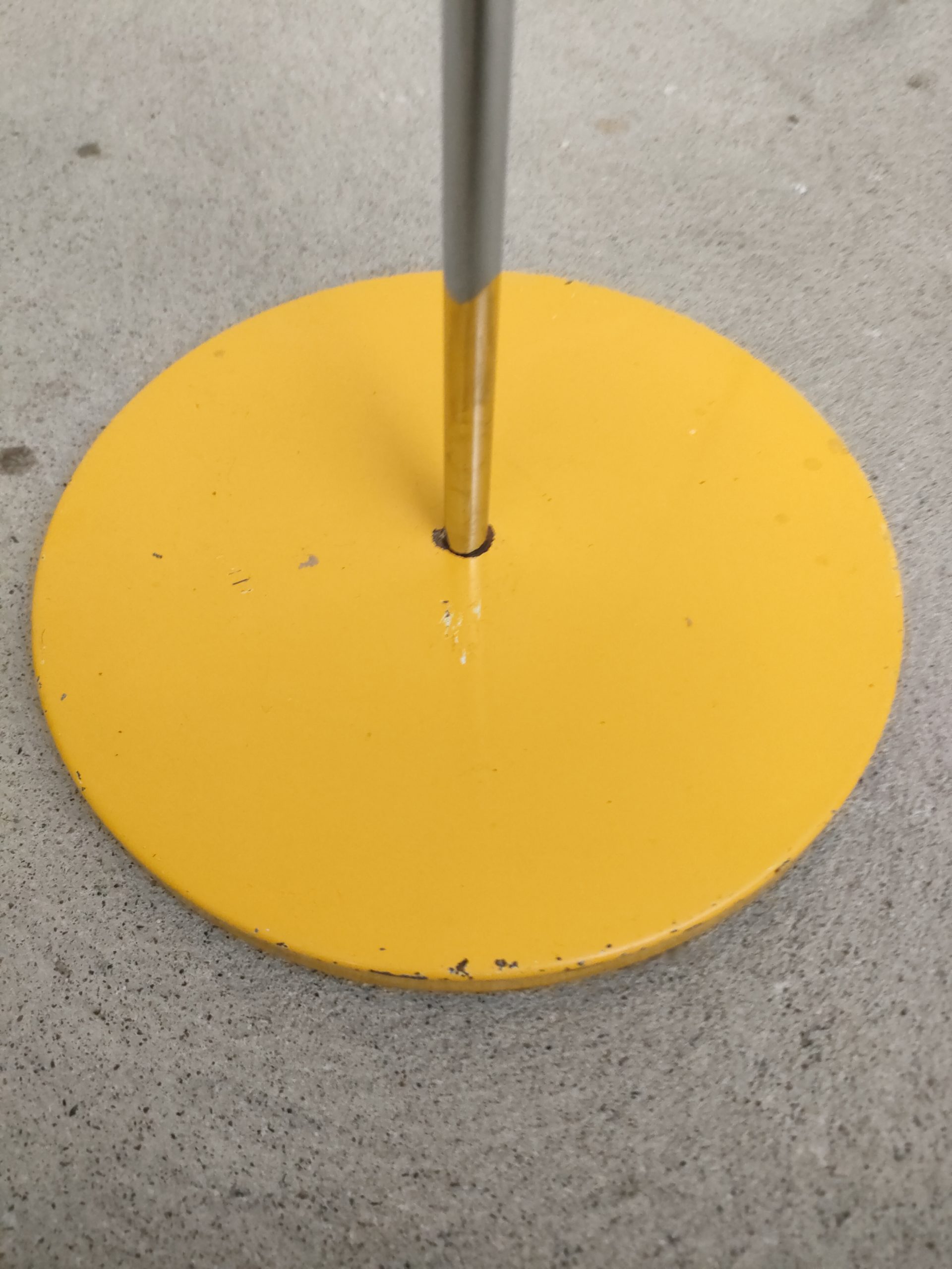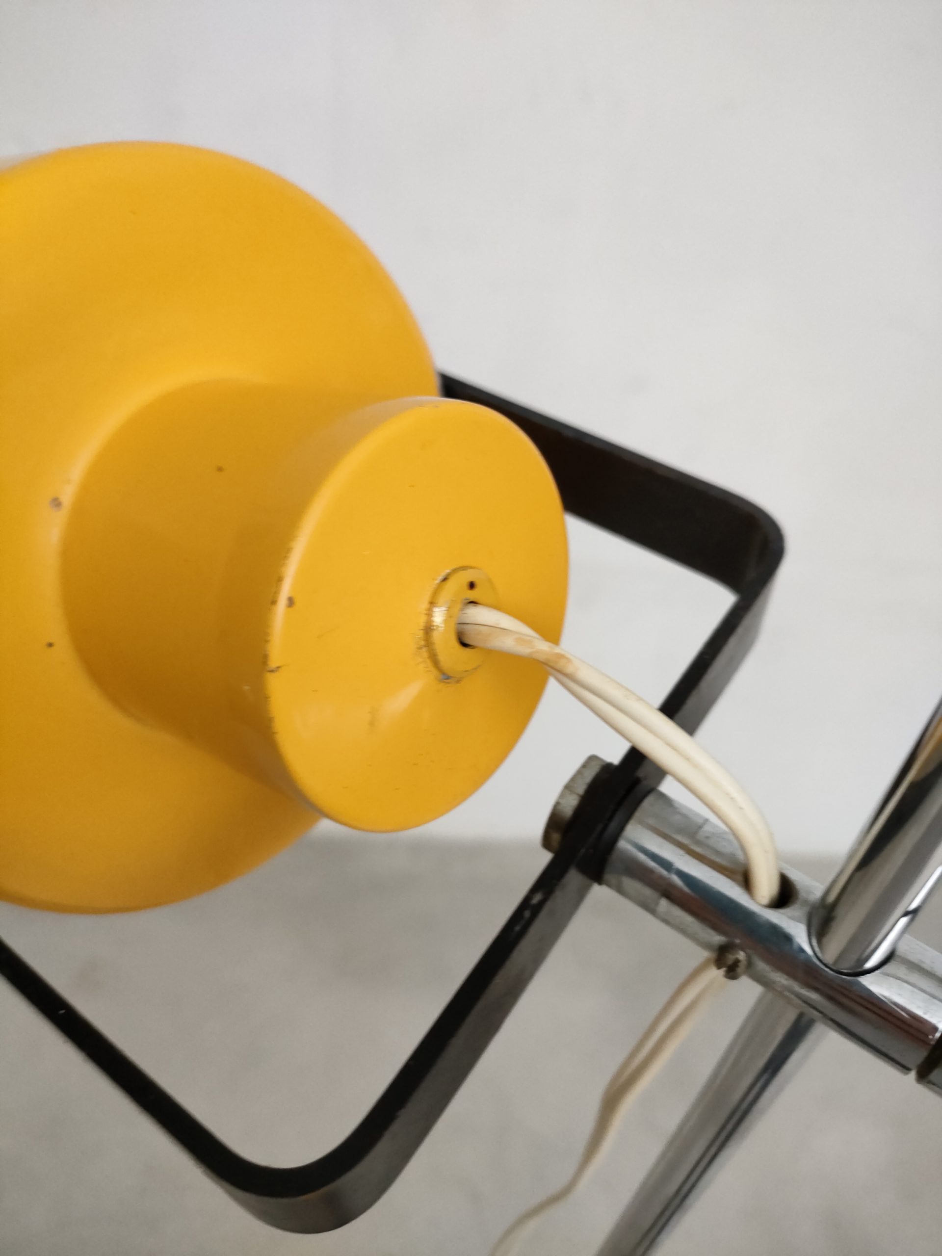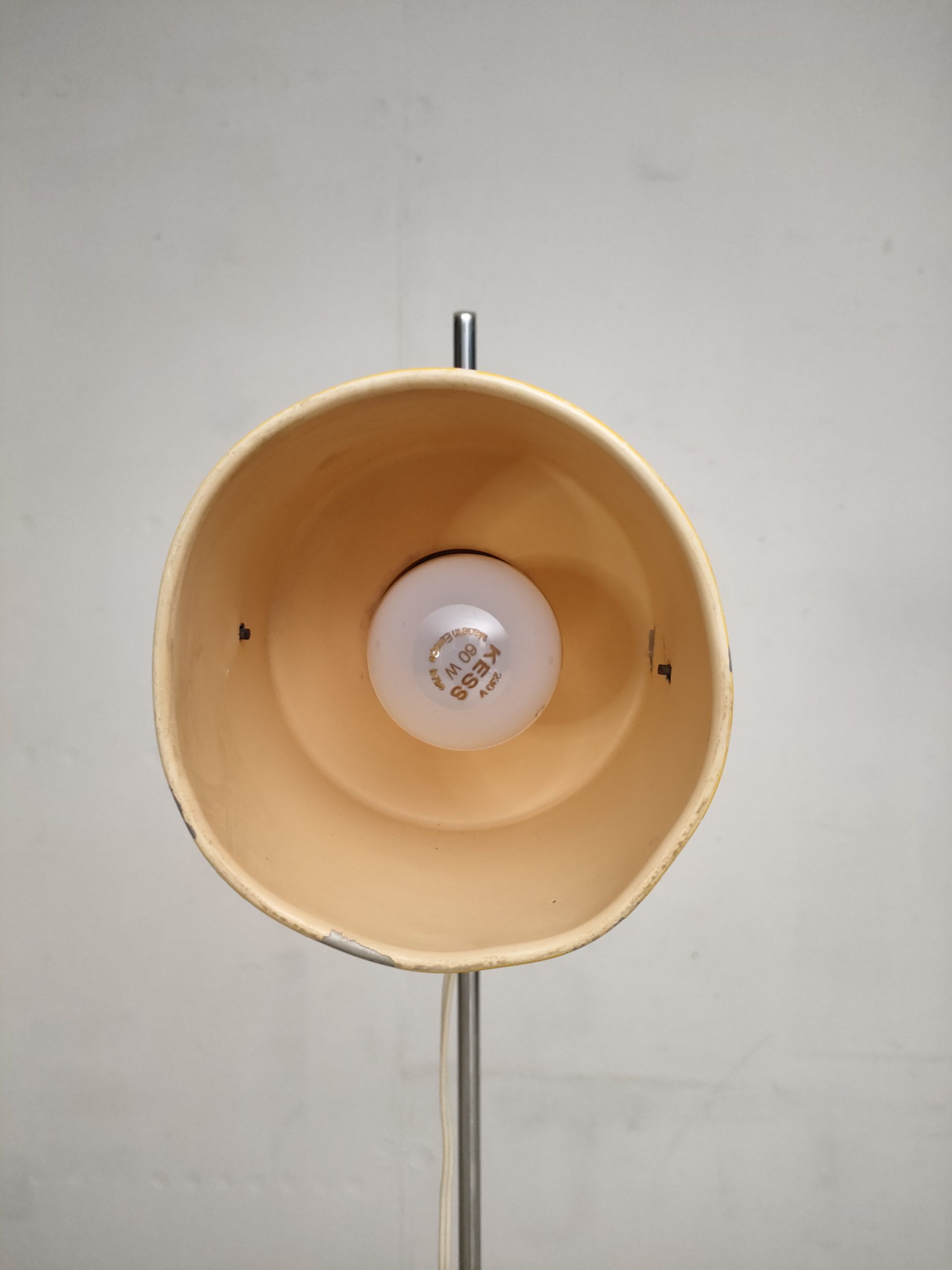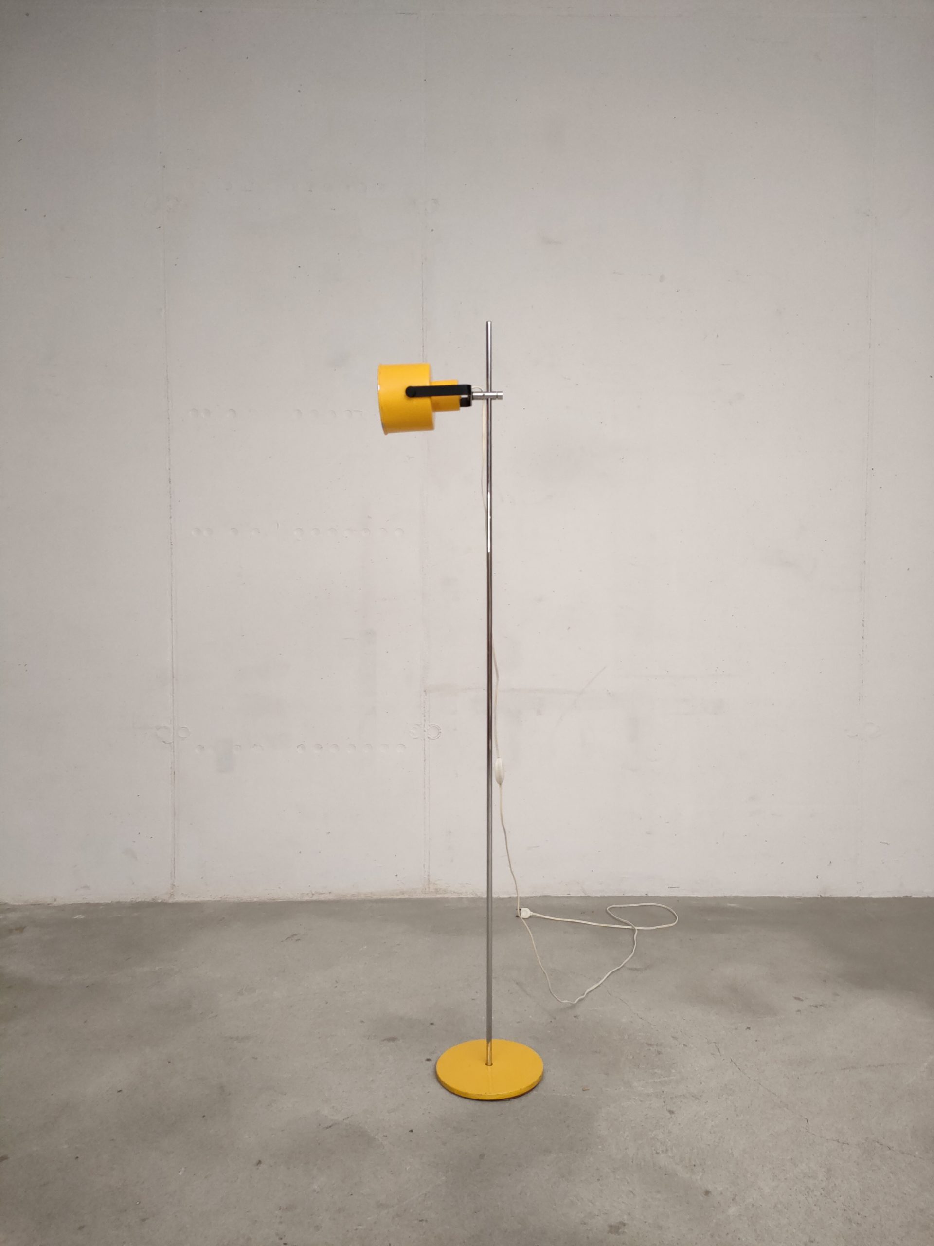 Lampe sur pied vintage avec abat-jour et socle en métal jaune et tige en métal chromé. La hauteur est réglable et l’abat-jour peut être orienté dans toutes les directions. Quelques traces d’usure et manques de peinture (voir photos). La lampe est sable et solide et parfaitement fonctionnelle.