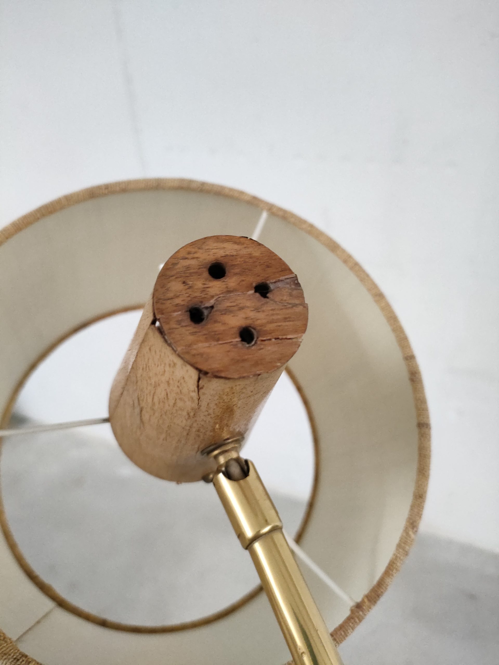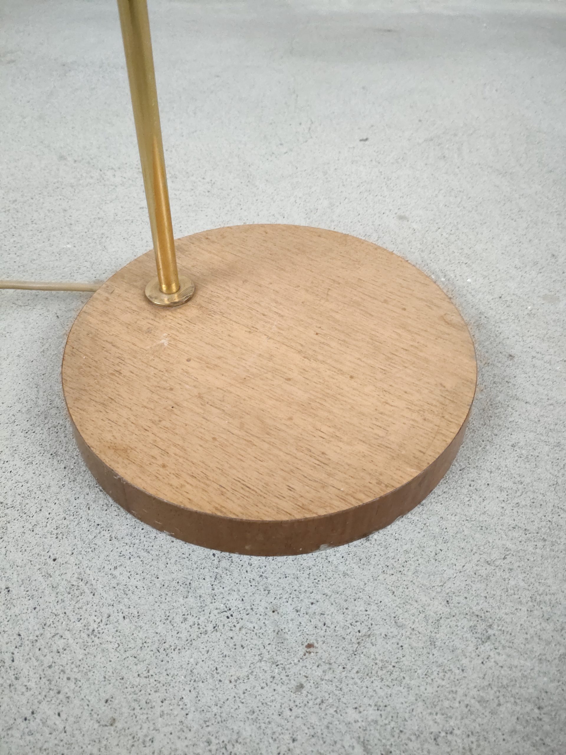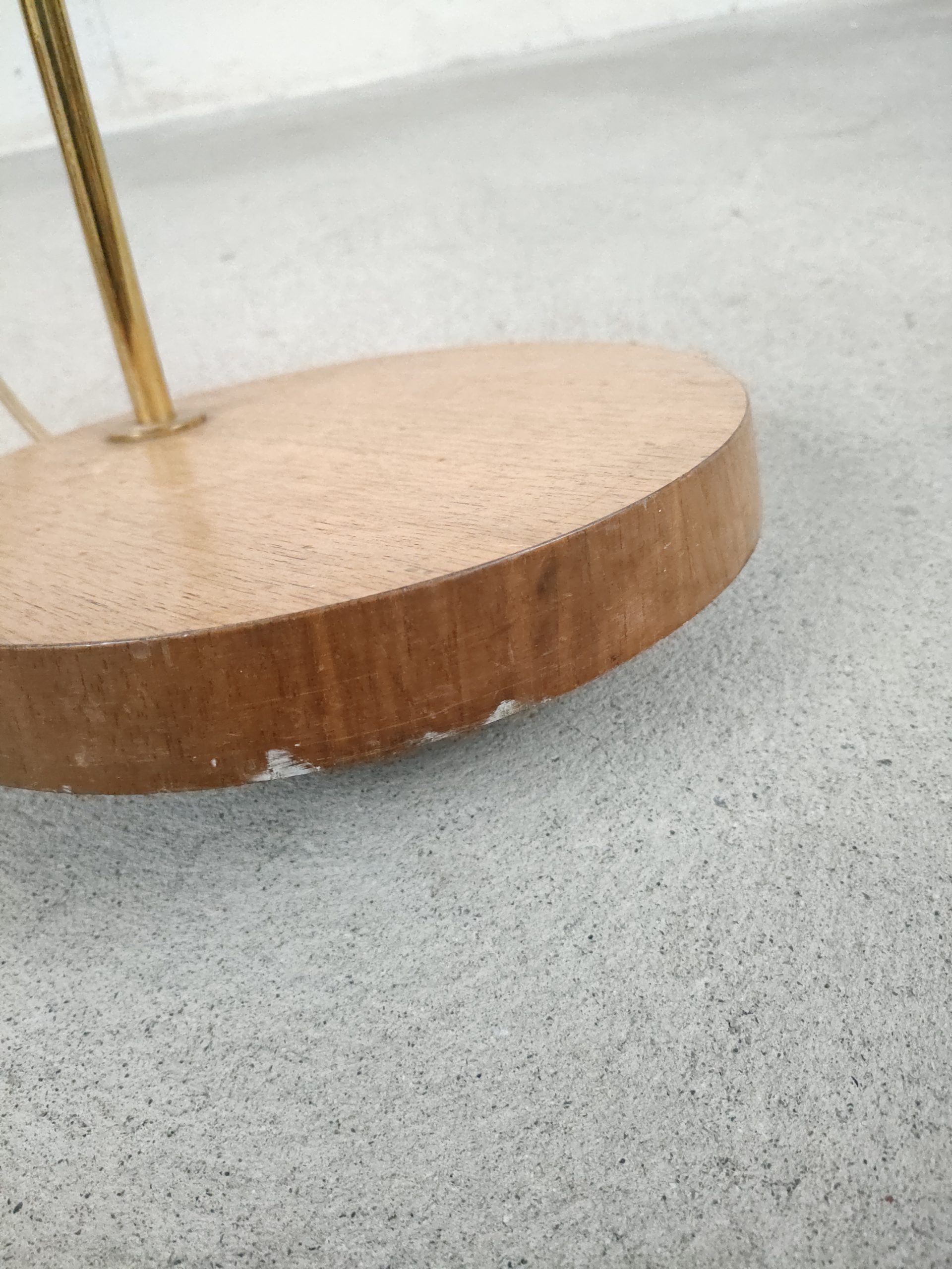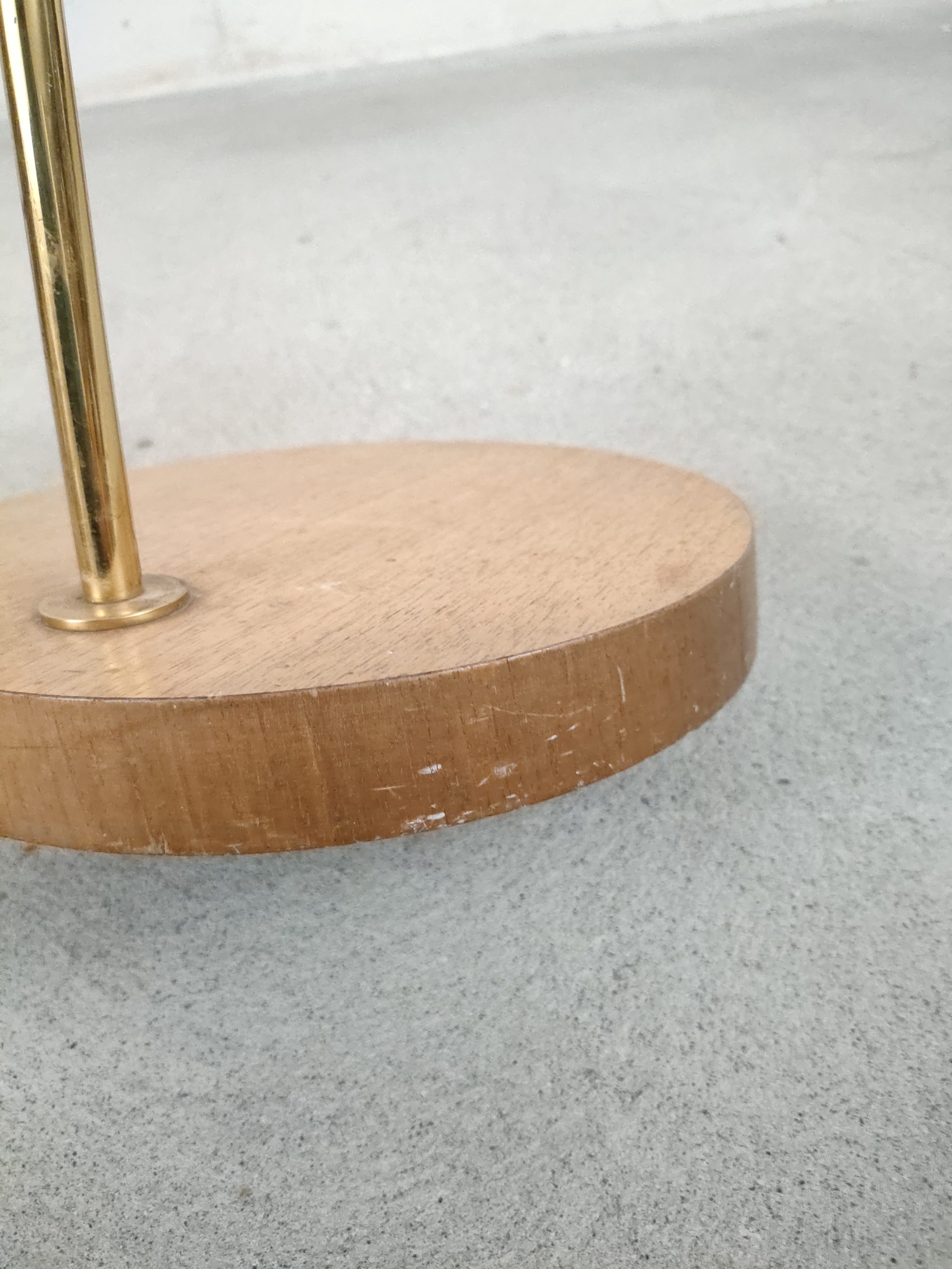 Produit venduLampe sur pied vintage avec socle en bois, tige en métal doré et abat-jour en bois et en tissu. L’abat-jour peut être orienté. Des traces d’usure sont présentes, en particulier sur la partie en bois de l’abat-jour (voir photos).