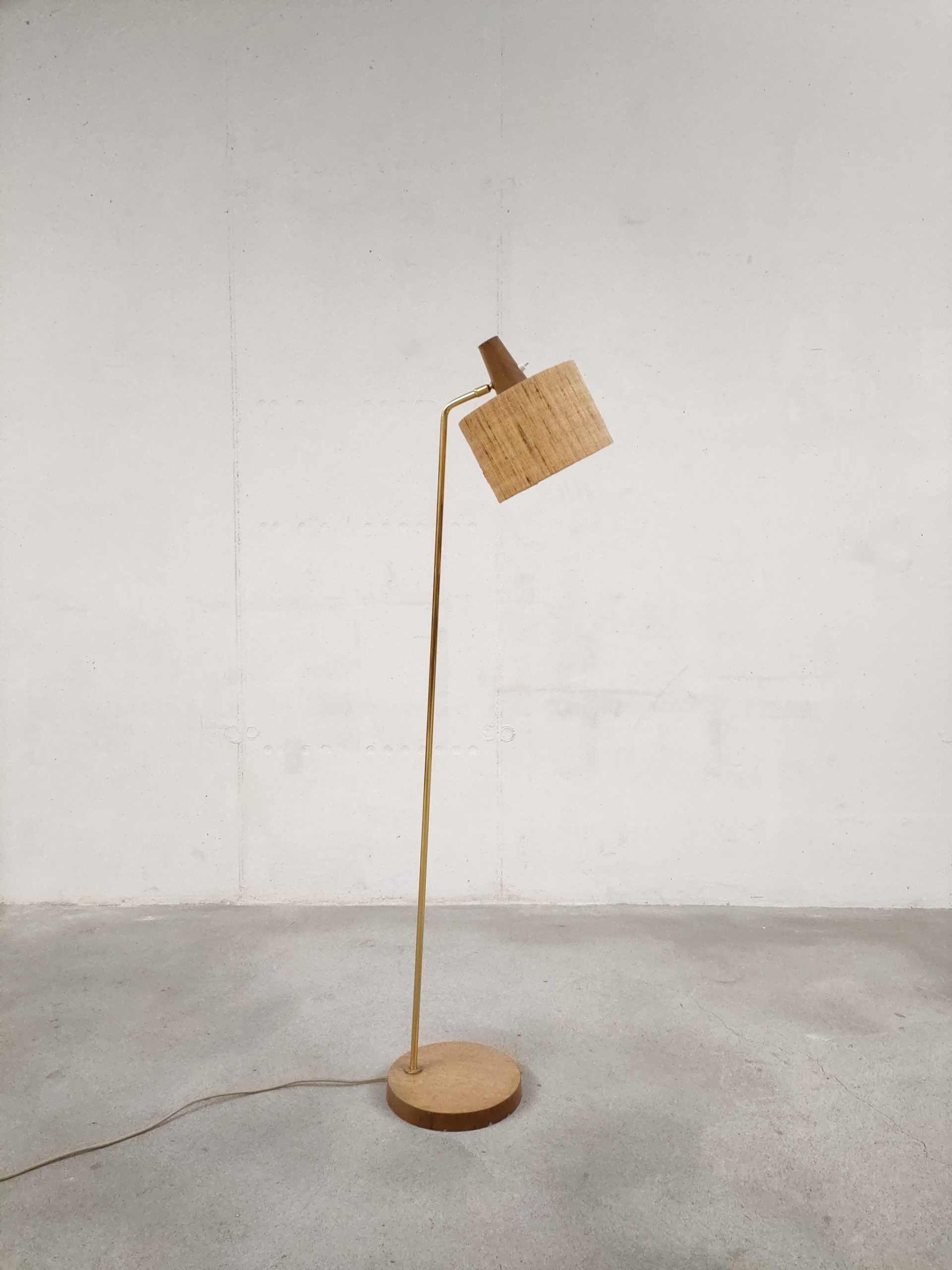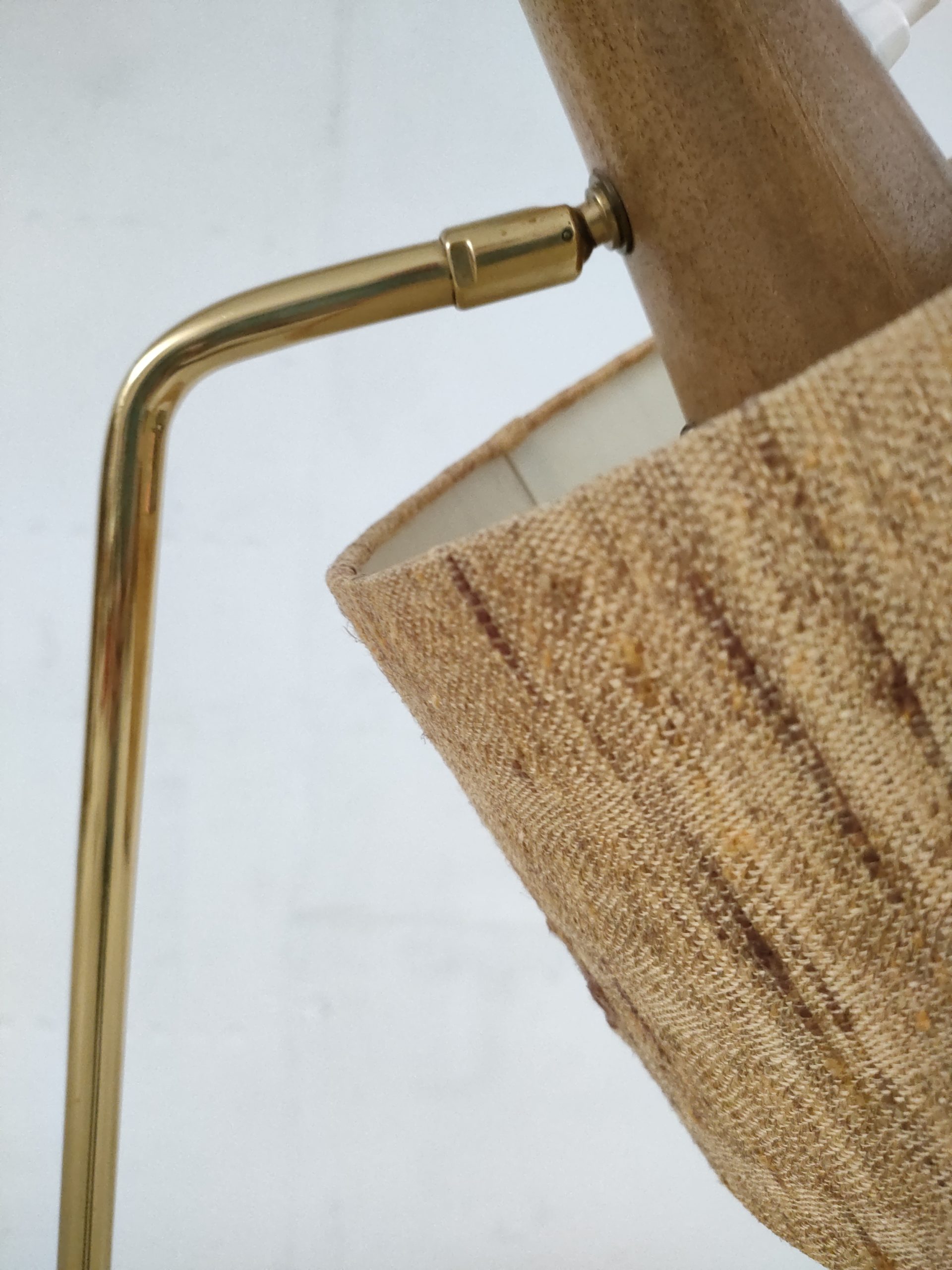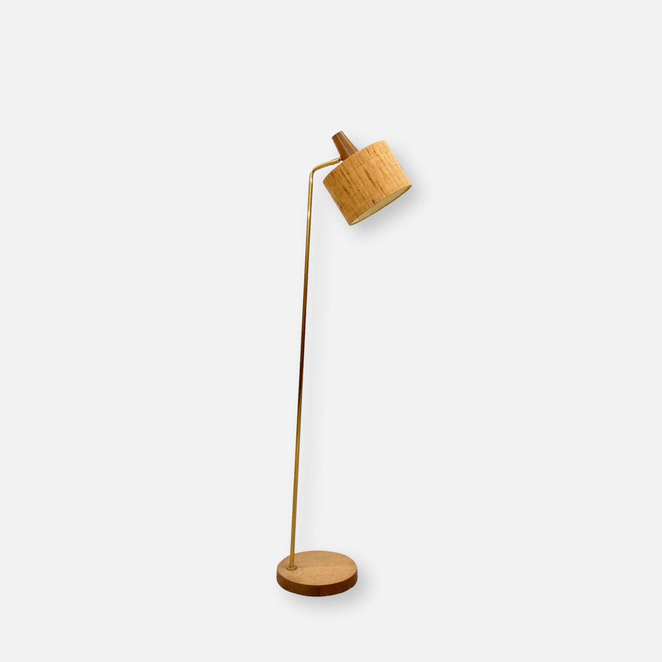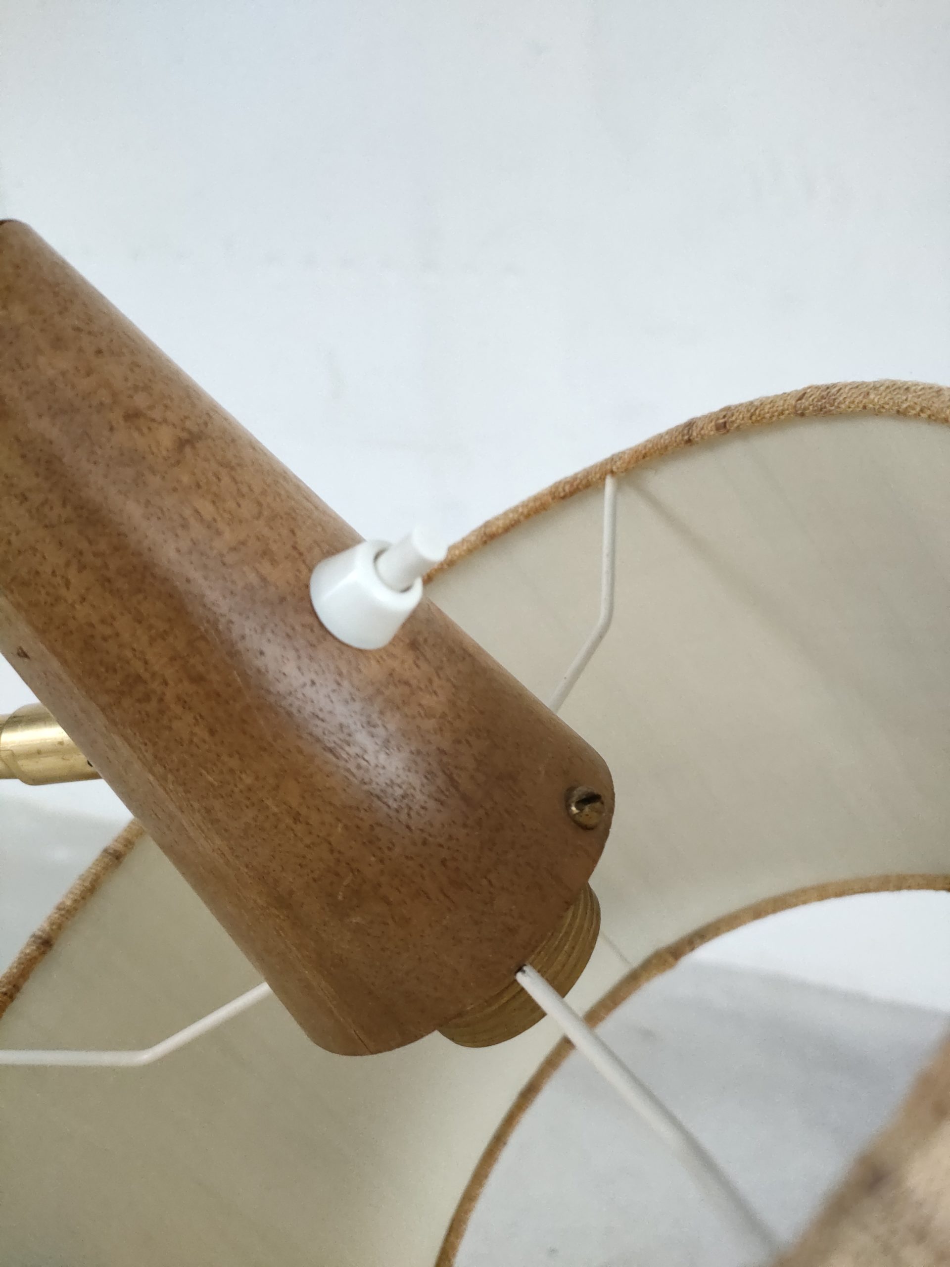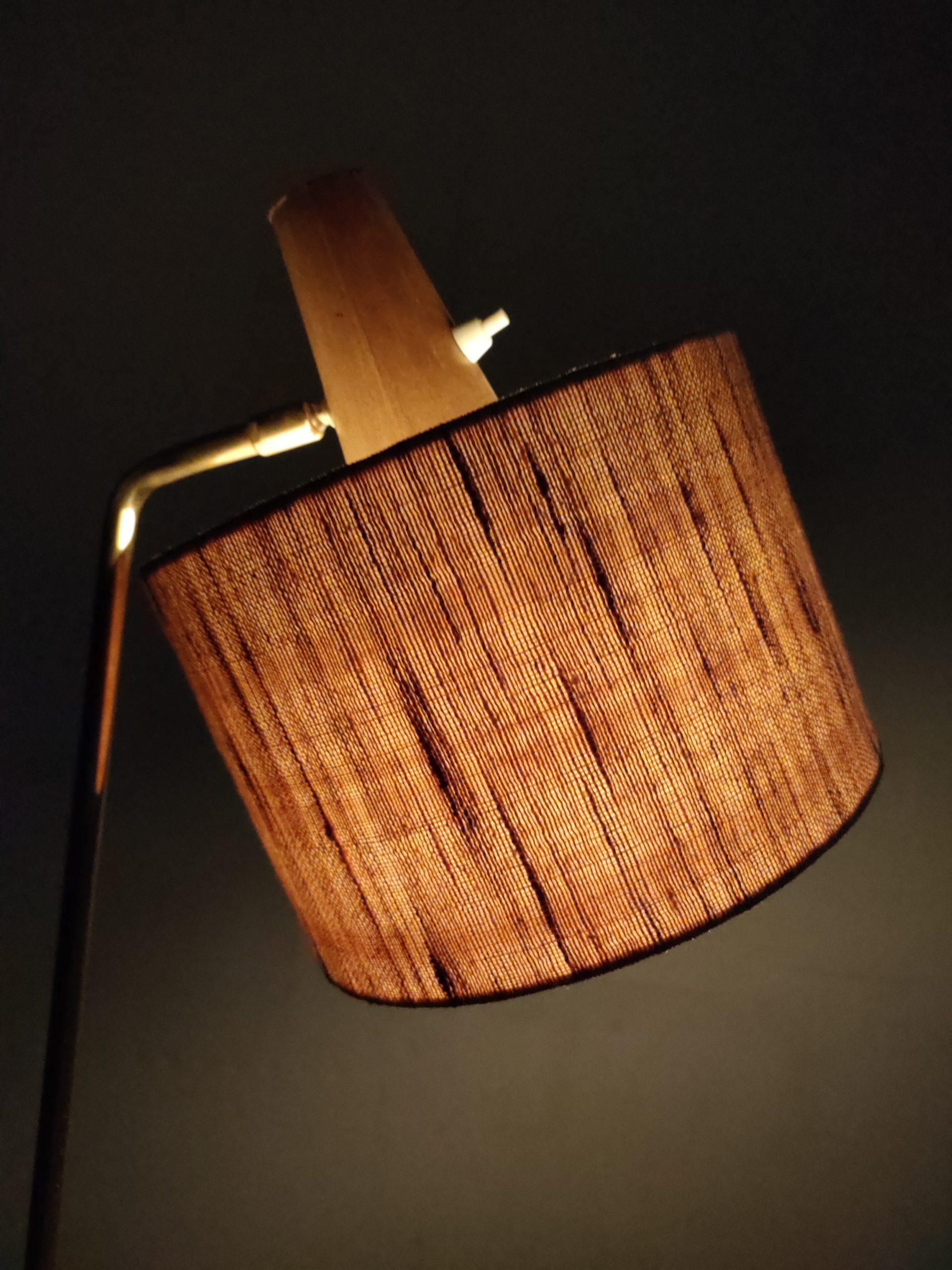 Produit venduLampe sur pied vintage avec socle en bois, tige en métal doré et abat-jour en bois et en tissu. L’abat-jour peut être orienté. Des traces d’usure sont présentes, en particulier sur la partie en bois de l’abat-jour (voir photos).