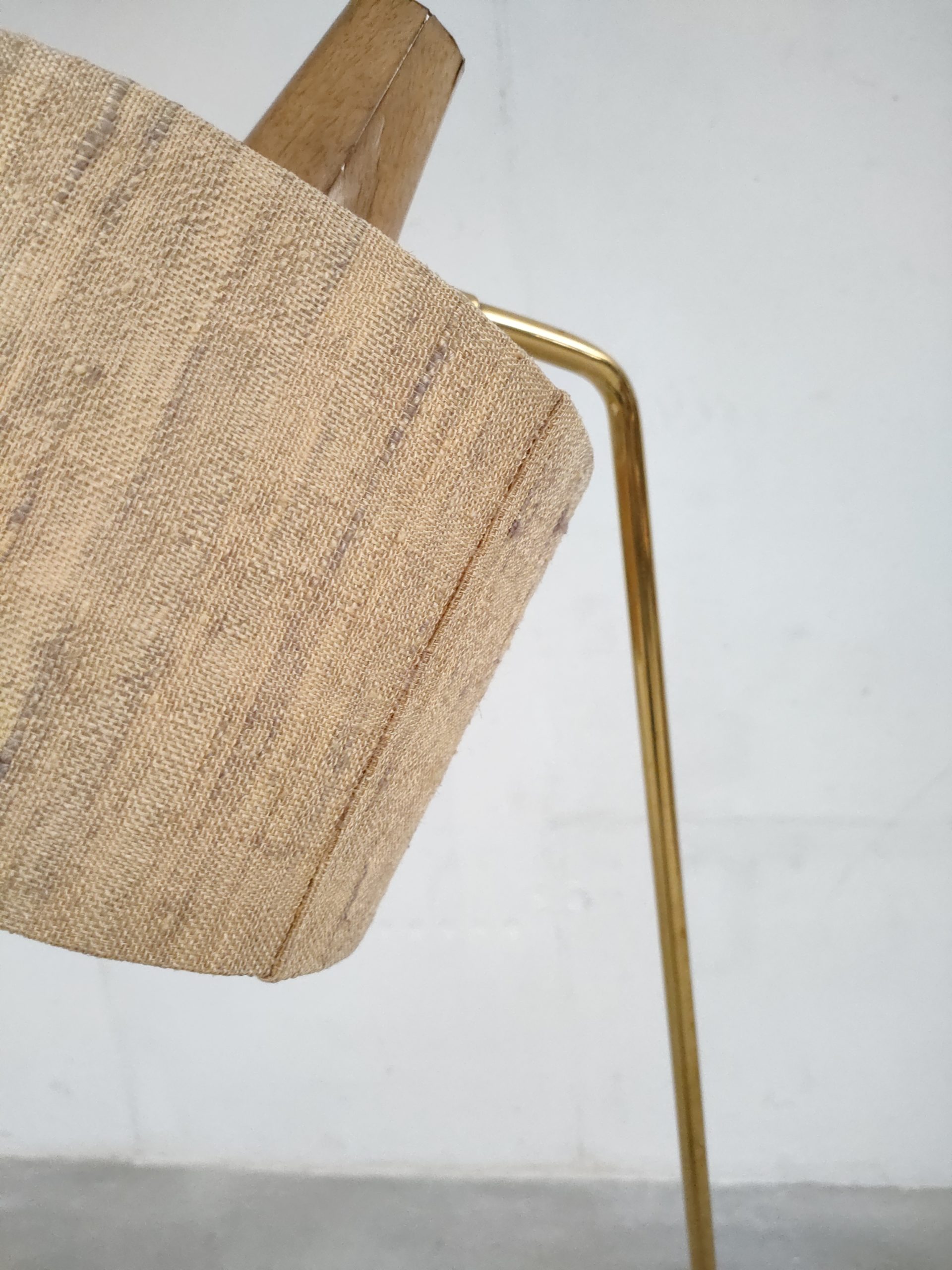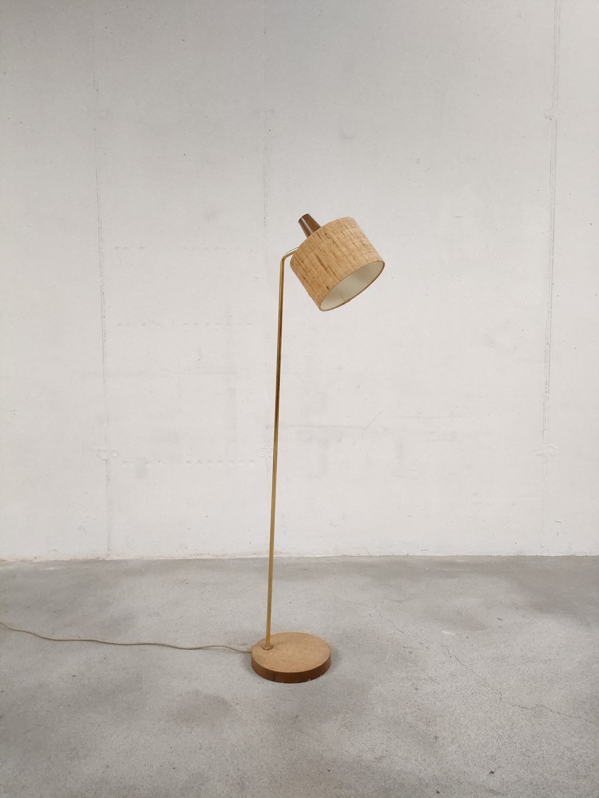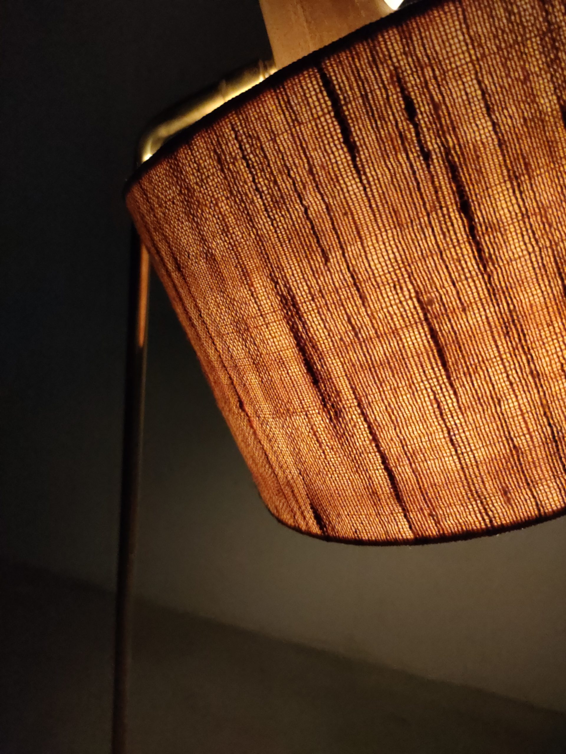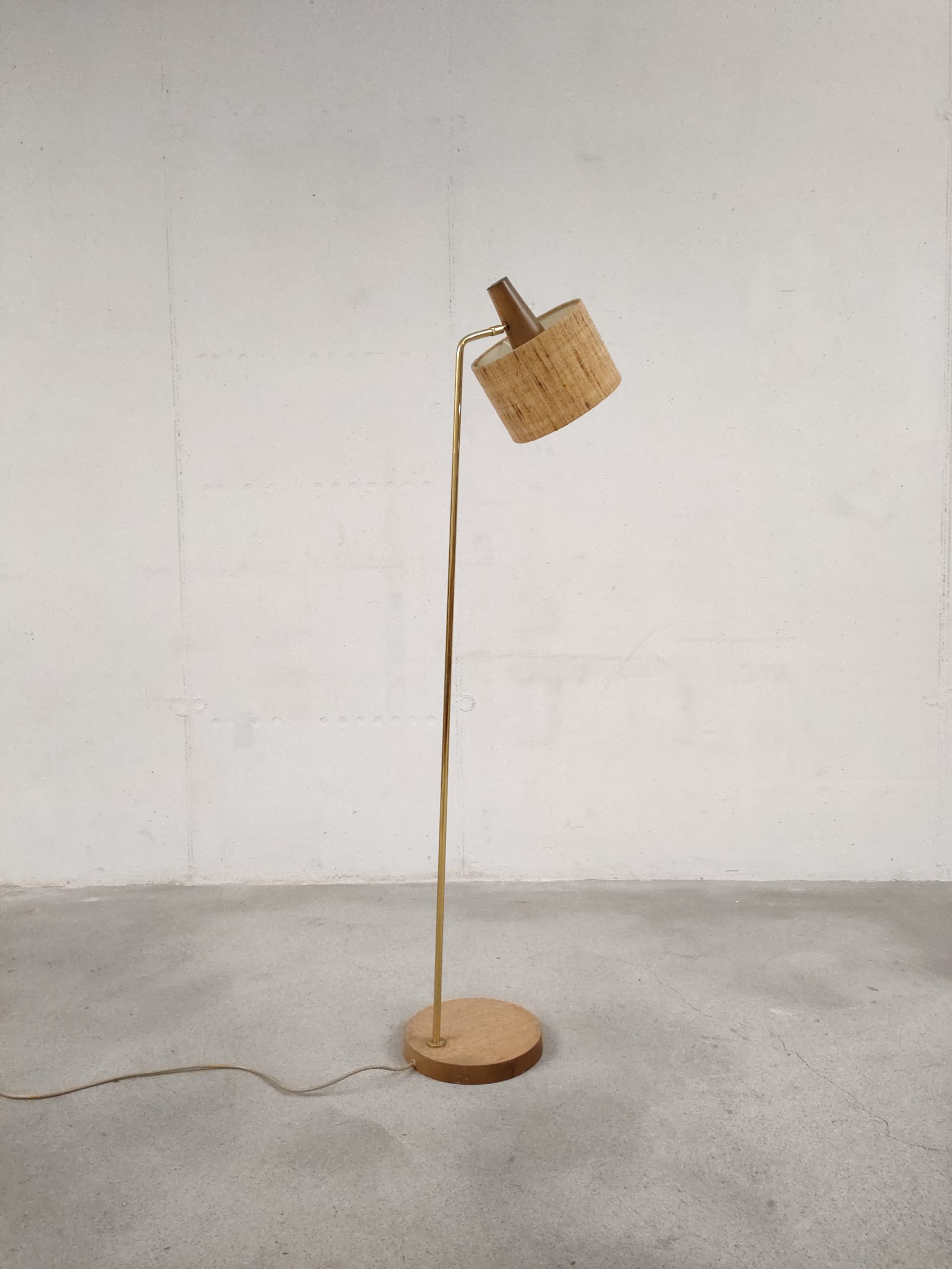 Produit venduLampe sur pied vintage avec socle en bois, tige en métal doré et abat-jour en bois et en tissu. L’abat-jour peut être orienté. Des traces d’usure sont présentes, en particulier sur la partie en bois de l’abat-jour (voir photos).