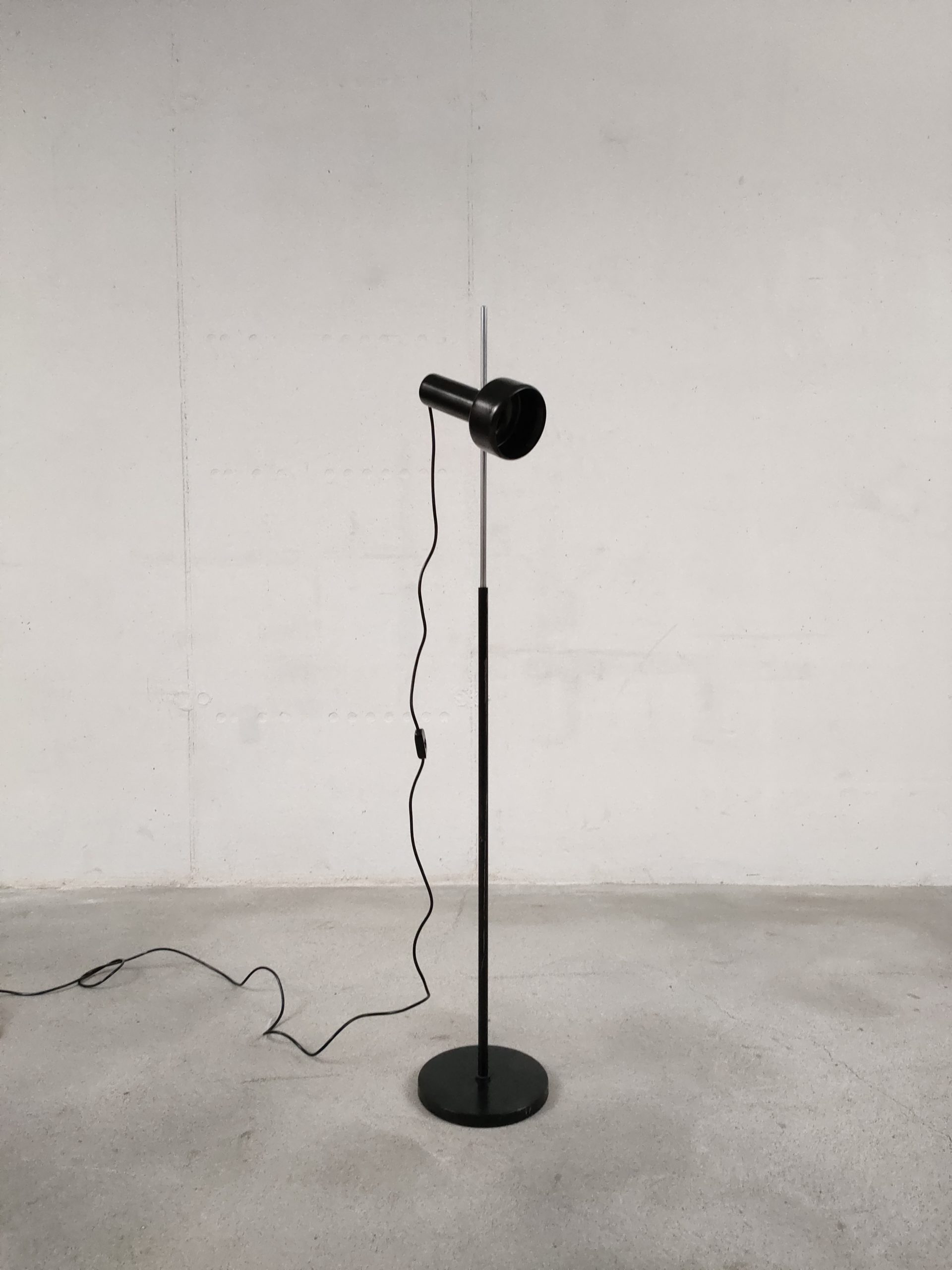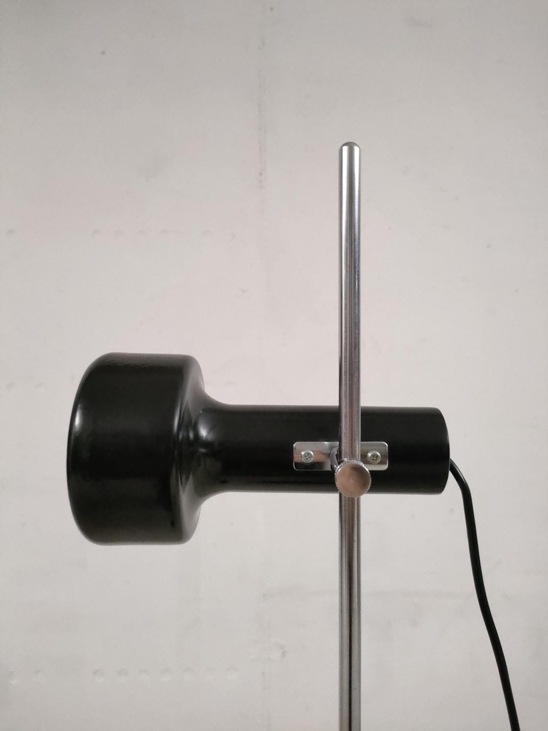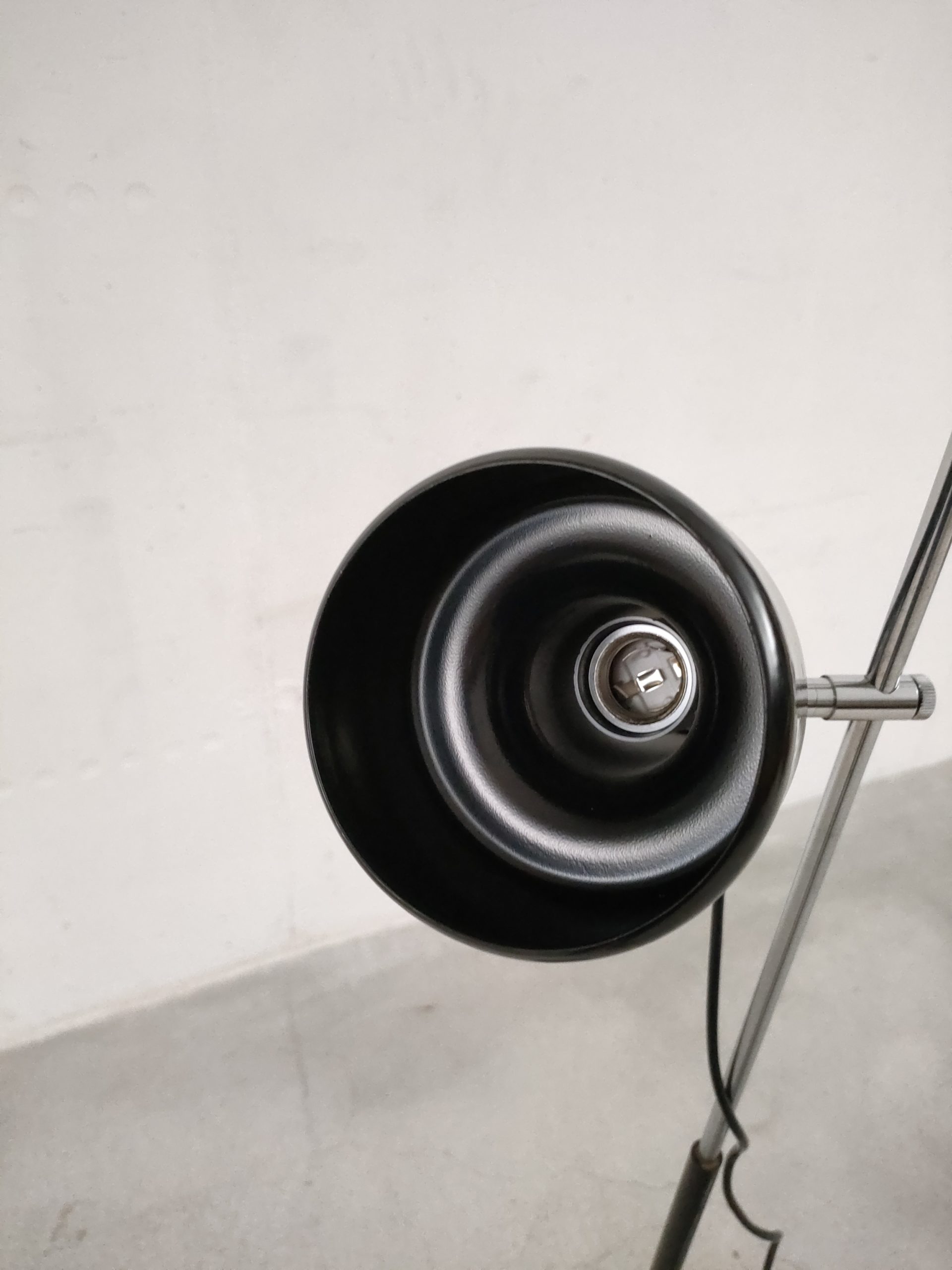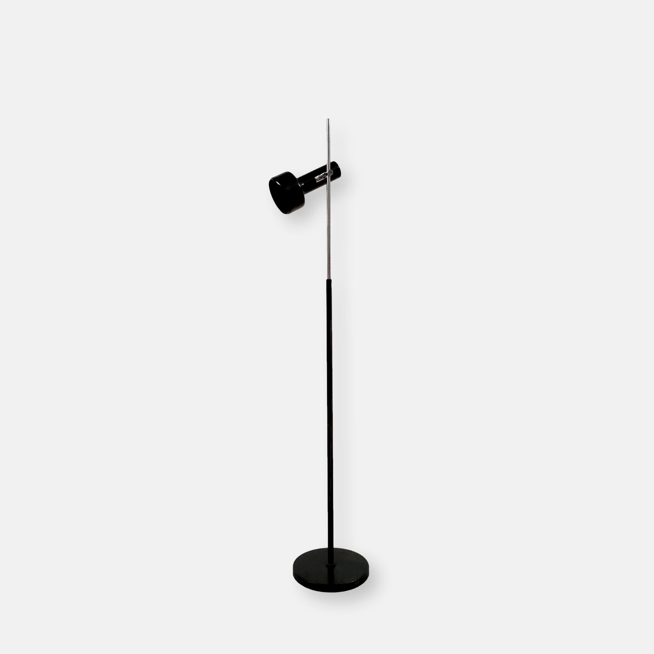 Produit venduLampe sur pied avec un spot en métal noir. Produite par le fabricant Neweba. Socle et tige en métal noir et chromé. Le spot peut être orienté dans toutes les directions. Des traces d’usure sont présentes sur le socle et la tige (voir photos). Elle fonctionne avec des ampoules standard E27 (non fournie).