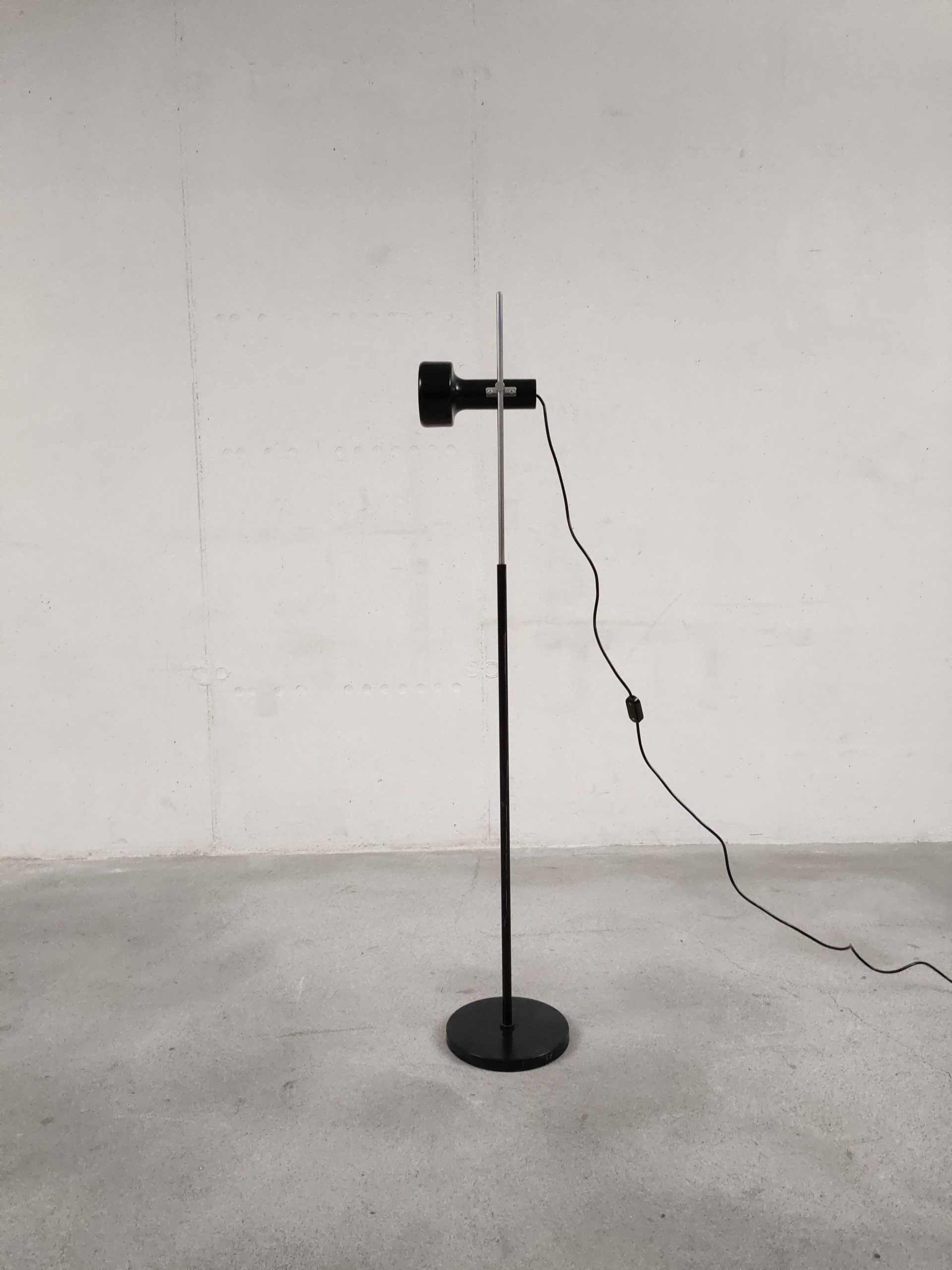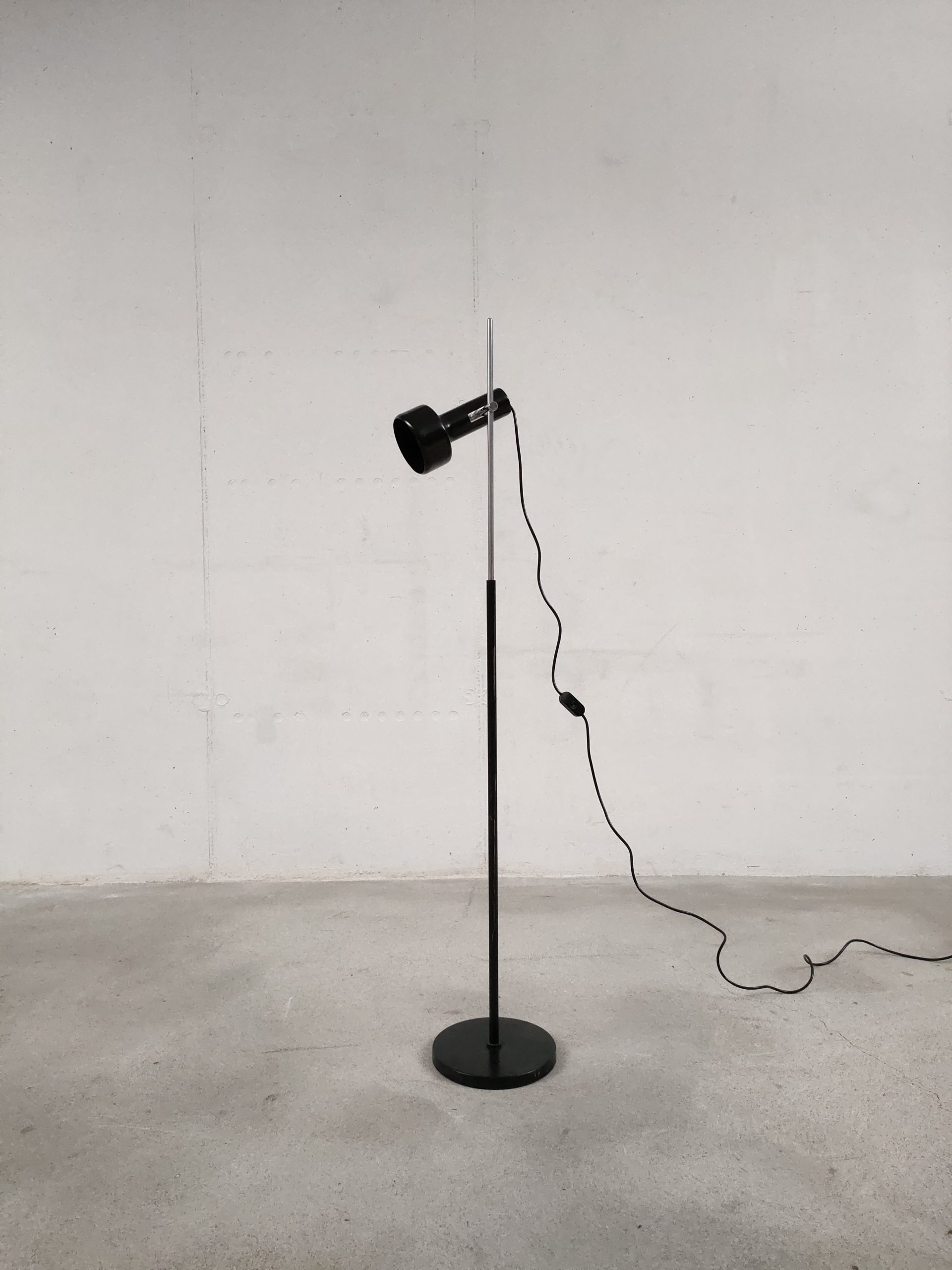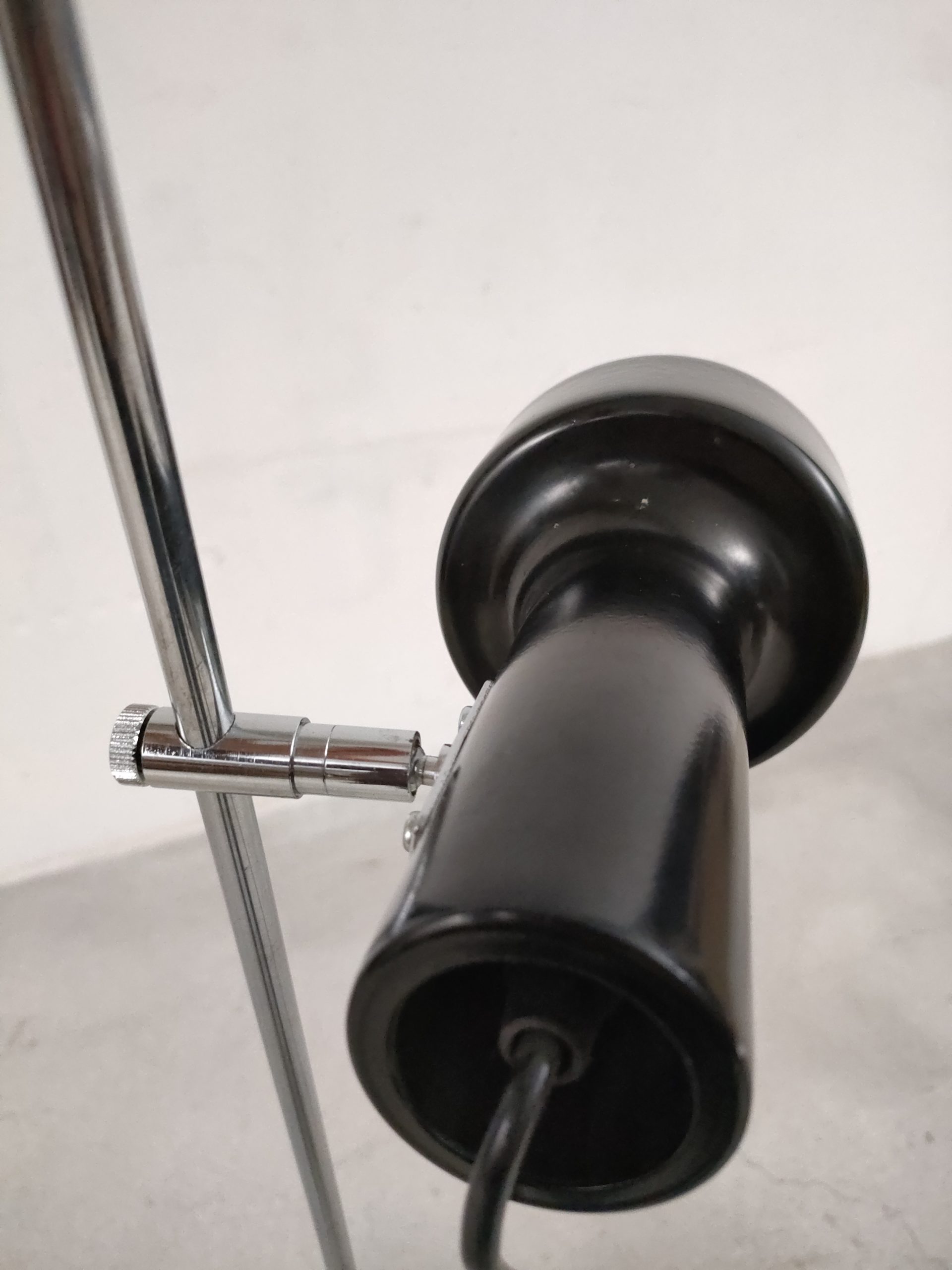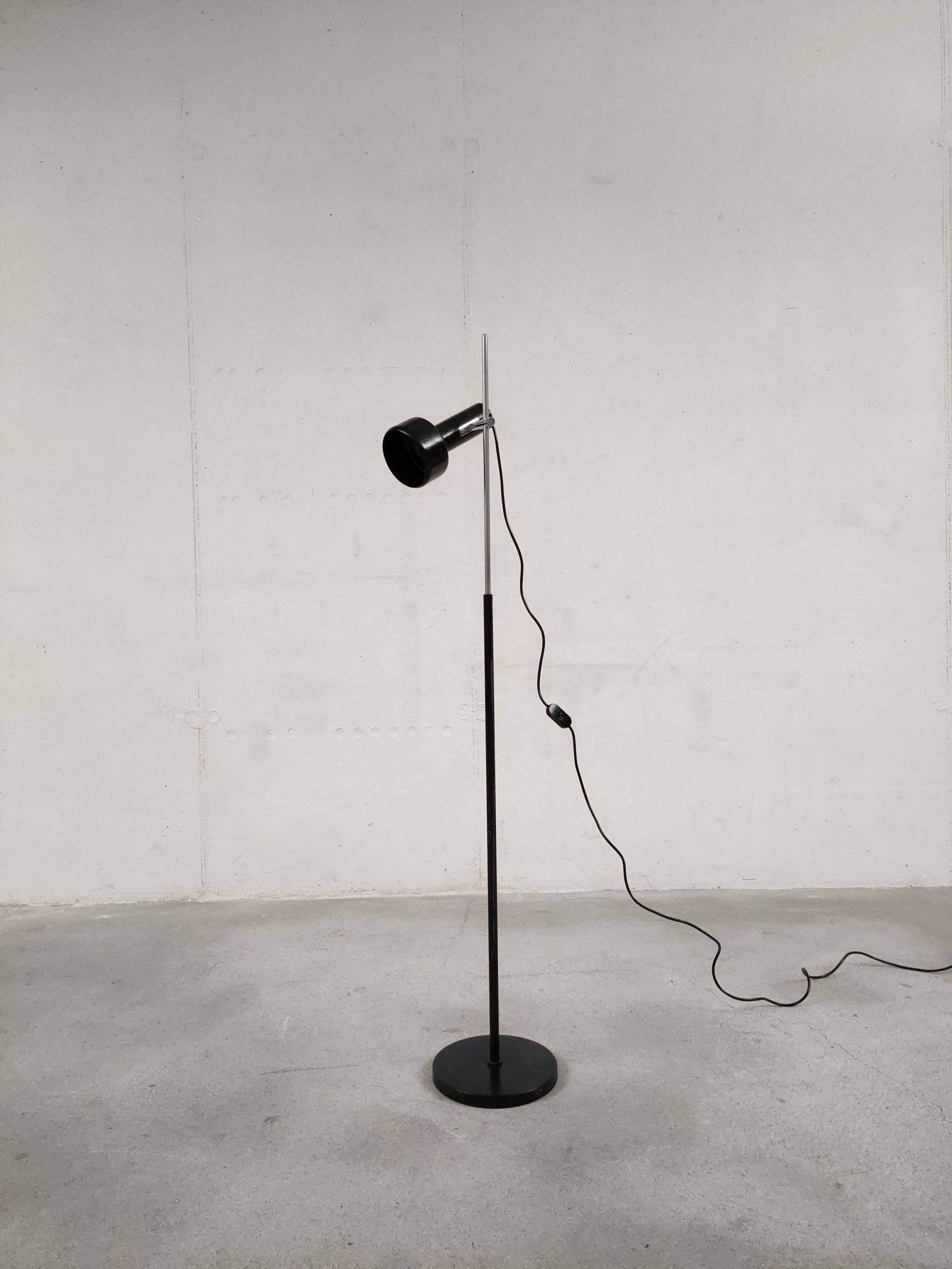Produit venduLampe sur pied avec un spot en métal noir. Produite par le fabricant Neweba. Socle et tige en métal noir et chromé. Le spot peut être orienté dans toutes les directions. Des traces d’usure sont présentes sur le socle et la tige (voir photos). Elle fonctionne avec des ampoules standard E27 (non fournie).